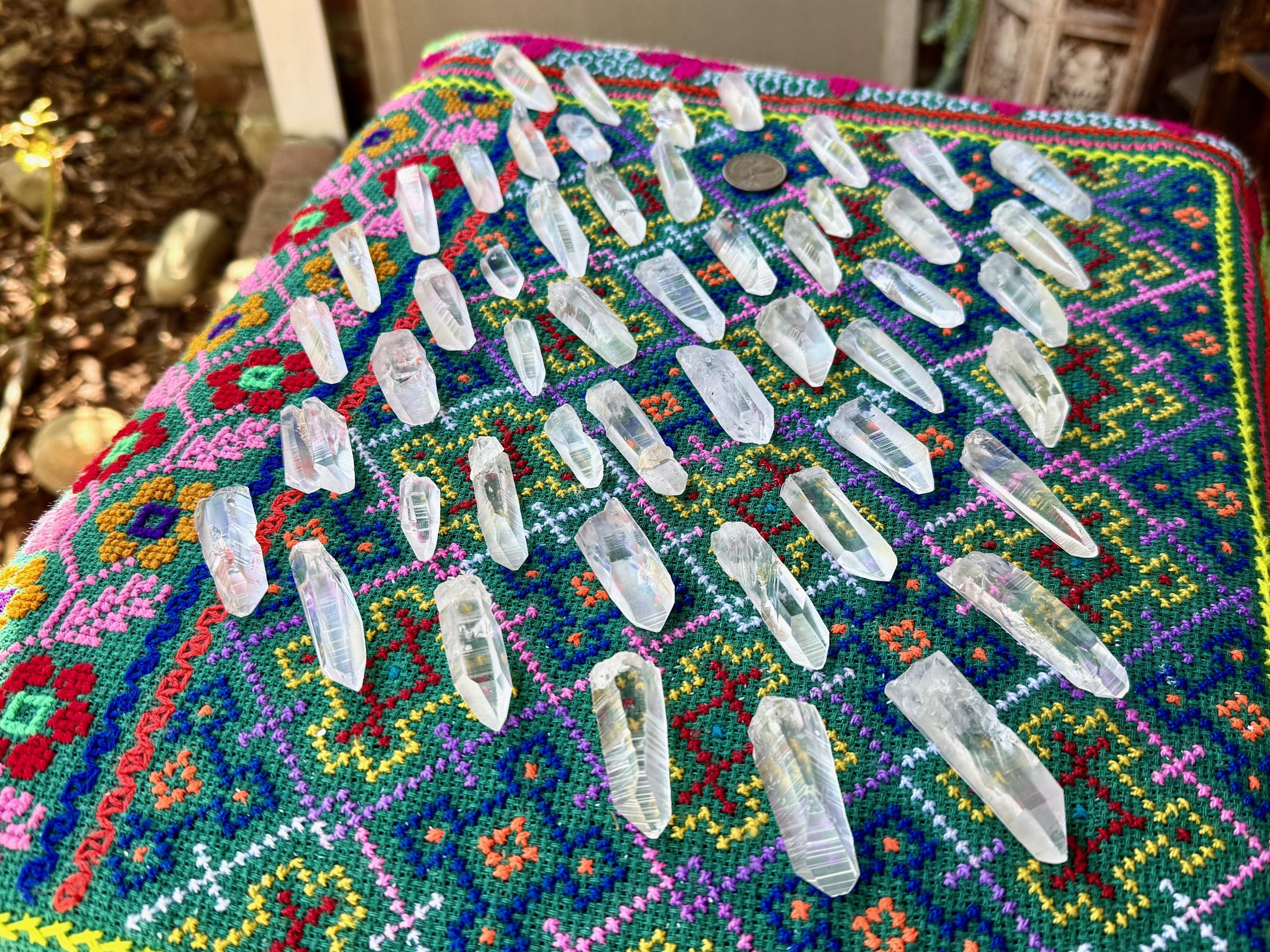 This is an outstanding collection of natural (unpolished) Lemurian Quartz crystal points. These crystals feature water-clear clarity, brilliant luster. Many exhibit nicely defined striations as well. While there may be the occasional minor chip or ding to the body, the terminations are excellent.