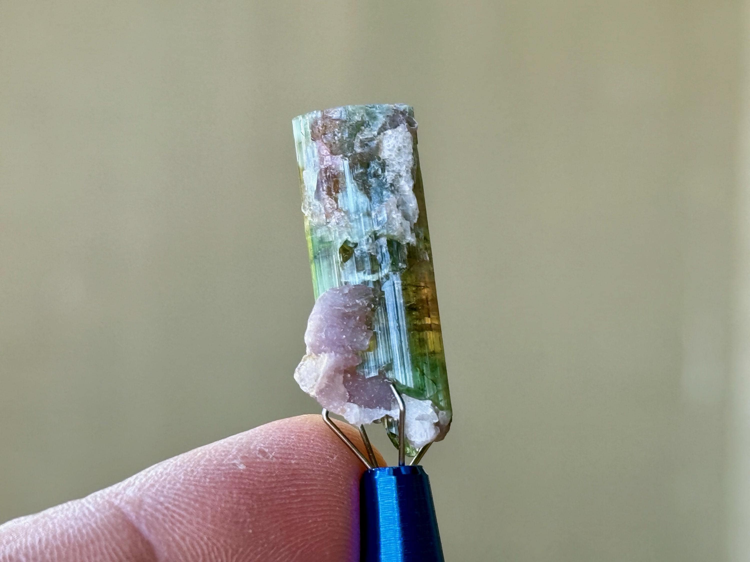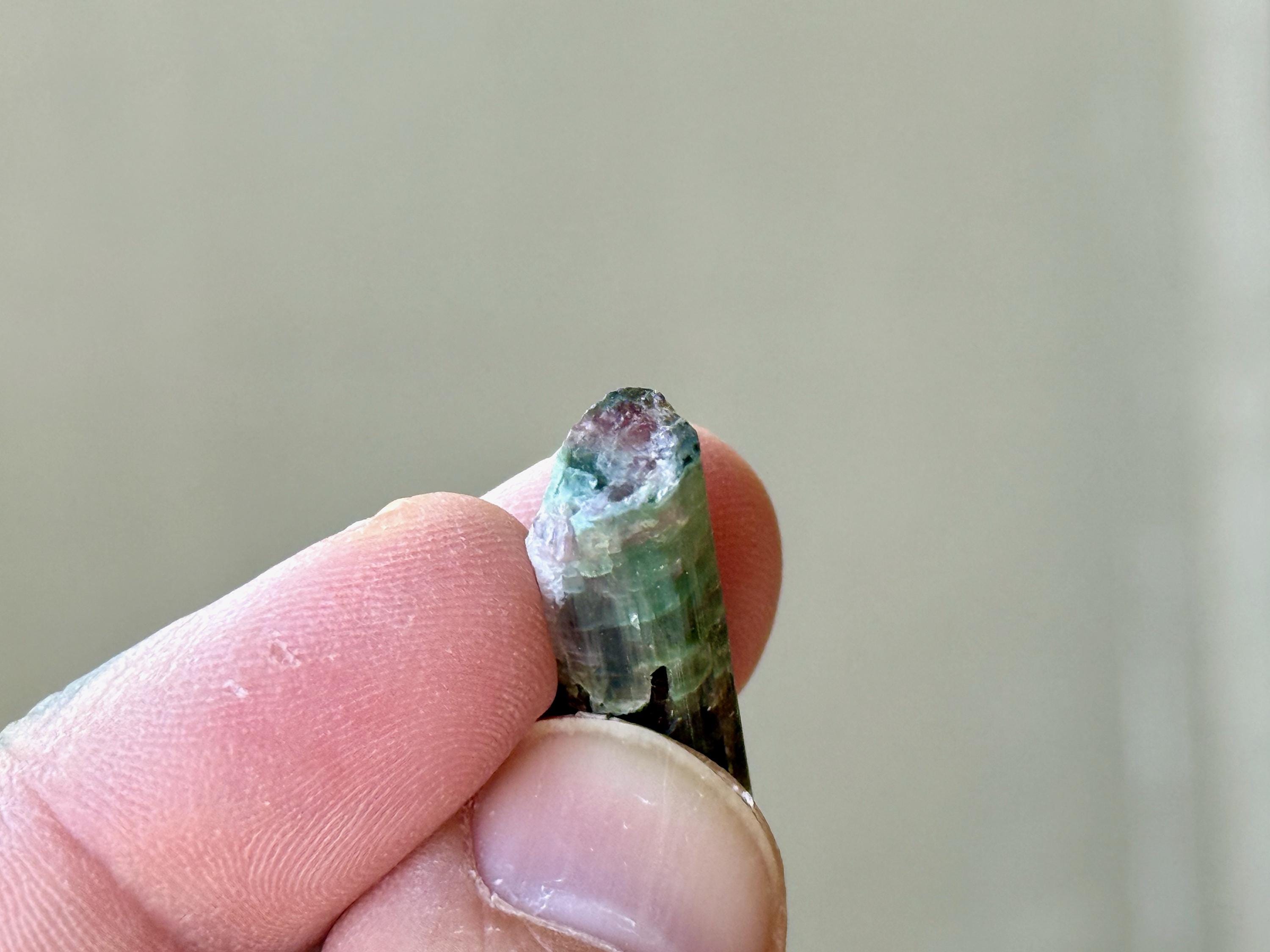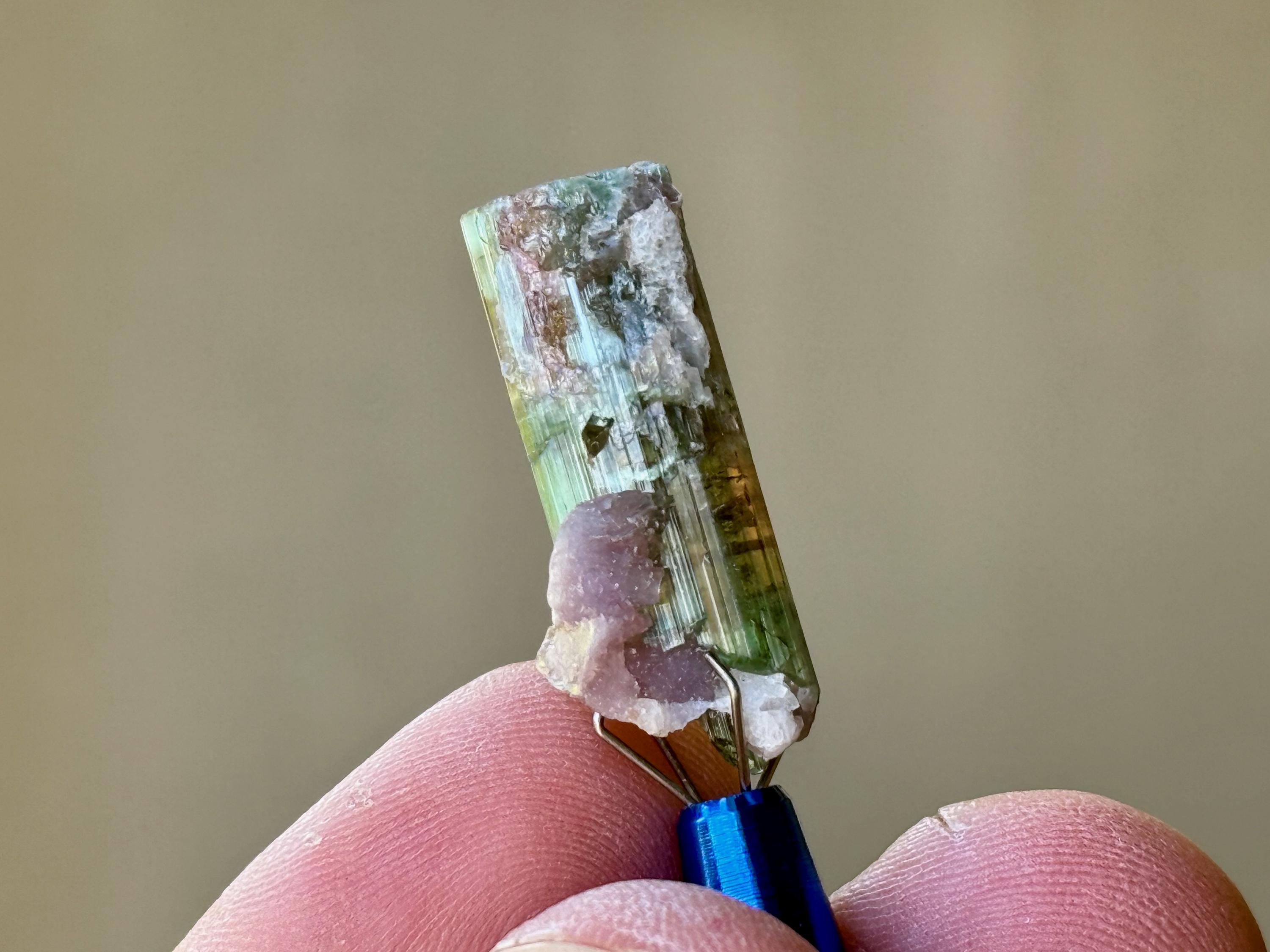 If we look at either end we can see the Pink Tourmaline peeking out of the center. The exterior has a lovely shine to it with a nice ridged formation. We can also see some little purple Lepidolite "barnacles" on the exterior. The top is self-healed/terminated. A great one from this locale.