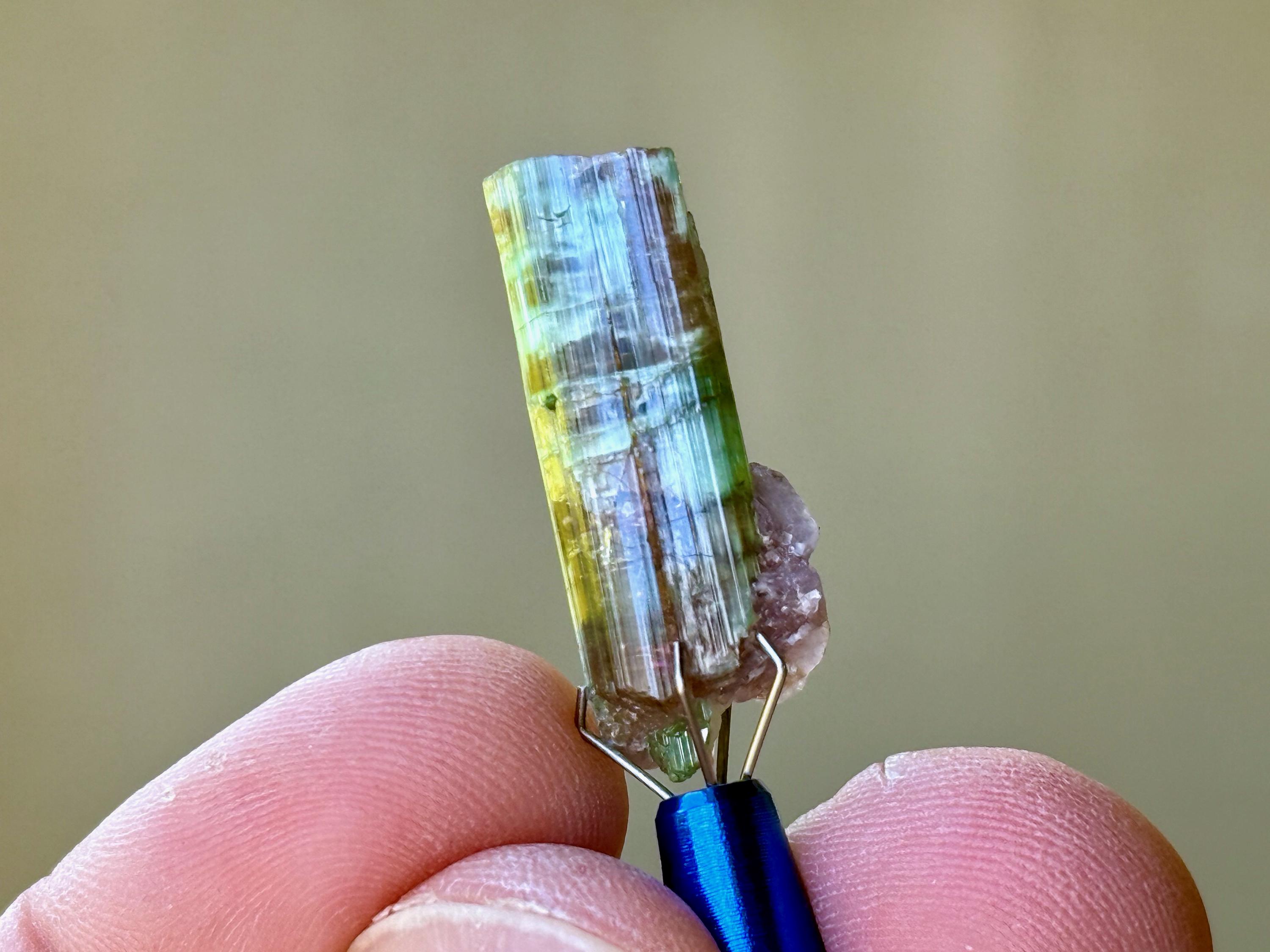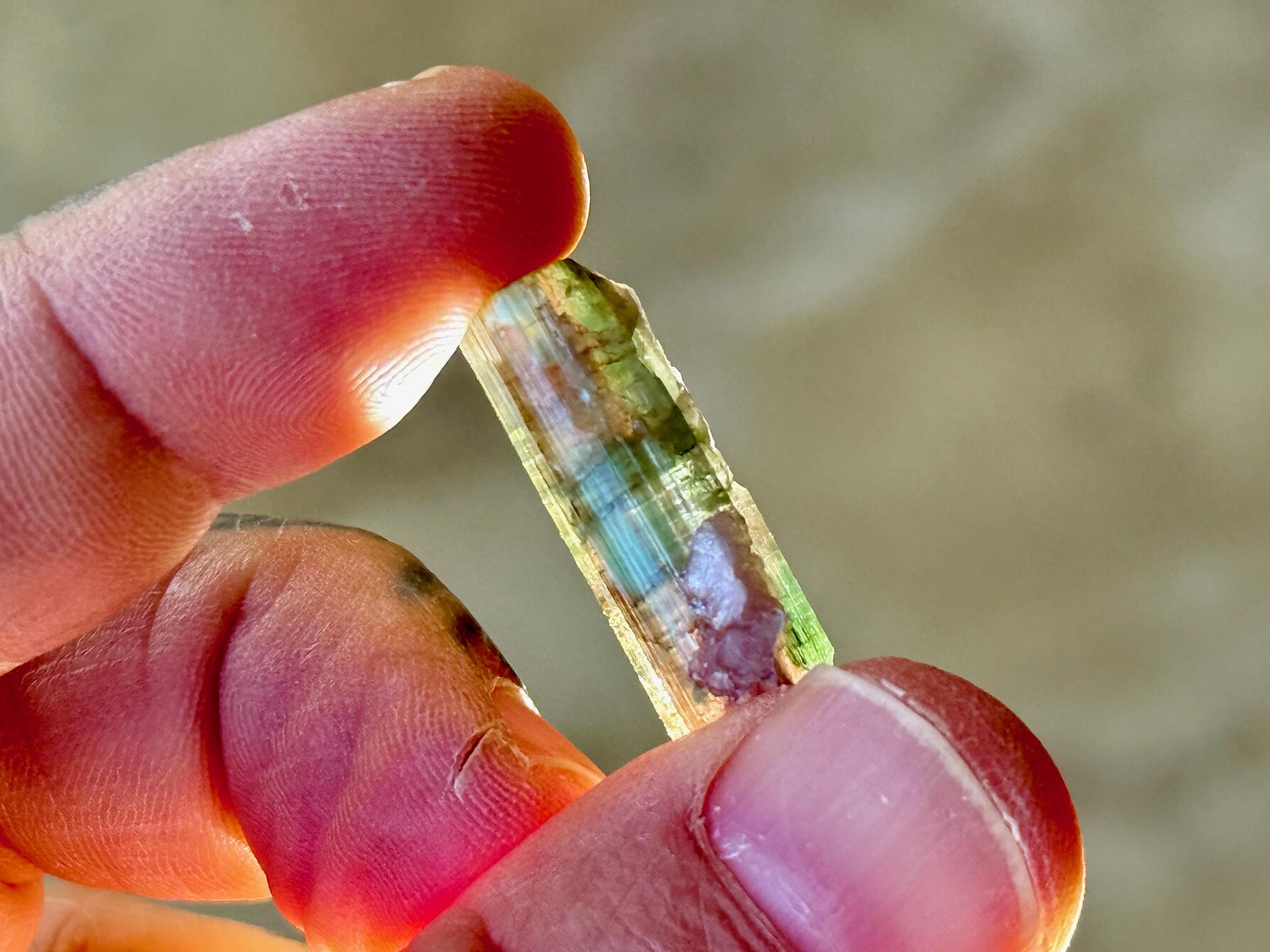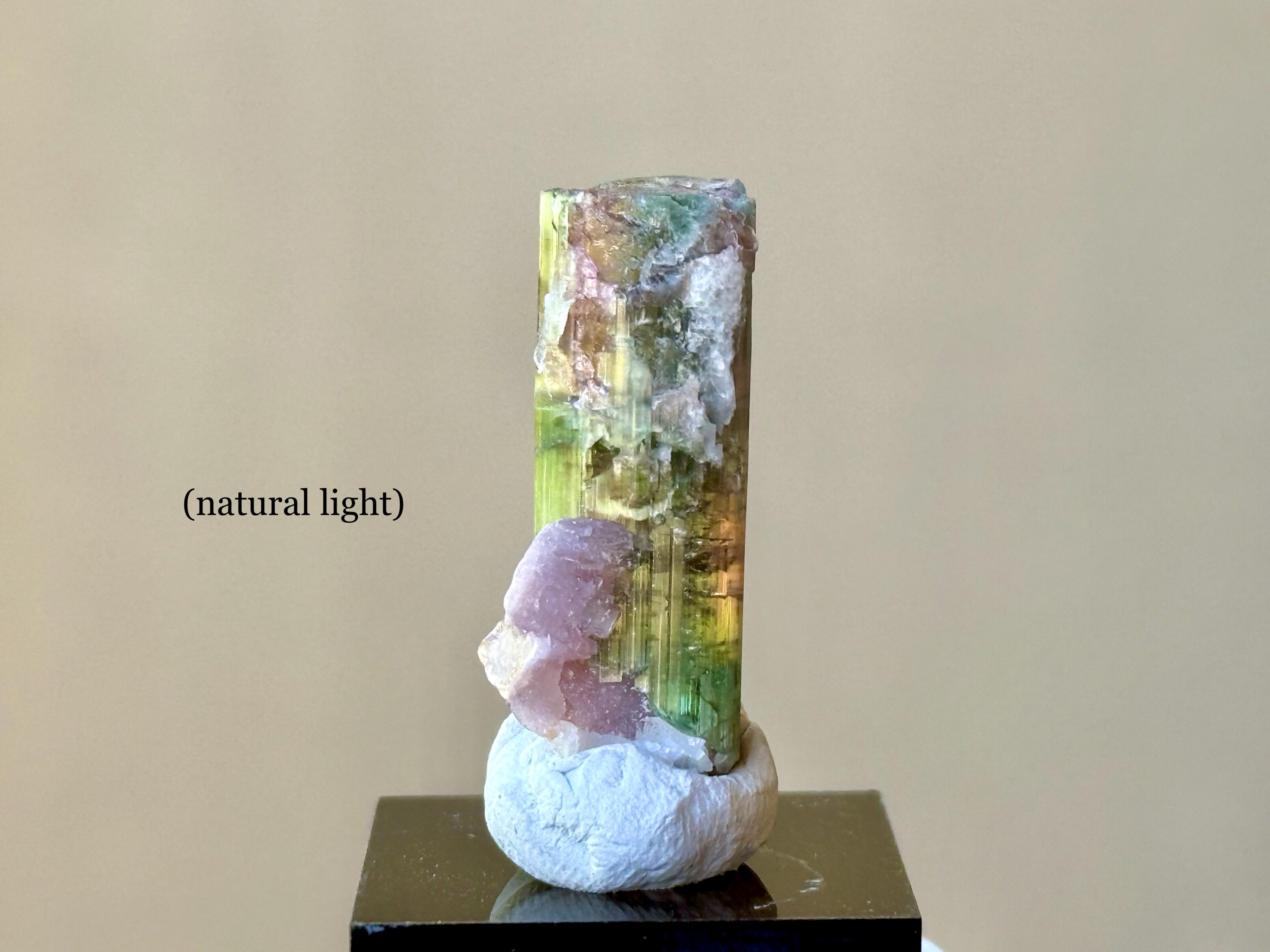 If we look at either end we can see the Pink Tourmaline peeking out of the center. The exterior has a lovely shine to it with a nice ridged formation. We can also see some little purple Lepidolite "barnacles" on the exterior. The top is self-healed/terminated. A great one from this locale.
