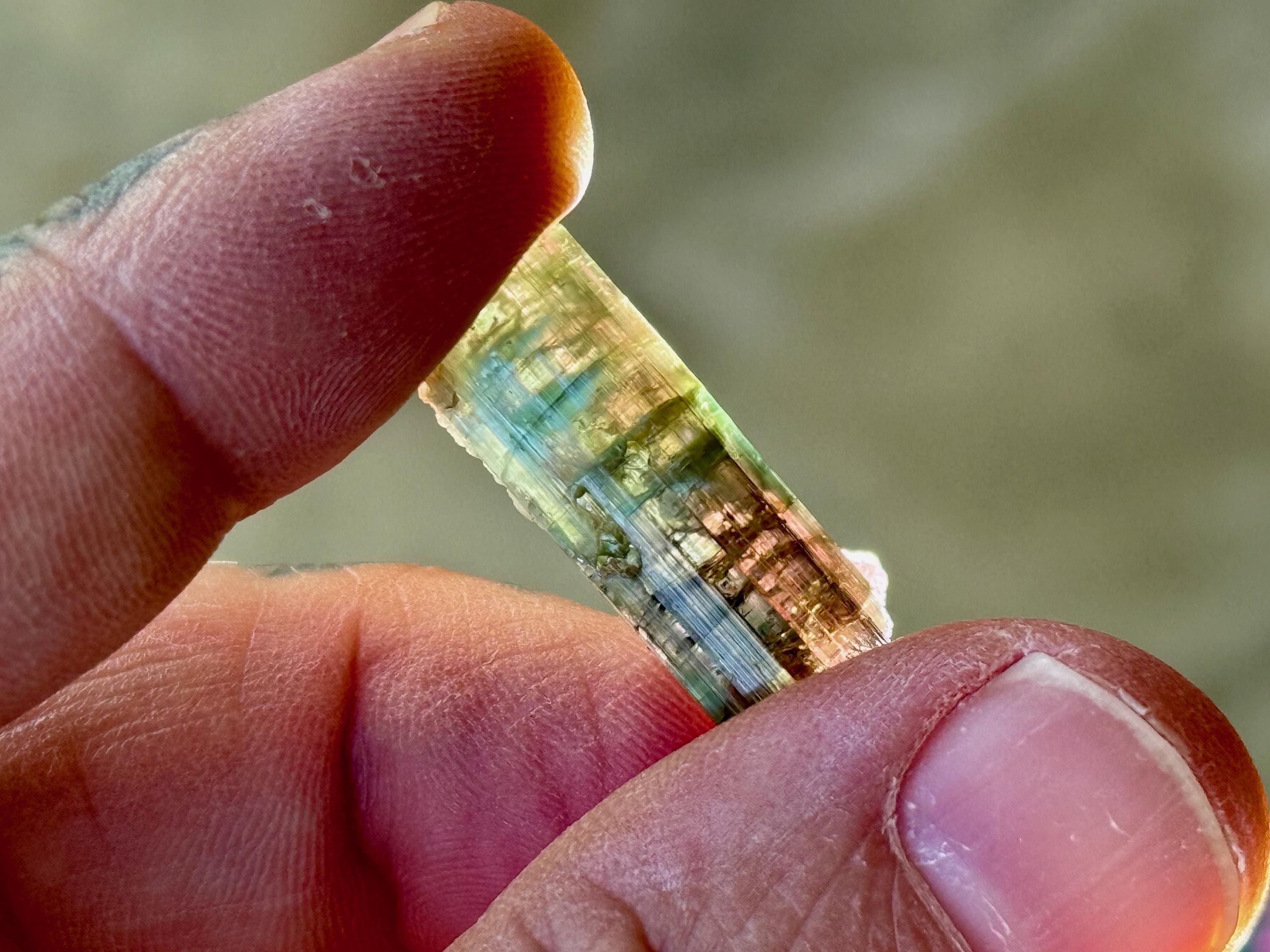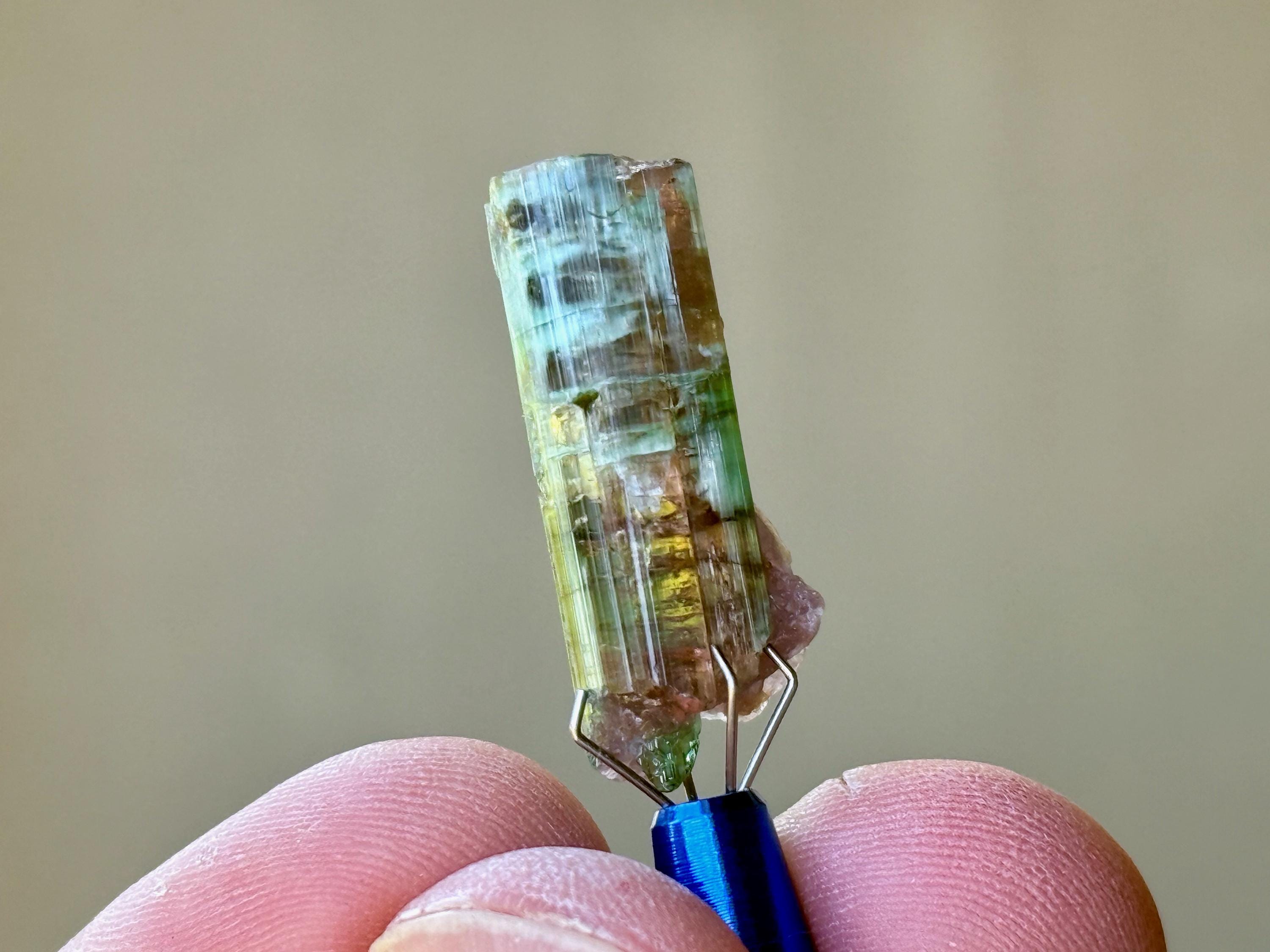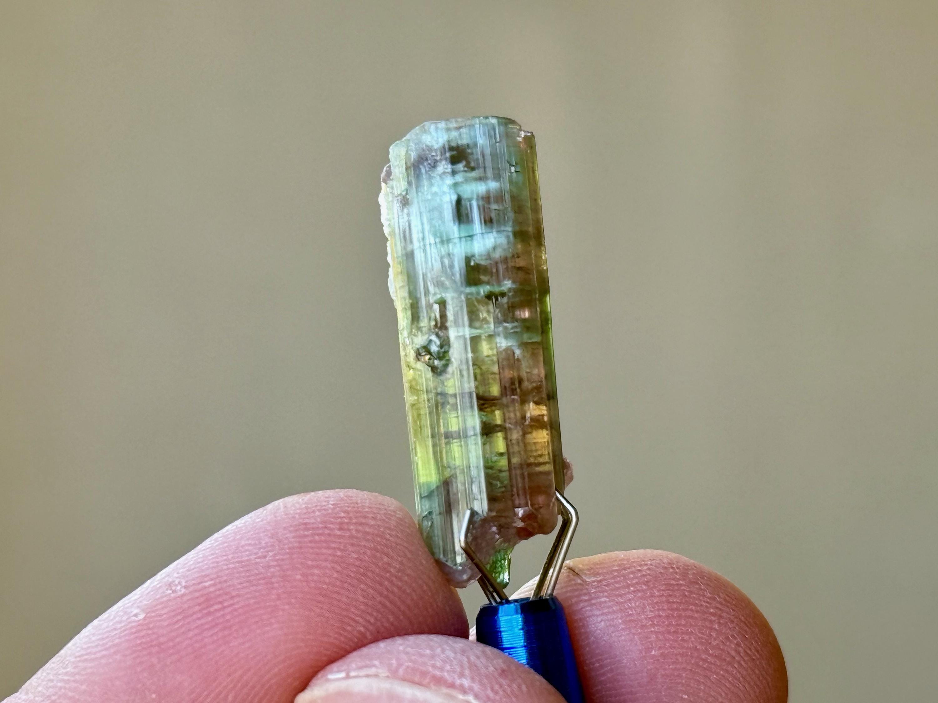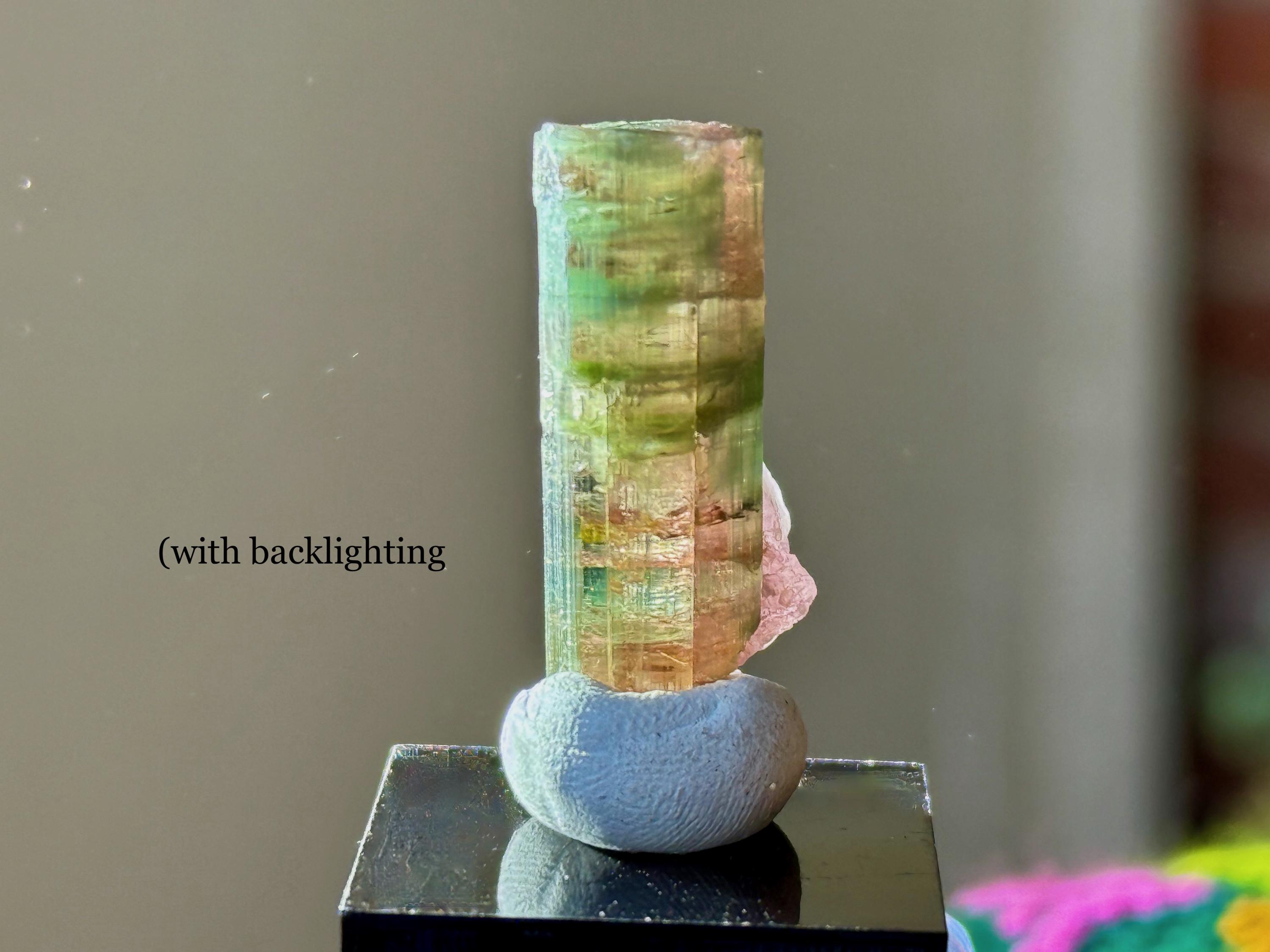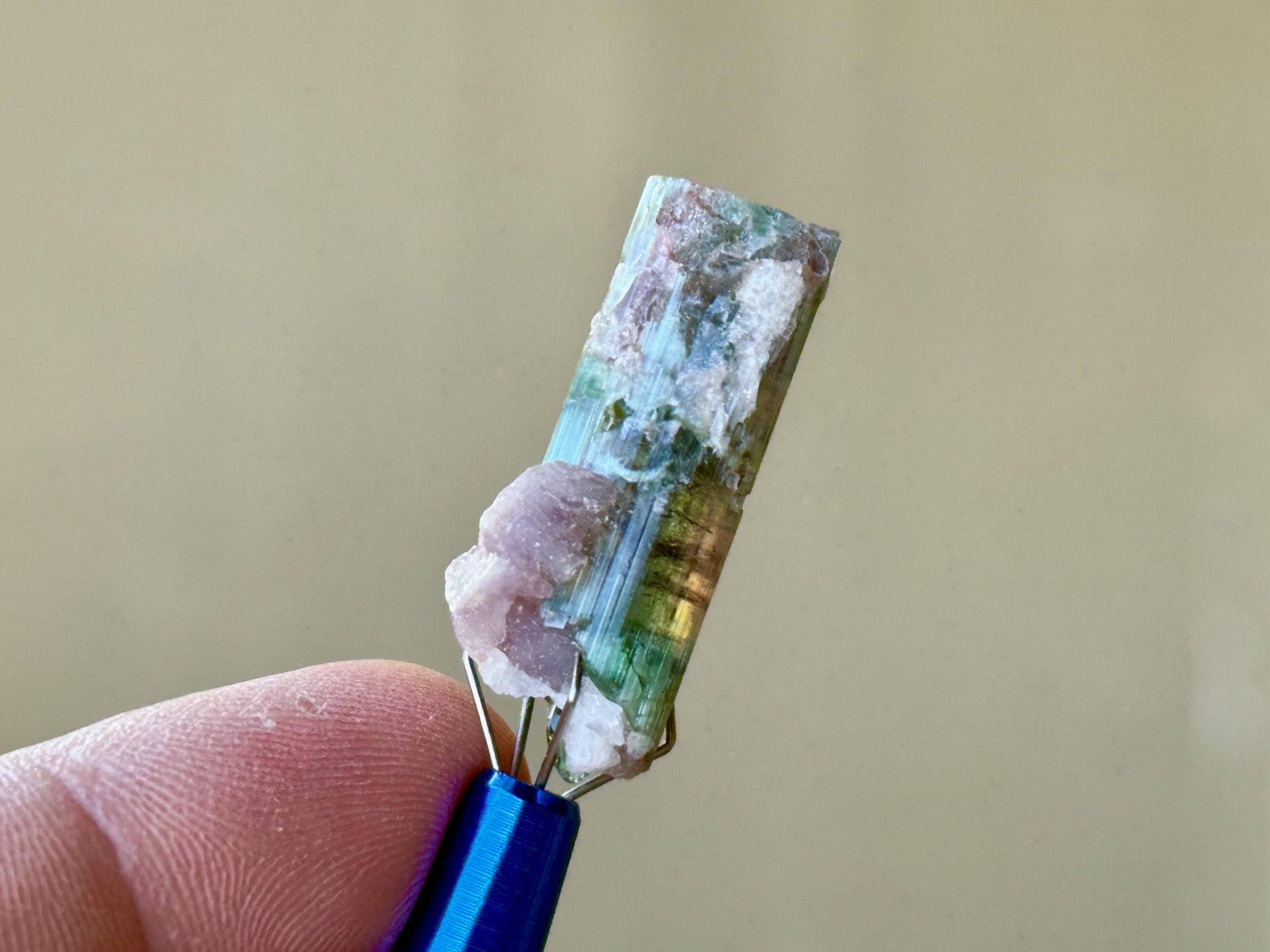 This beautiful Bicolor Tourmaline features the kind of pastel hues that Barra do Salinas Tourmaline is known for. This particular piece features a vibrant pink center with a lustrous blue-green exterior "skin." The blue tinges are a little hard do catch in the photos, but play with it in the light and you'll see. When backlit, we can really see these beautiful pastel colors come through beautifully.