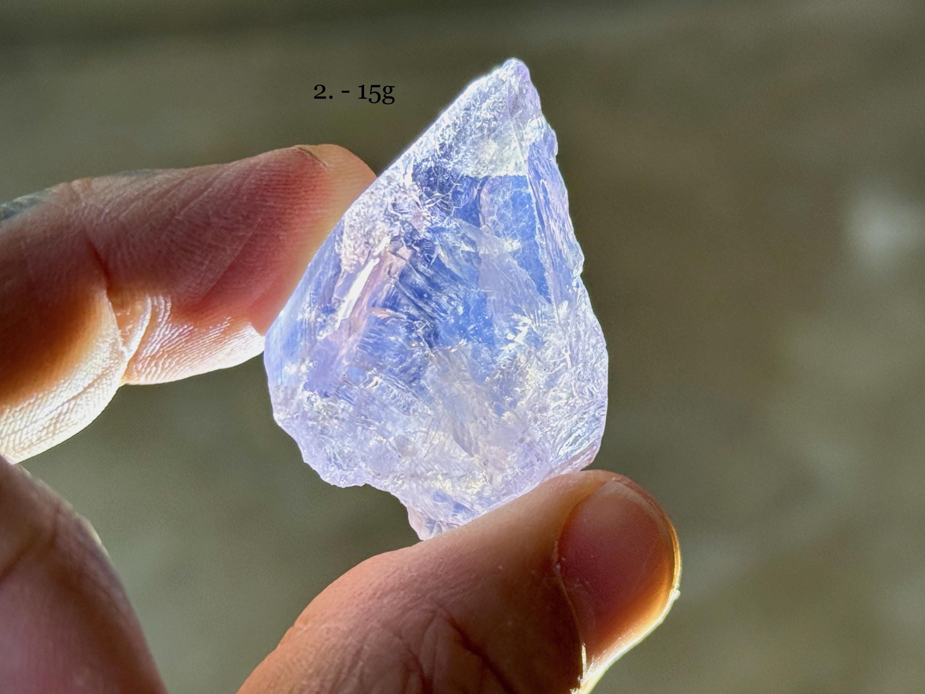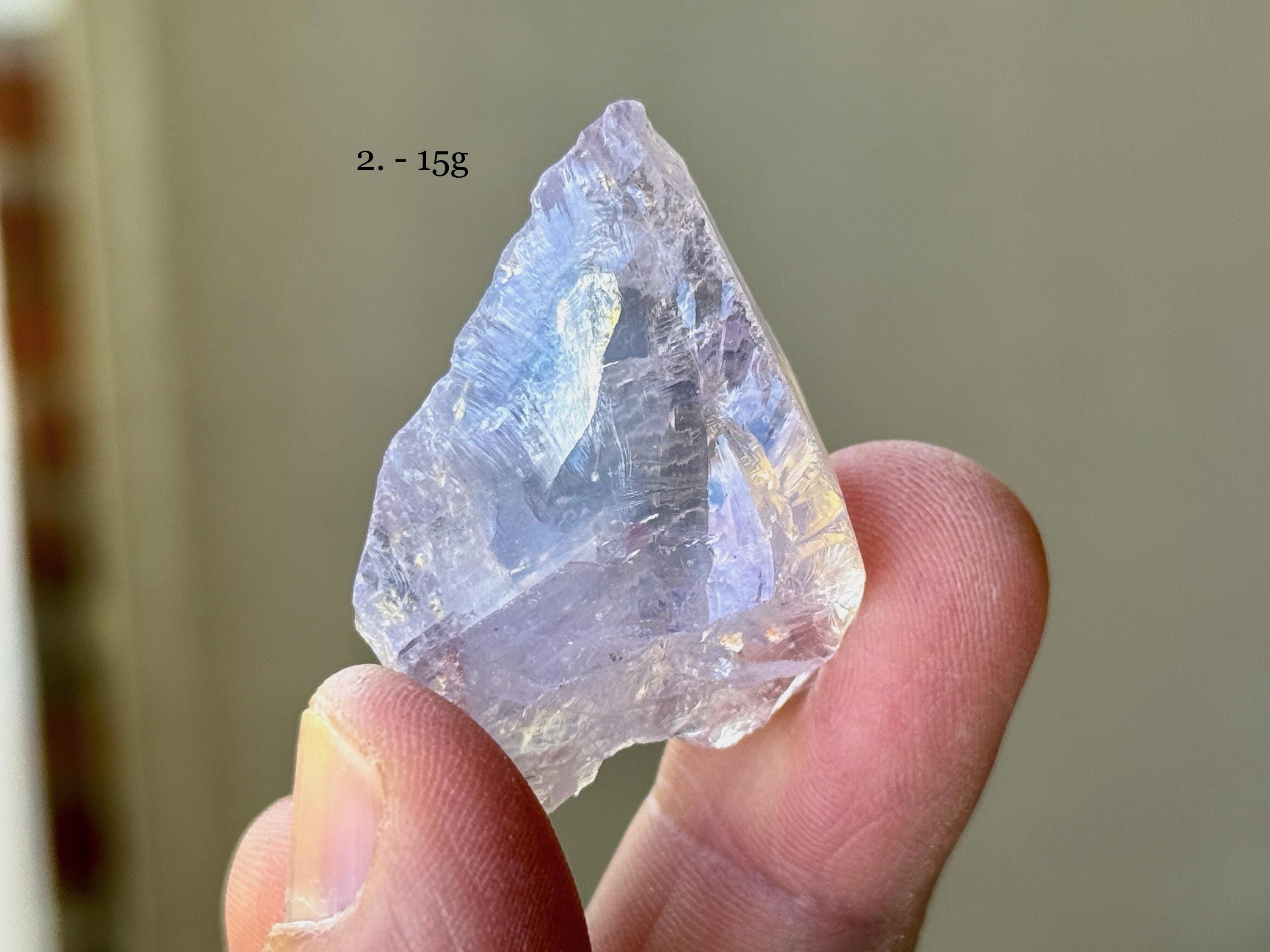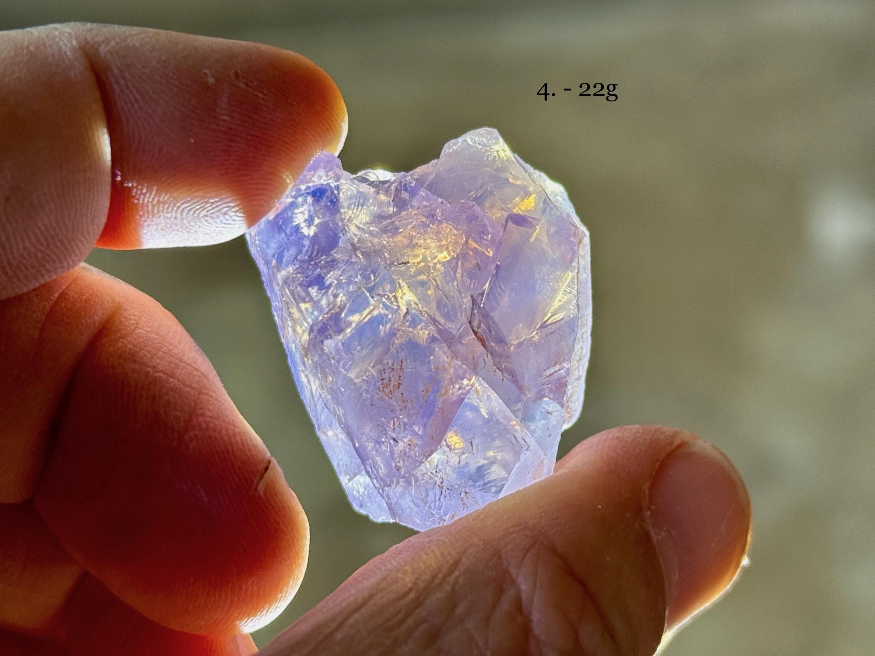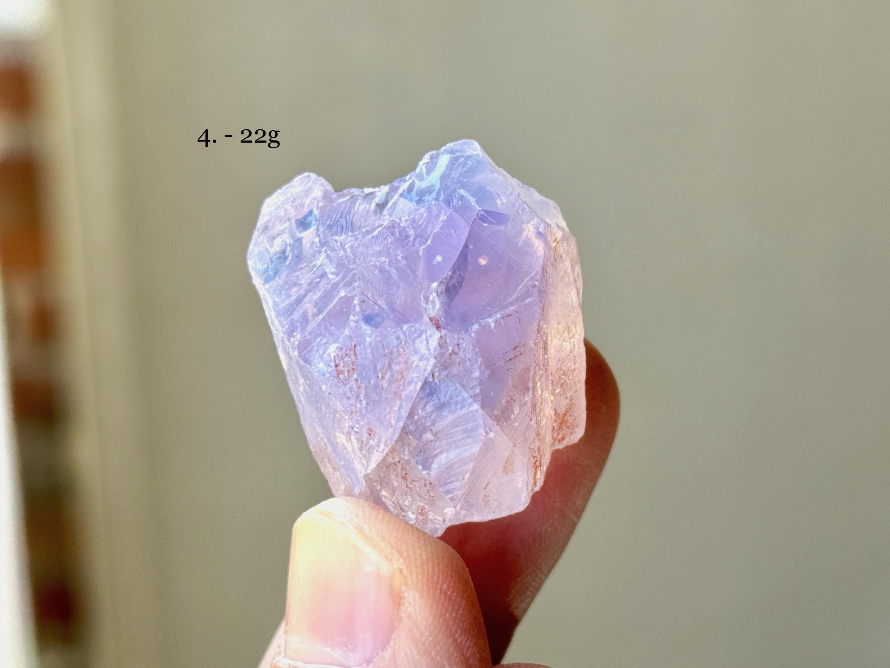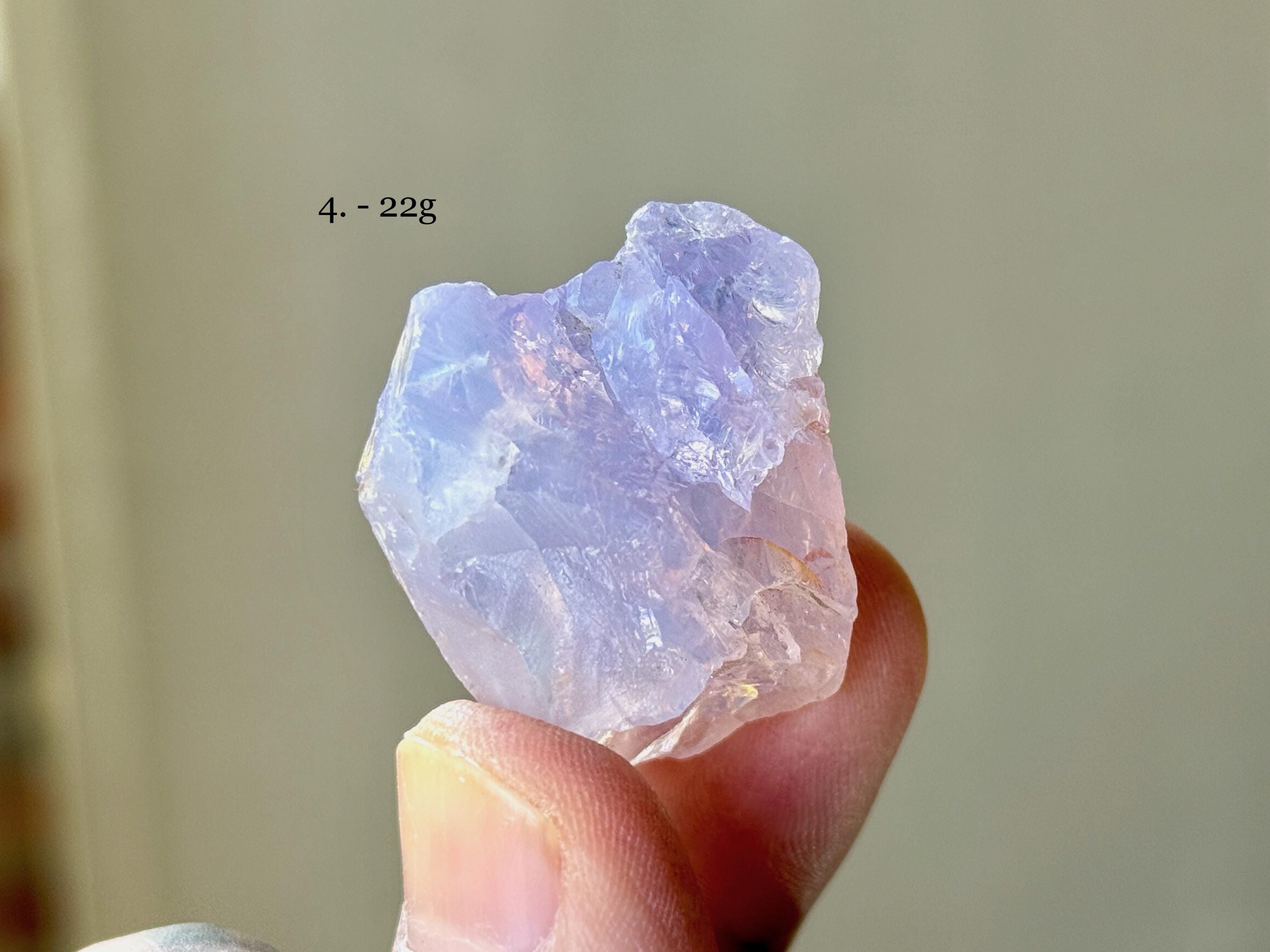 A gorgeous selection of natural Lavender Moon Quartz crystals with opalescent, pale purple hues! Please note that while some of these may have some terminated sides or edges, most edges are not terminated, as is the nature of this material. We've included photos here in natural light as well as backlit.