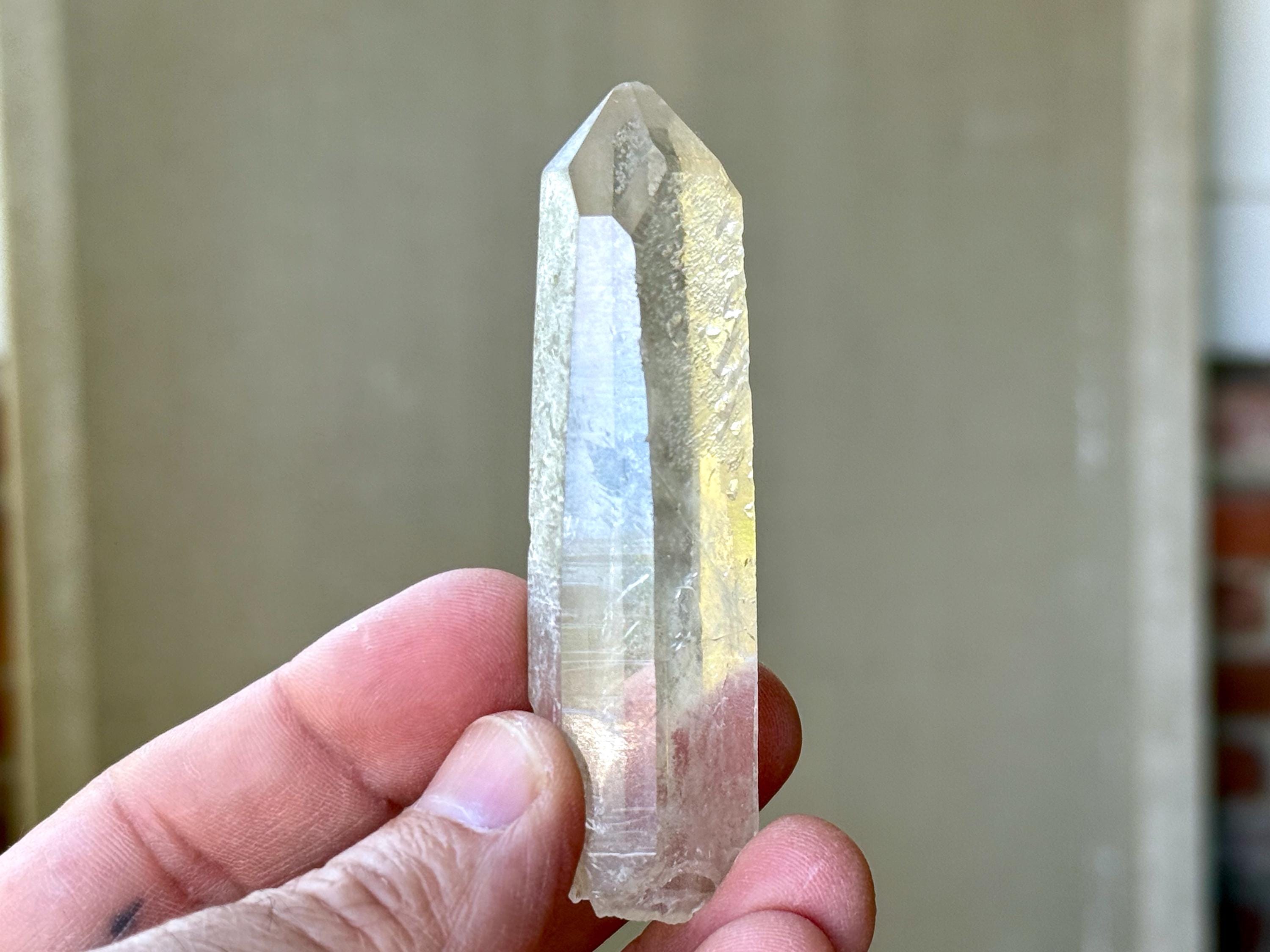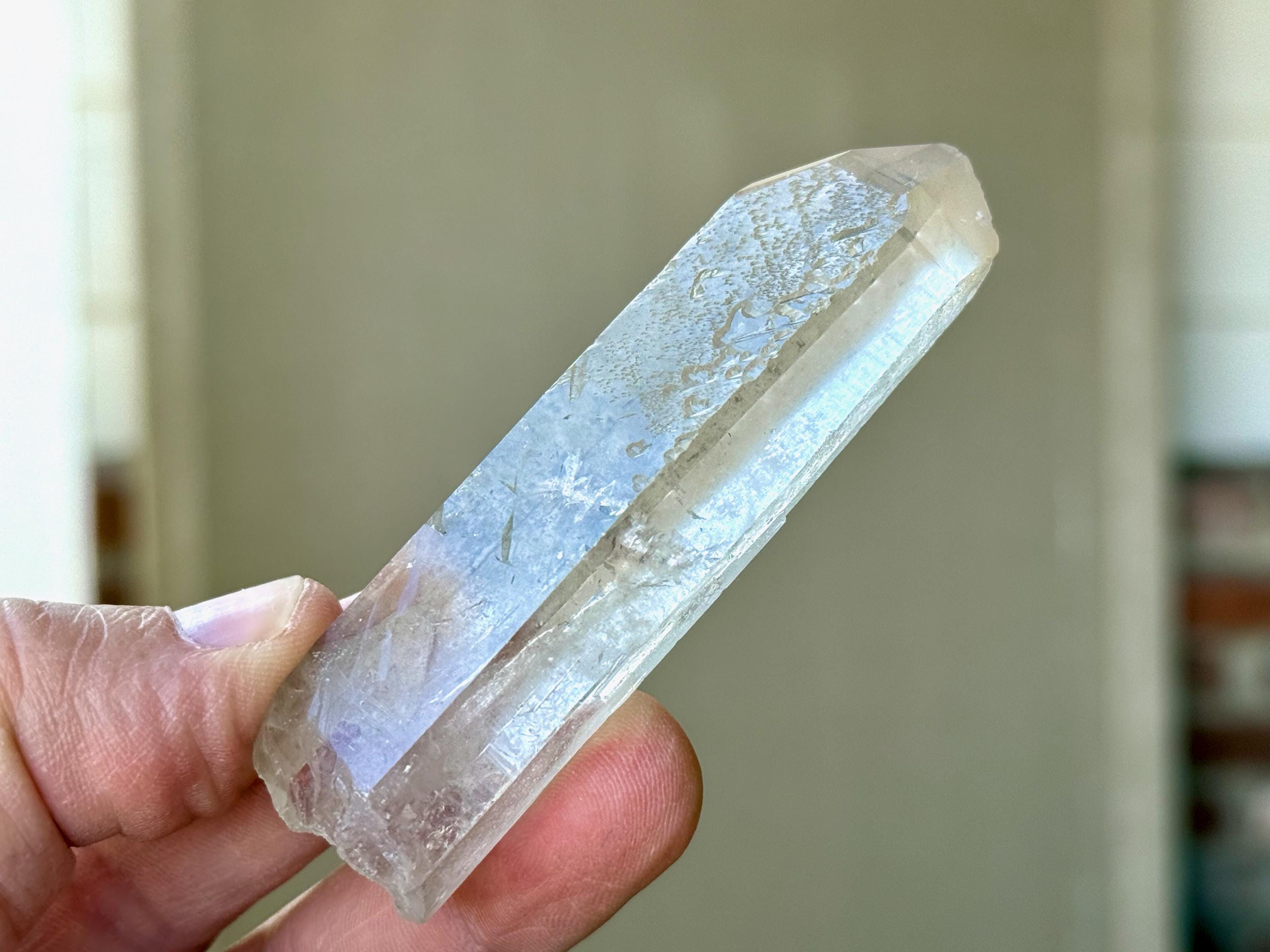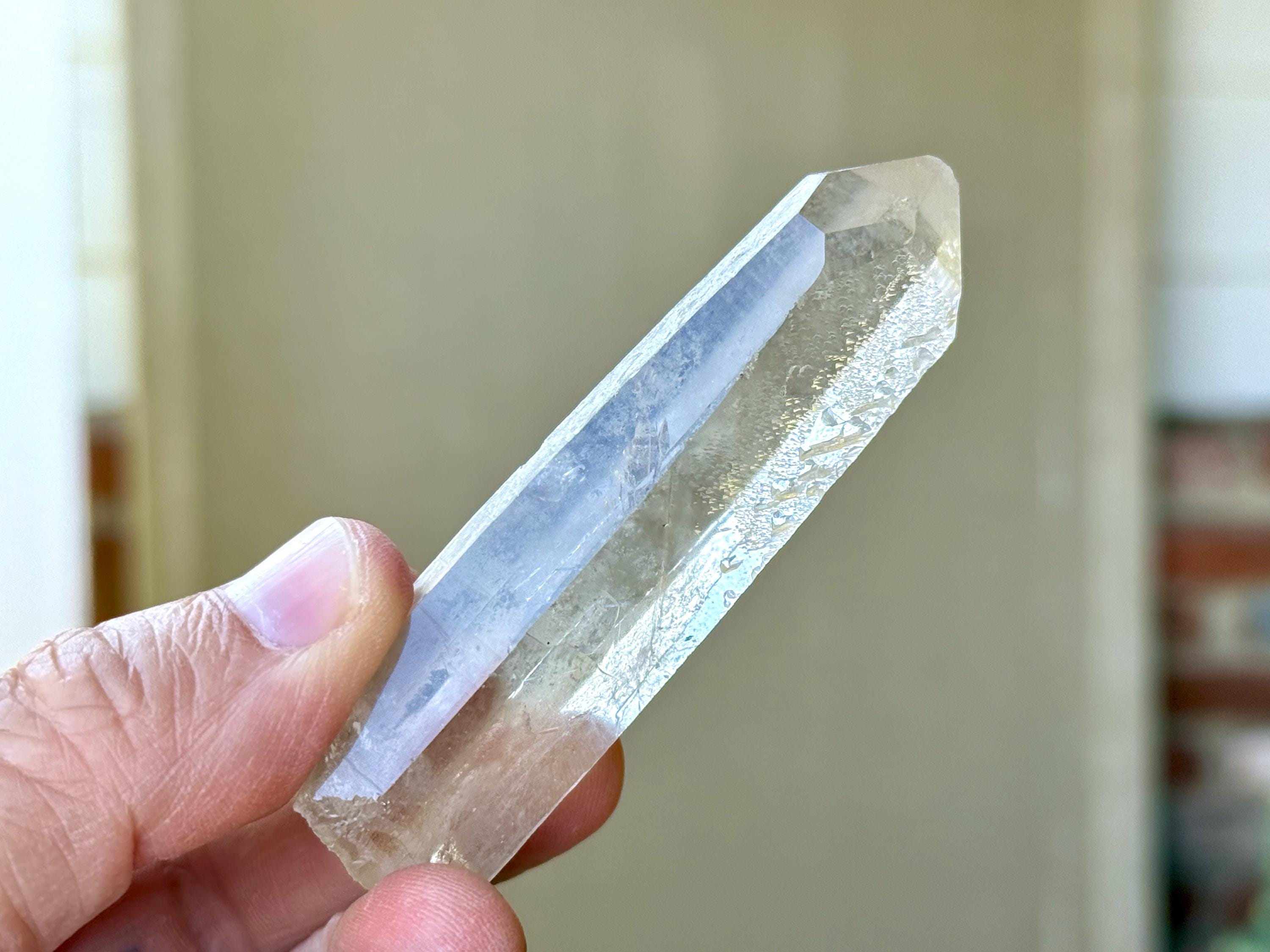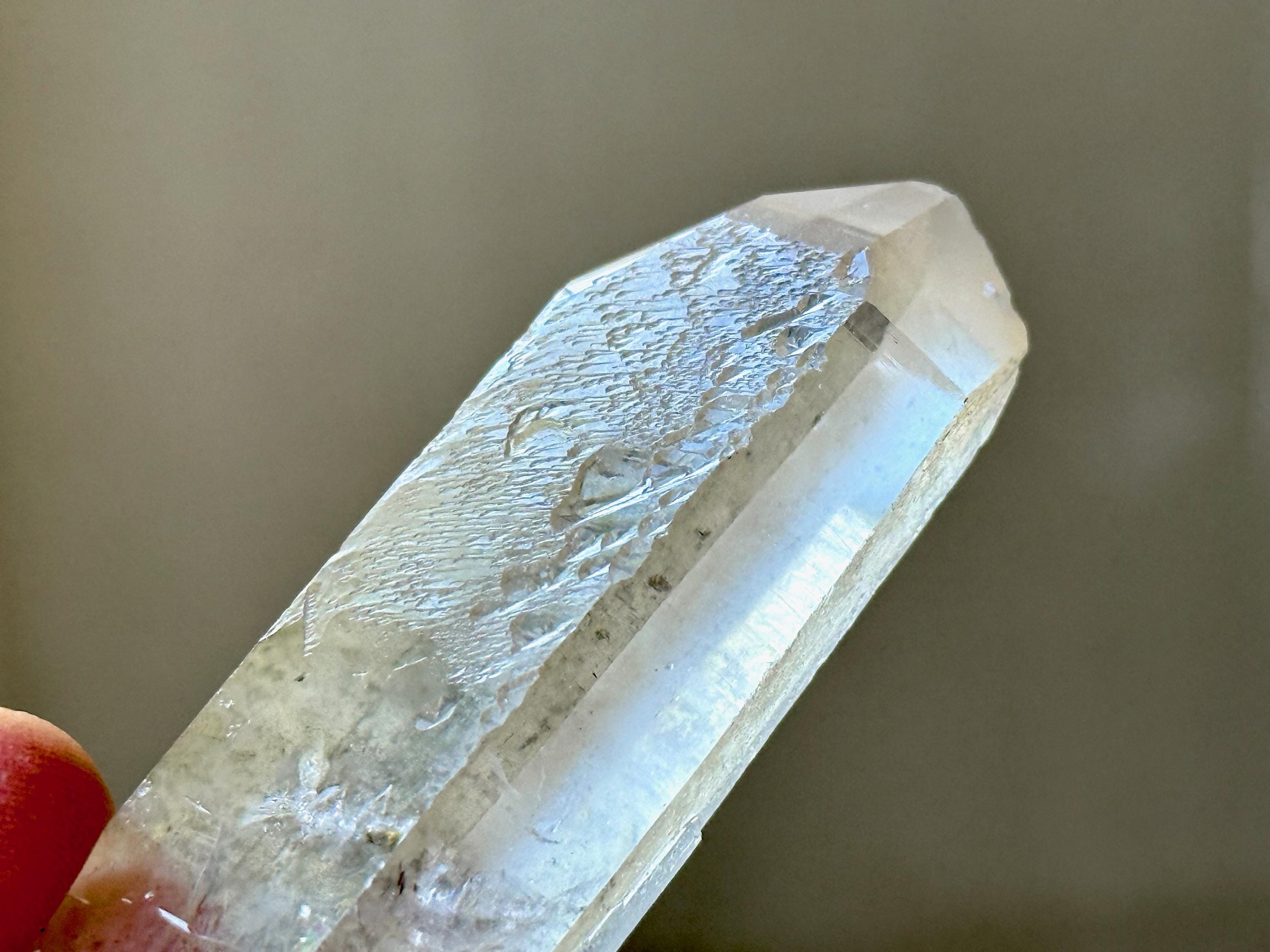 Outstanding clarity and luster to this superb Starbrary Quartz crystals in an elongated formation. This piece possesses beautifully etched "glyphs" on its sides, as well as a slender, rectangular "time link" facet to the right of the main face (Photos 2-3).