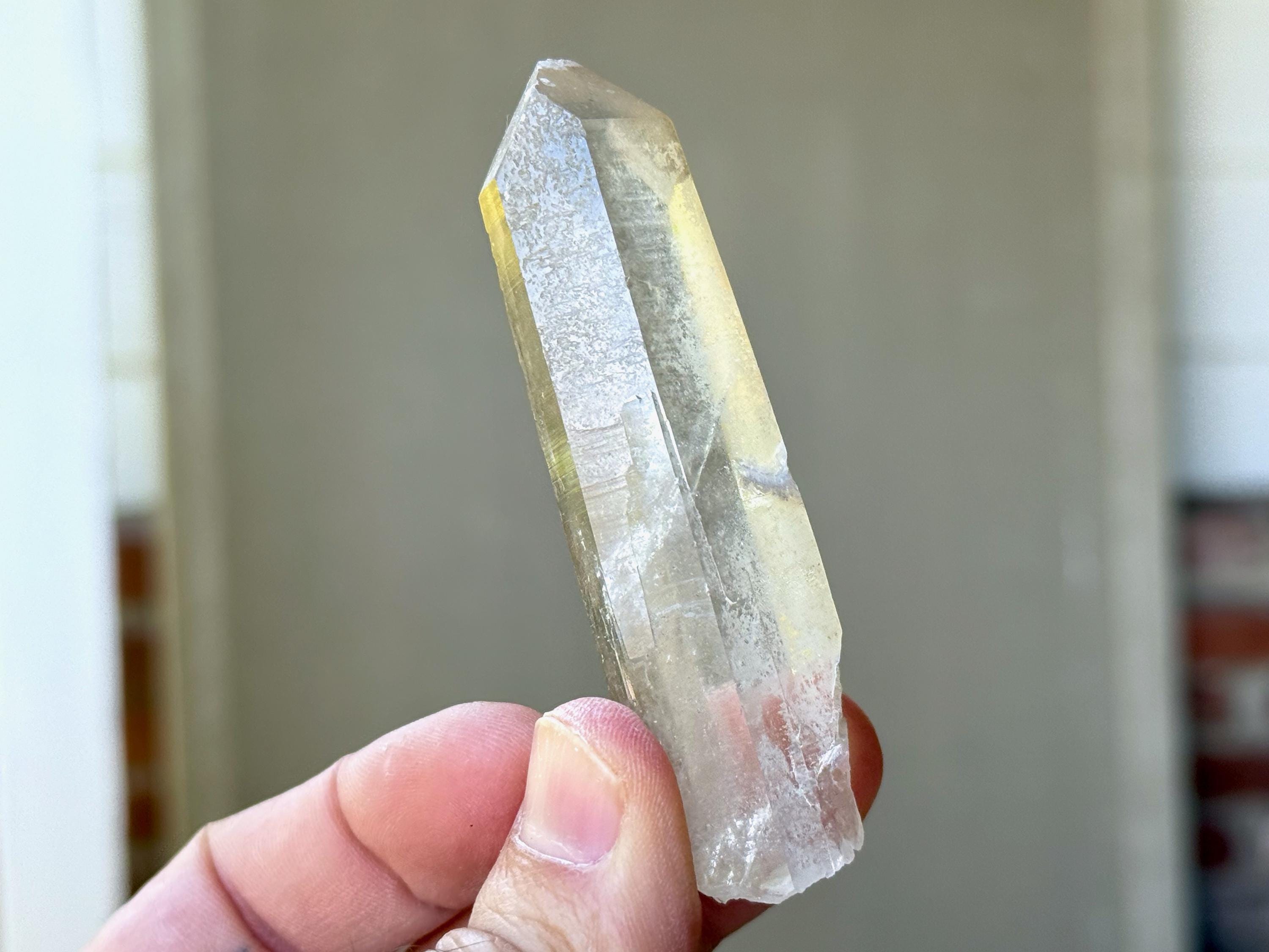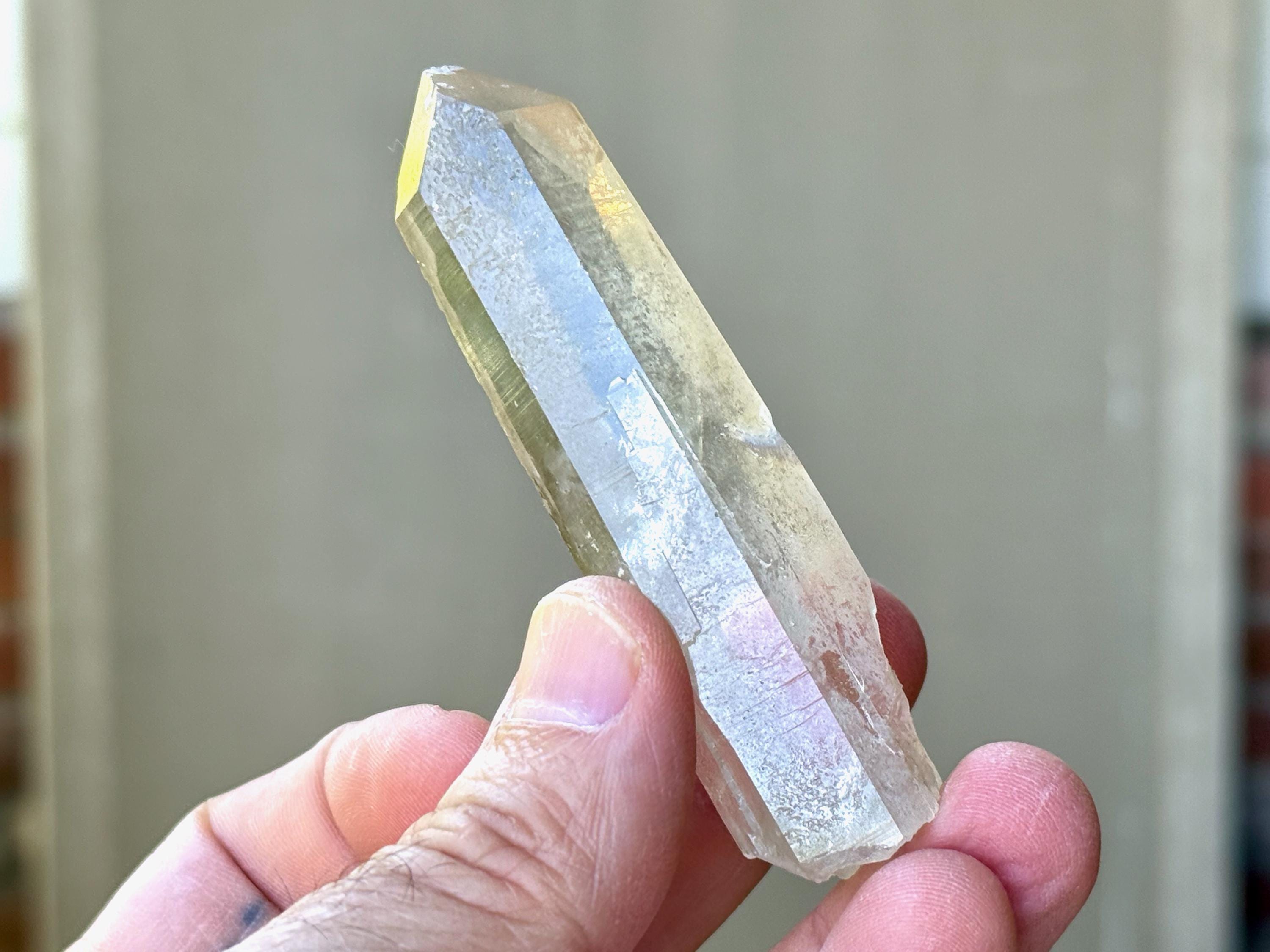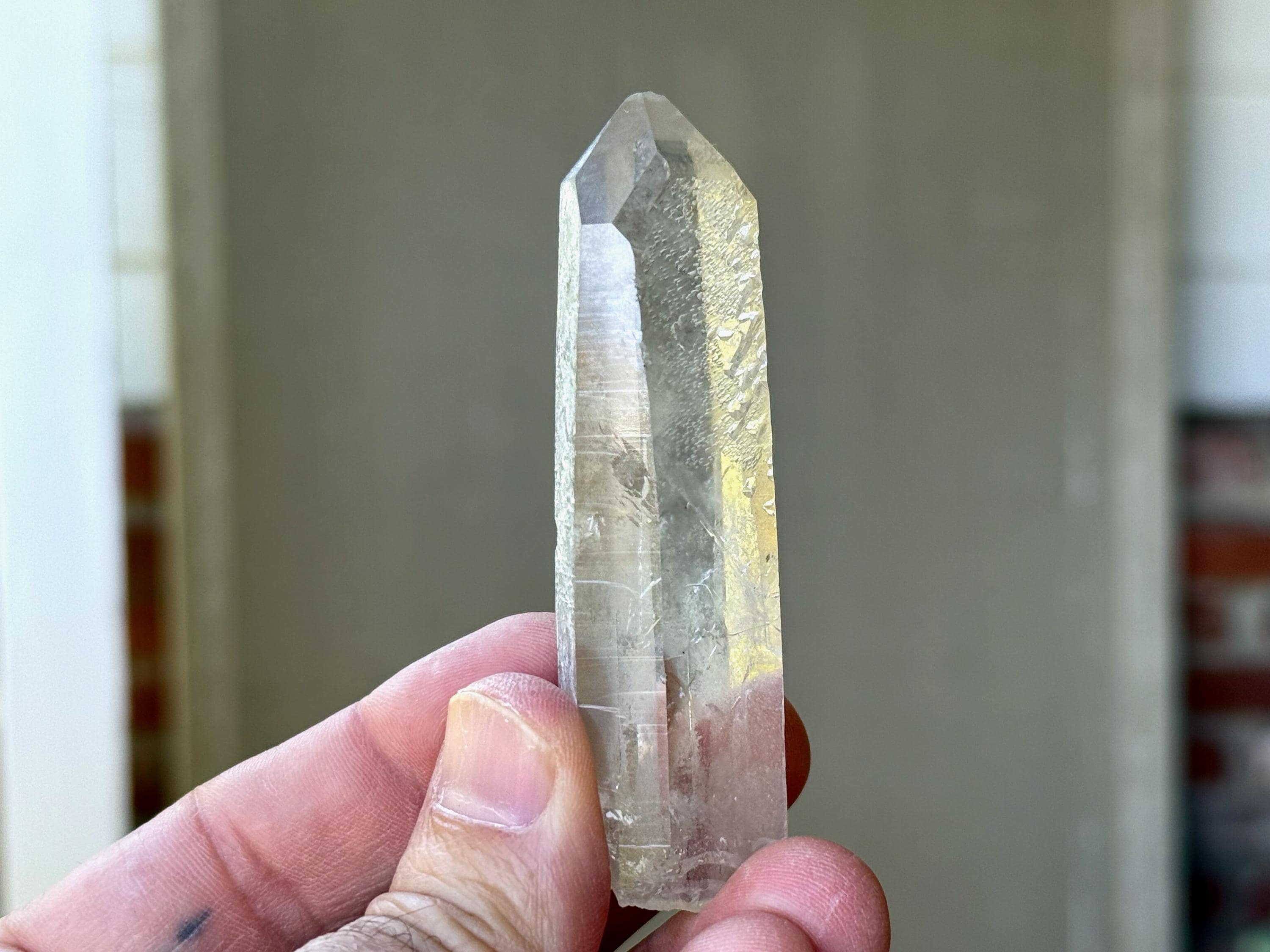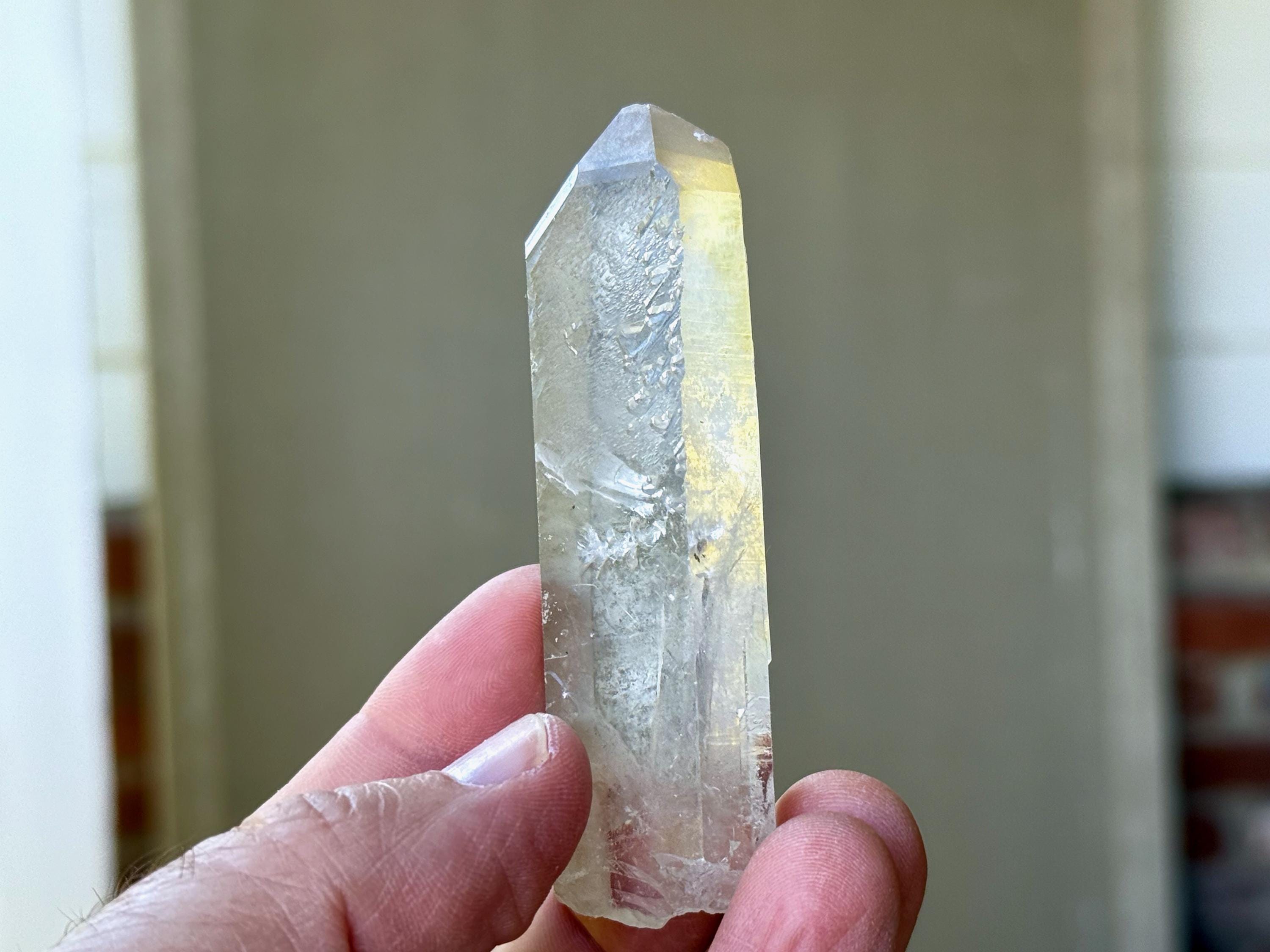 Outstanding clarity and luster to this superb Starbrary Quartz crystals in an elongated formation. This piece possesses beautifully etched "glyphs" on its sides, as well as a slender, rectangular "time link" facet to the right of the main face (Photos 2-3).