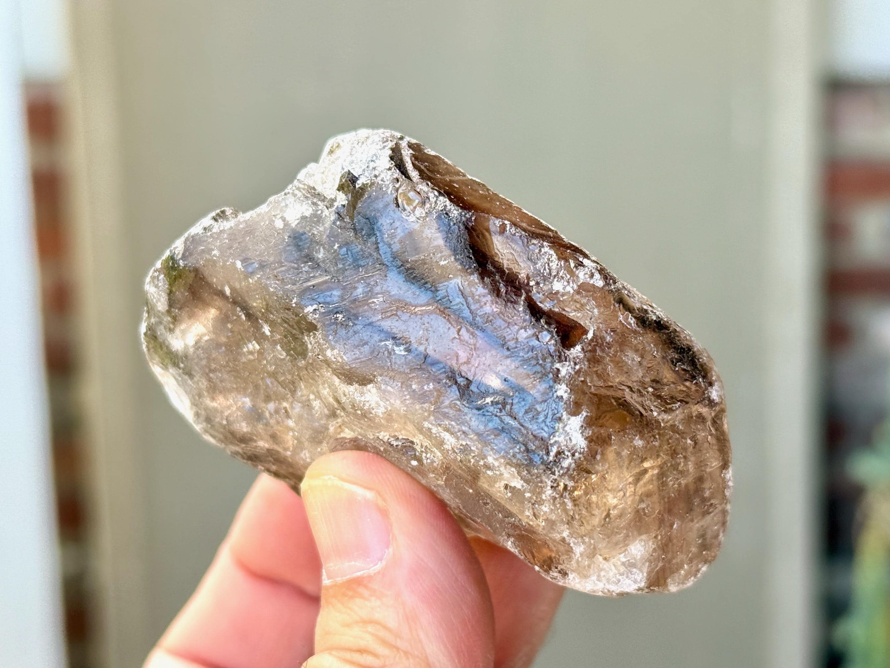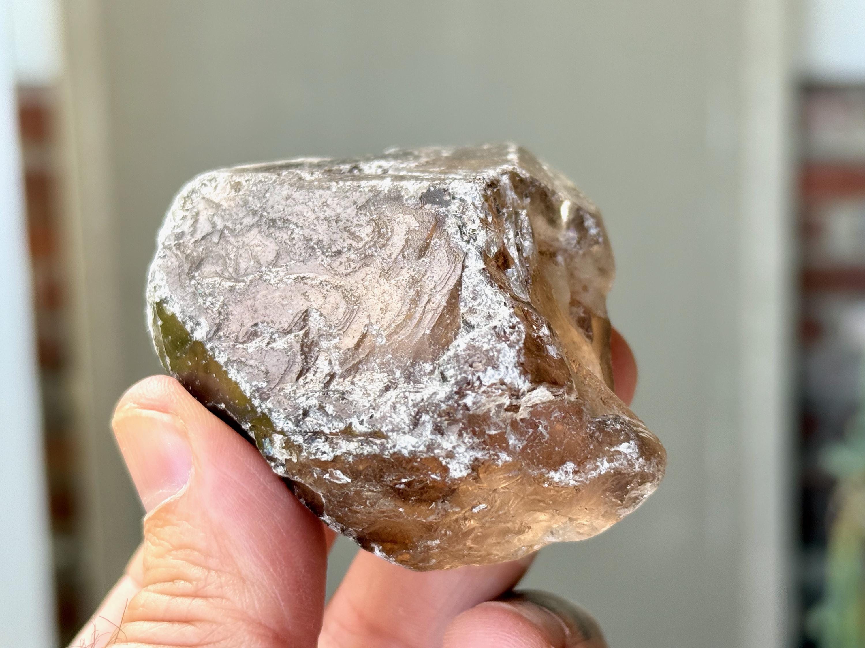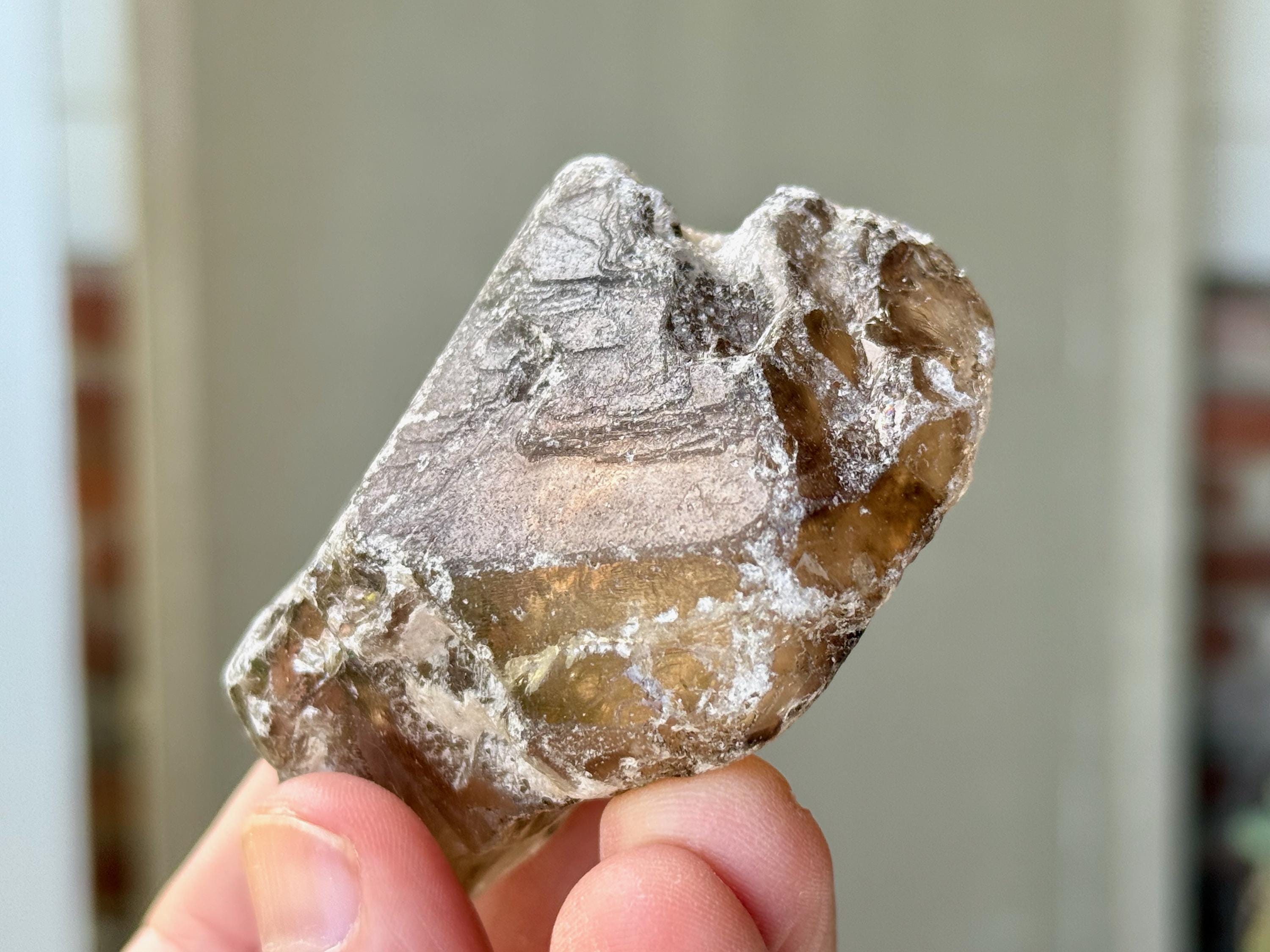 An ancient look and feel to this beautiful Elestial Smoky Citrine crystal with marbled smokiness through muted golden colors throughout. When backlit, as in Photos 3-5, it lights up beautifully.
