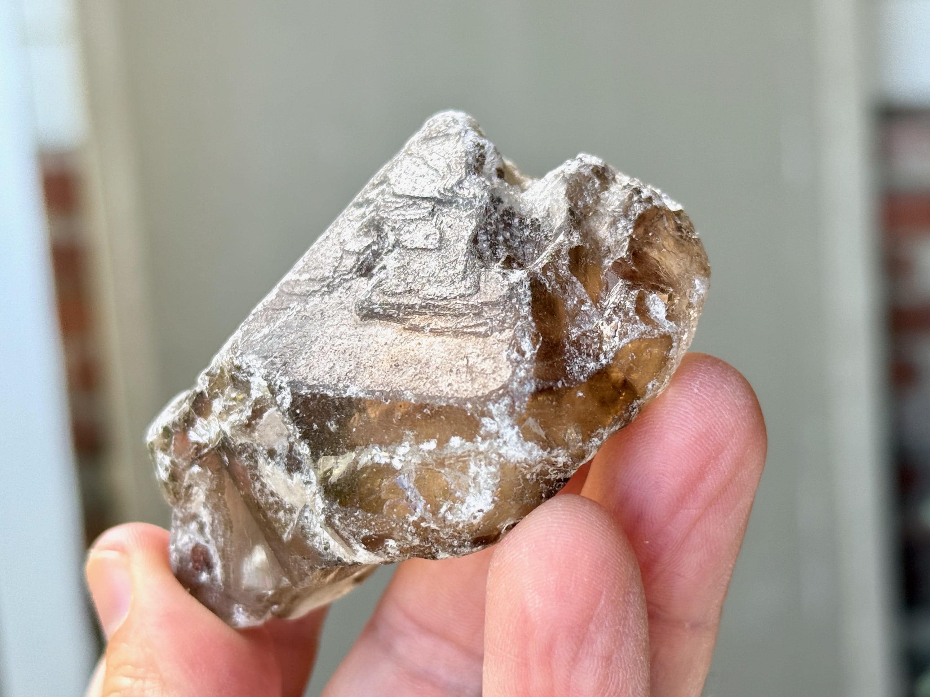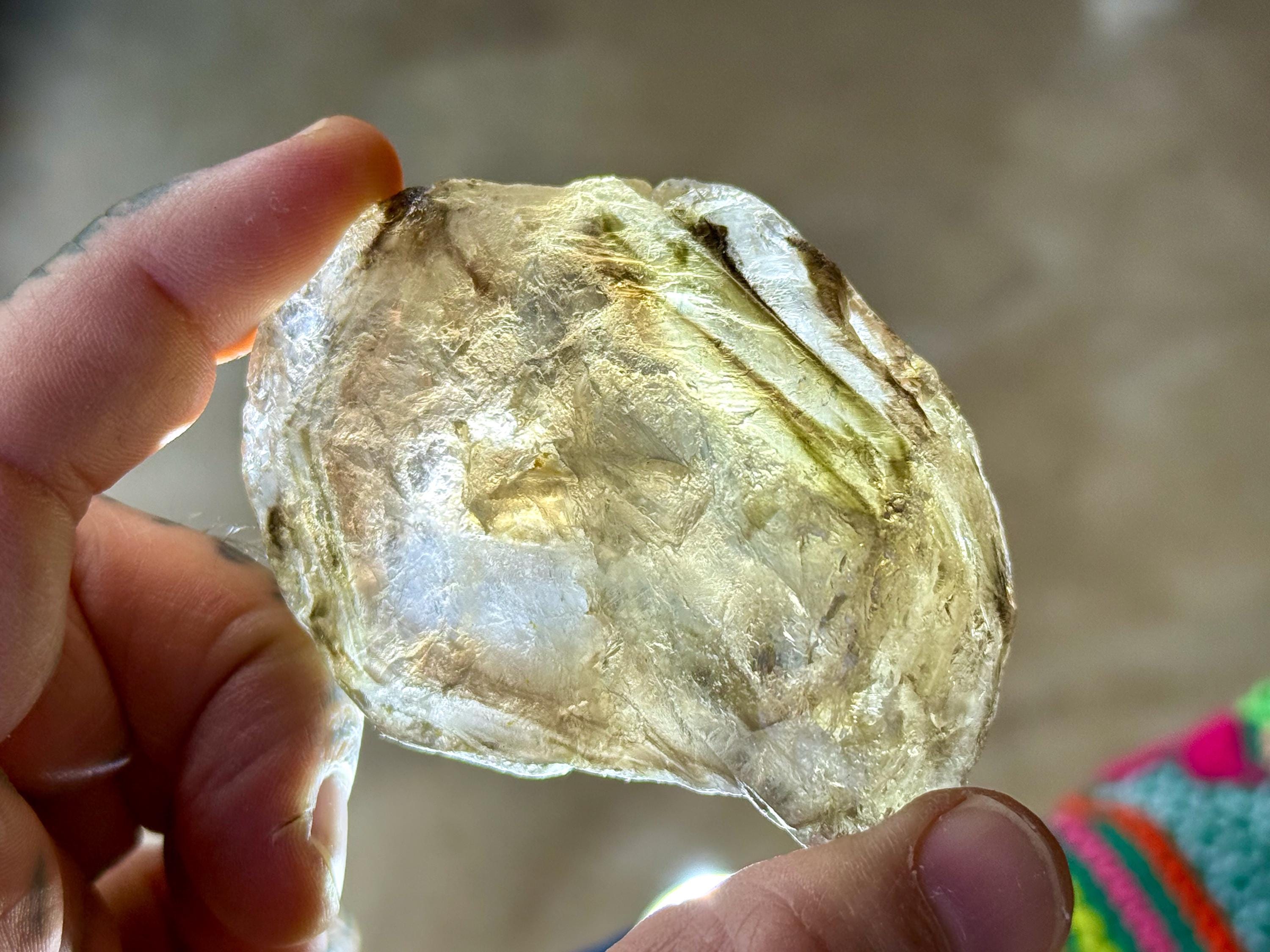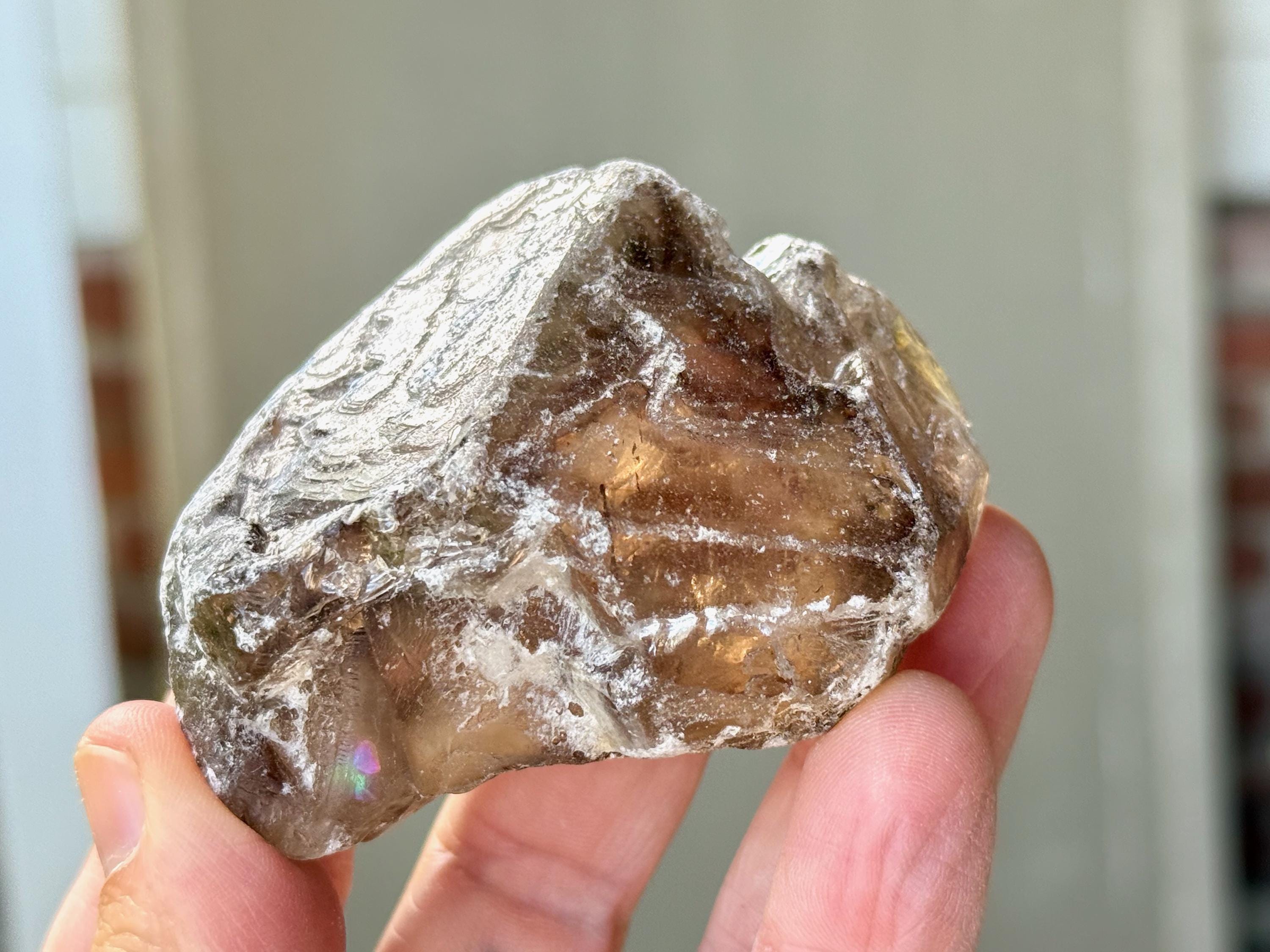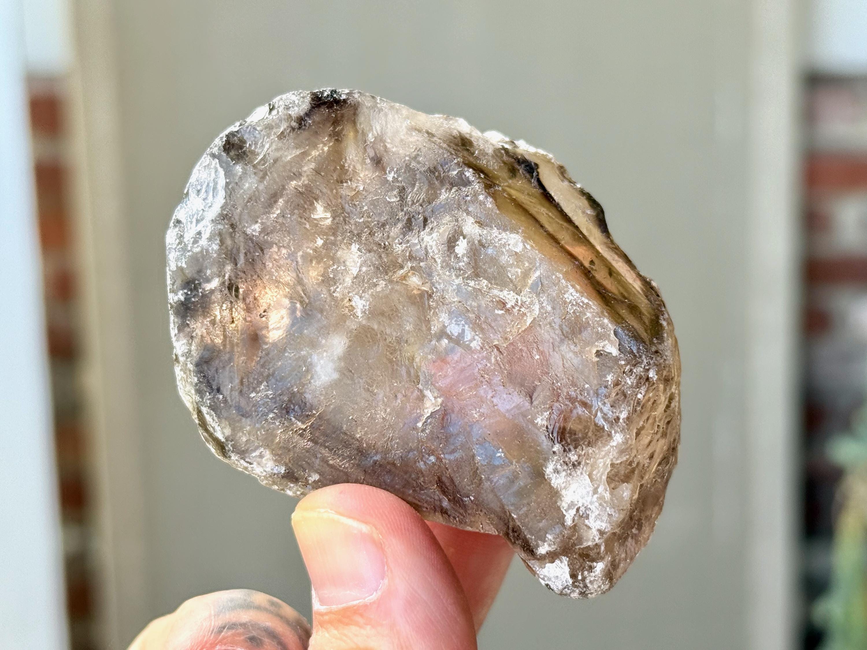 An ancient look and feel to this beautiful Elestial Smoky Citrine crystal with marbled smokiness through muted golden colors throughout. When backlit, as in Photos 3-5, it lights up beautifully.