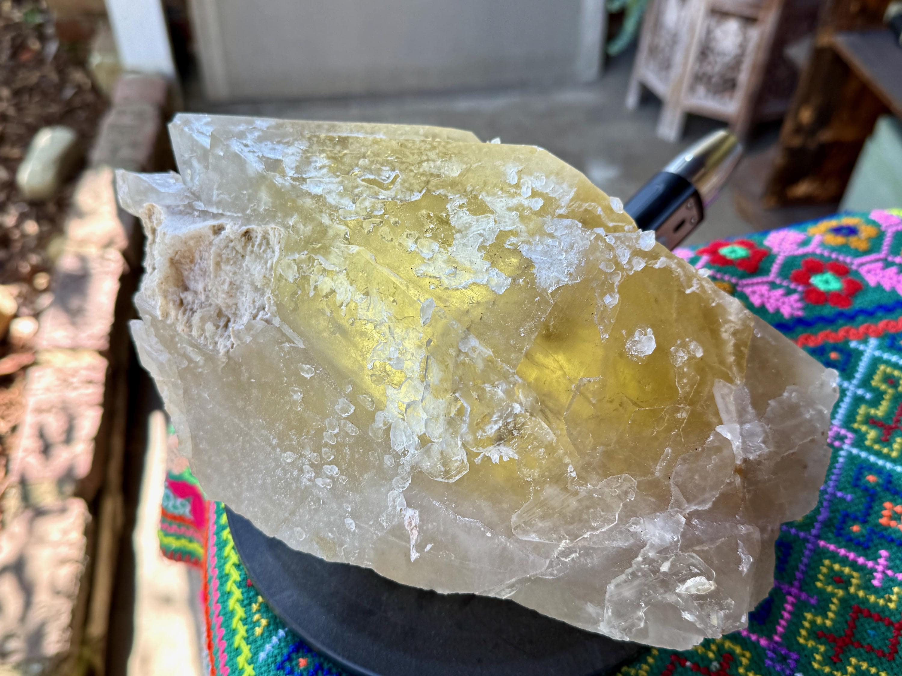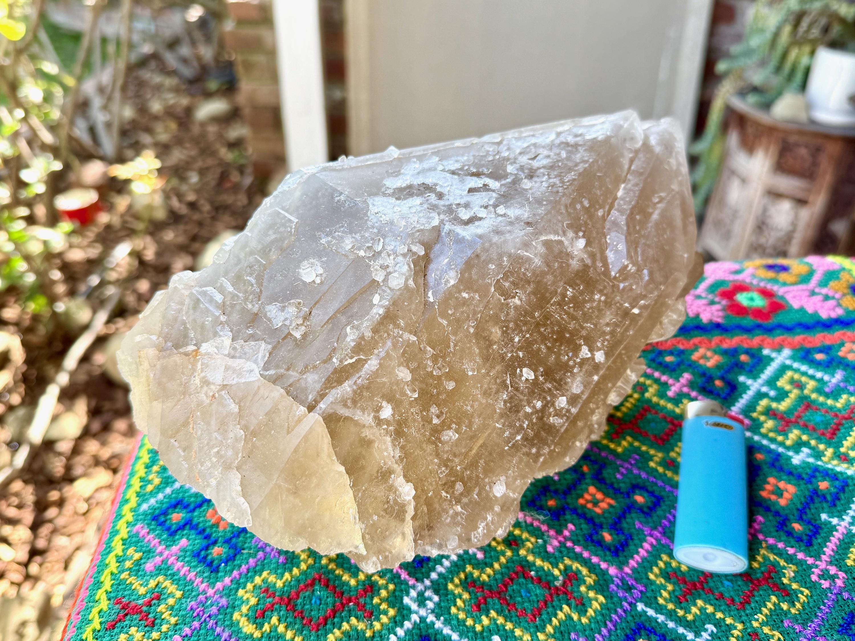 At close to 8 pounds (3.6 kilograms), the sheer size of this crystal is impressive (Photo 6 shows a standard lighter next to it for comparison). This crystal displays a subtle zoning of color, ranging from mildly golden and pale at the left and underside to richer, muted gold on the main part of the body. Despite its thickness, when backlit, it passes light beautifully, lighting up in brilliant fashion! (Photos 1, 4-5).