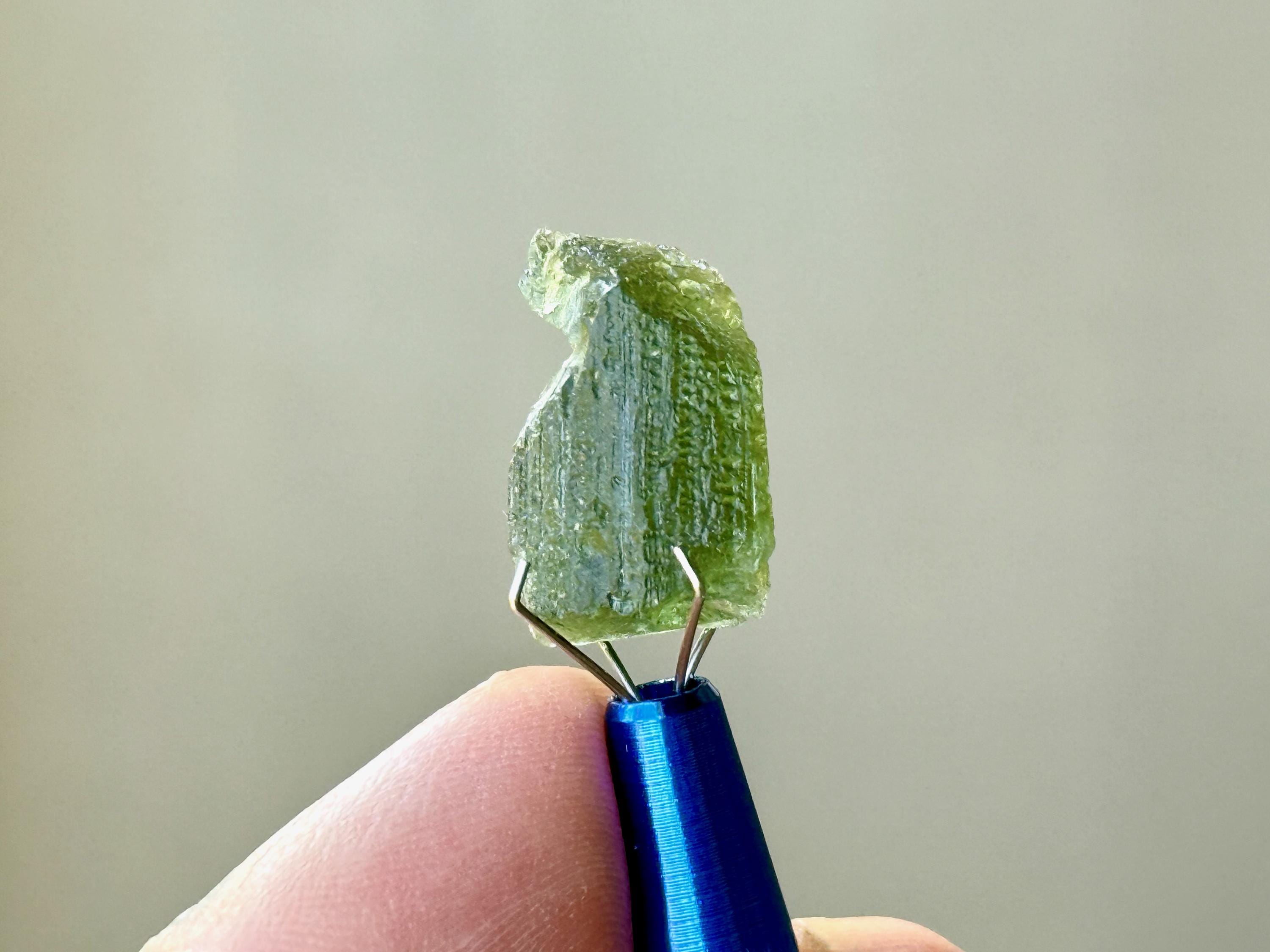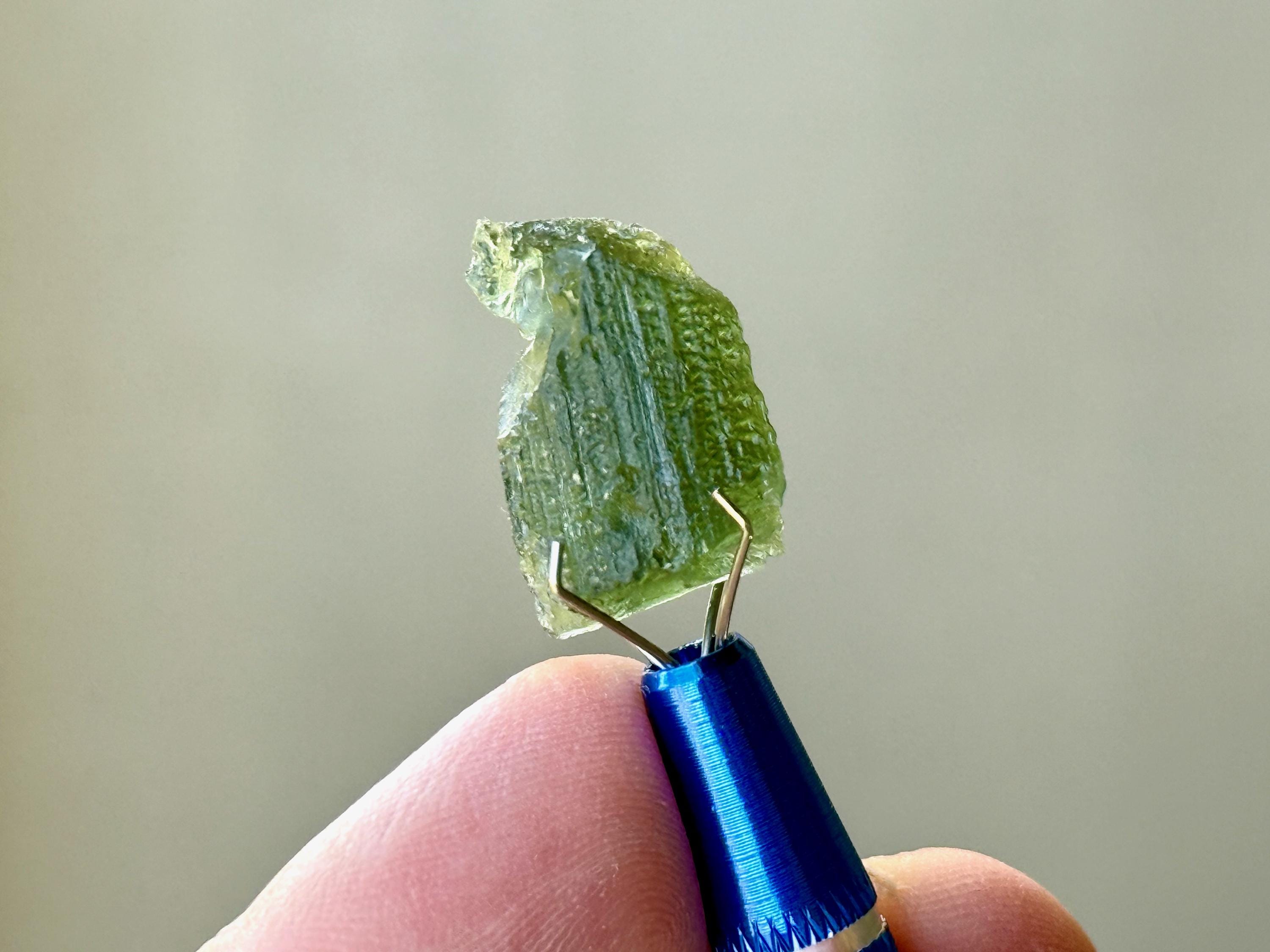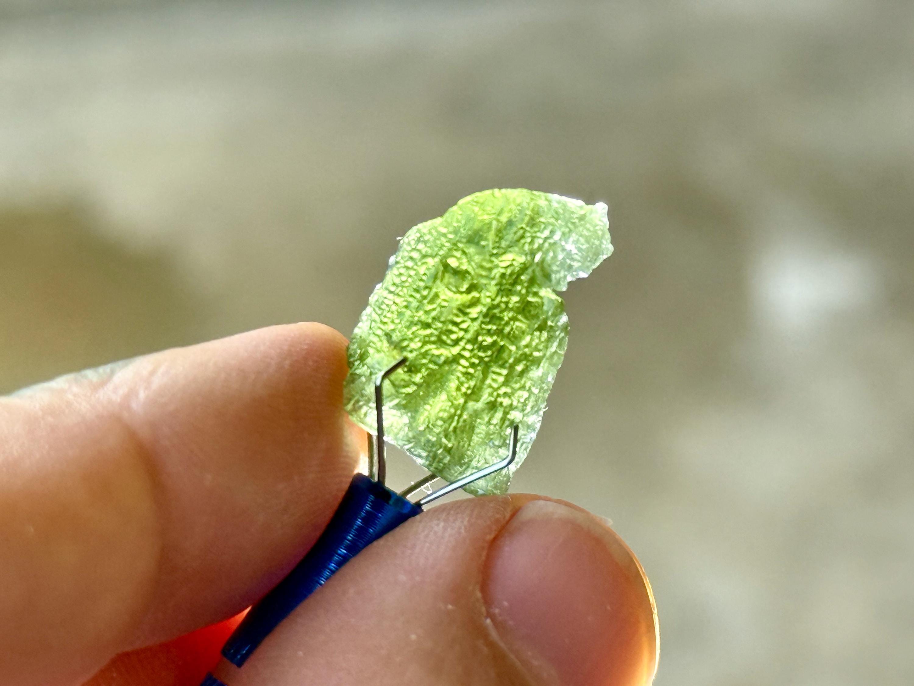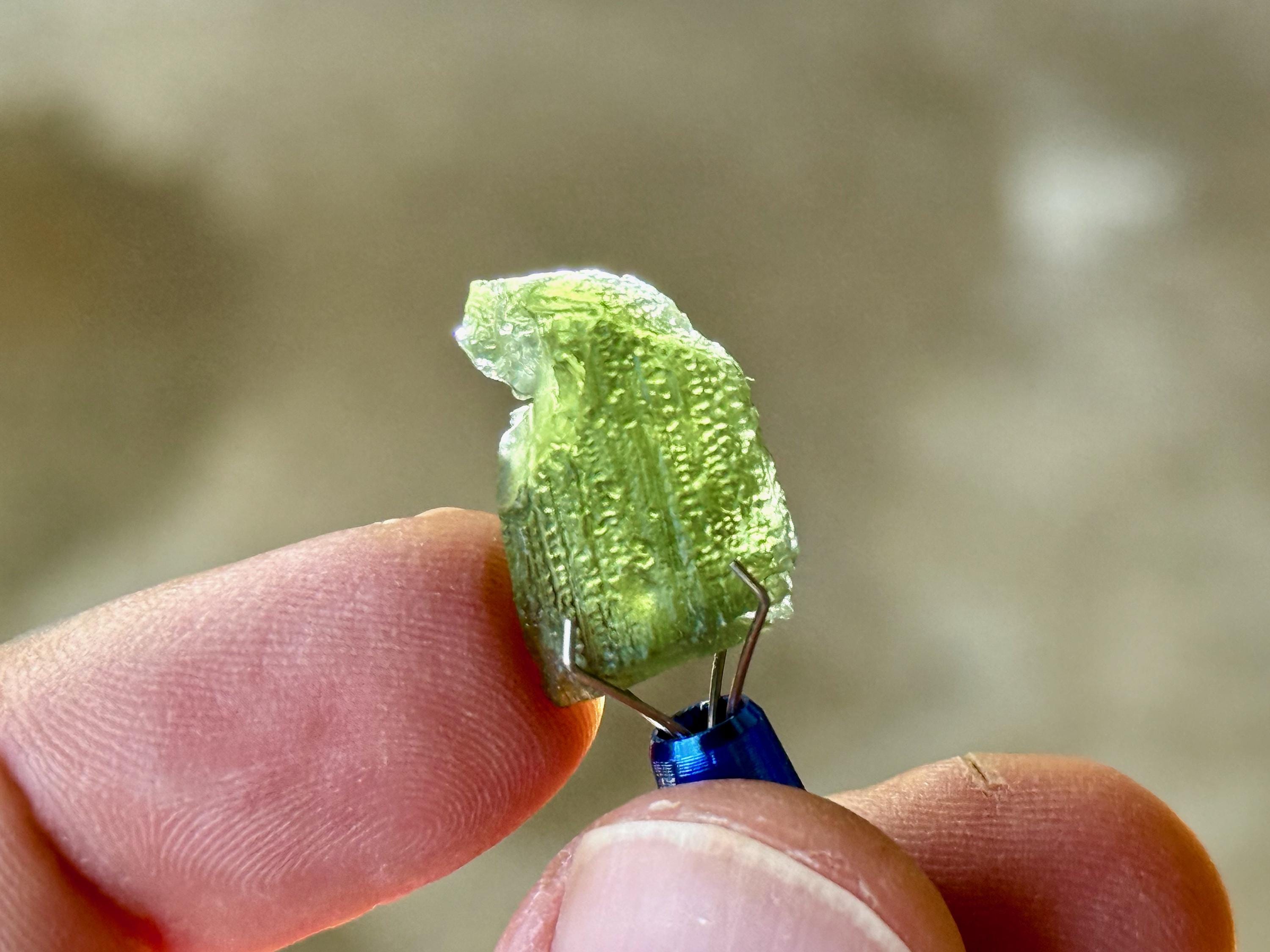 This superb Moldavite crystal comes from Chlum, Czech Republic. We purchase directly, in person, from the Czech purveyors of this material so we can assure that it is authentic and high quality.