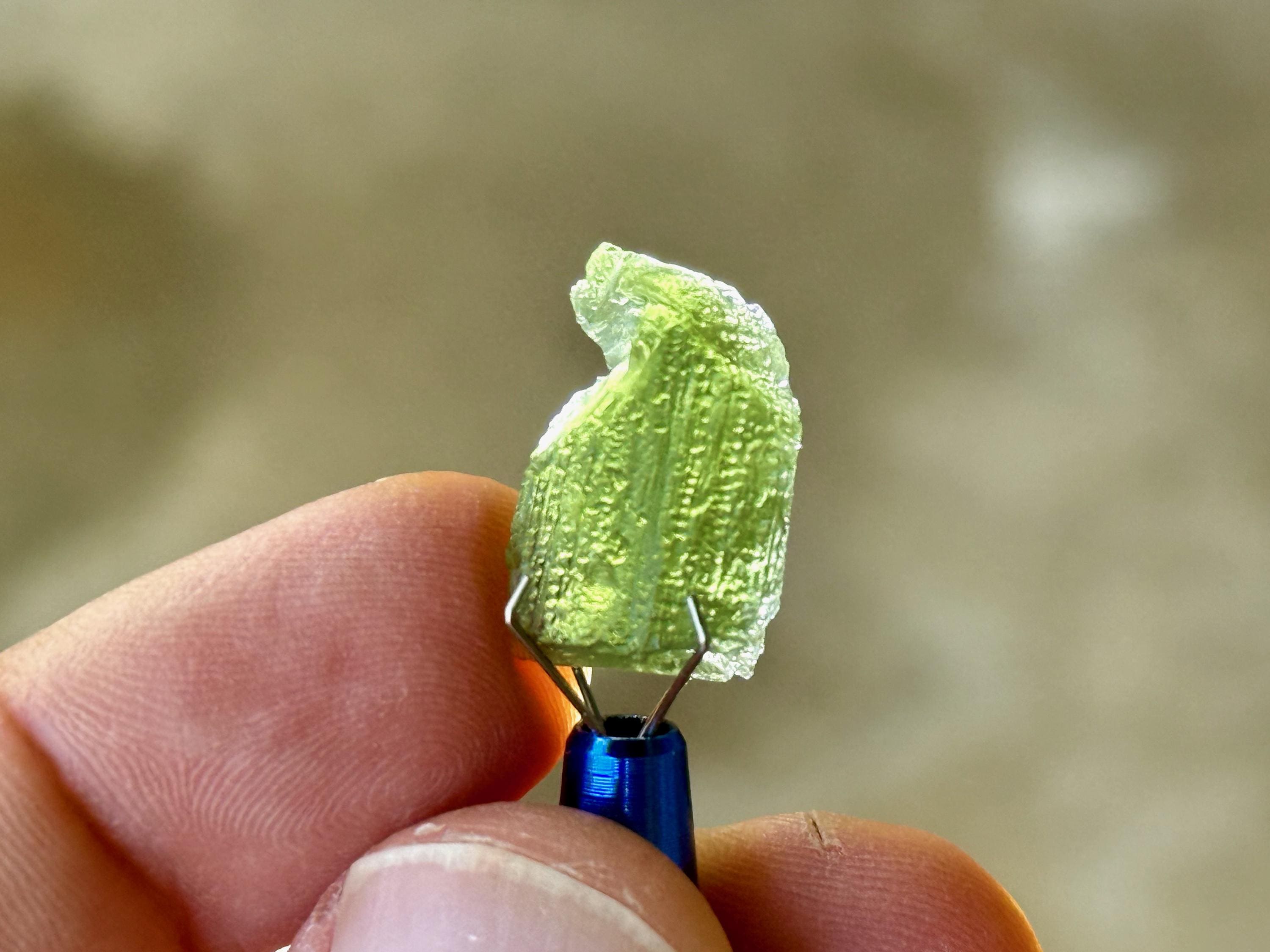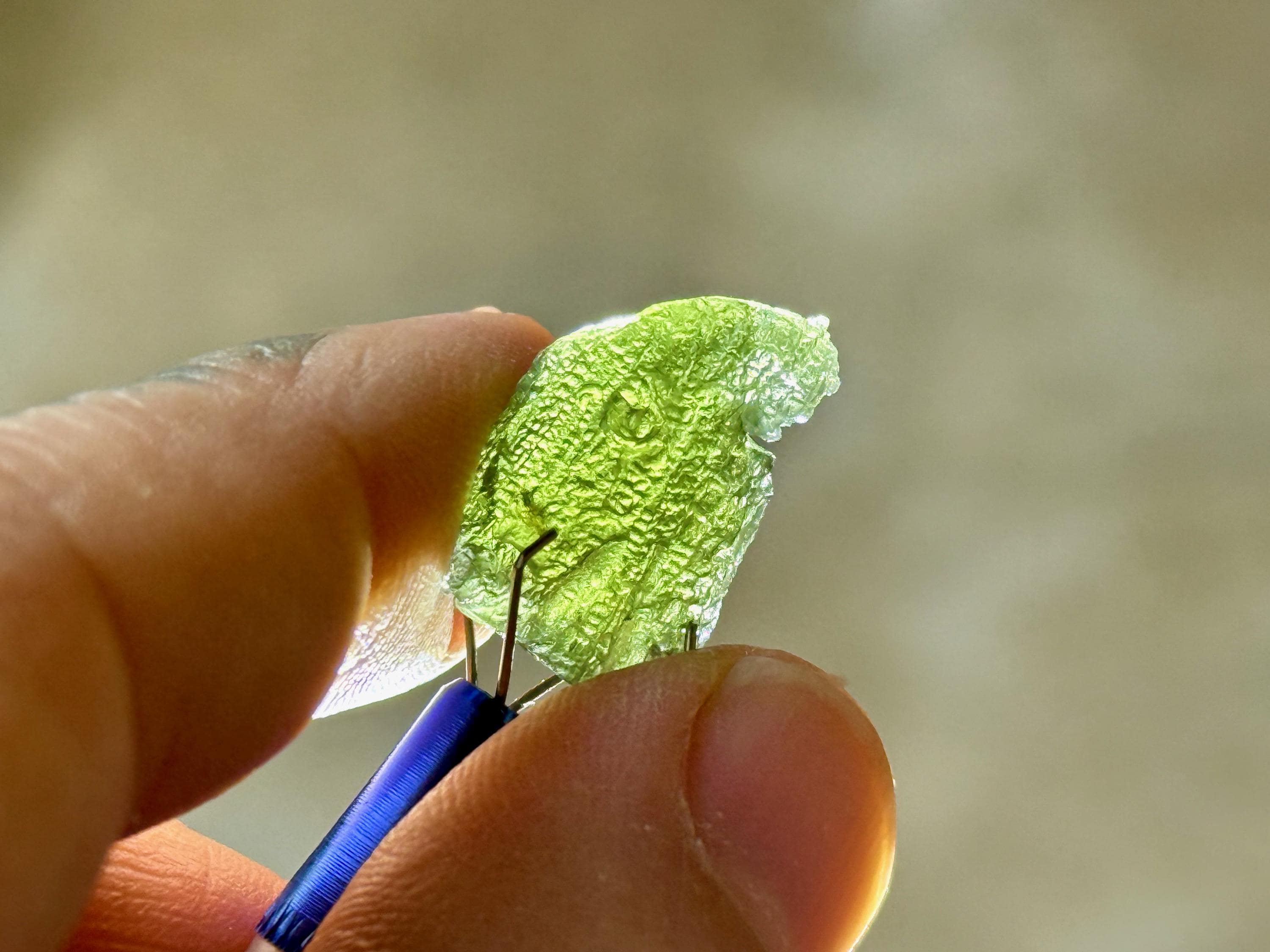 A beautiful "nugget" of a Moldavite with a rich green color, pitted textures throughout and a unique little curl at the top. This green hue can be appreciated in normal light, but when backlit (as pictured), it truly comes to life.