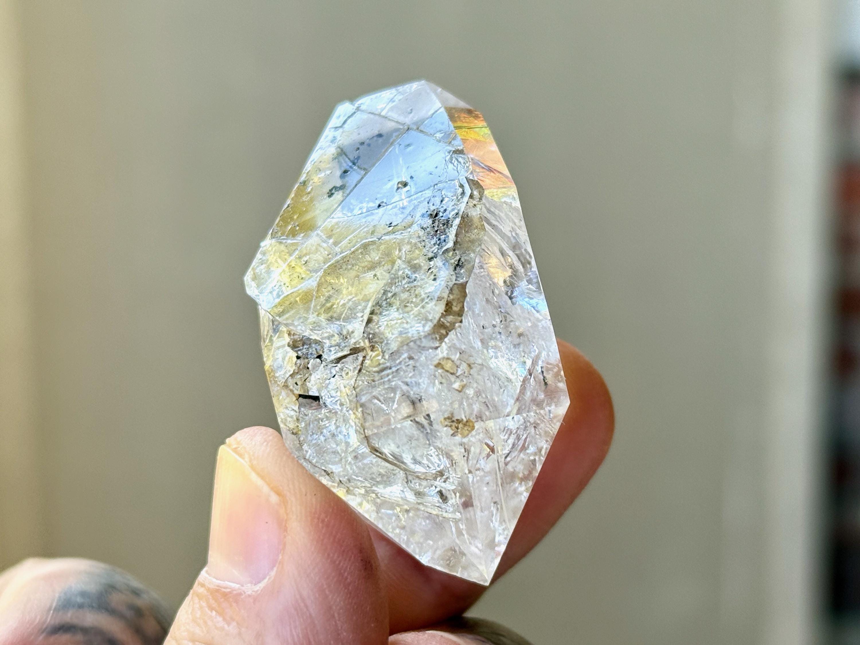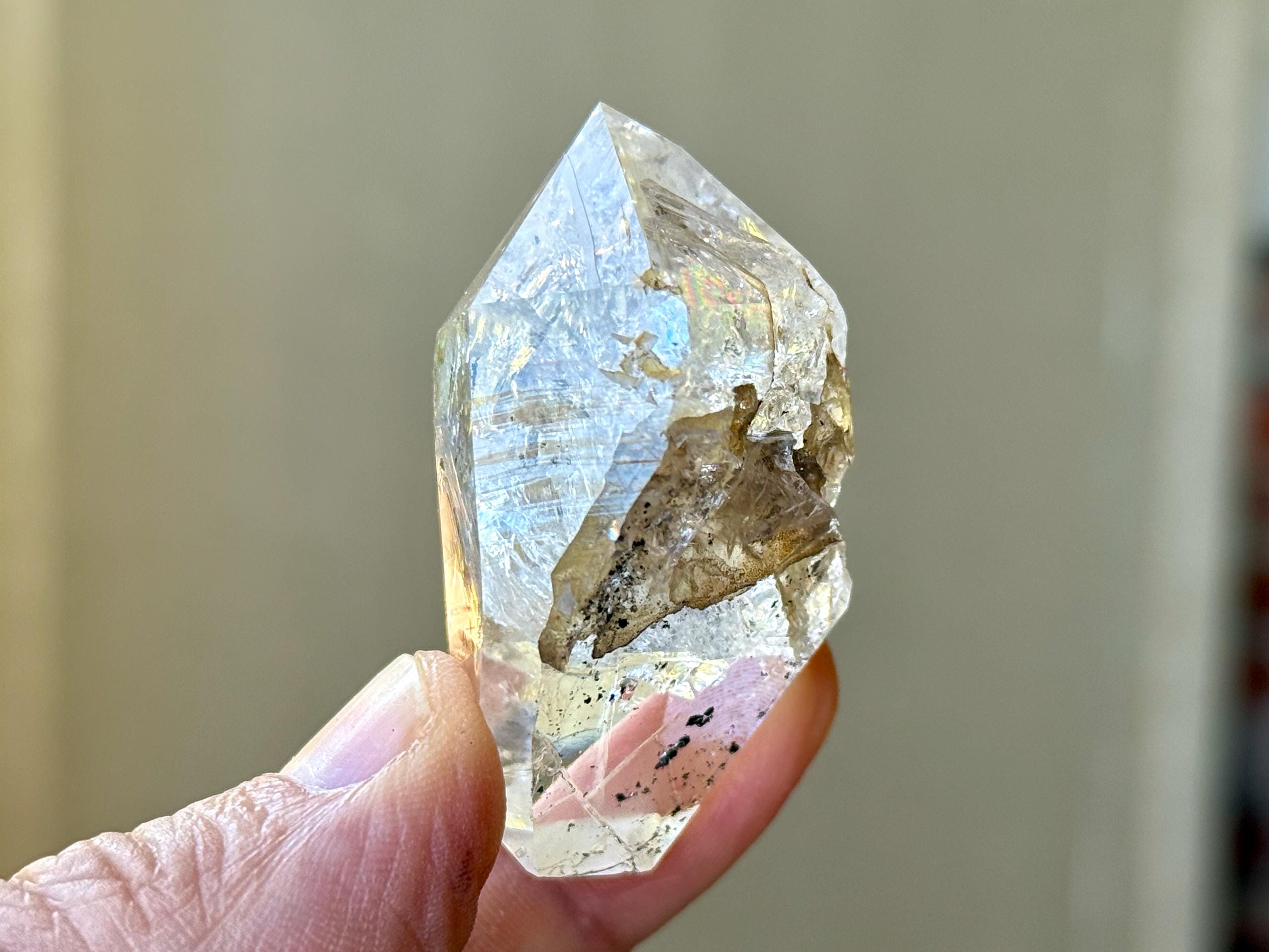 This crystal is super lustrous and just seems to emanate light, which is partially due to the wonderful array of crystalline formations within. There are a few flashing rainbows we can see in the main facet area.