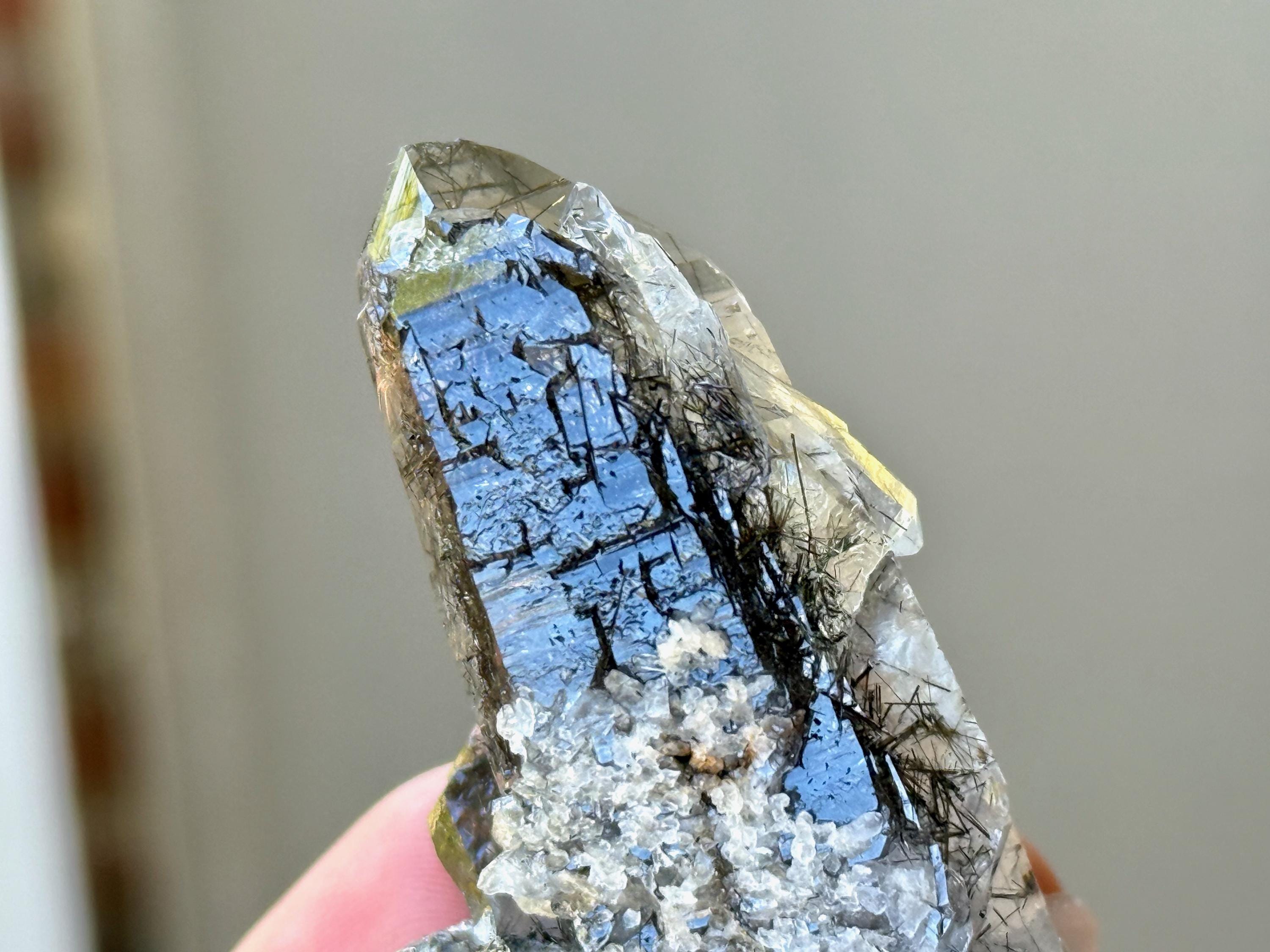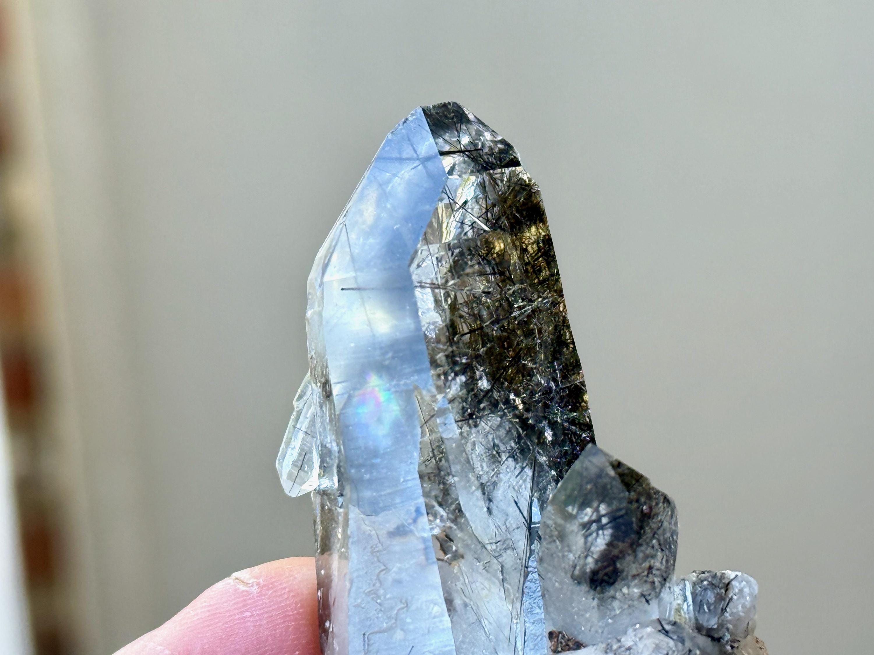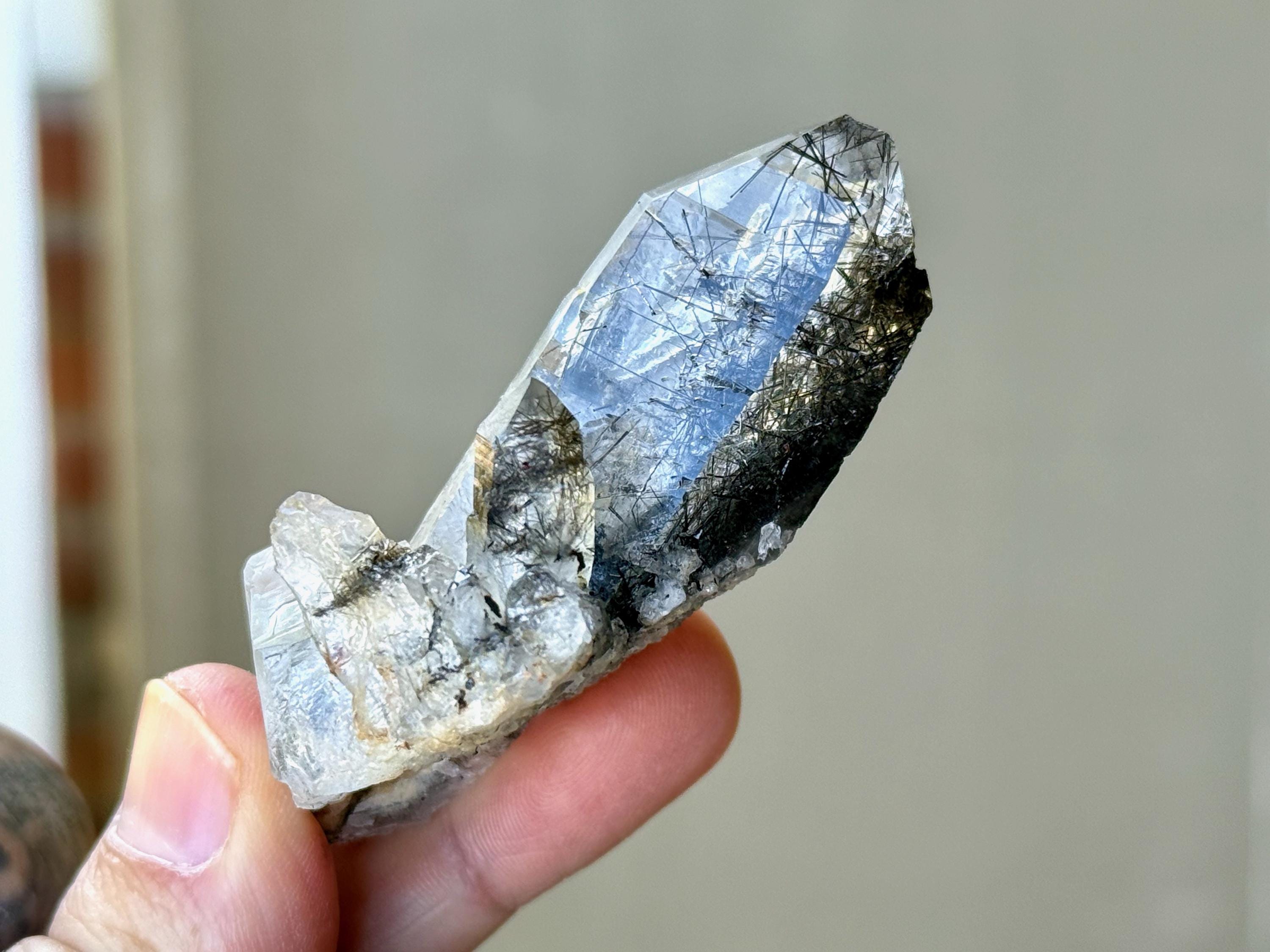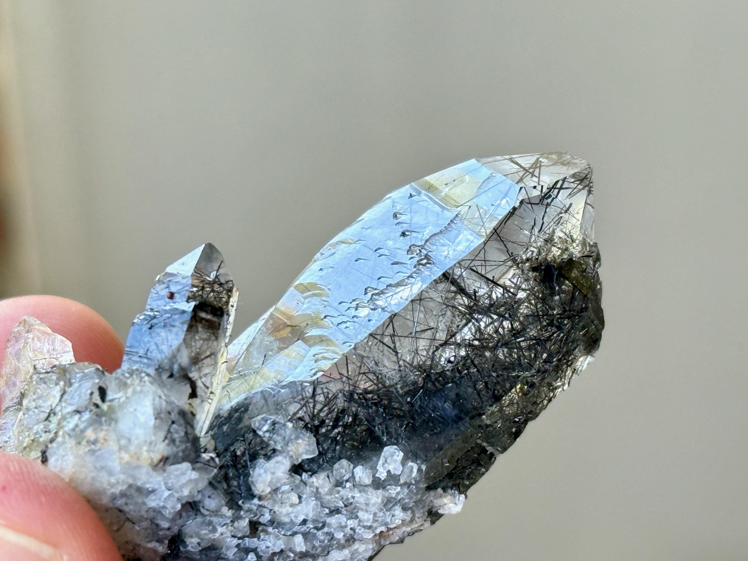 Water-clear clarity and brilliant, vitreous luster to this Quartz crystal with a rich inclusion of Black Tourmaline needles throughout. What is quite special about this piece is the presence of pitted "Starbrary" markings on its right side, the only crystal from this collection so far to display these (Photo 4).