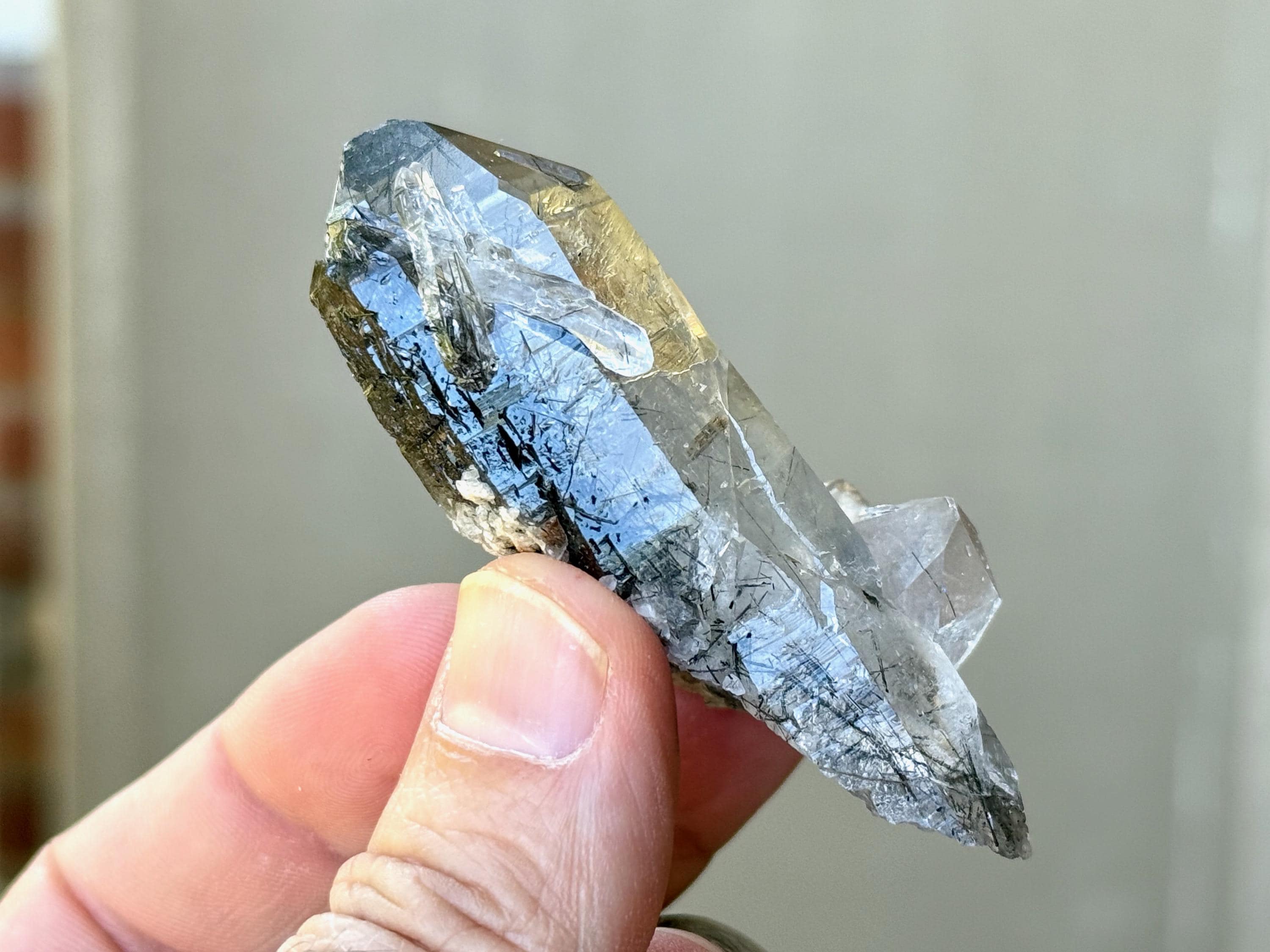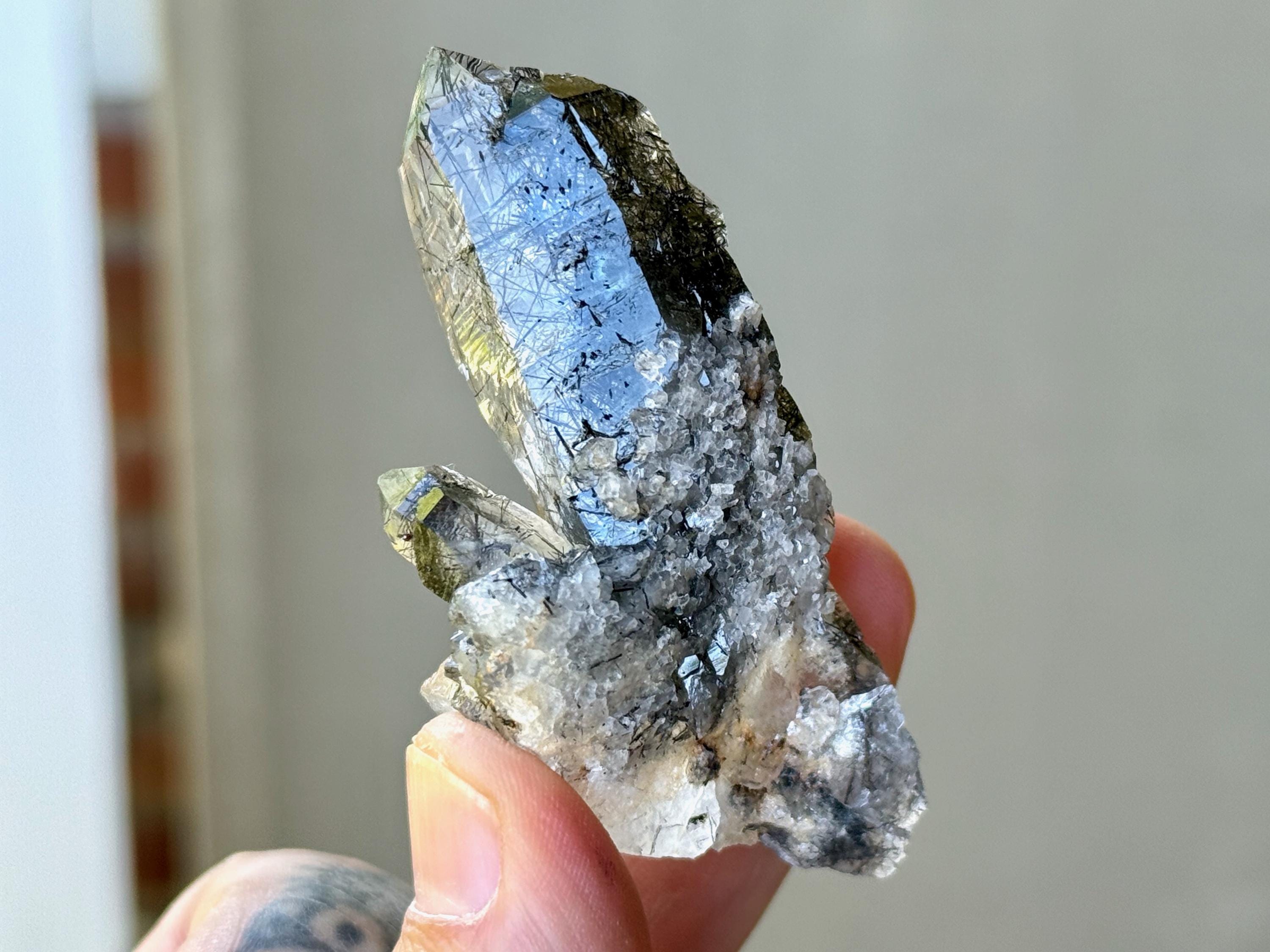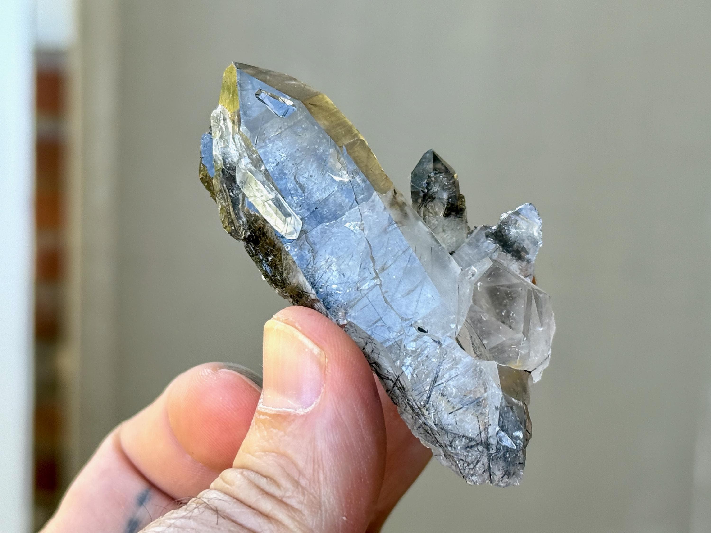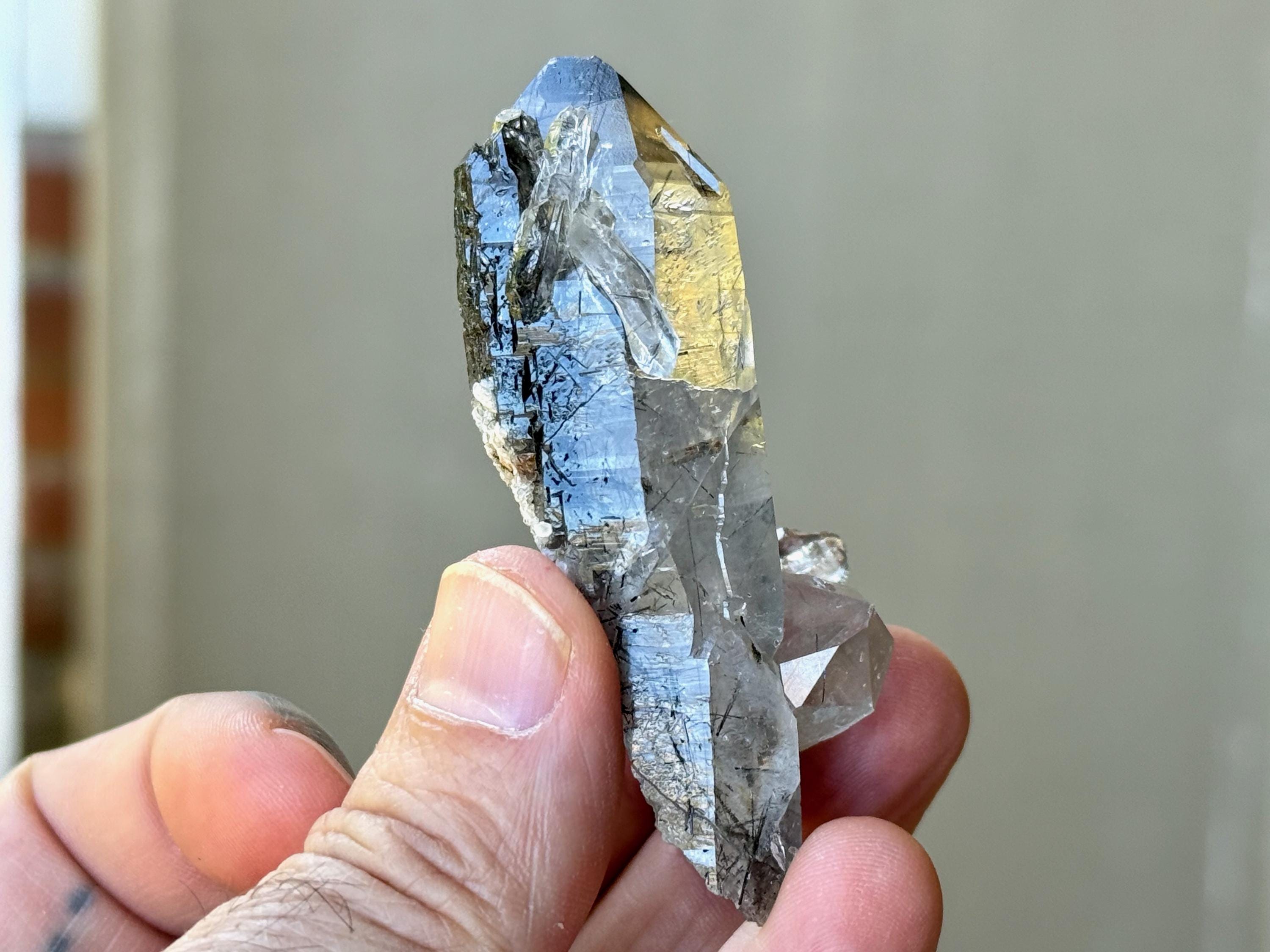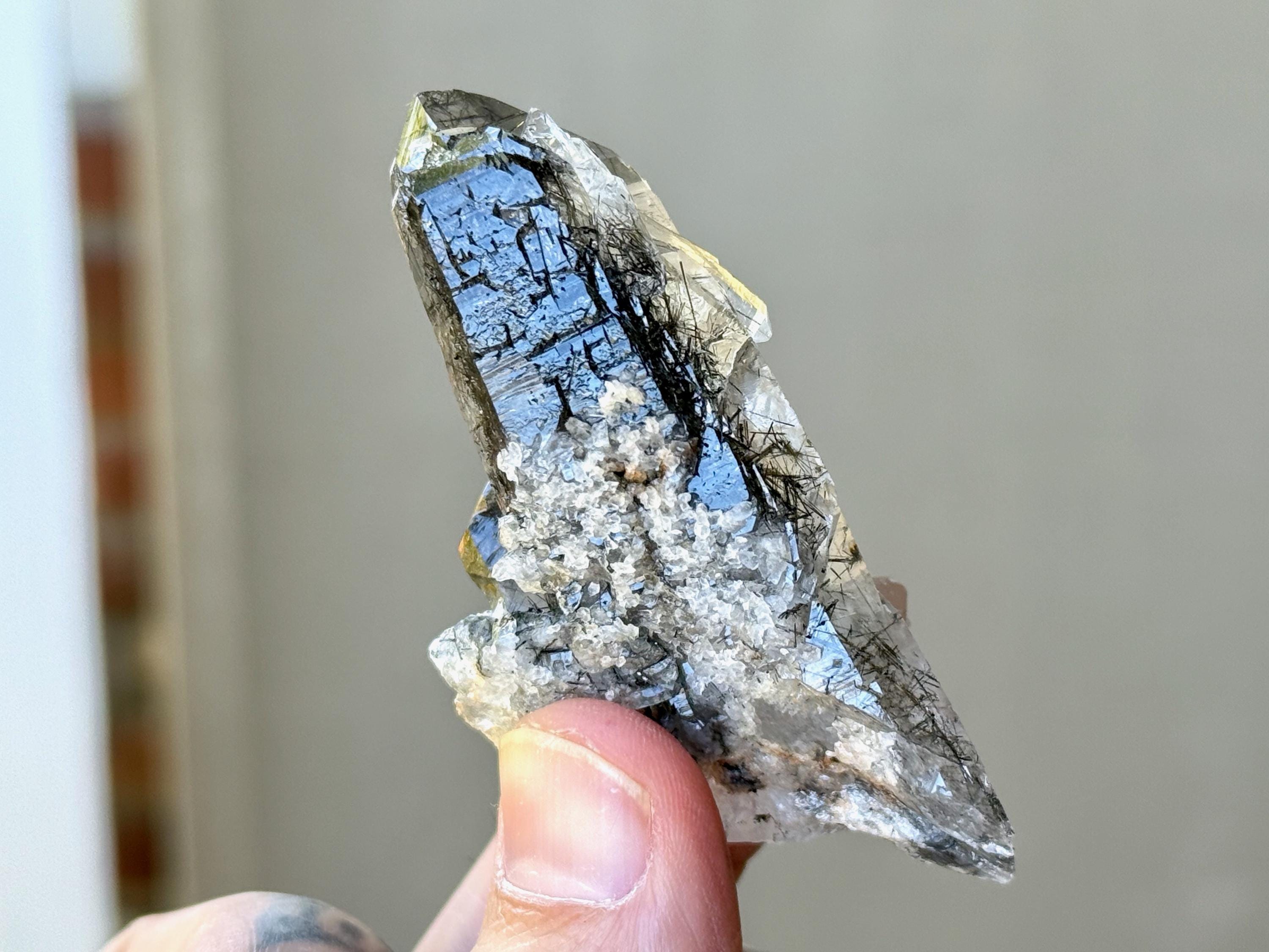Water-clear clarity and brilliant, vitreous luster to this Quartz crystal with a rich inclusion of Black Tourmaline needles throughout. What is quite special about this piece is the presence of pitted "Starbrary" markings on its right side, the only crystal from this collection so far to display these (Photo 4).