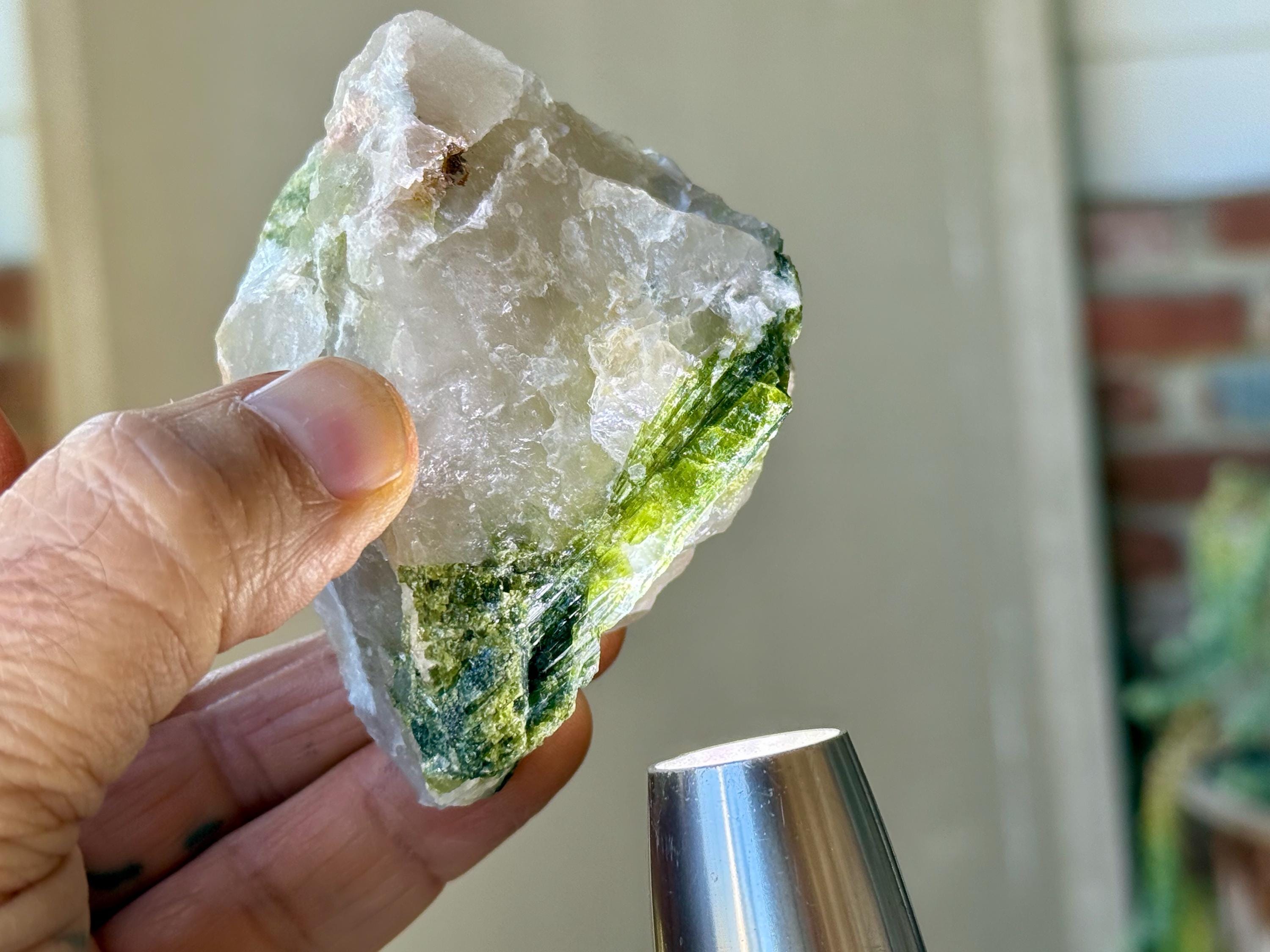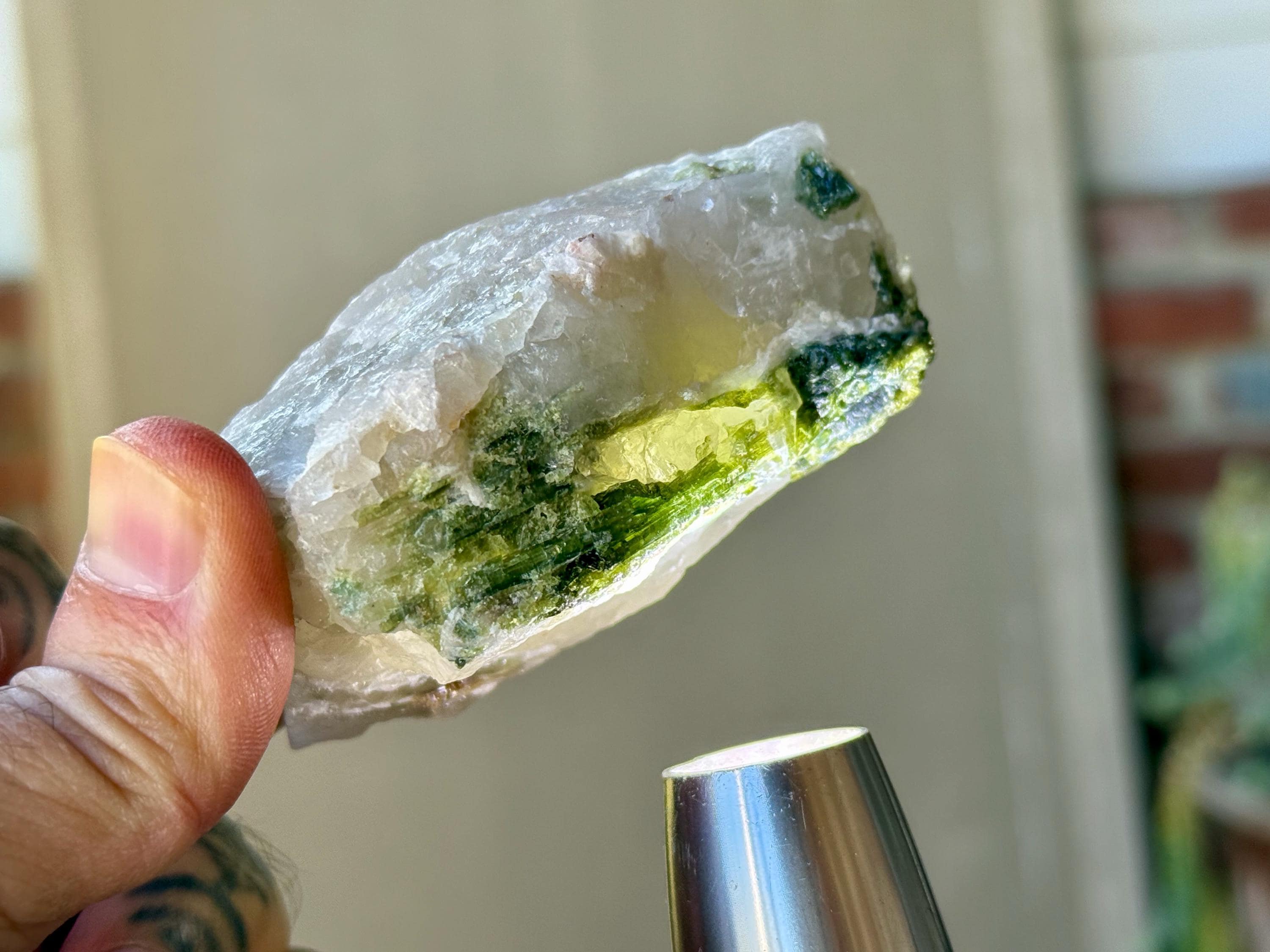 Vibrant green hues to this exquisite Green Tourmaline crystal embedded in a slab of dense Quartz from Aricanga. This Tourmaline really comes to life when backlit, as we've done here, with brilliant translucency and vivid color. A really nice piece from this beloved locale.