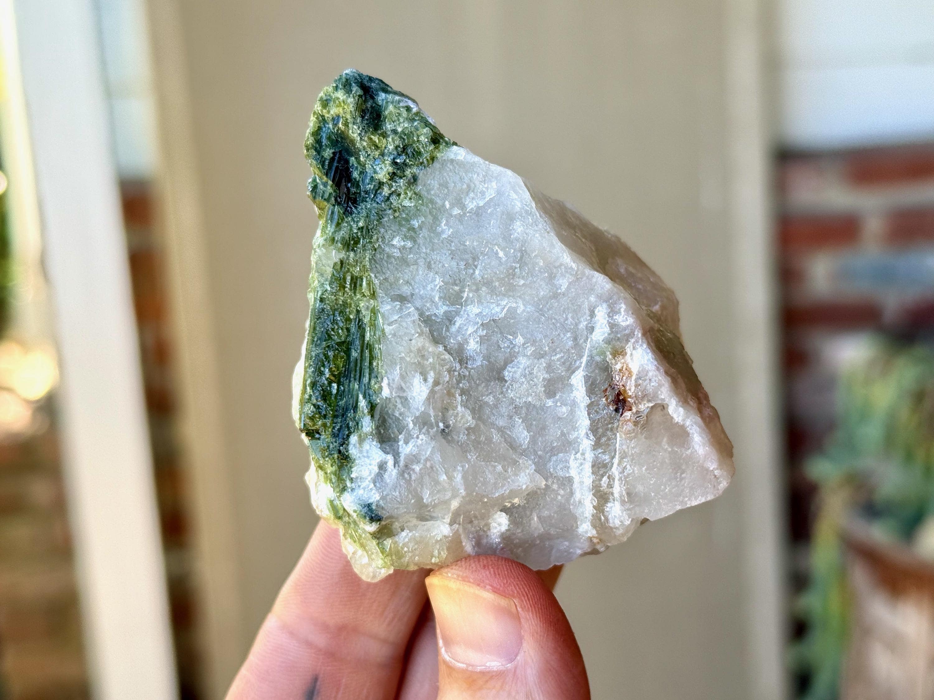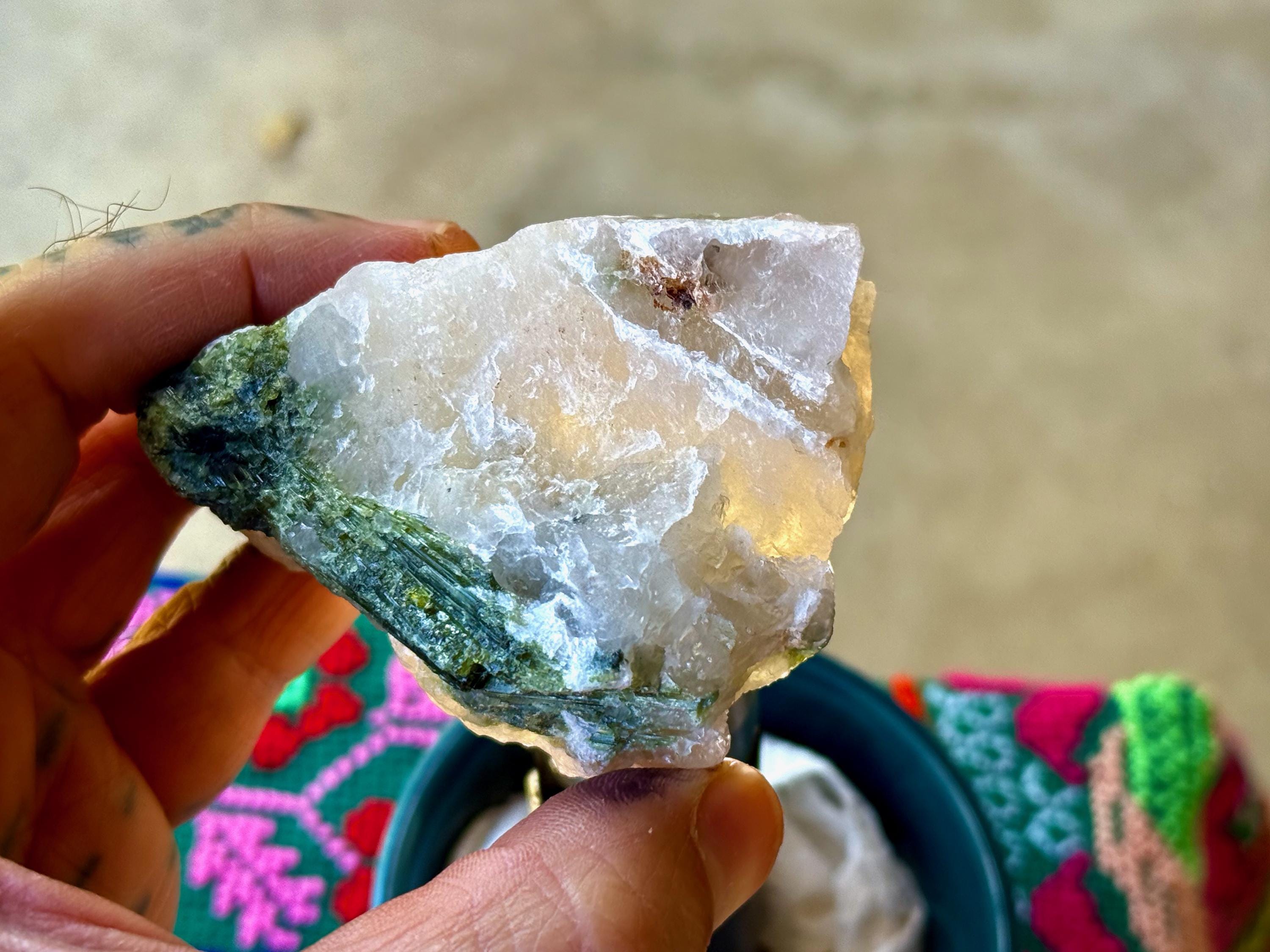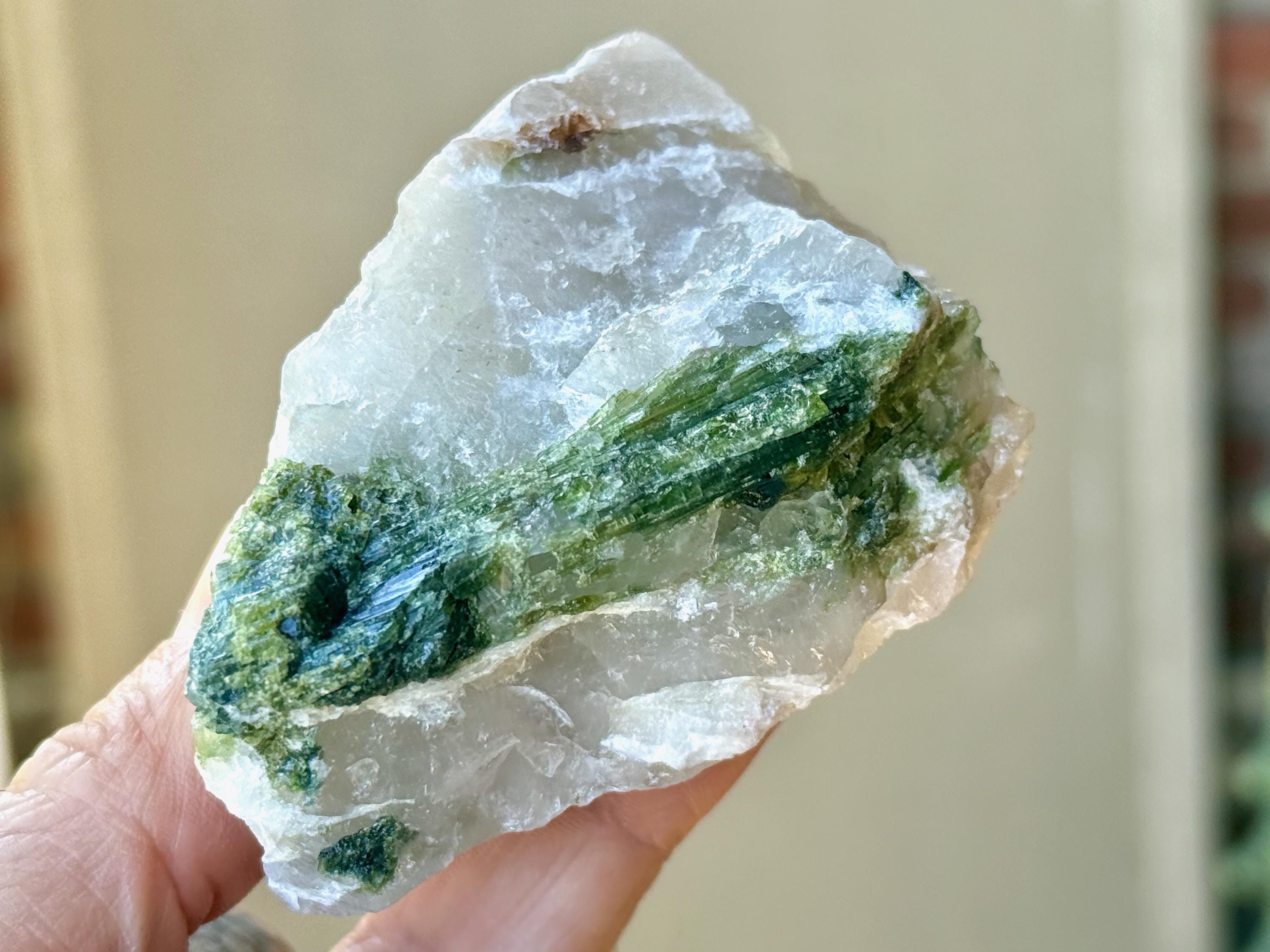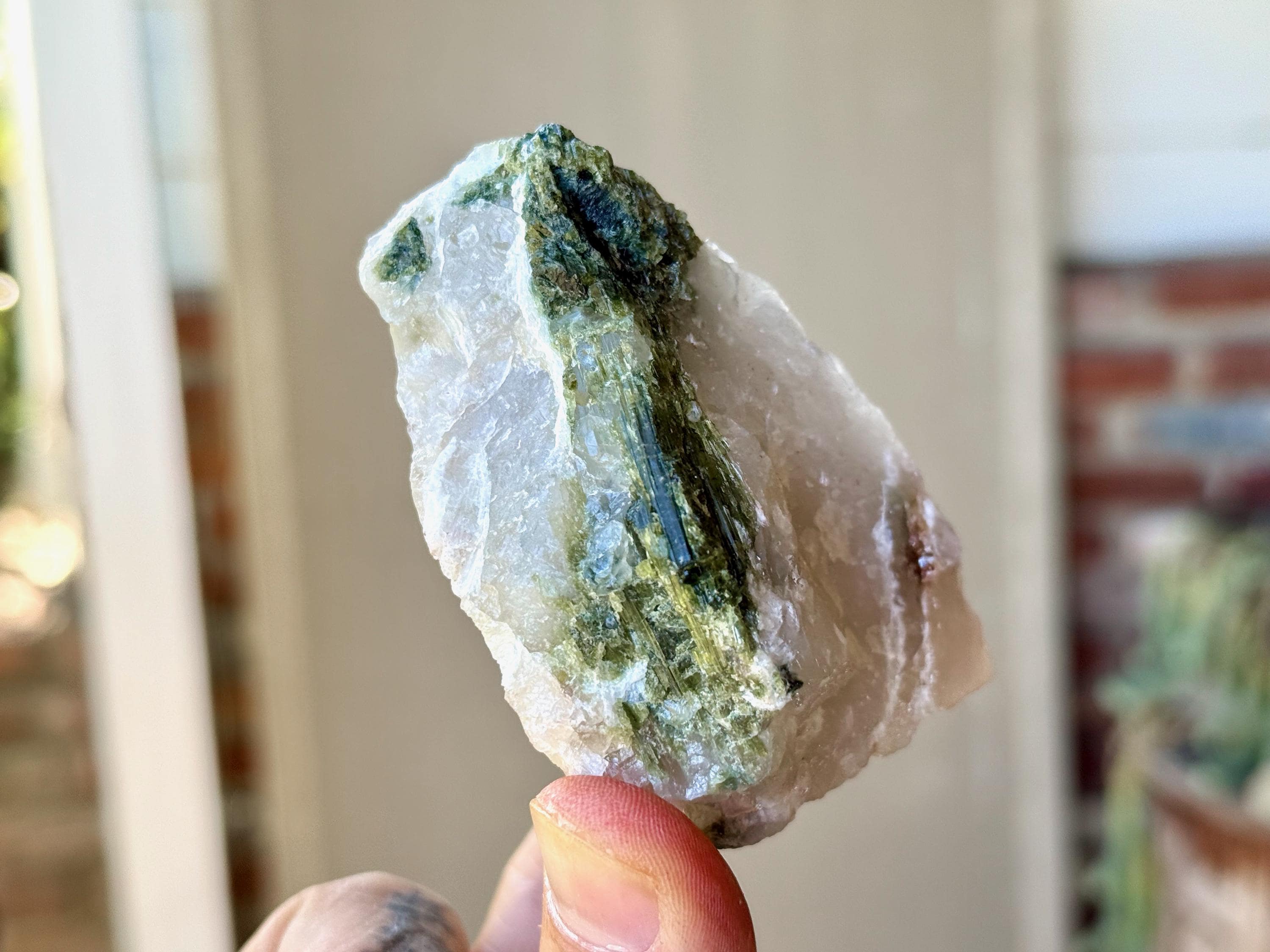 Green Tourmaline purifies and strengthens, allowing one to energetically carry greater amounts of Life Force (Prana Energy). As more energy is carried within the physical body, higher degrees of consciousness can be maintained. It is a wonderful protection stone, deal for sealing holes in the aura that leave one vulnerable to negativity.