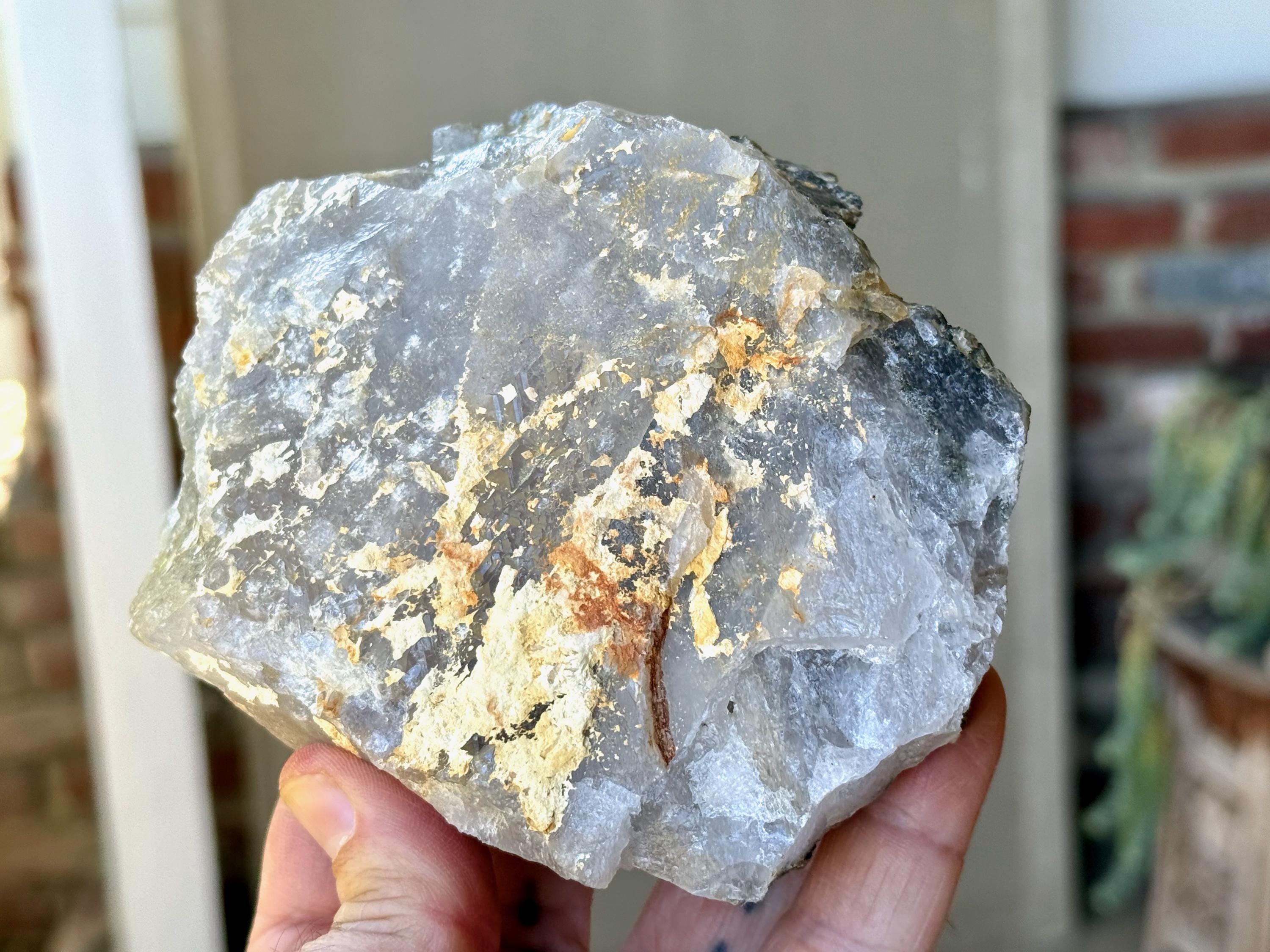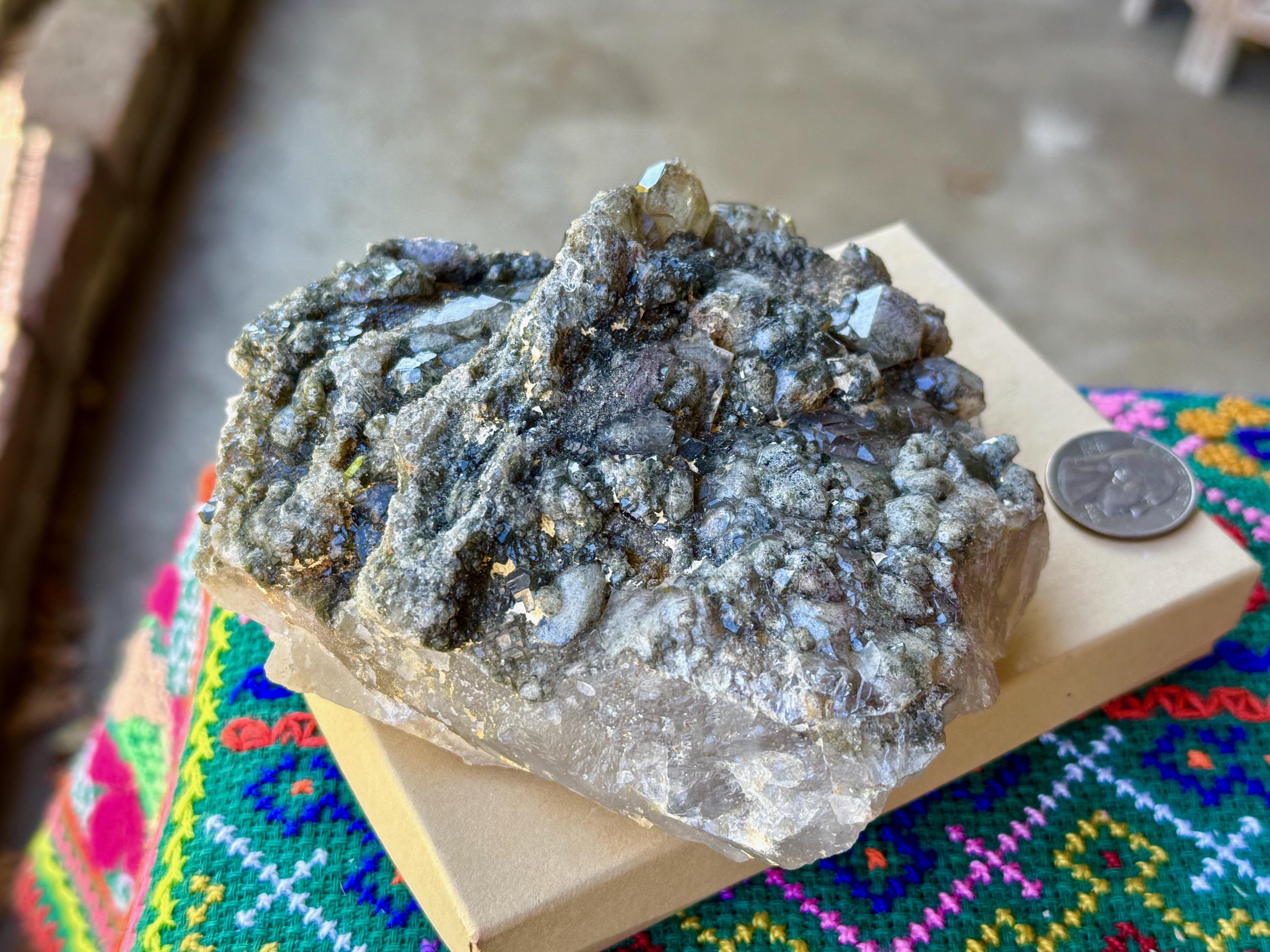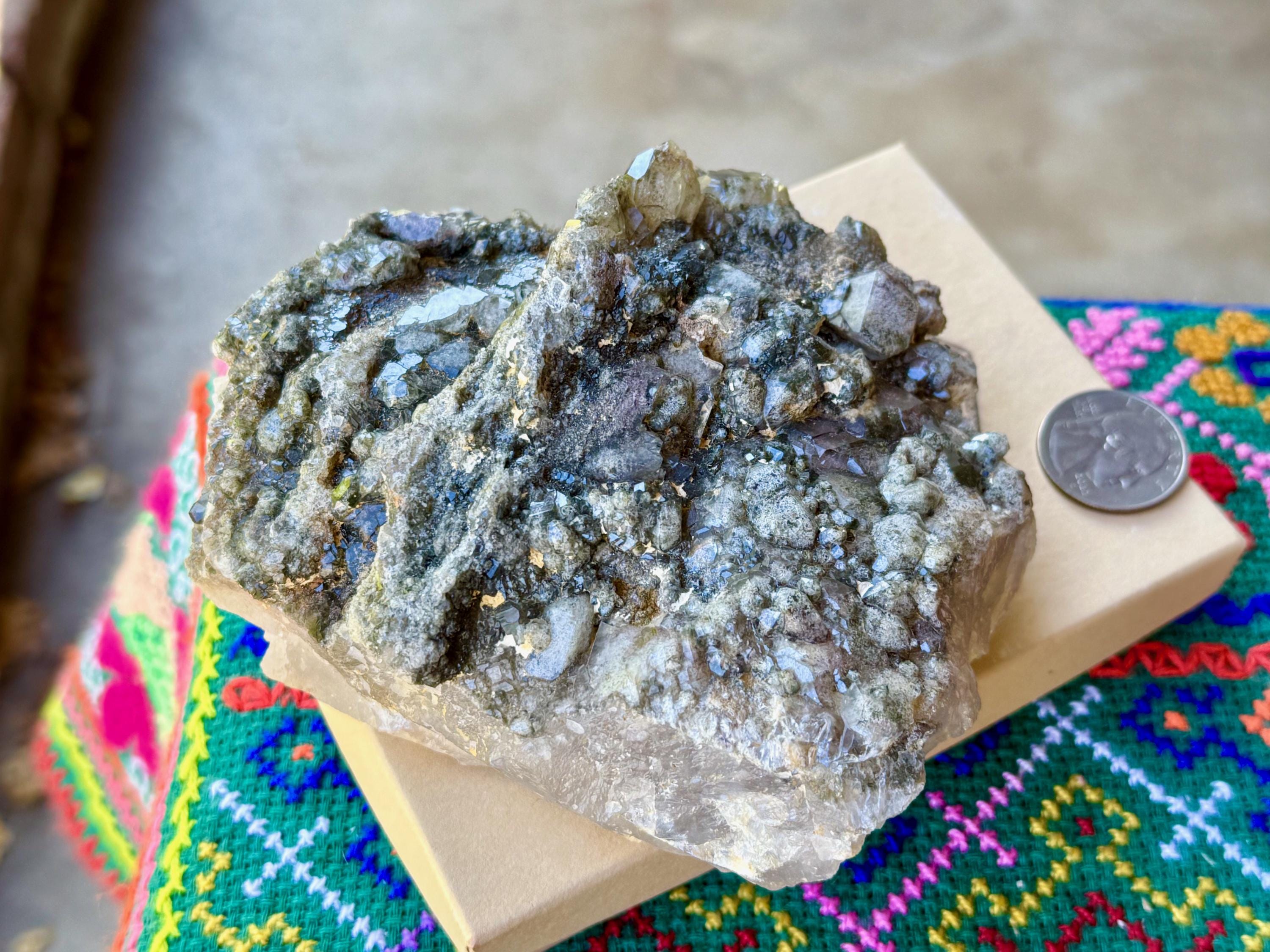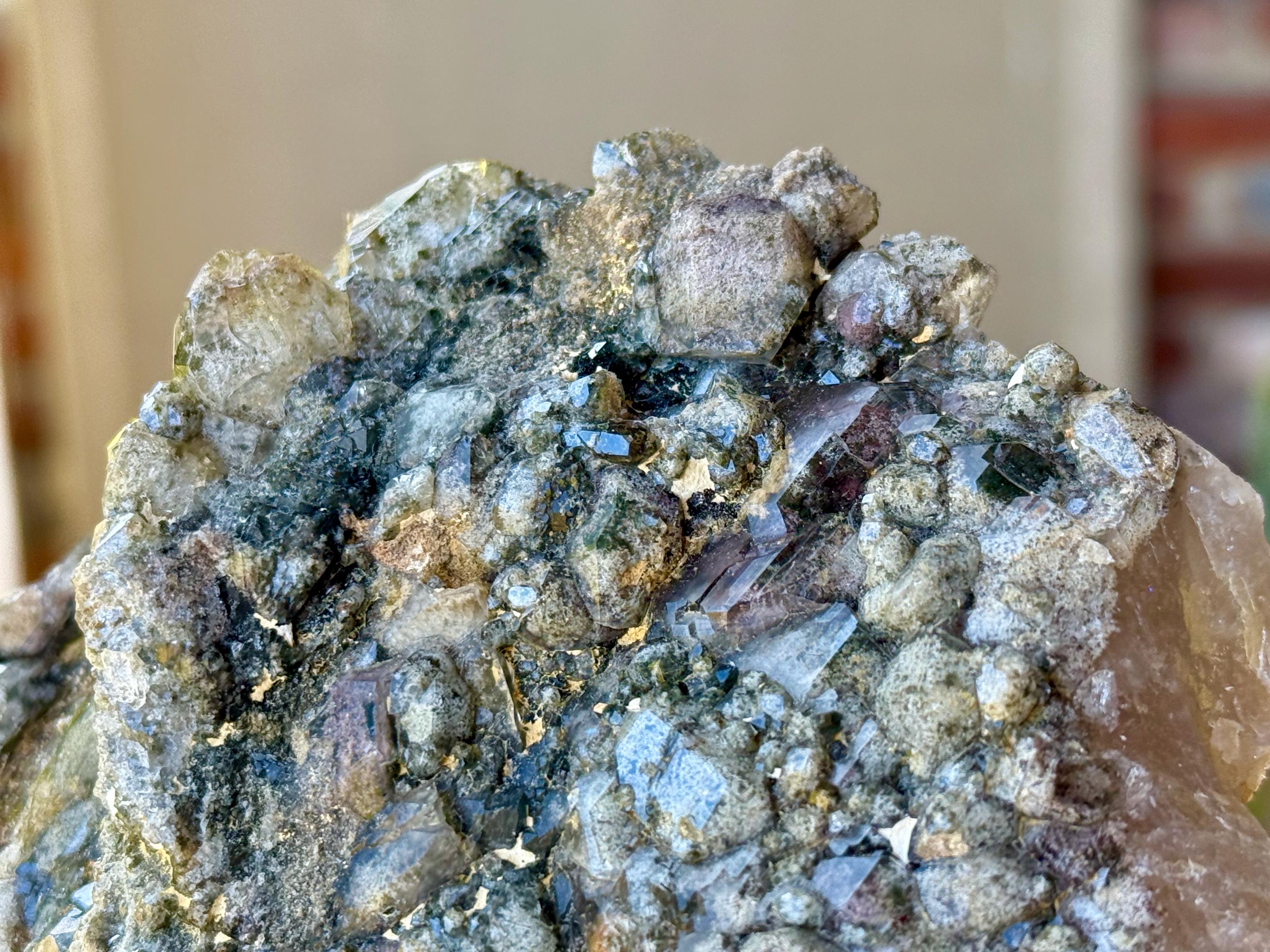 This is a large crystal, weighing close to 2 pounds (812g) with a very unique "alligator" skin texture throughout. It is a bit of a cluster formation with many individual crystals, each with rich inclusions of dark Green Chlorite and white Kaolinite, creating beautiful contrasts of color. When backlit, as in Photos 3-4, we can see that it actually does pass light very well on its right side.