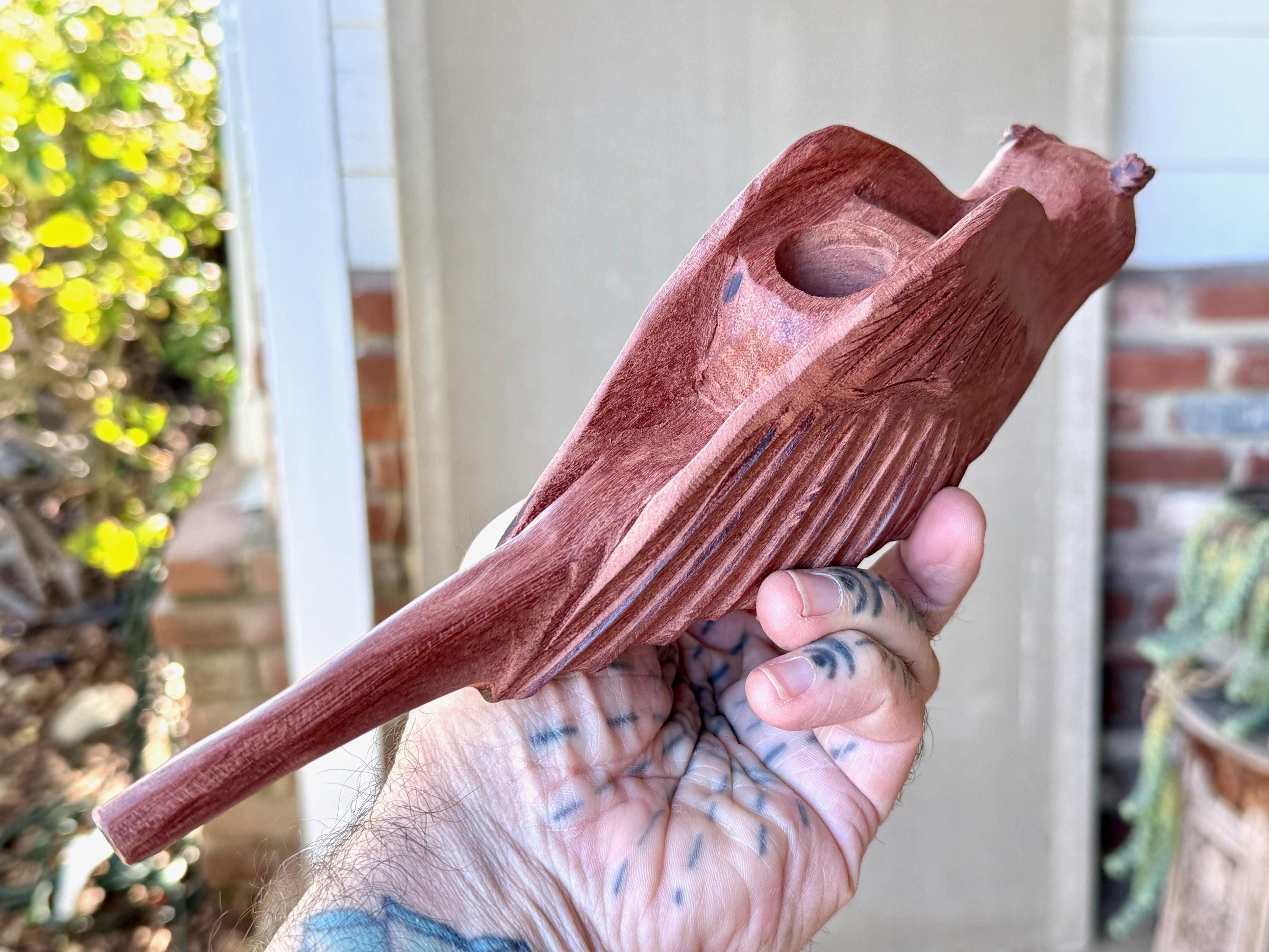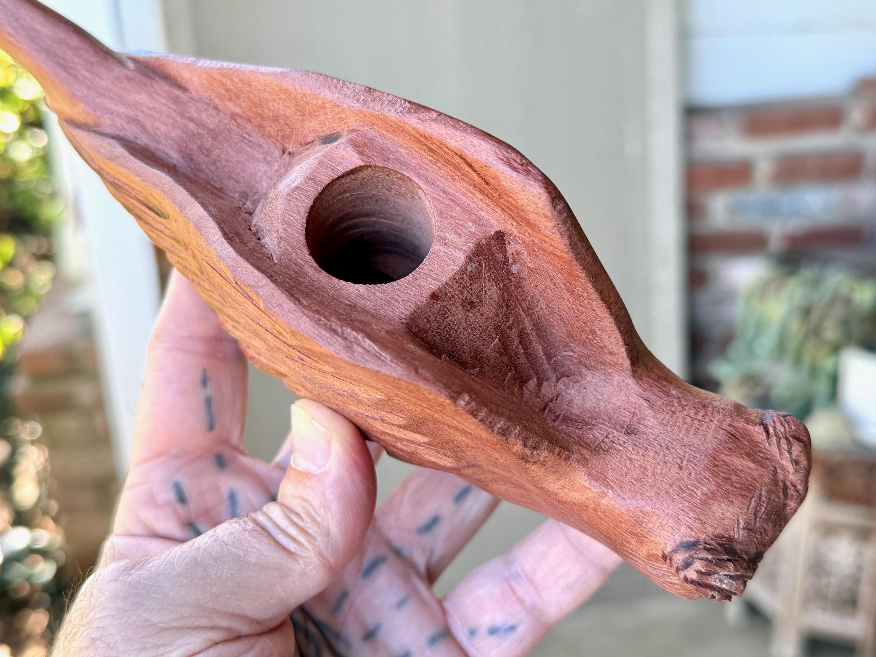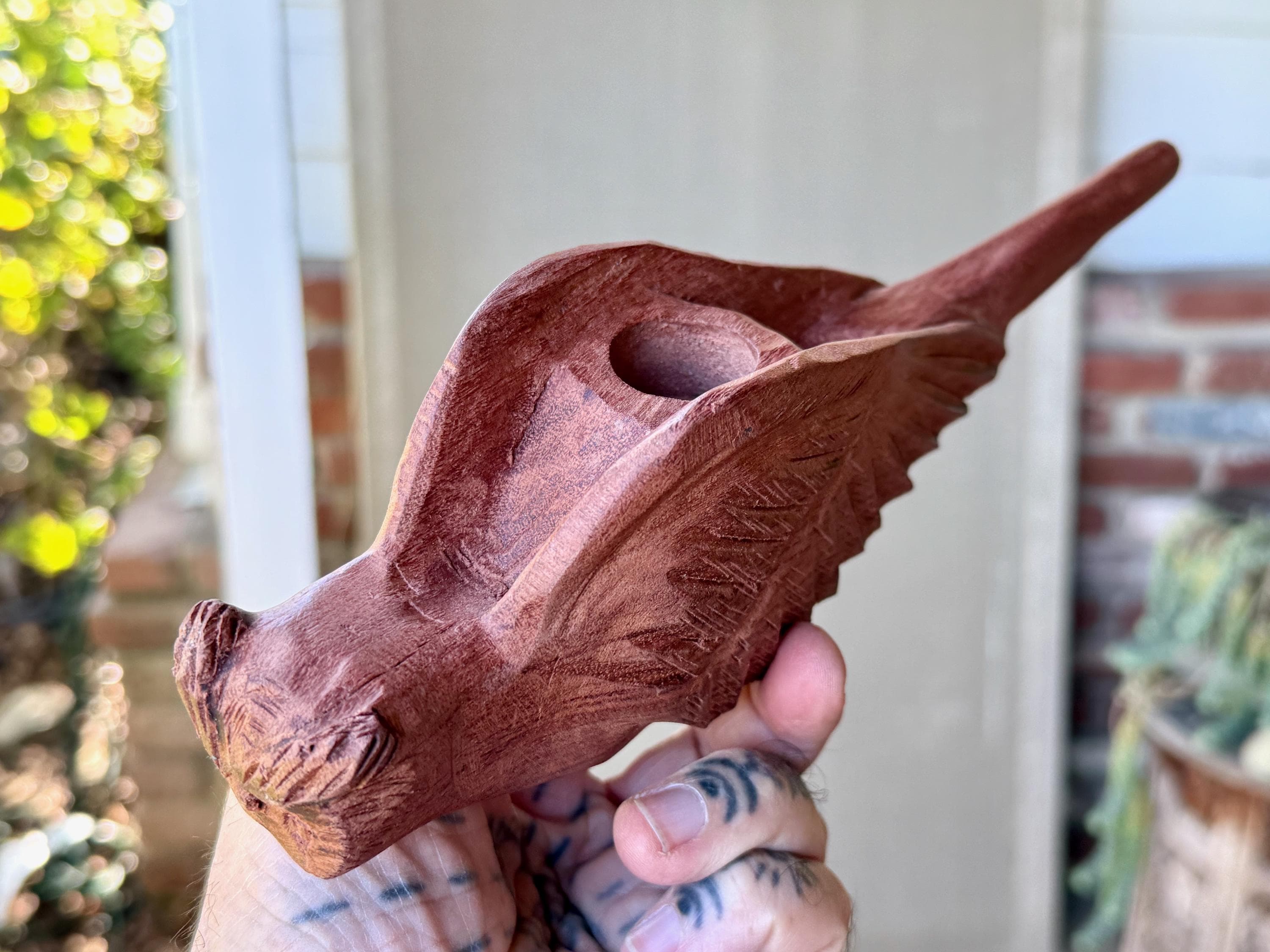 A magnificent, and elegant, depiction of an Owl in flight! Here the artist uses Palo Sangre ("Blood Wood") for his creation, a very strong hardwood with a rich reddish-brown hue, indigenous to the Amazon and areas of Central and South America. This pipe is carved from a single piece of this wood, and is incredibly weighty and well-crafted. A powerful and beautiful medicine tool for ceremony.