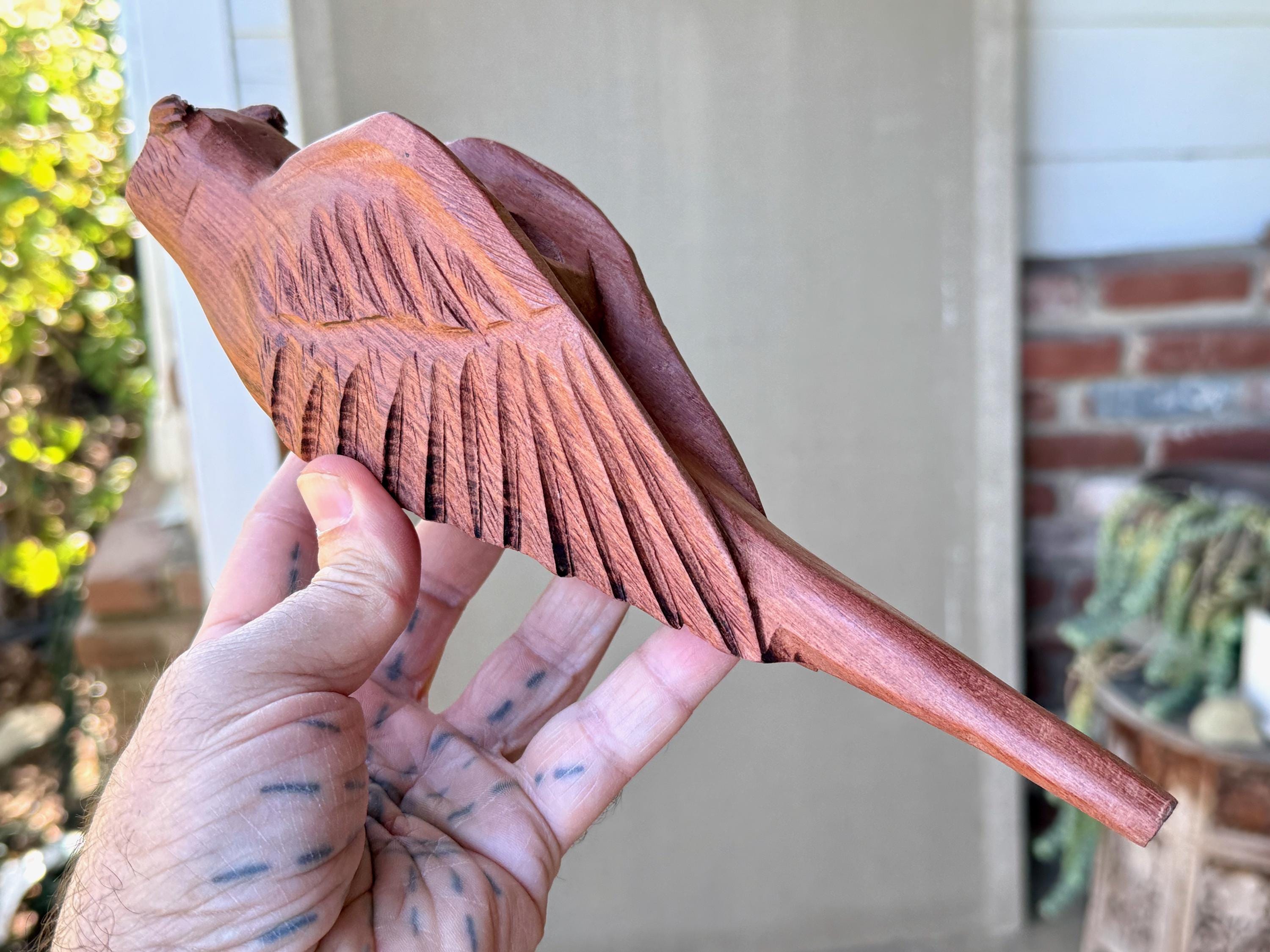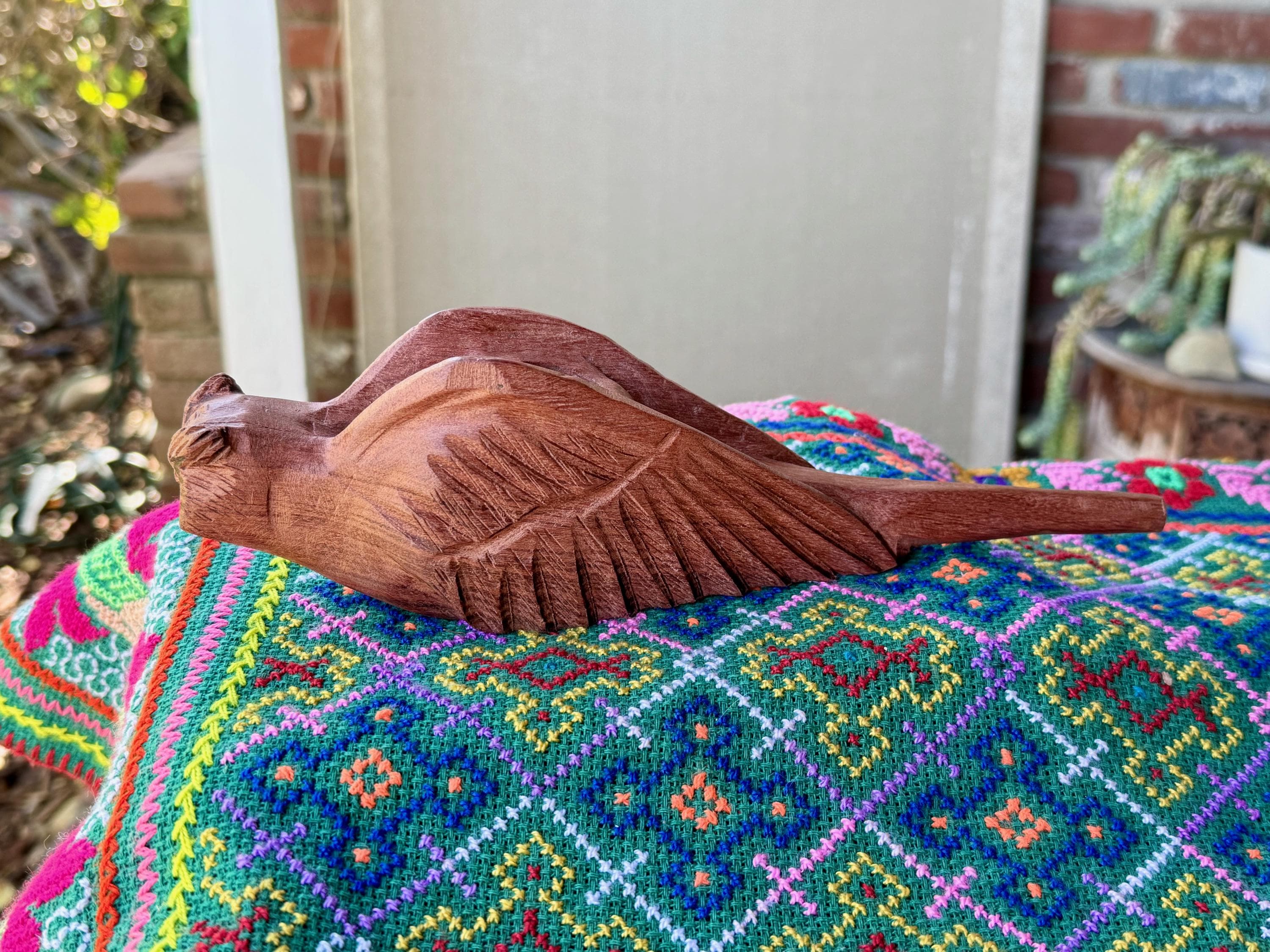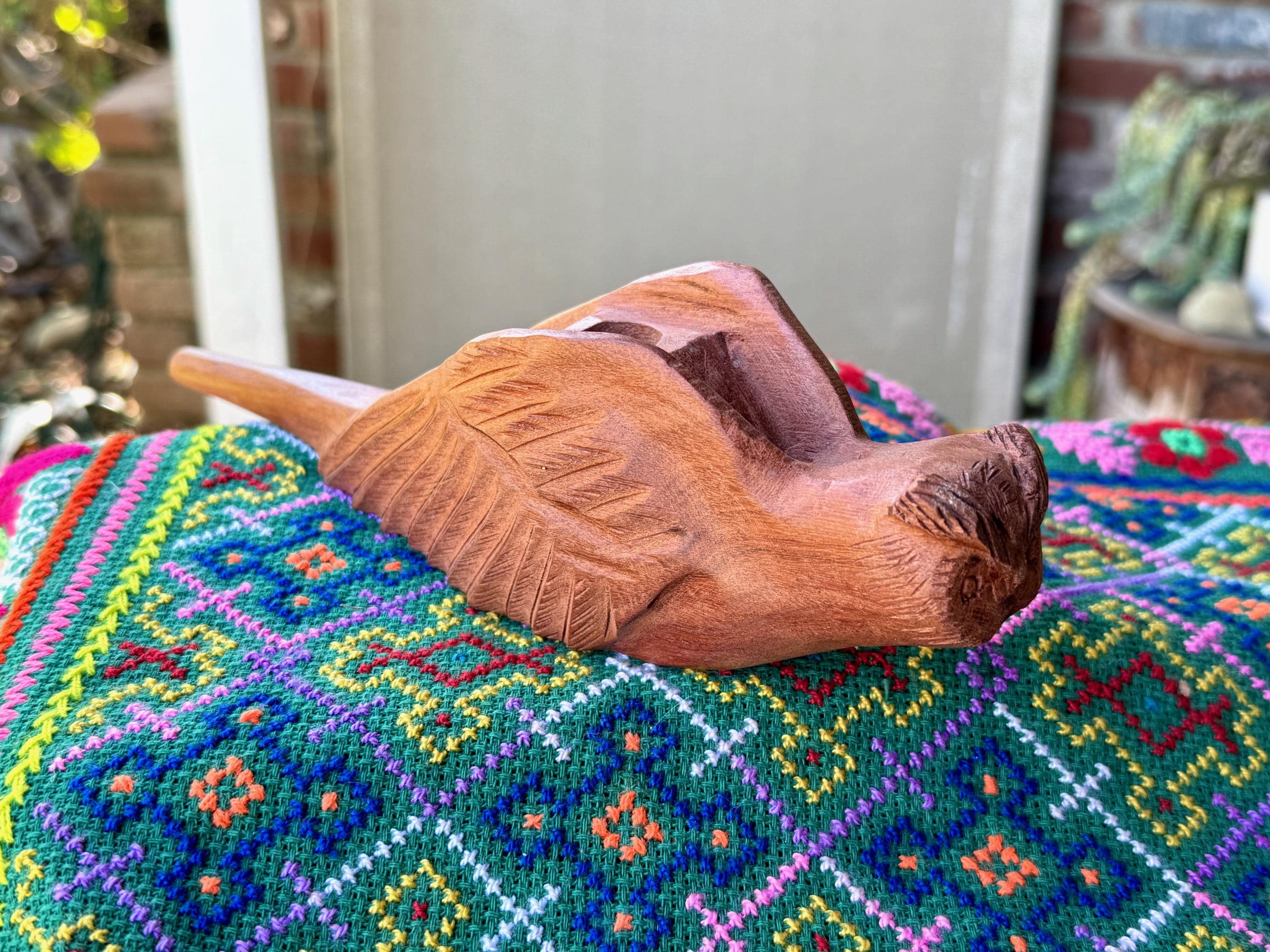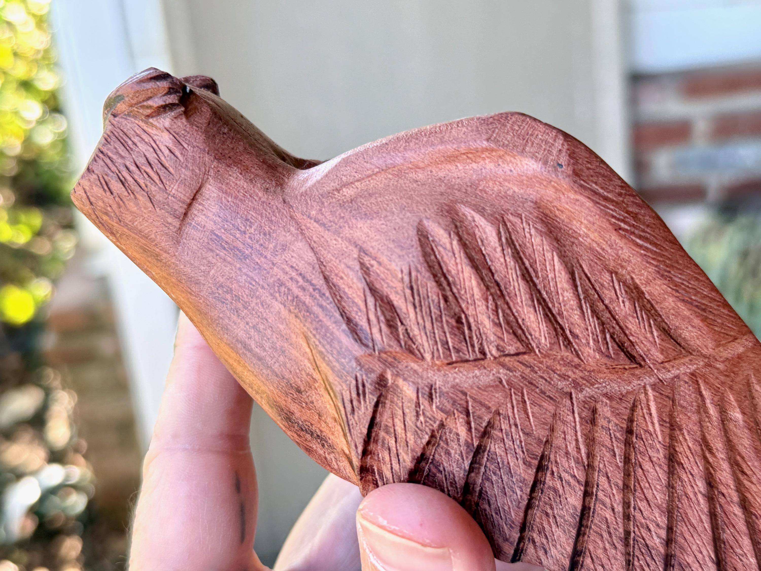 A magnificent, and elegant, depiction of an Owl in flight! Here the artist uses Palo Sangre ("Blood Wood") for his creation, a very strong hardwood with a rich reddish-brown hue, indigenous to the Amazon and areas of Central and South America. This pipe is carved from a single piece of this wood, and is incredibly weighty and well-crafted. A powerful and beautiful medicine tool for ceremony.