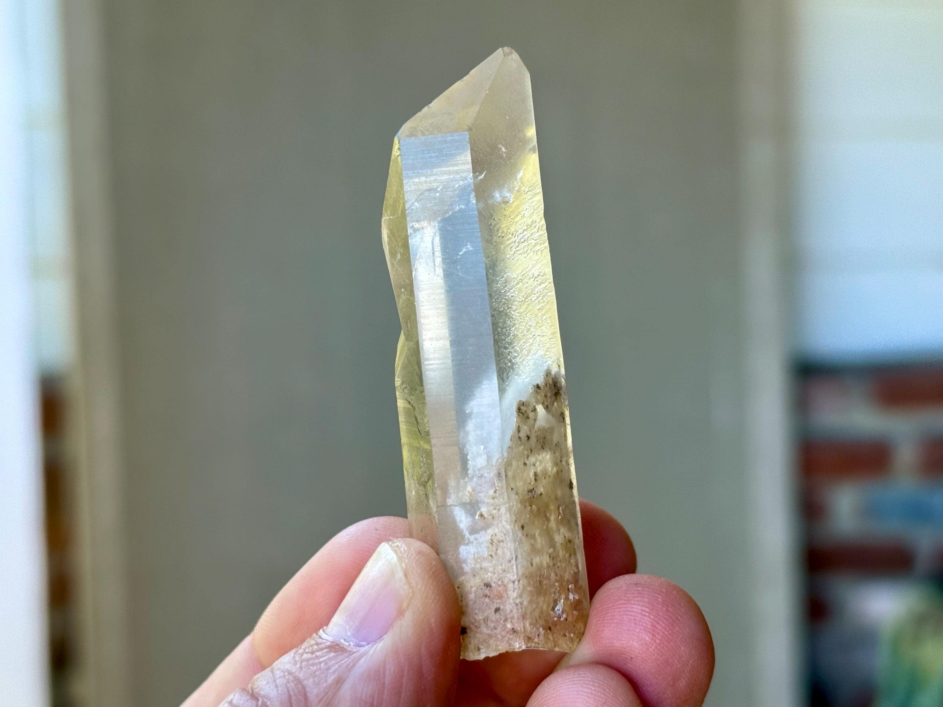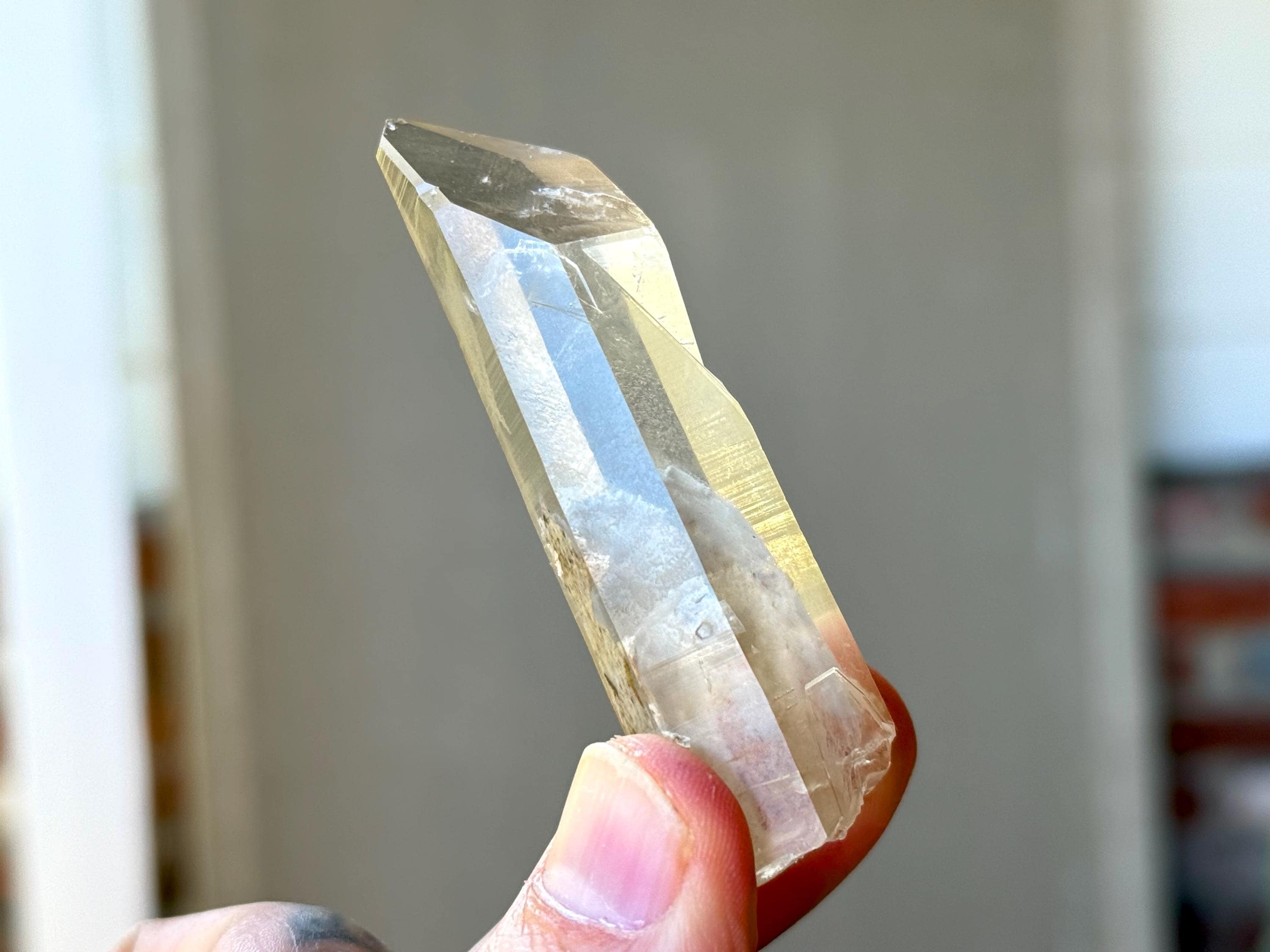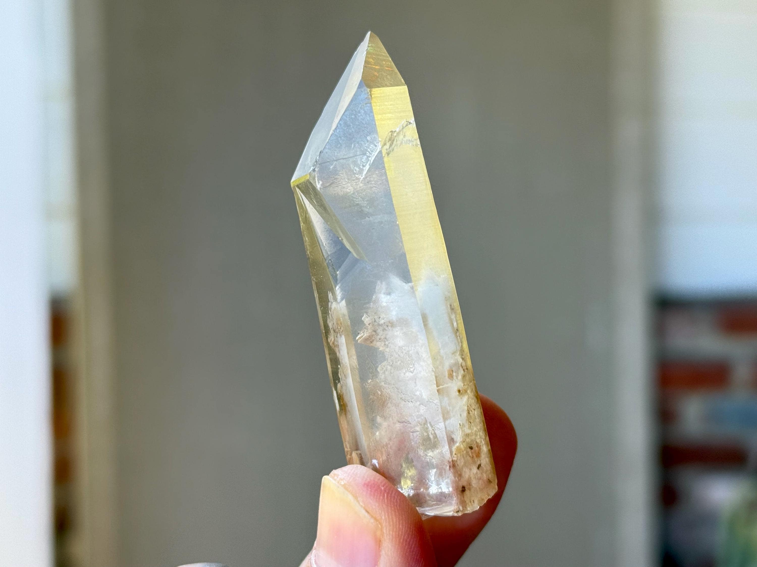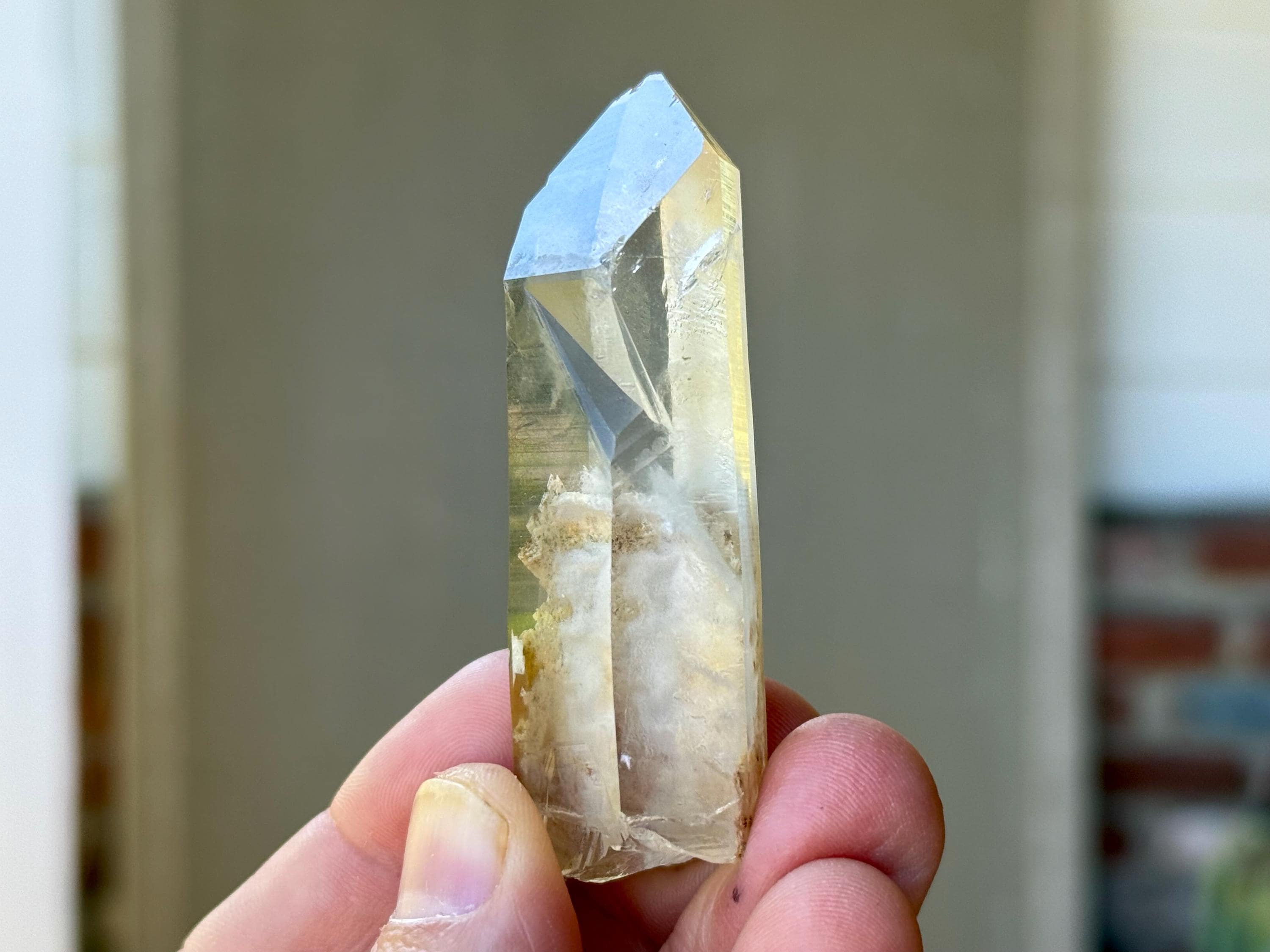 Gorgeous, water-clear clarity and a mild golden hue to this spectacular Golden Healer Quartz crystal with beautiful inclusions of white Kaolinite in the center at the base. We love the small "key" imprint just below the main facet. Excellent termination as well.