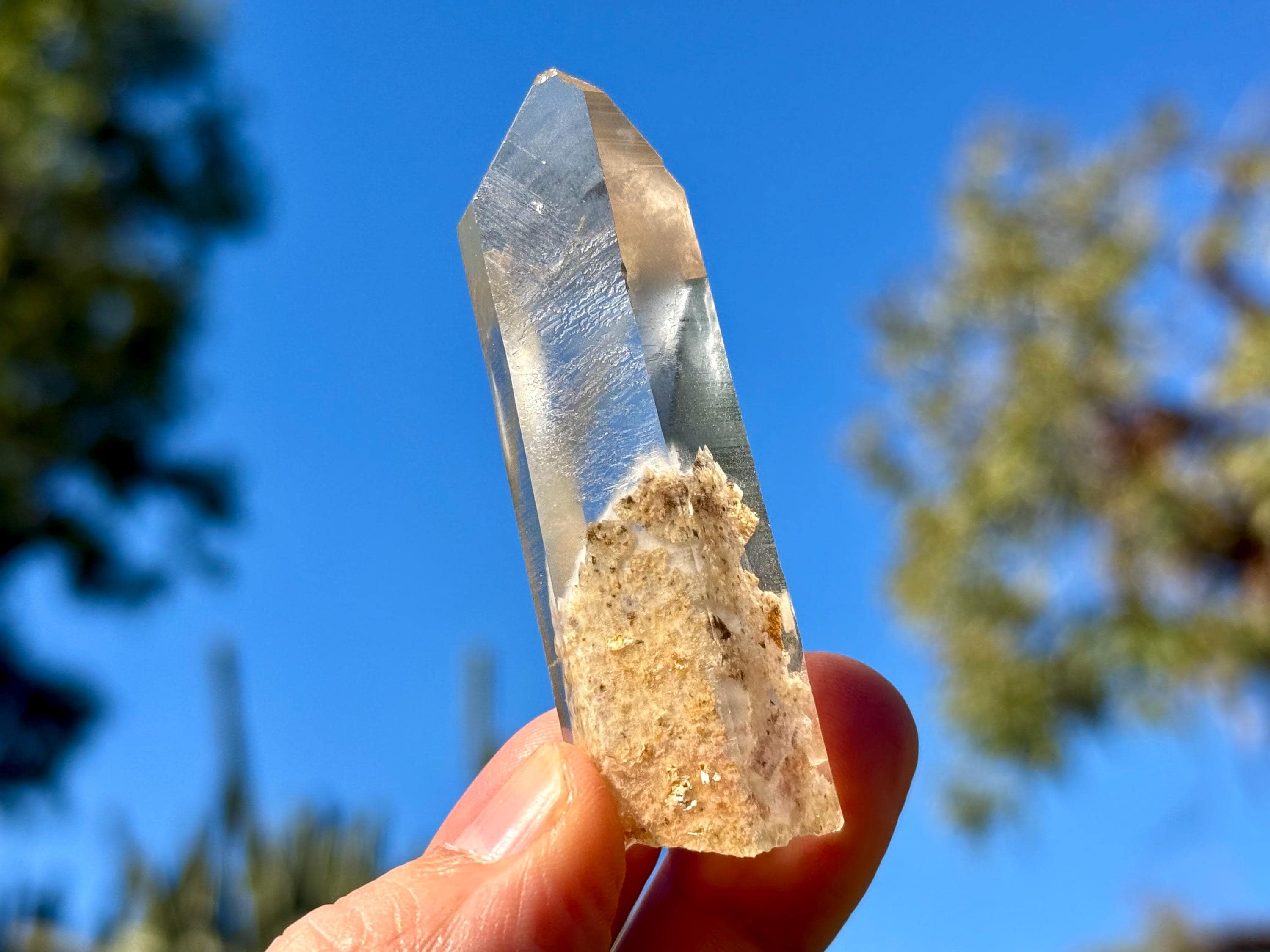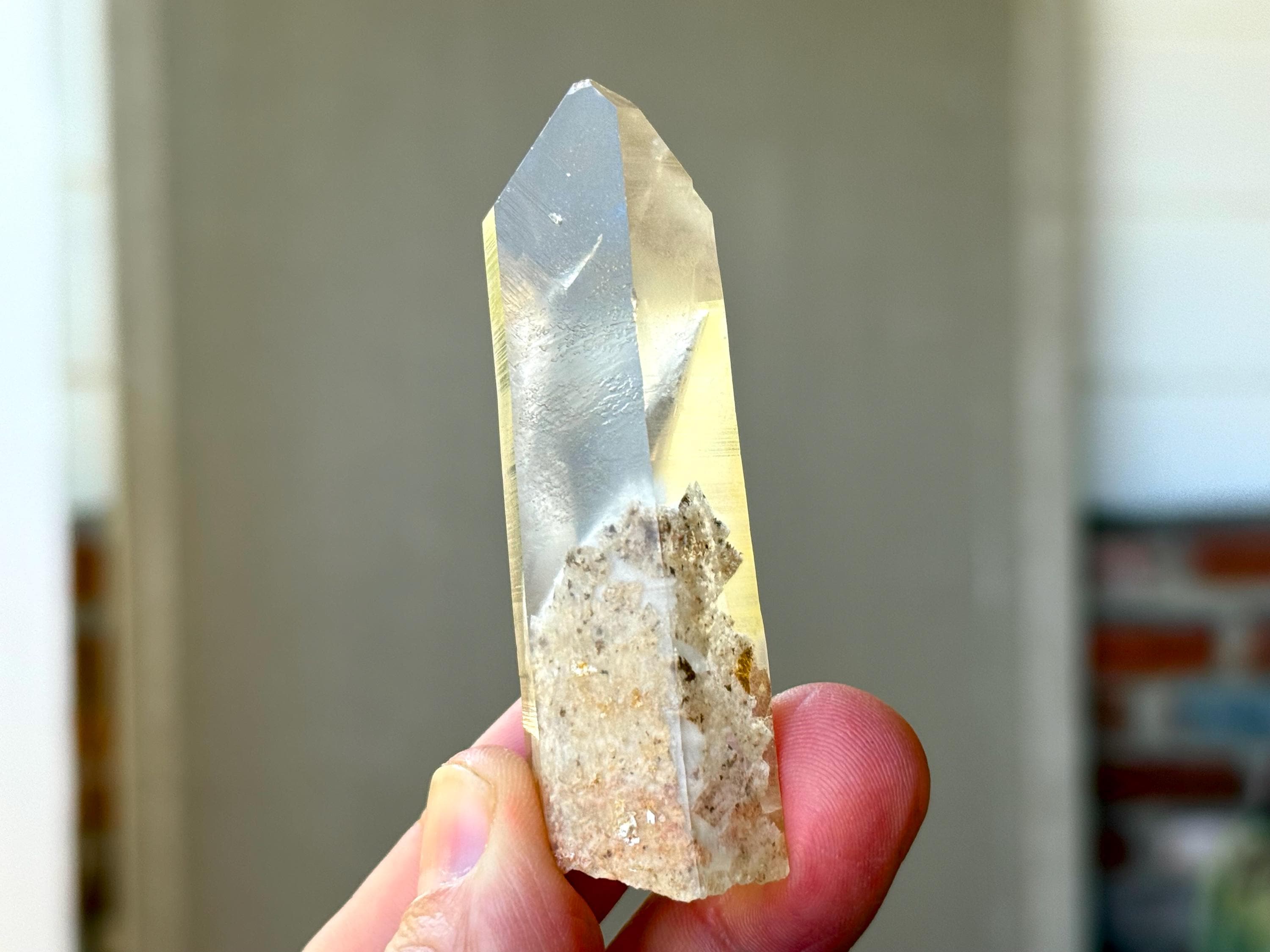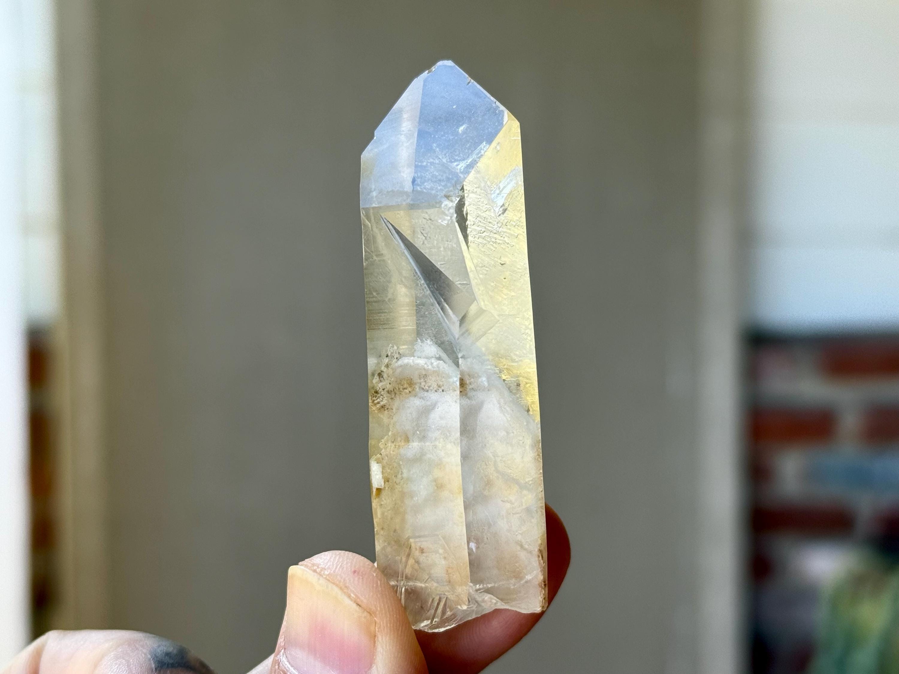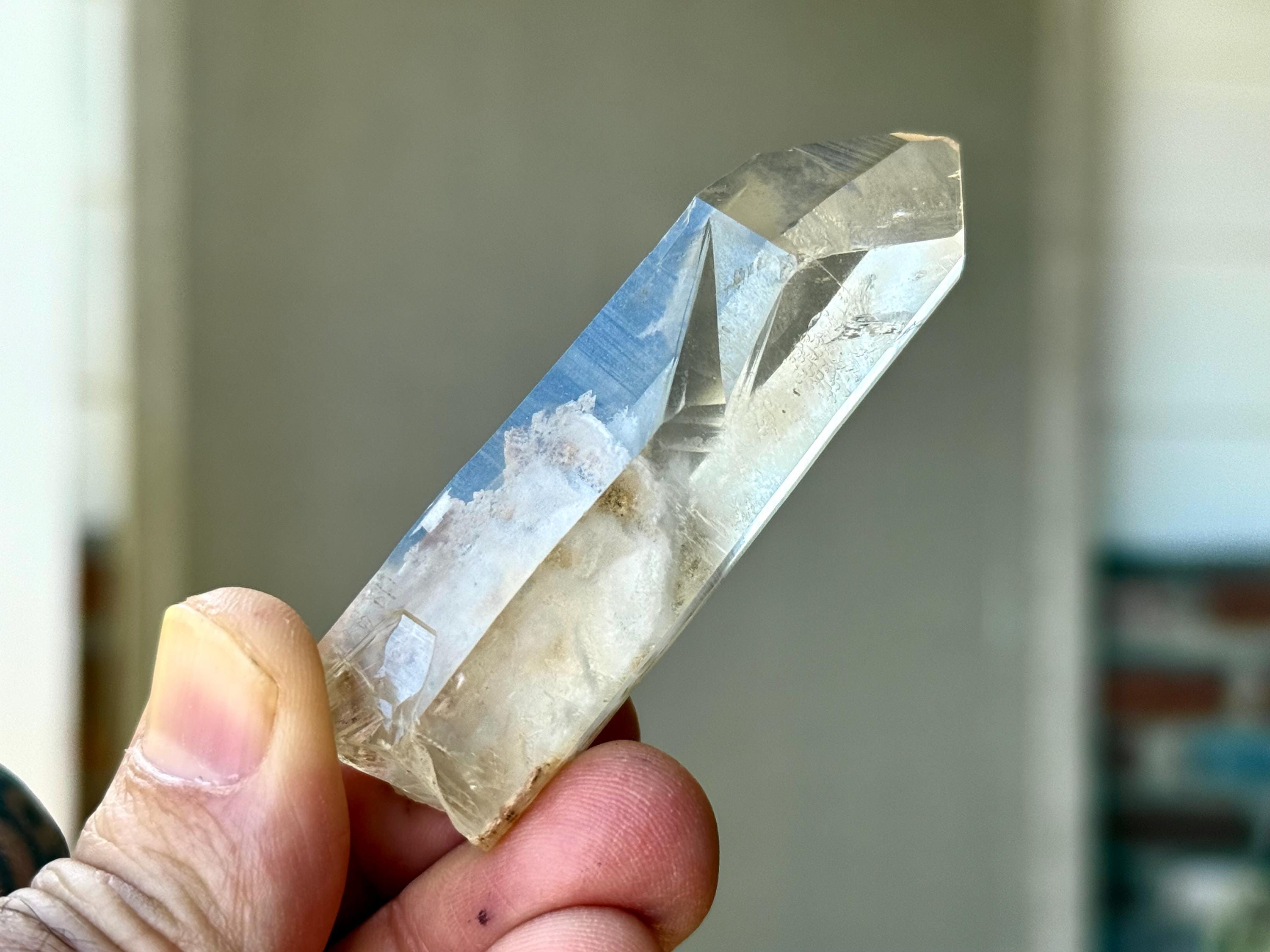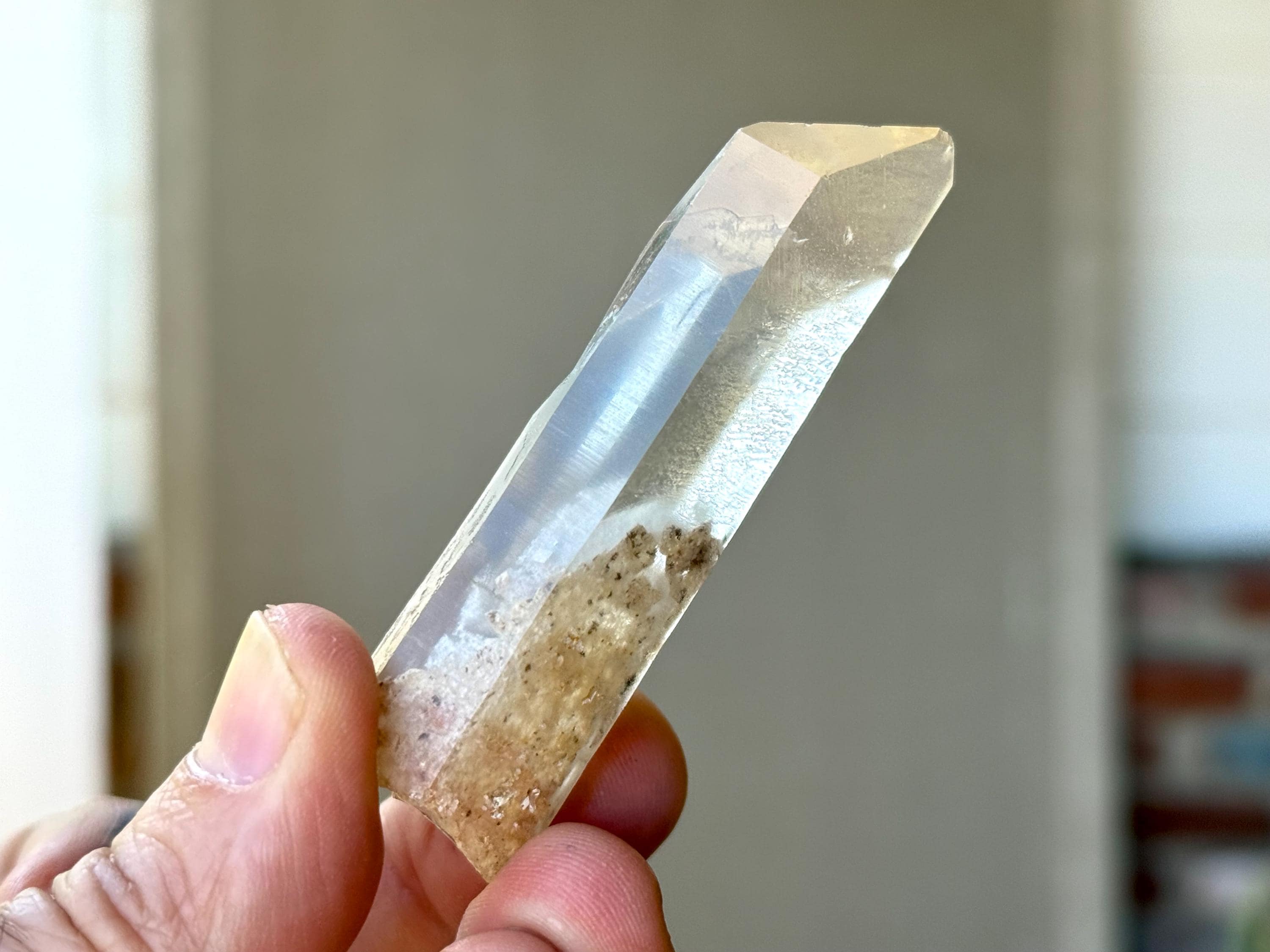 Gorgeous, water-clear clarity and a mild golden hue to this spectacular Golden Healer Quartz crystal with beautiful inclusions of white Kaolinite in the center at the base. We love the small "key" imprint just below the main facet. Excellent termination as well.
