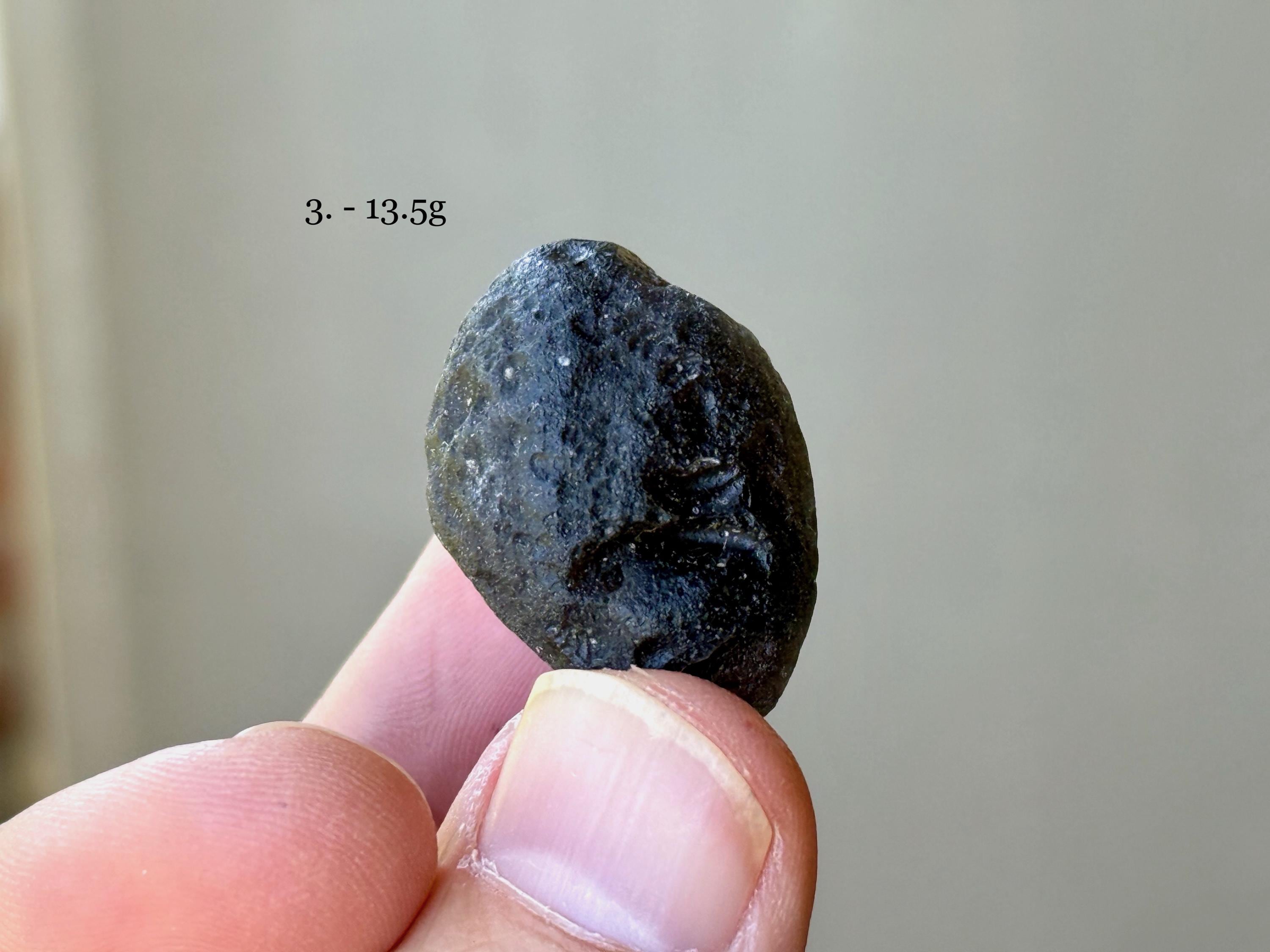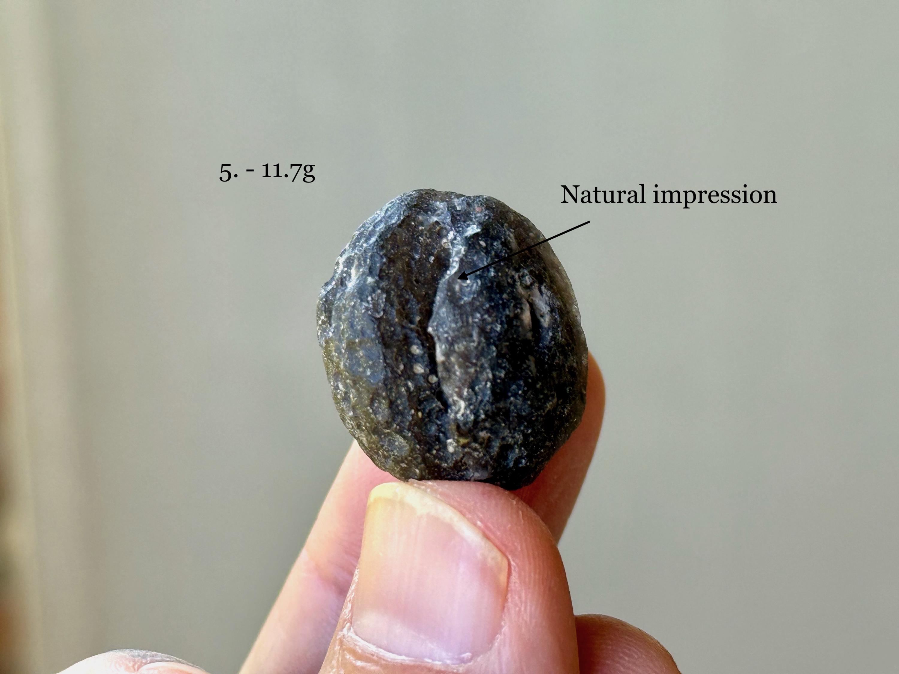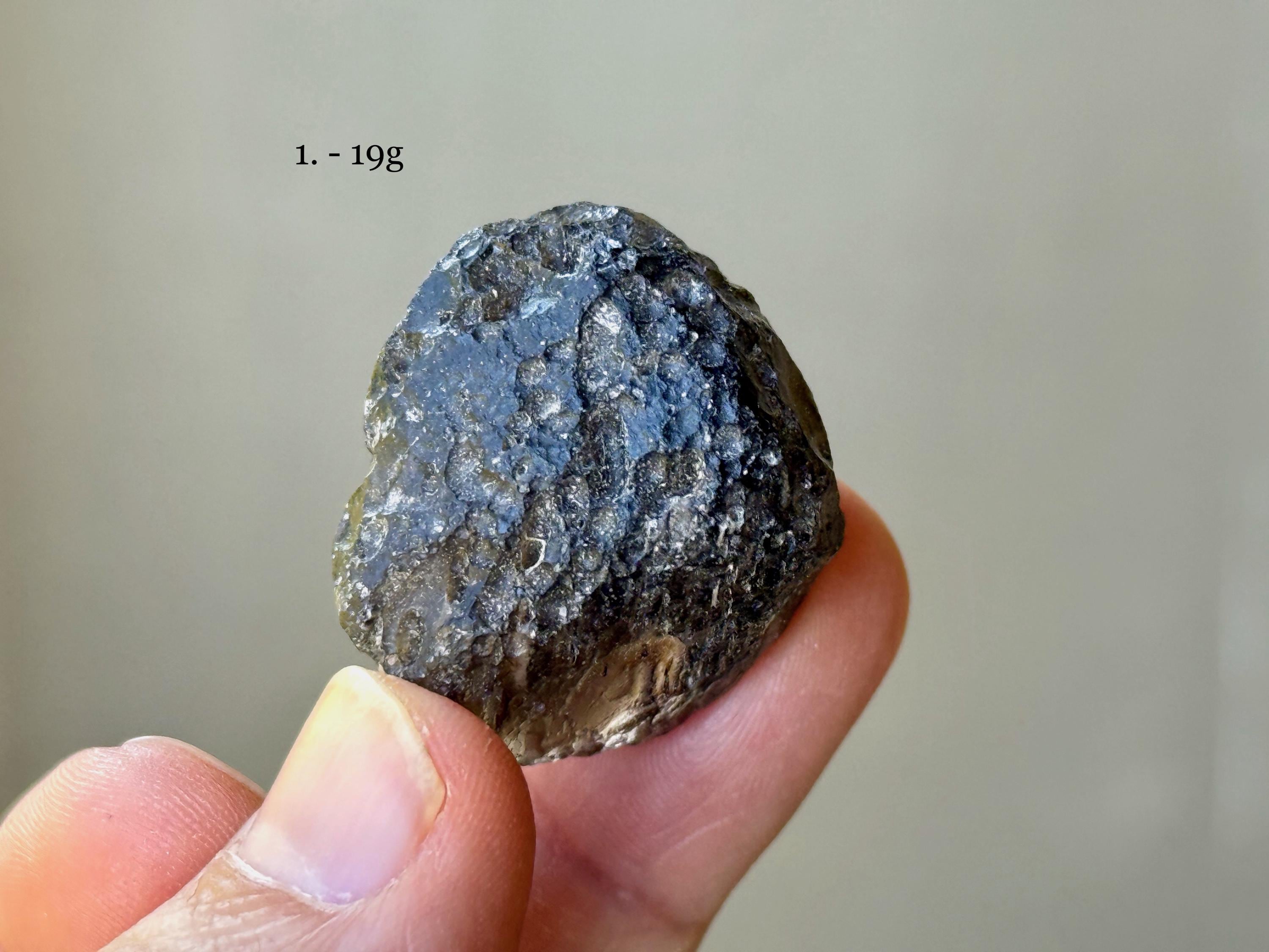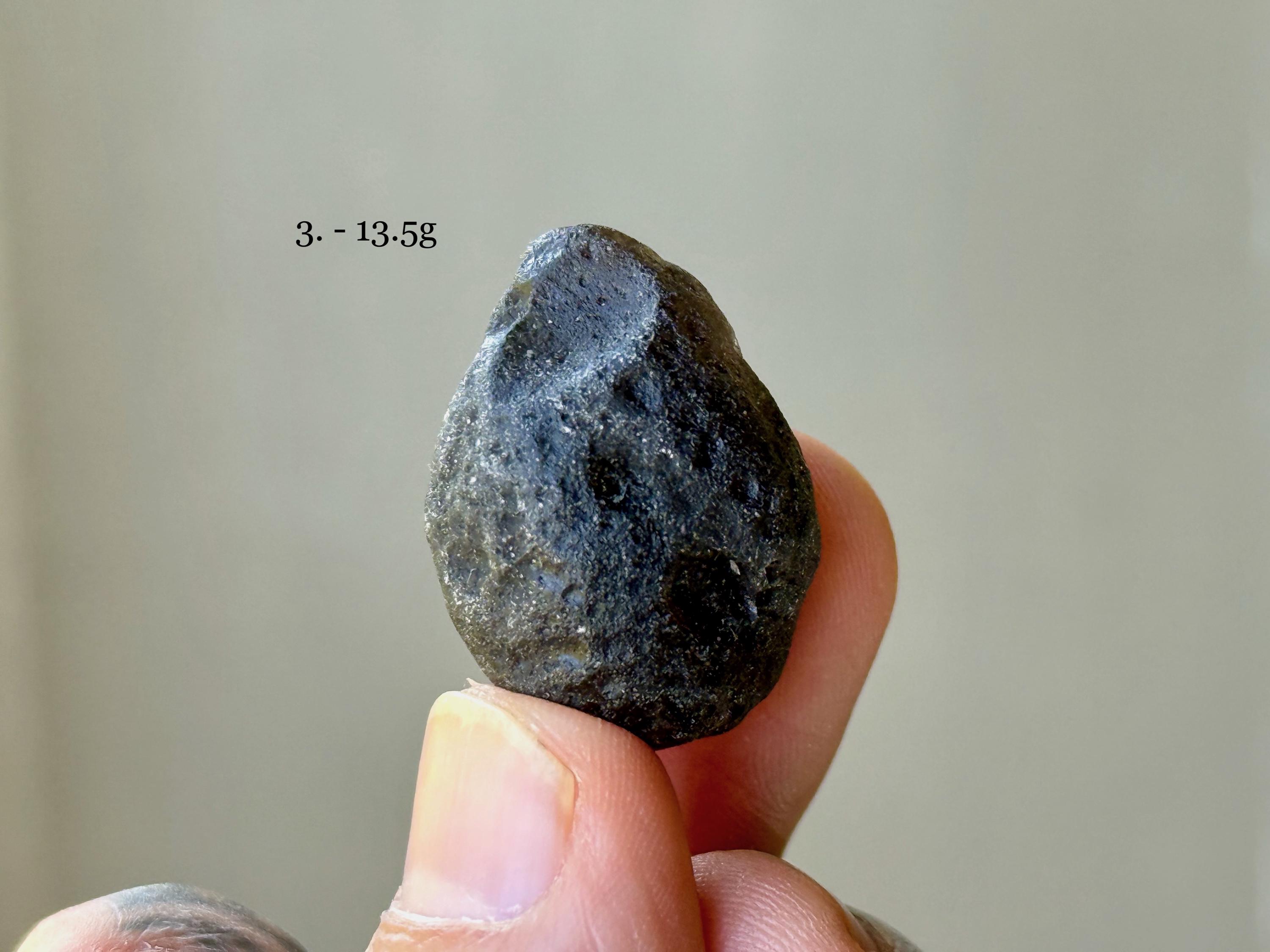 "B" Grade - These specimens may have a slightly duller complexion, with less luster and more more of a charcoal gray hue, as opposed to deep pitch black. They may still have rounded or ovular formations, or they may have irregular shapes and forms. There is still an element of translucency that is often quite high, or it may be slightly less. They may have larger smooth areas where there is no pitting.