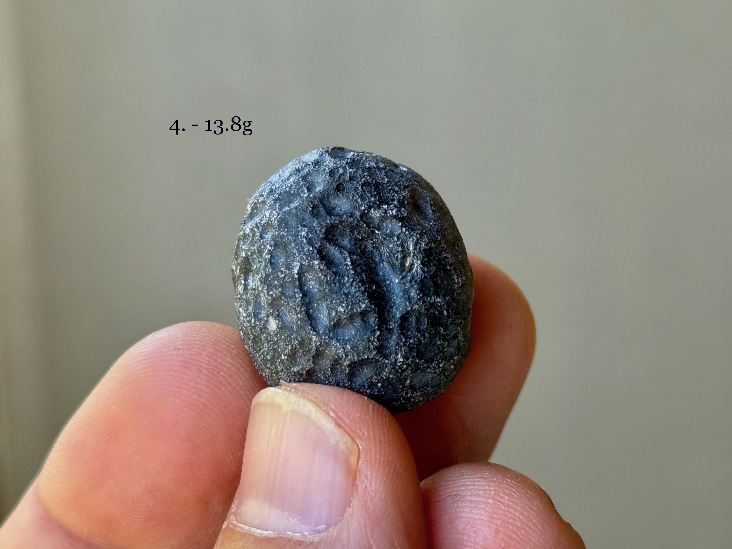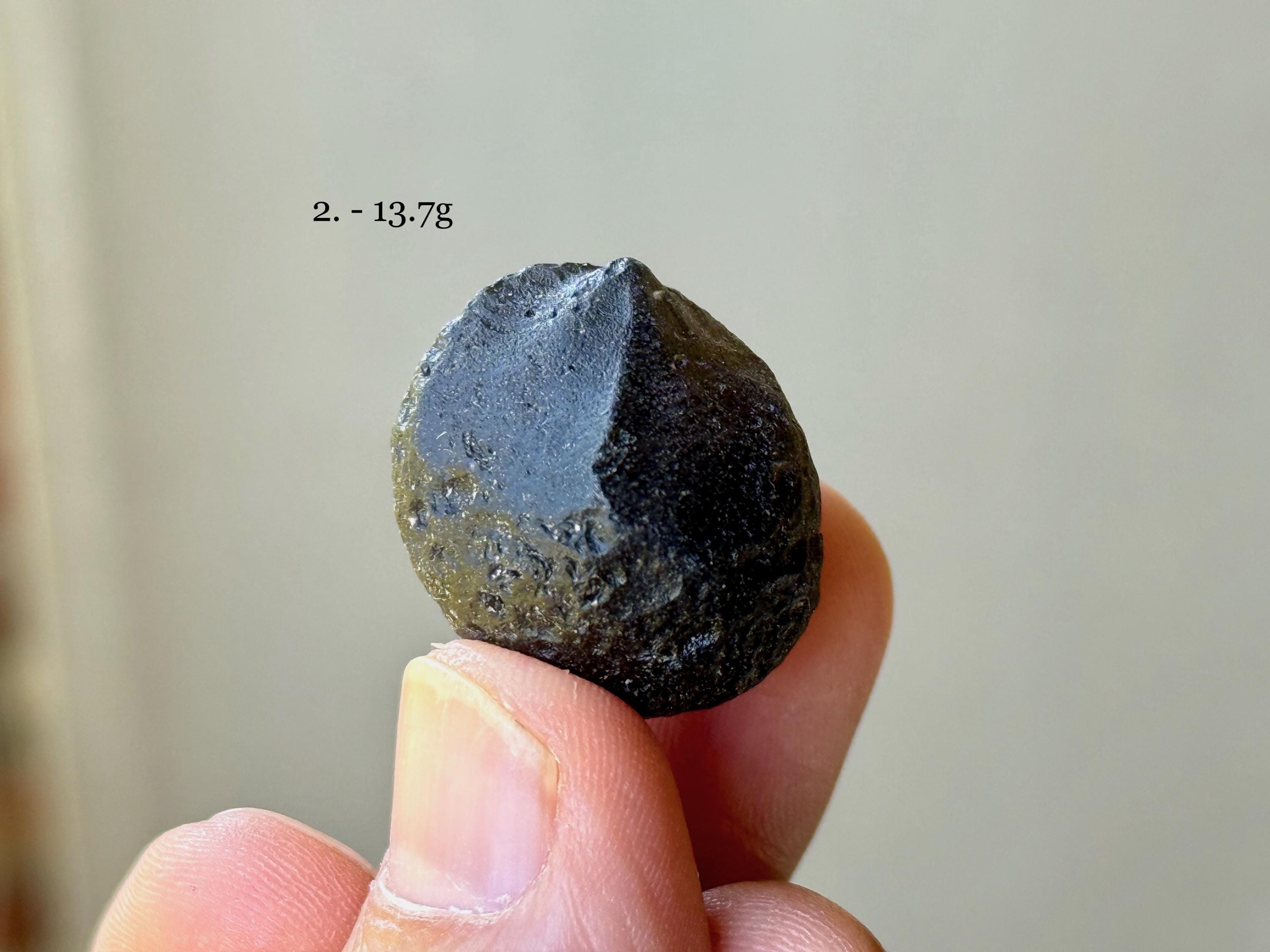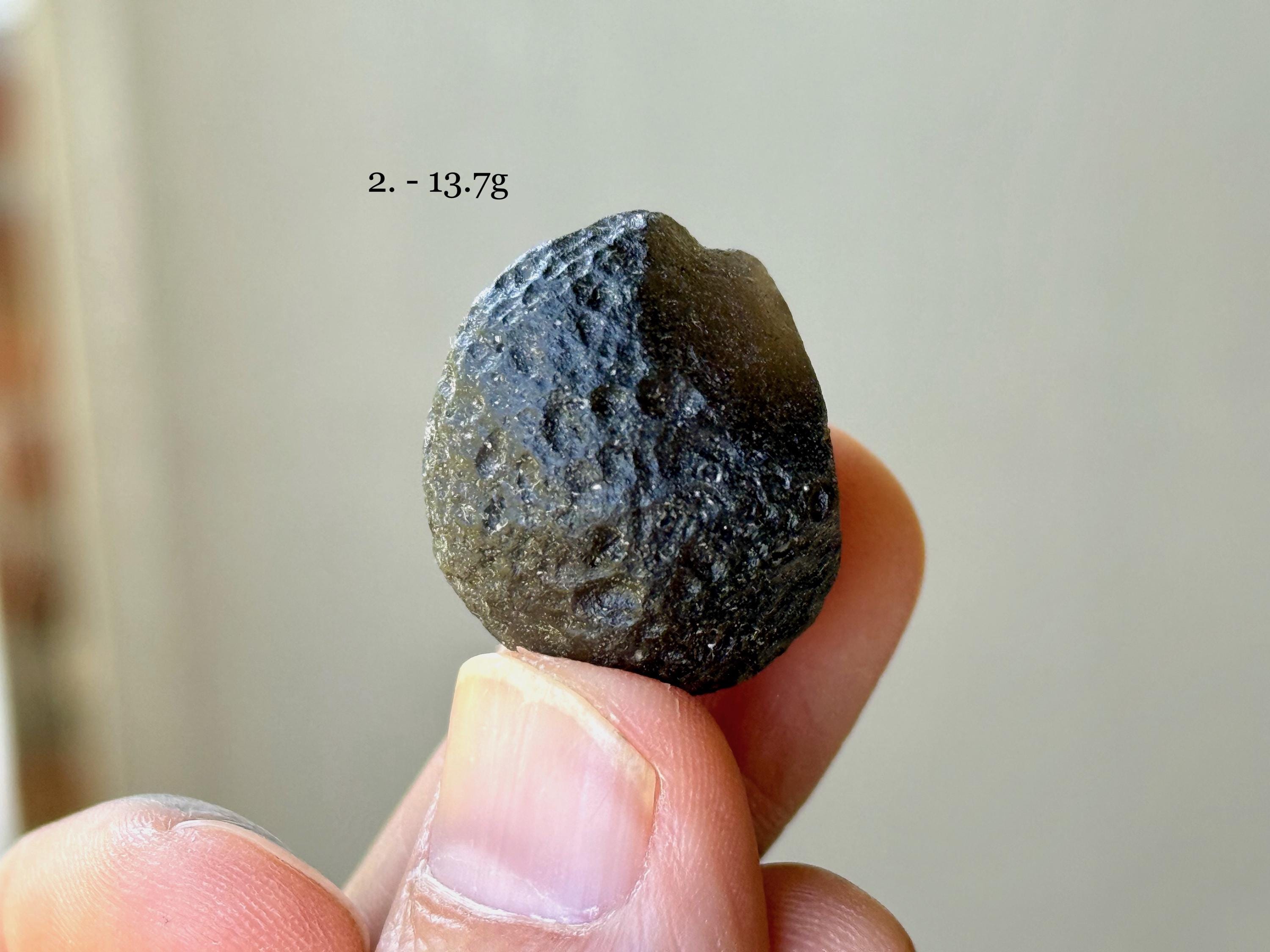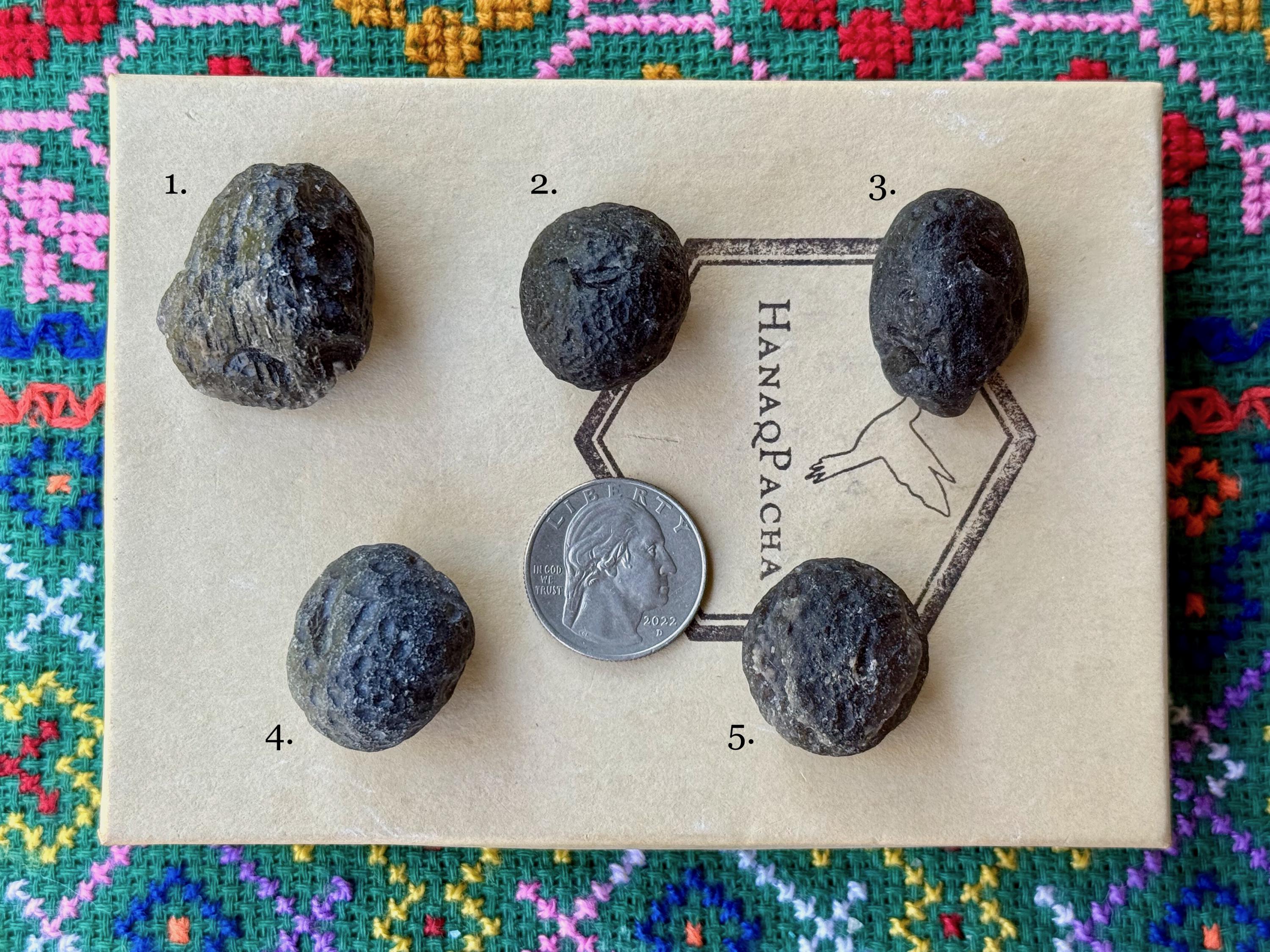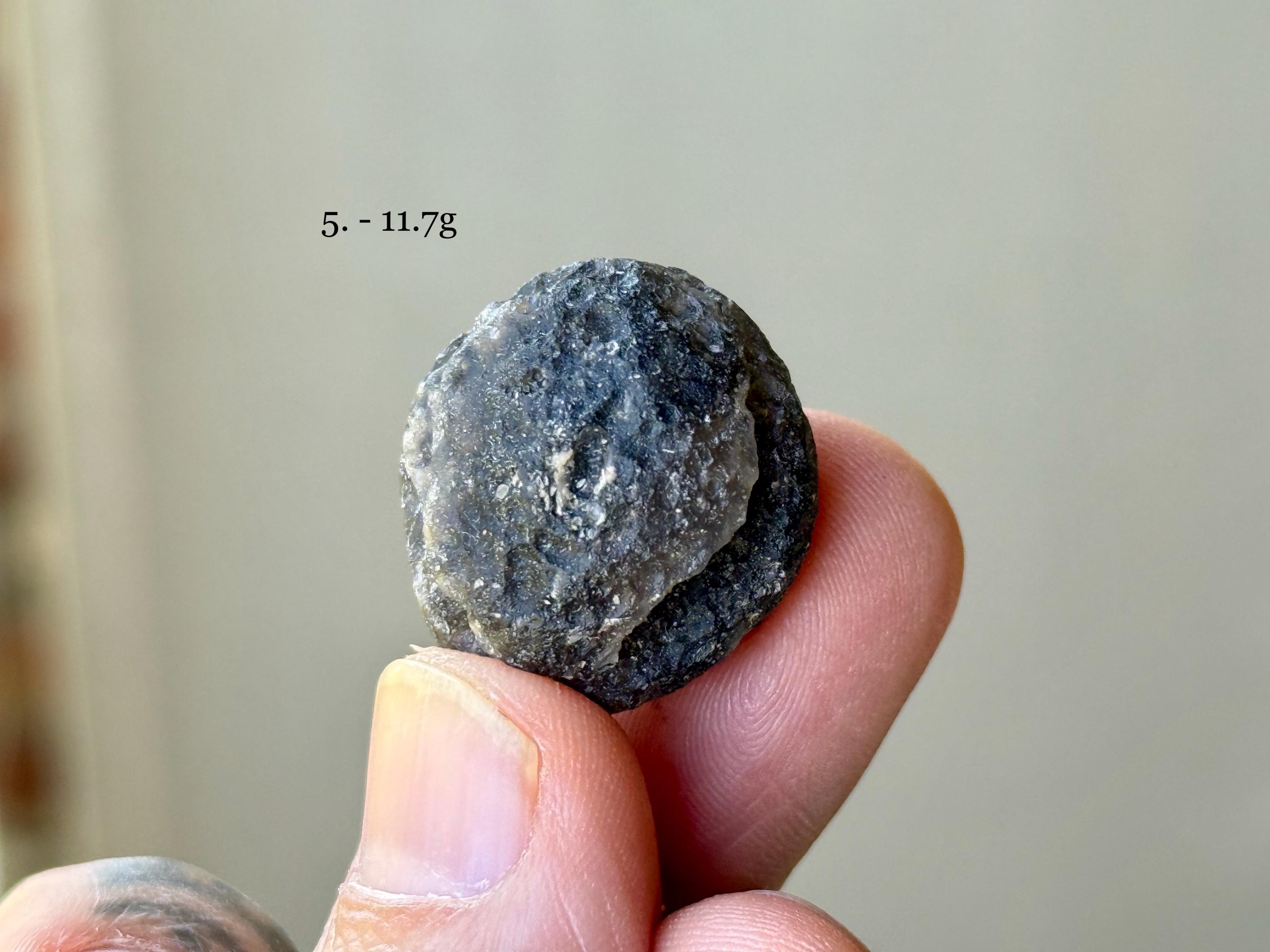 "B" Grade - These specimens may have a slightly duller complexion, with less luster and more more of a charcoal gray hue, as opposed to deep pitch black. They may still have rounded or ovular formations, or they may have irregular shapes and forms. There is still an element of translucency that is often quite high, or it may be slightly less. They may have larger smooth areas where there is no pitting.