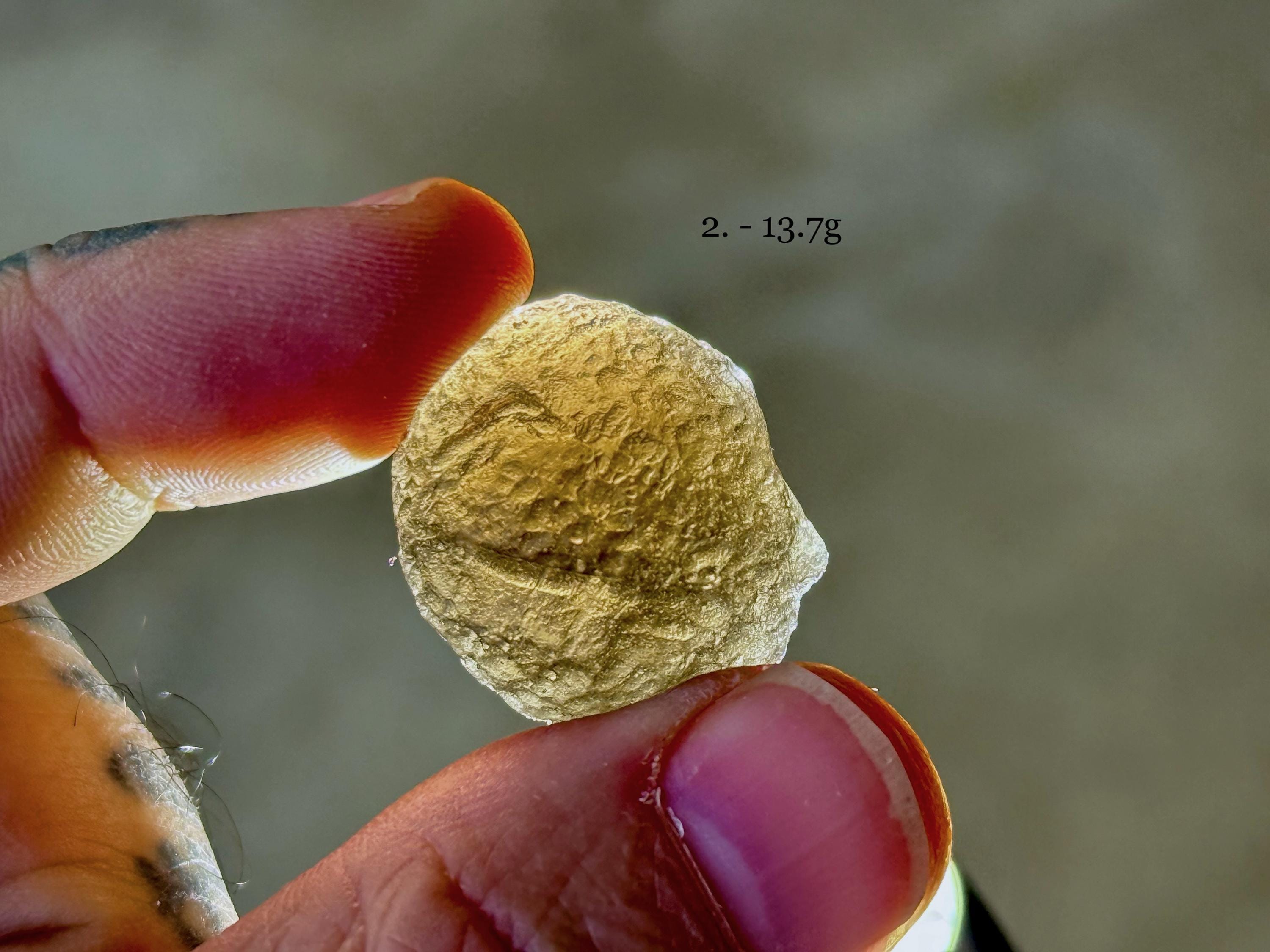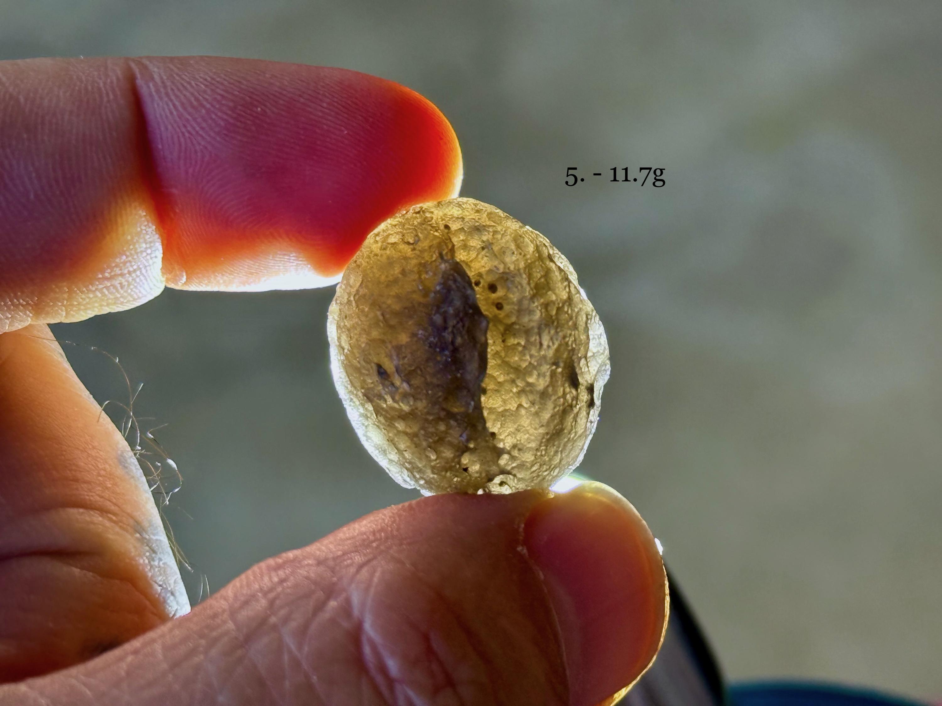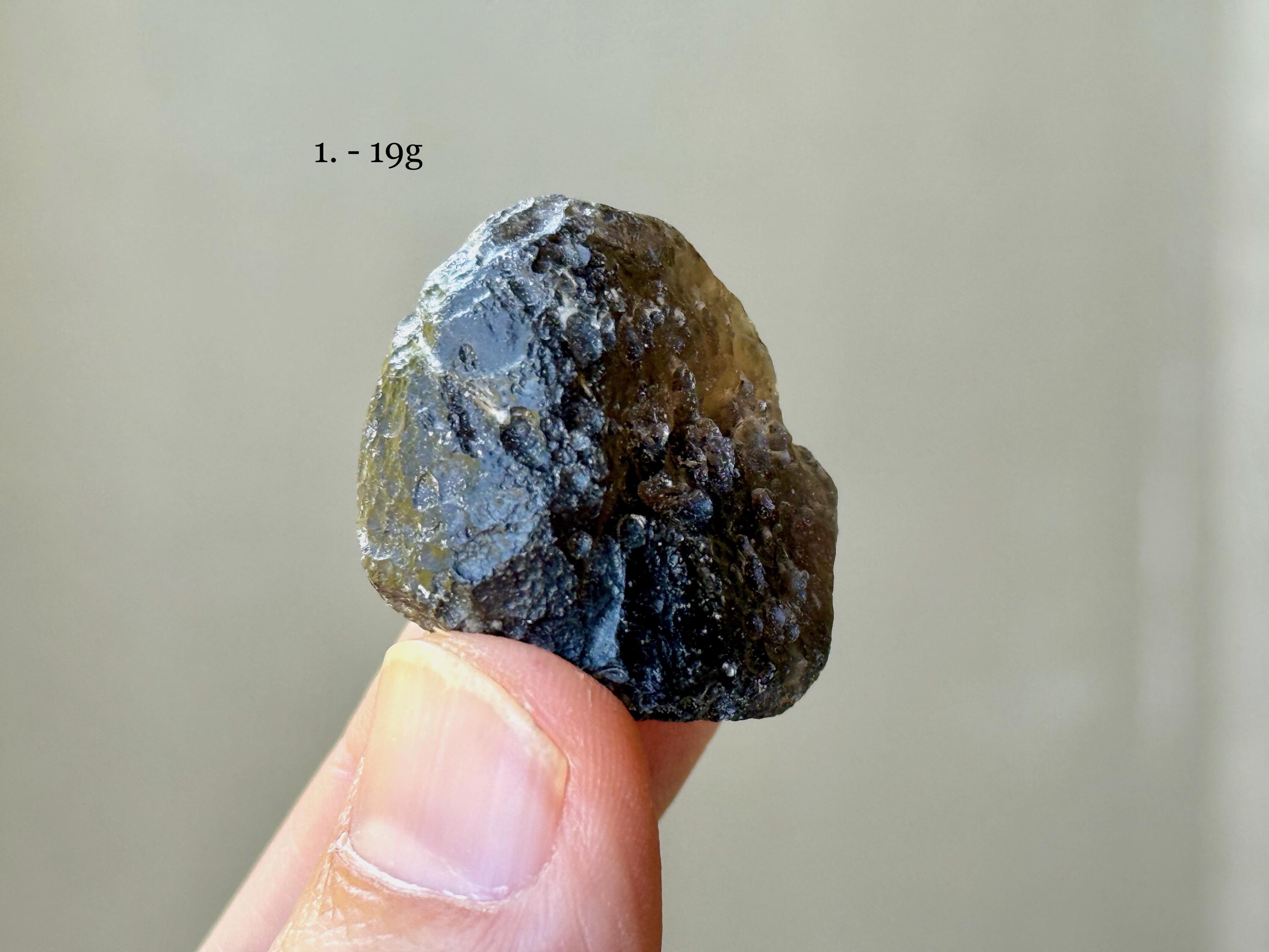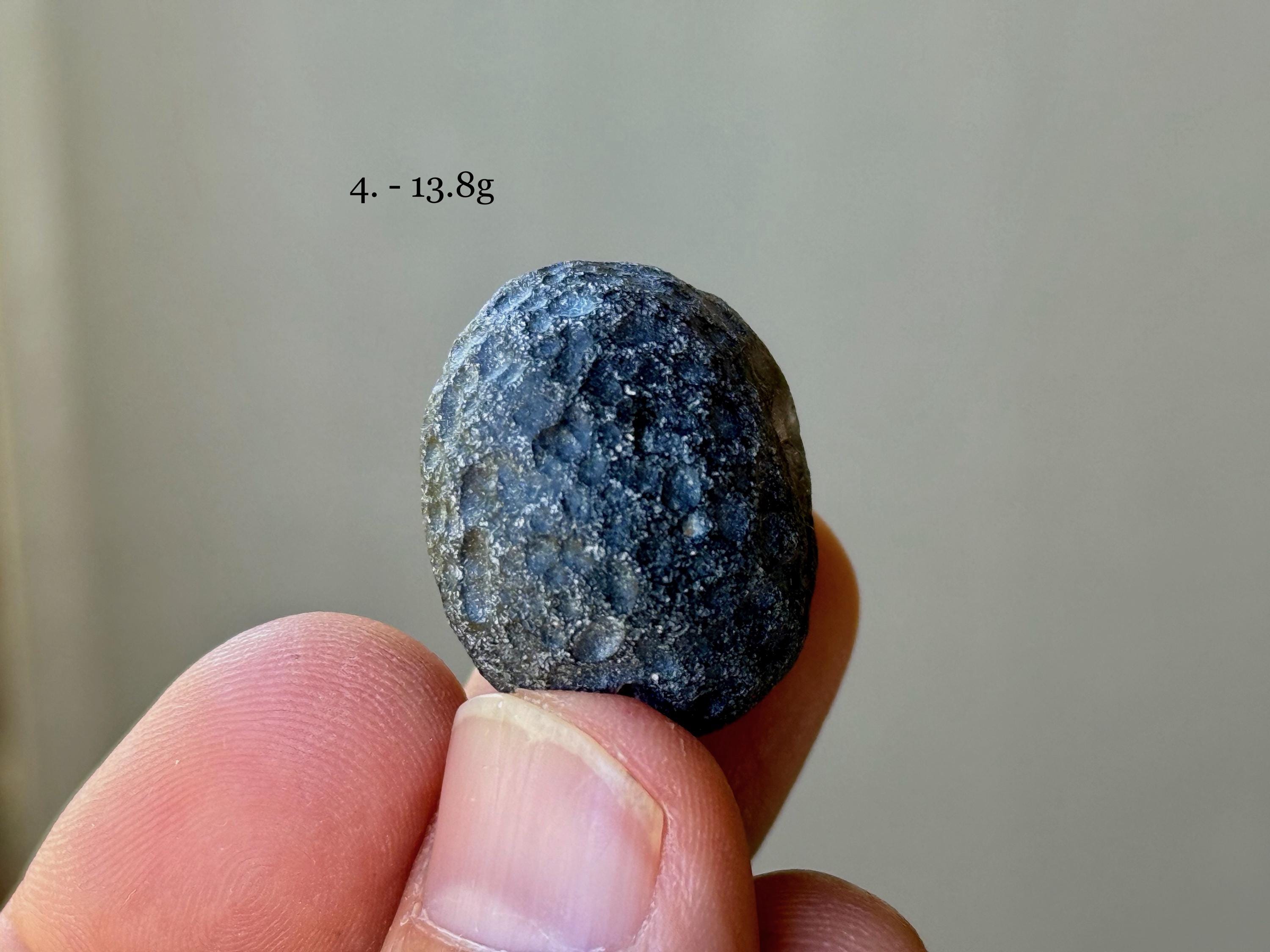 "B" Grade - These specimens may have a slightly duller complexion, with less luster and more more of a charcoal gray hue, as opposed to deep pitch black. They may still have rounded or ovular formations, or they may have irregular shapes and forms. There is still an element of translucency that is often quite high, or it may be slightly less. They may have larger smooth areas where there is no pitting.