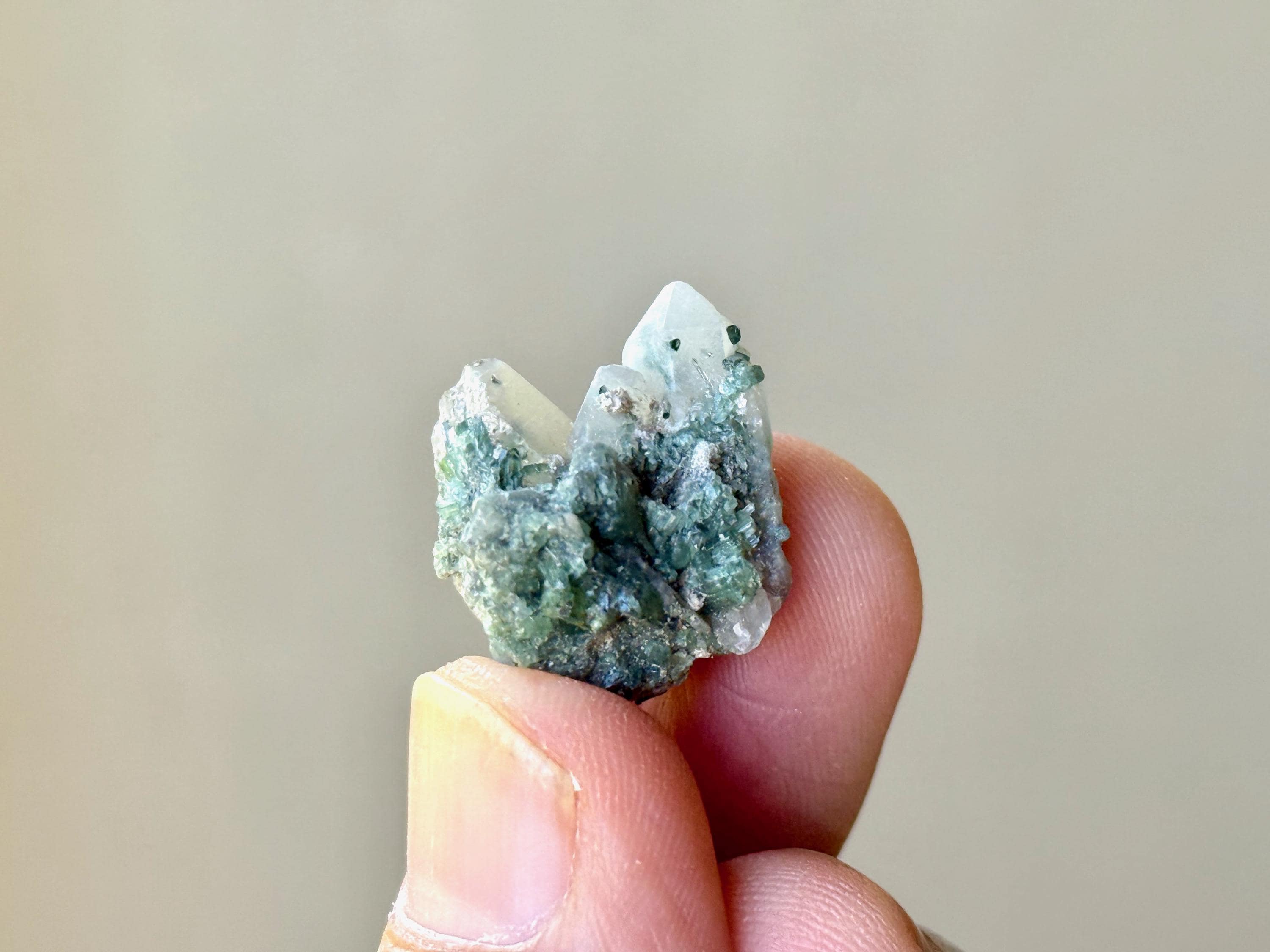 This lot of Green Tourmaline Quartz crystals comes from an old find in the Santa Rosa Mine, Itambacuri, Minas Gerais, Brazil. Green Tourmaline is a powerful Heart Chakra crystal, also known for its purification properties.