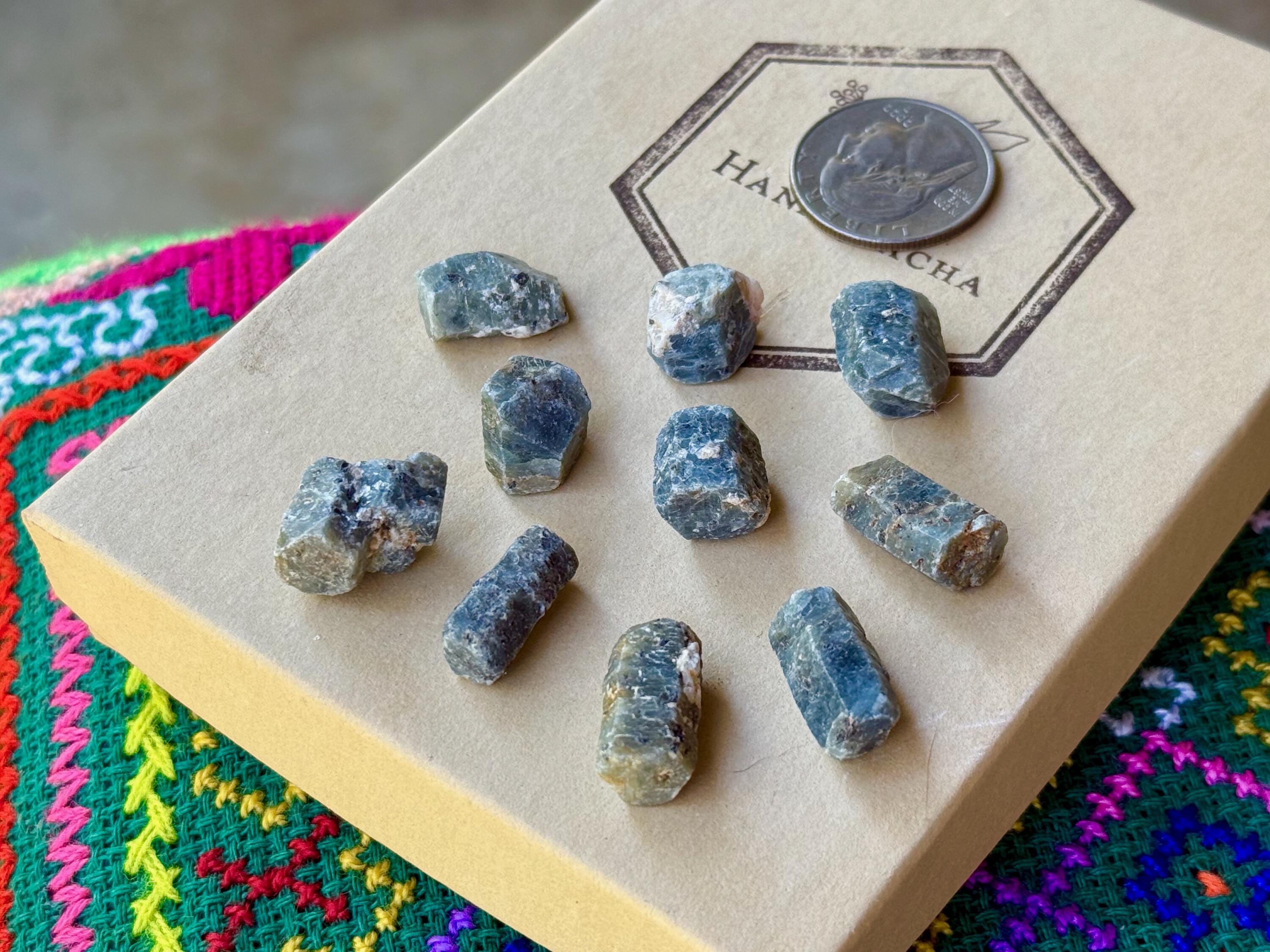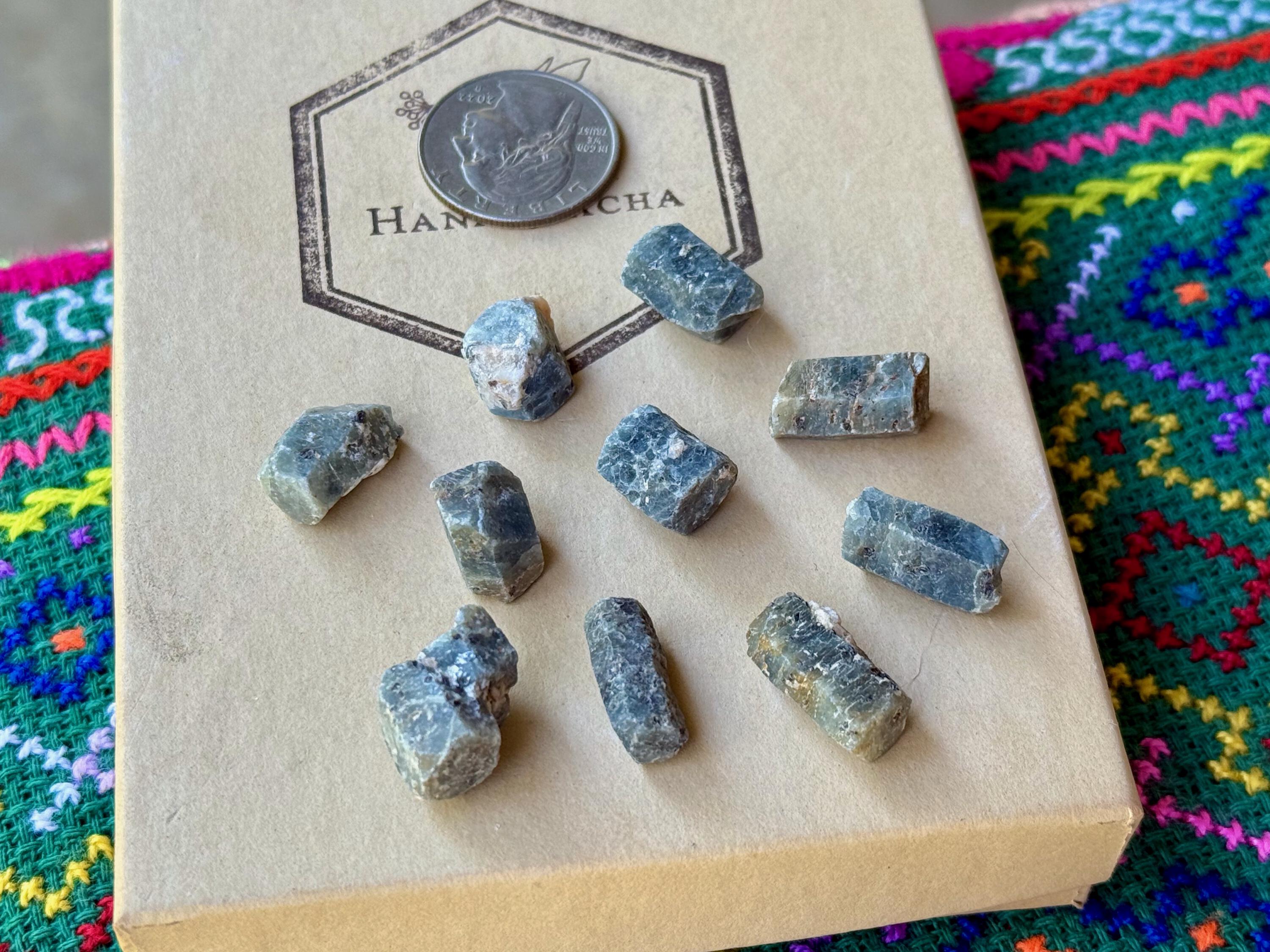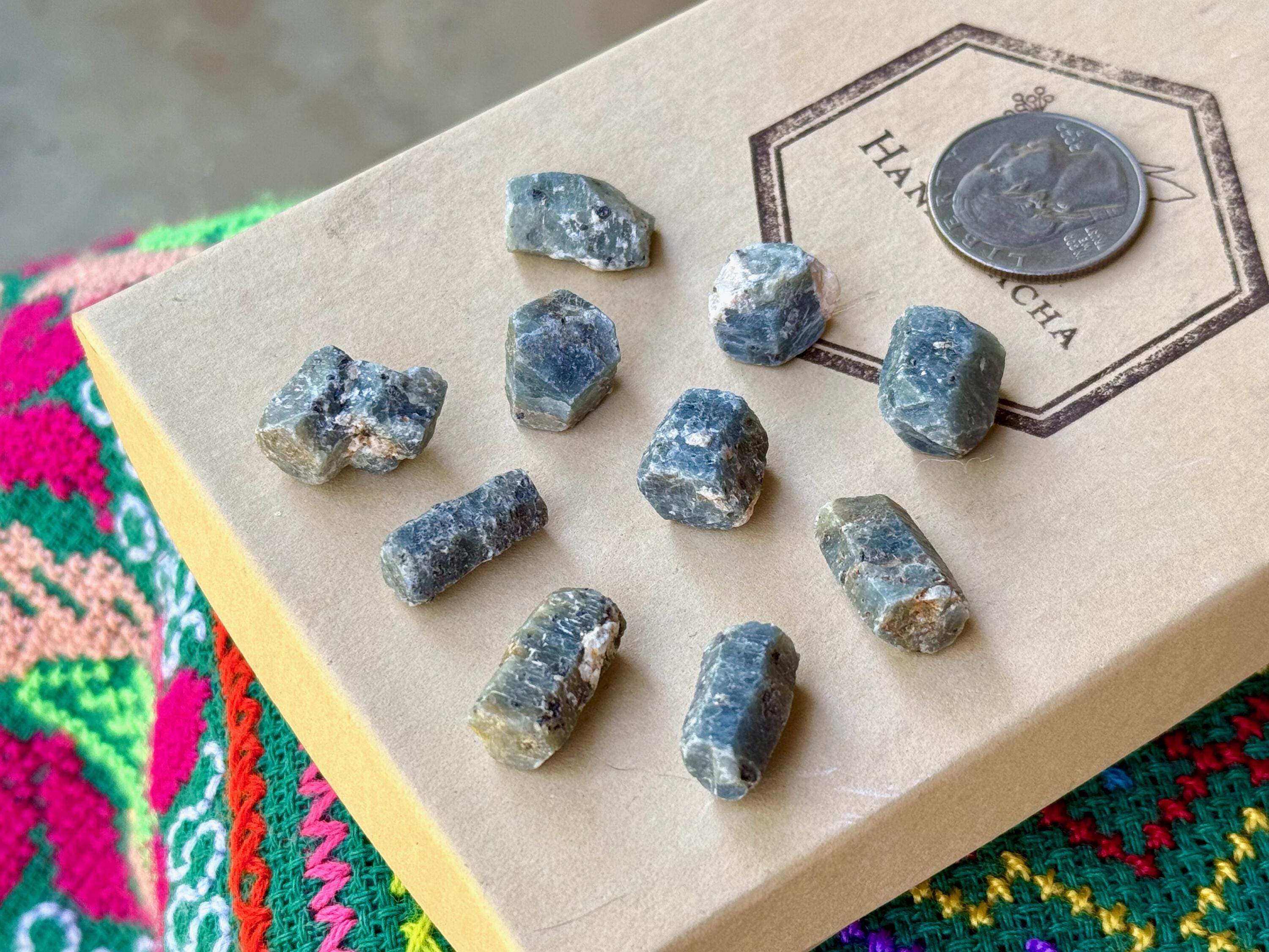 This lot of TEN natural Blue Sapphire crystals comes from an old find (10+ years) in Madagascar. Blue Sapphire is an exceptional stone for calming and focusing the mind, and releasing unwanted thoughts and mental chatter.