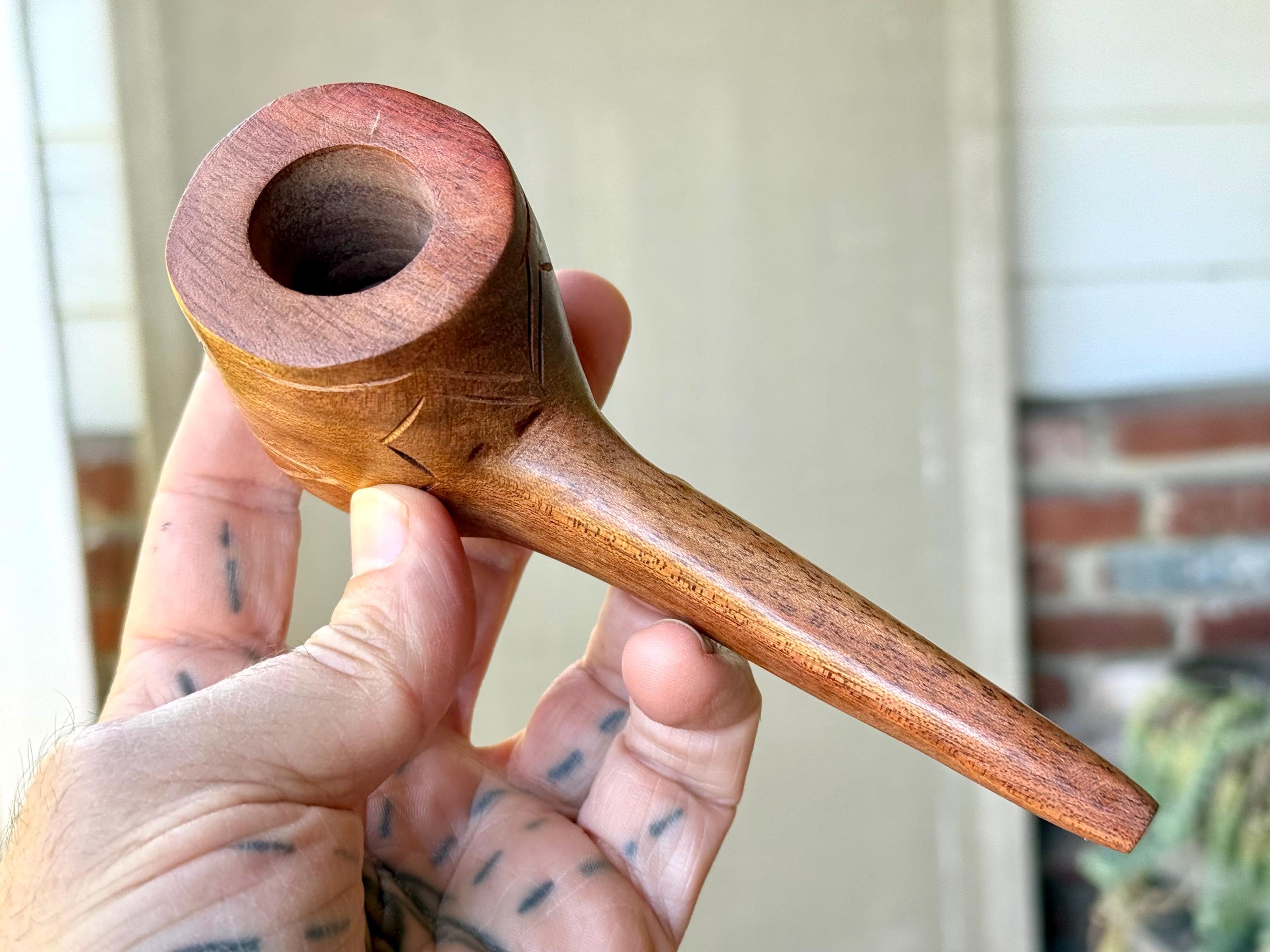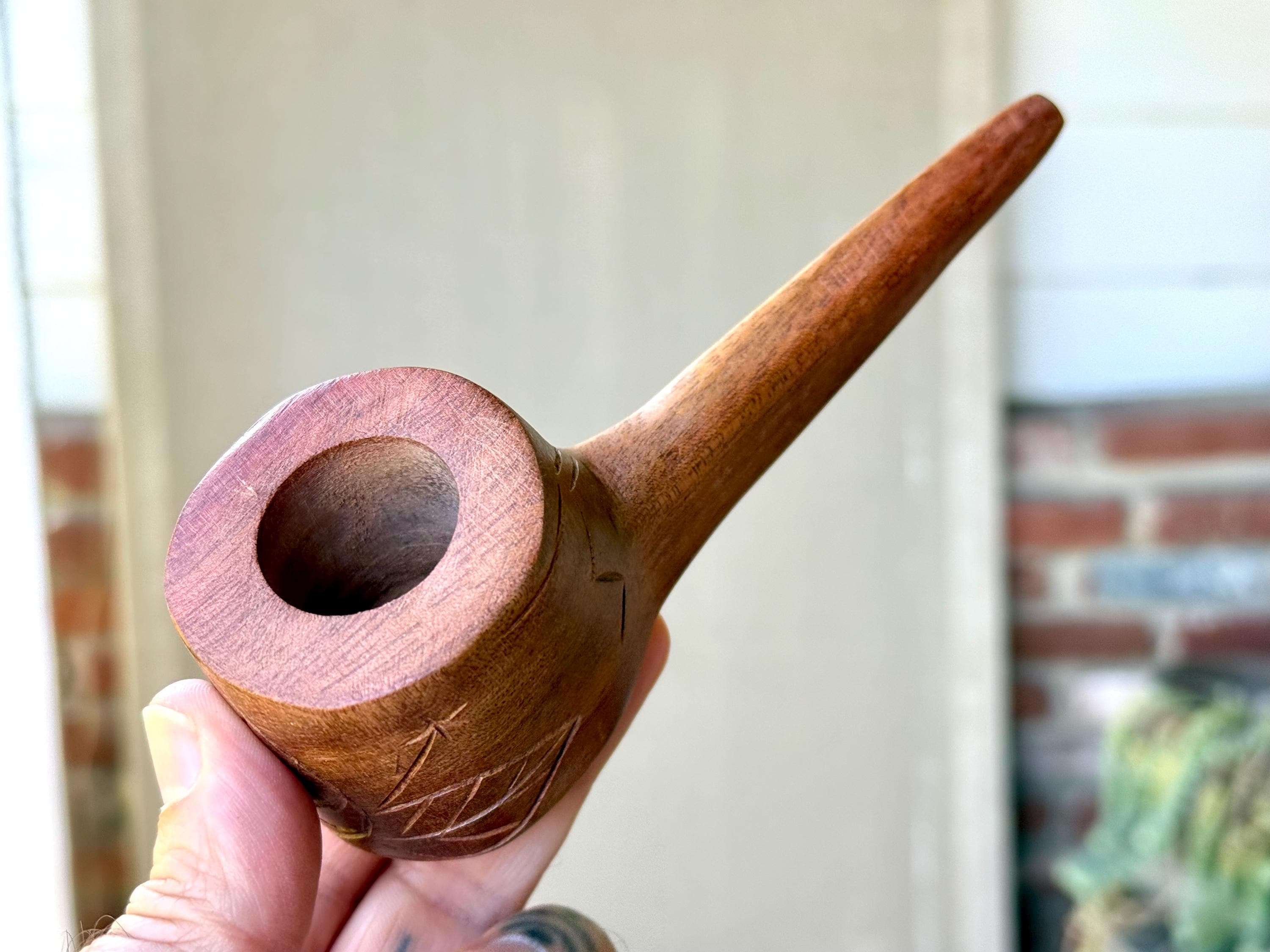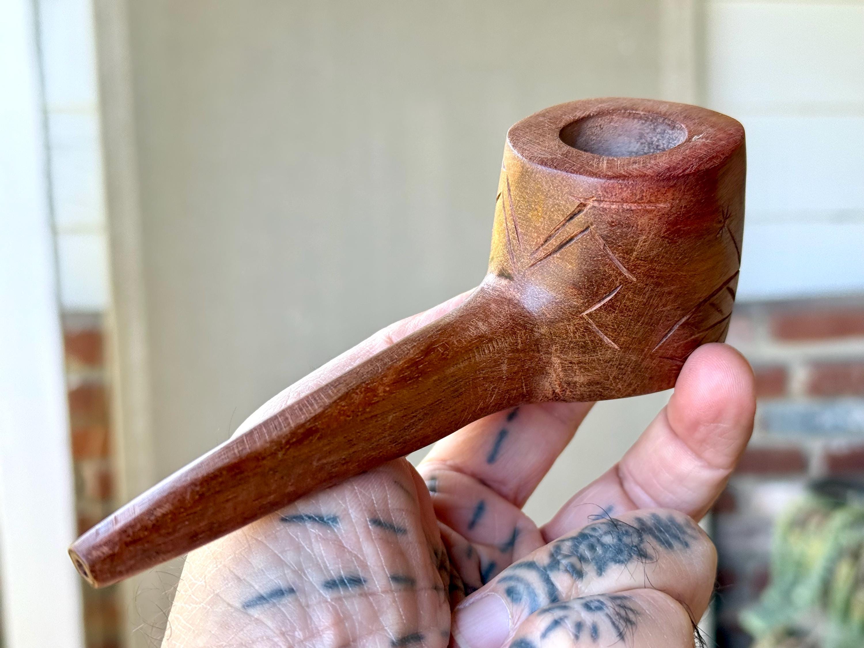 Here the artist uses Palo Sangre ("Blood Wood") for his creation, a very strong hardwood with a rich reddish-brown hue, indigenous to the Amazon and areas of Central and South America. This pipe is carved from a single piece of this wood and is weighty and well-crafted. A powerful and beautiful medicine tool for ceremony.