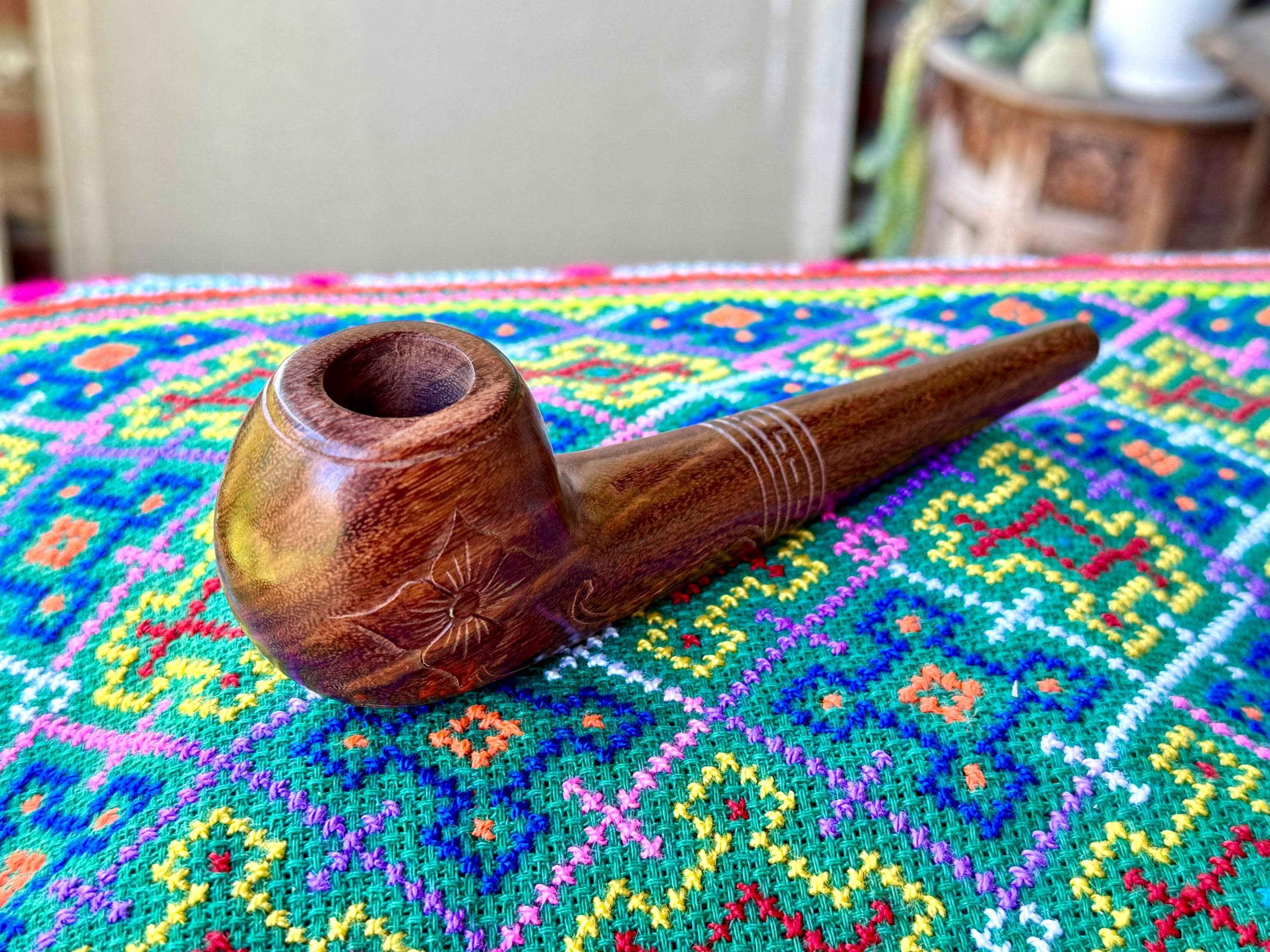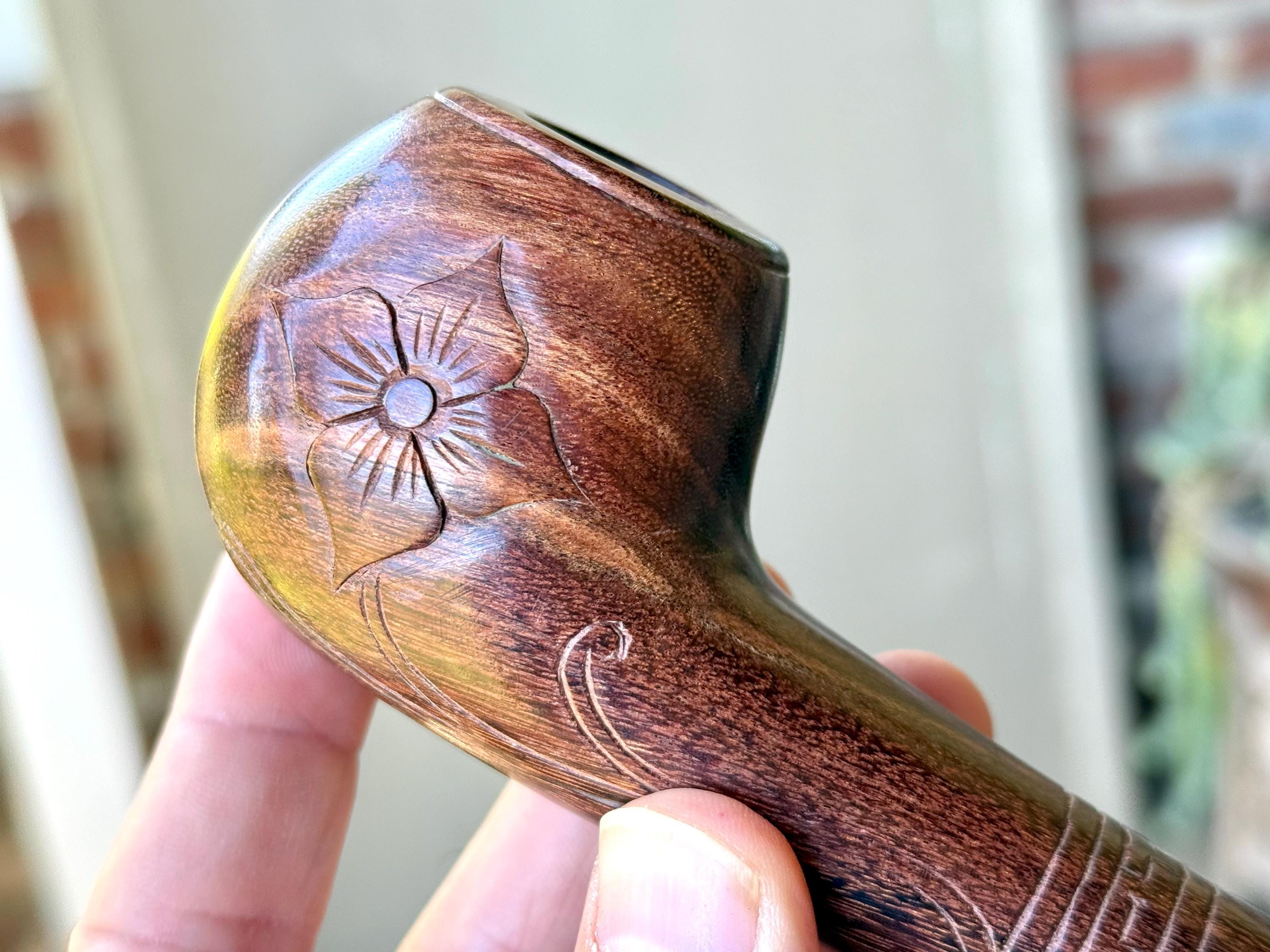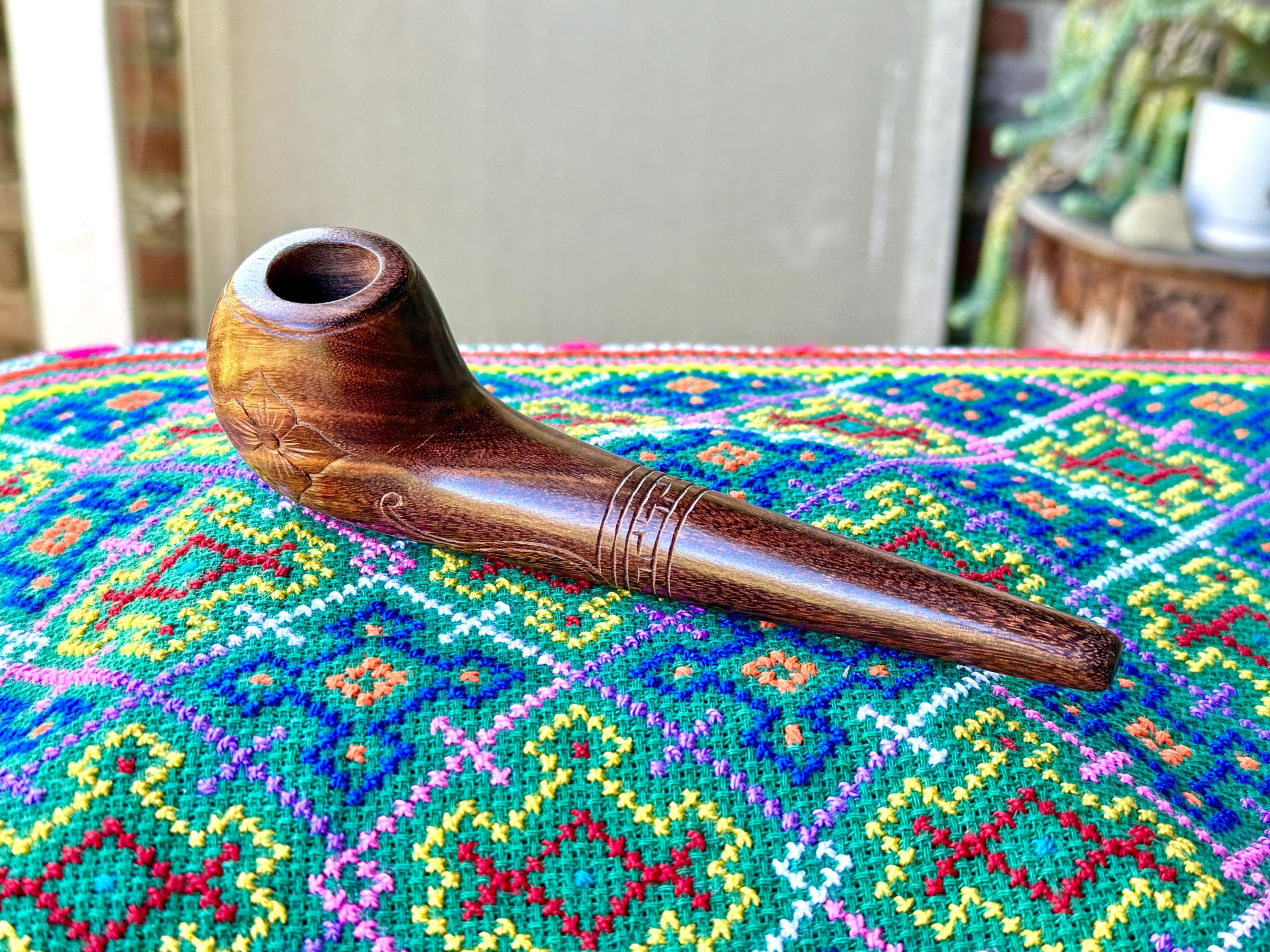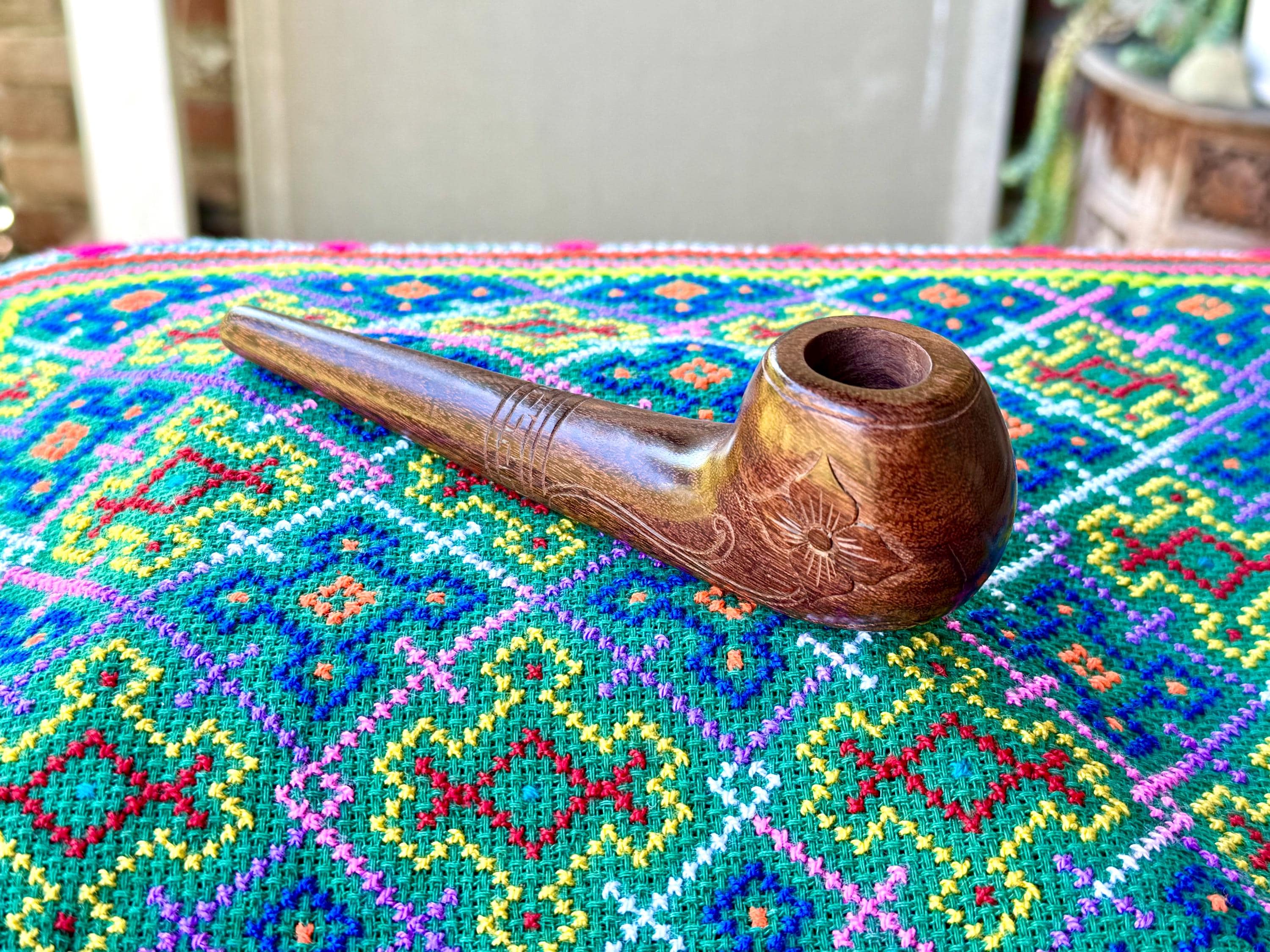 This traditional, handcrafted tobacco pipe with floral carvings was made by our artisans in Indonesia. The flower is actually a Tobacco Flower! This elegant pipe is for tobacco/mapacho and intended for — but not limited to — shamanic or ceremonial use.
