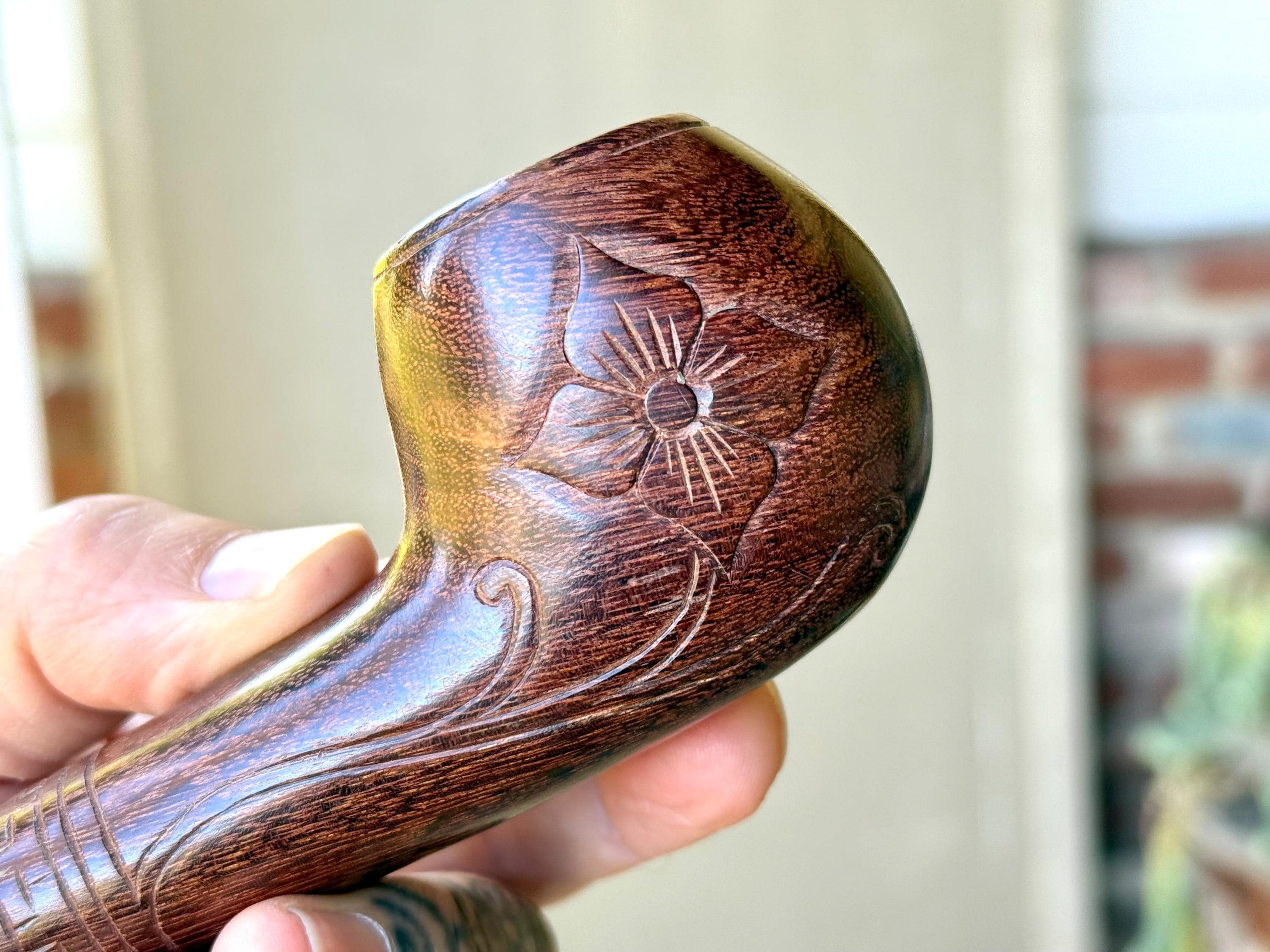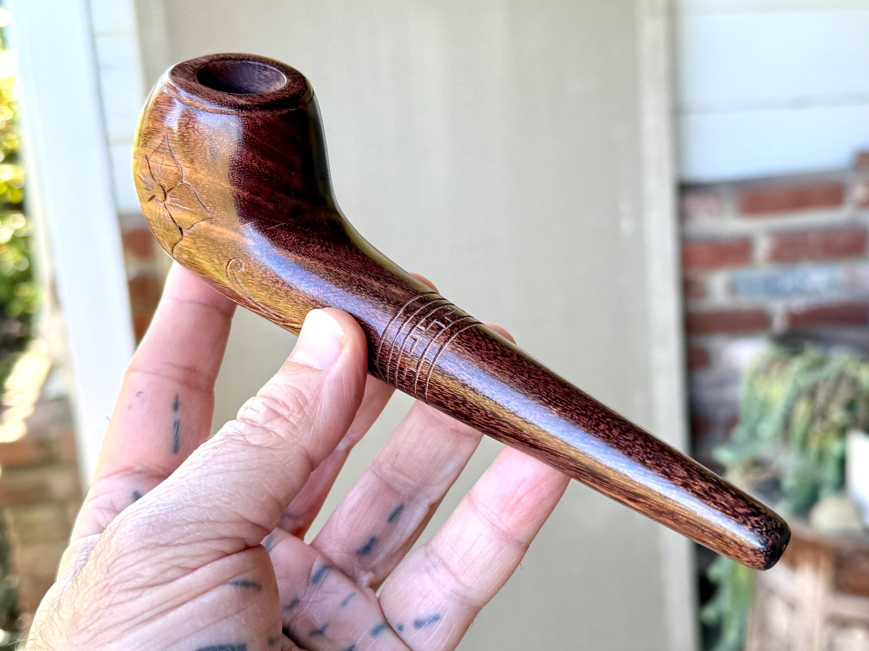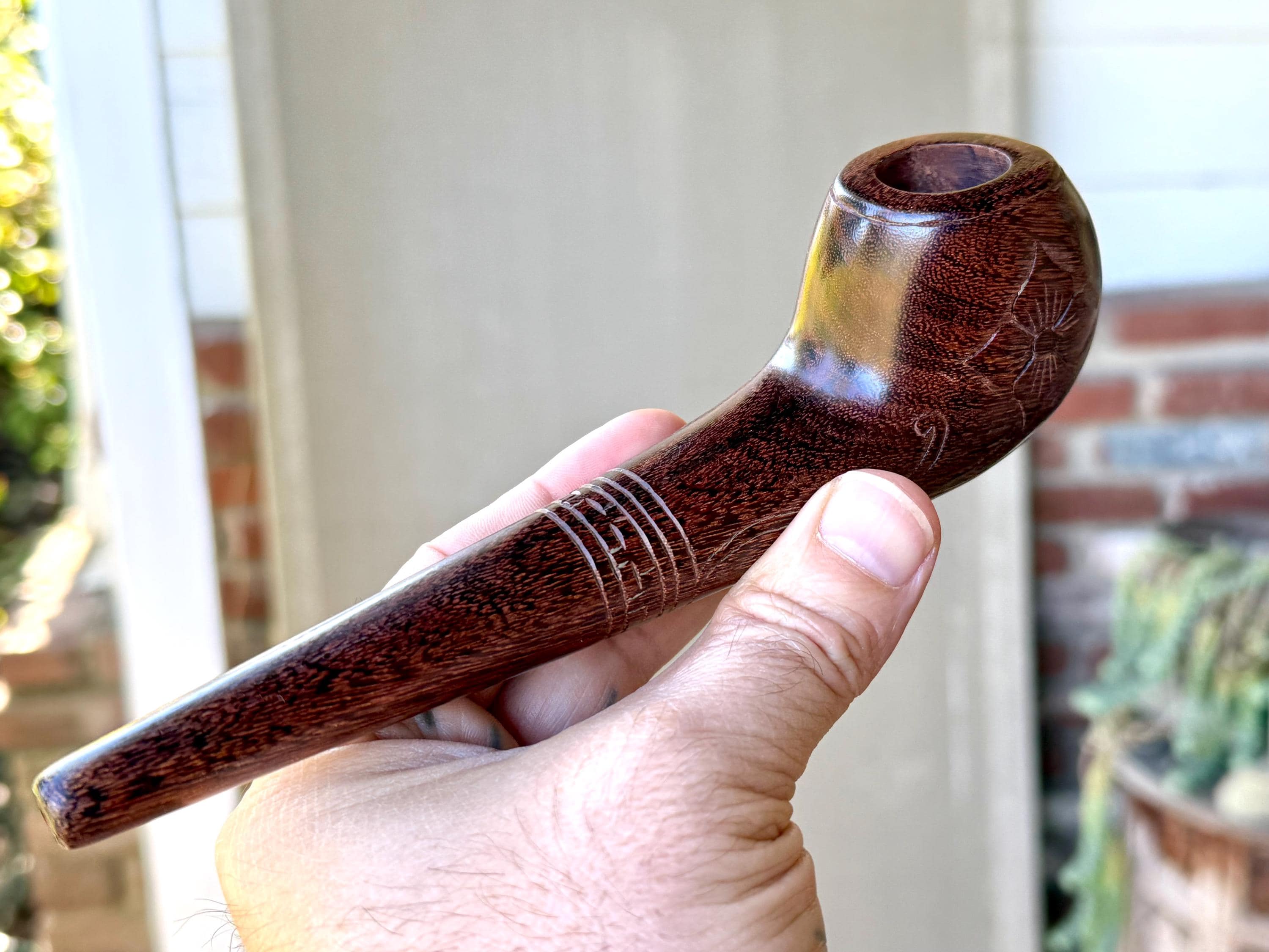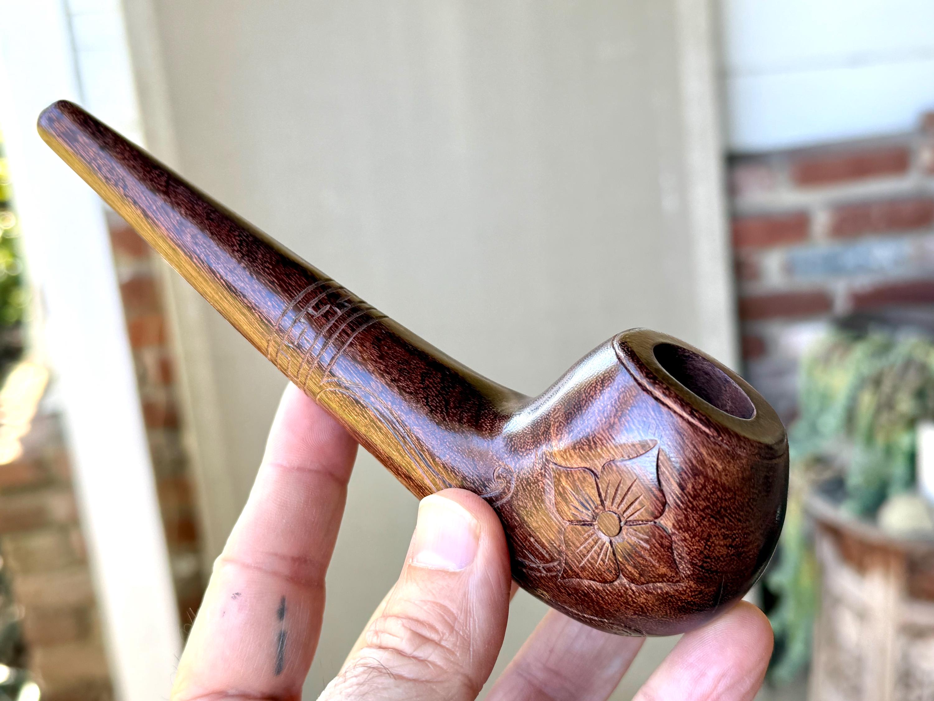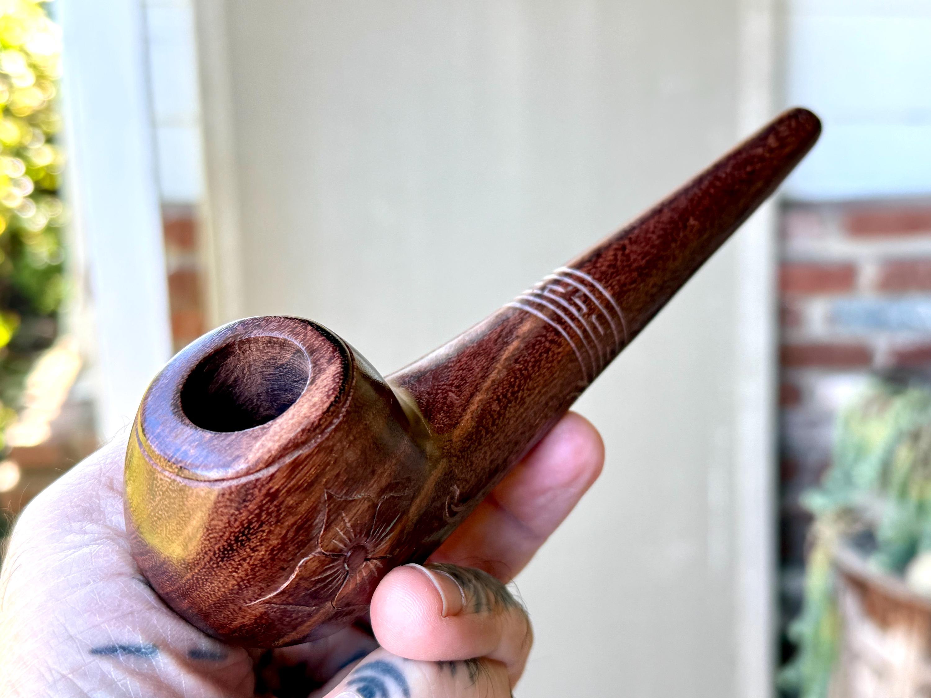 This traditional, handcrafted tobacco pipe with floral carvings was made by our artisans in Indonesia. The flower is actually a Tobacco Flower! This elegant pipe is for tobacco/mapacho and intended for — but not limited to — shamanic or ceremonial use.