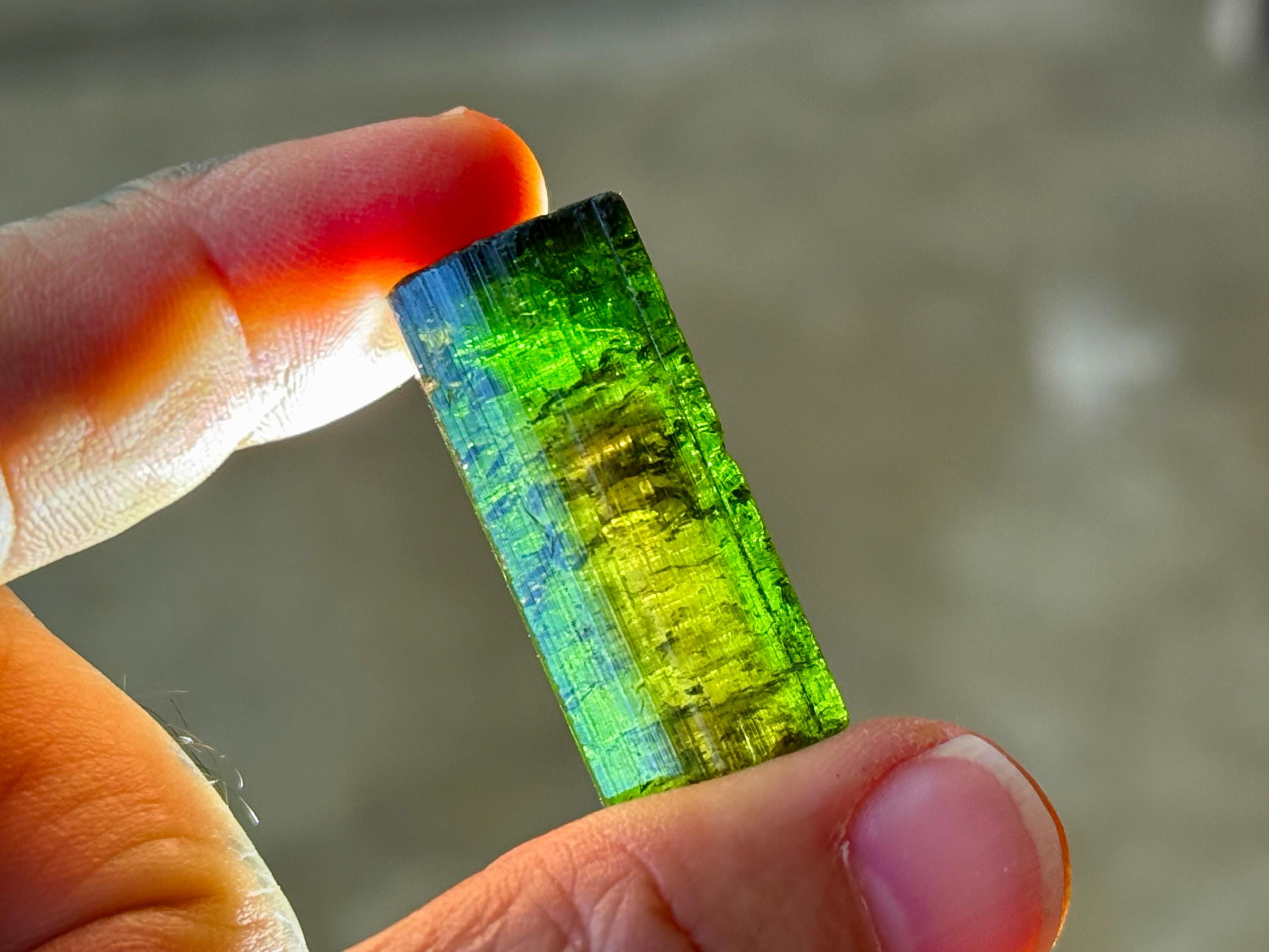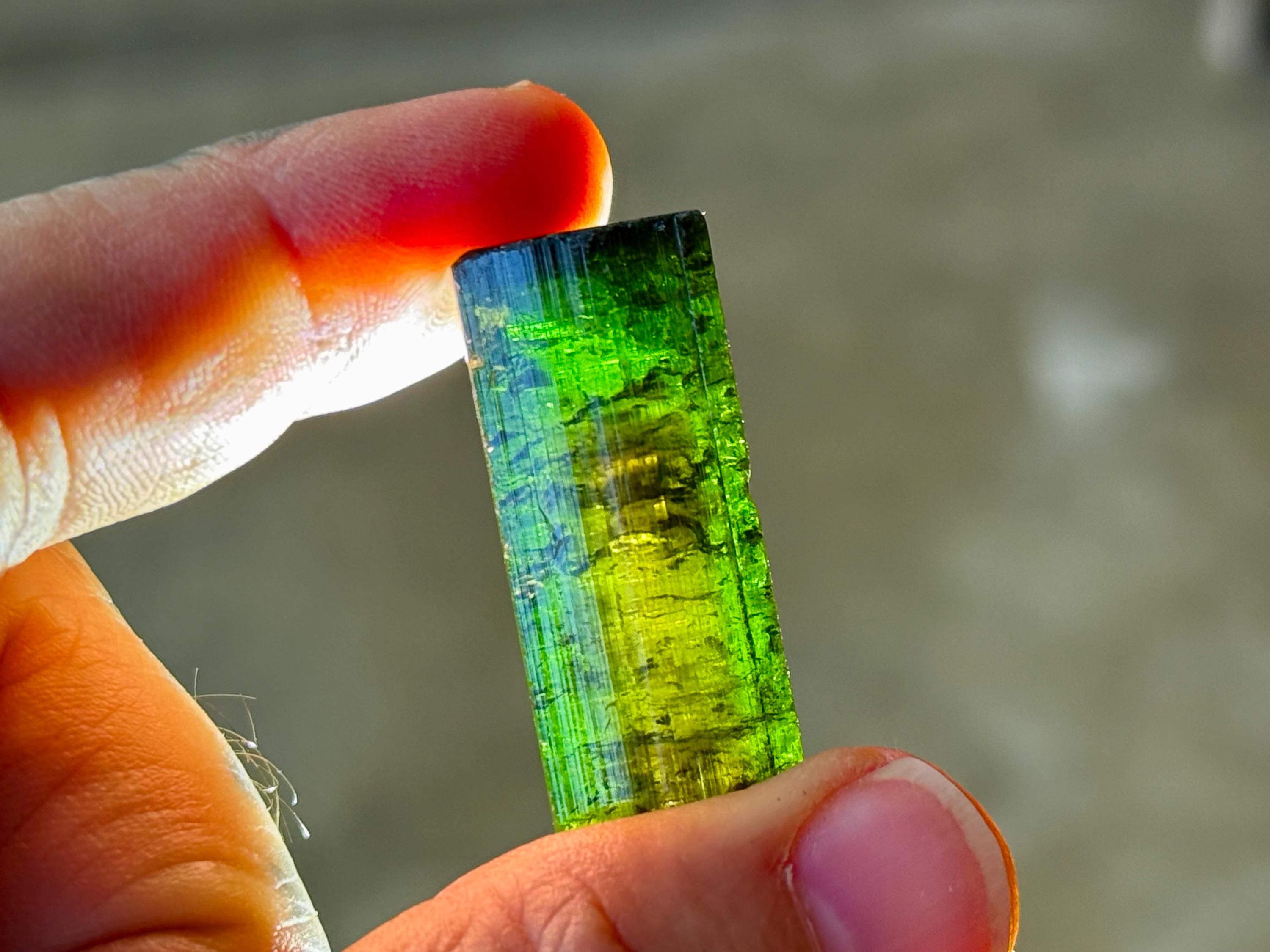 At first glance, this simply looks like a very lustrous dark Green Tourmaline with beautiful color and formation. However, when we backlight this piece, we immediately see the vibrance it possesses! Most striking is the yellow and pink core that becomes apparent when backlit. This yellow and pink core actually stretches down further than the photos here depict, just a little challenging to capture in photos. The photos also show more of the yellow color, but there is more pink in person (Photos 1-2, 5-6).