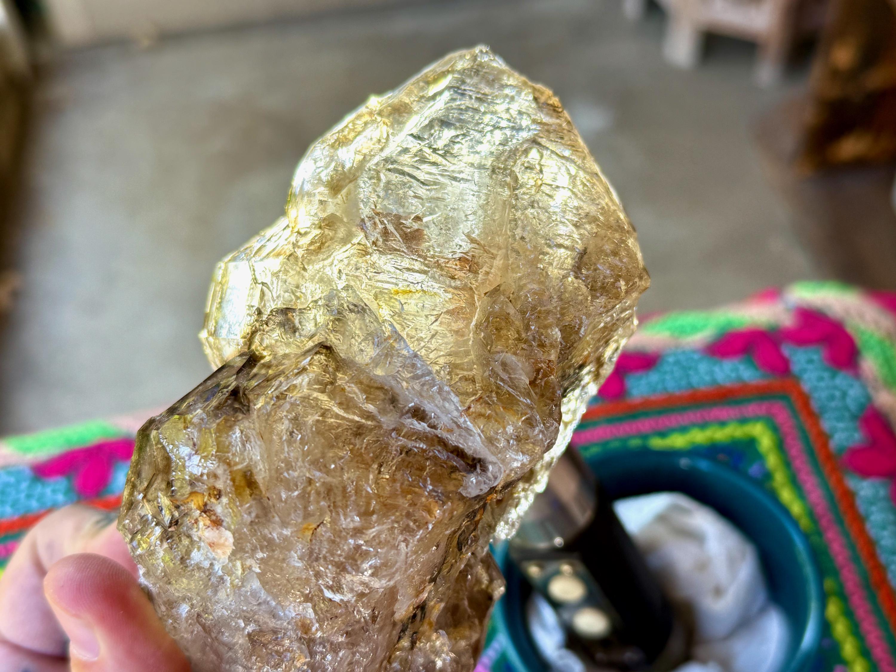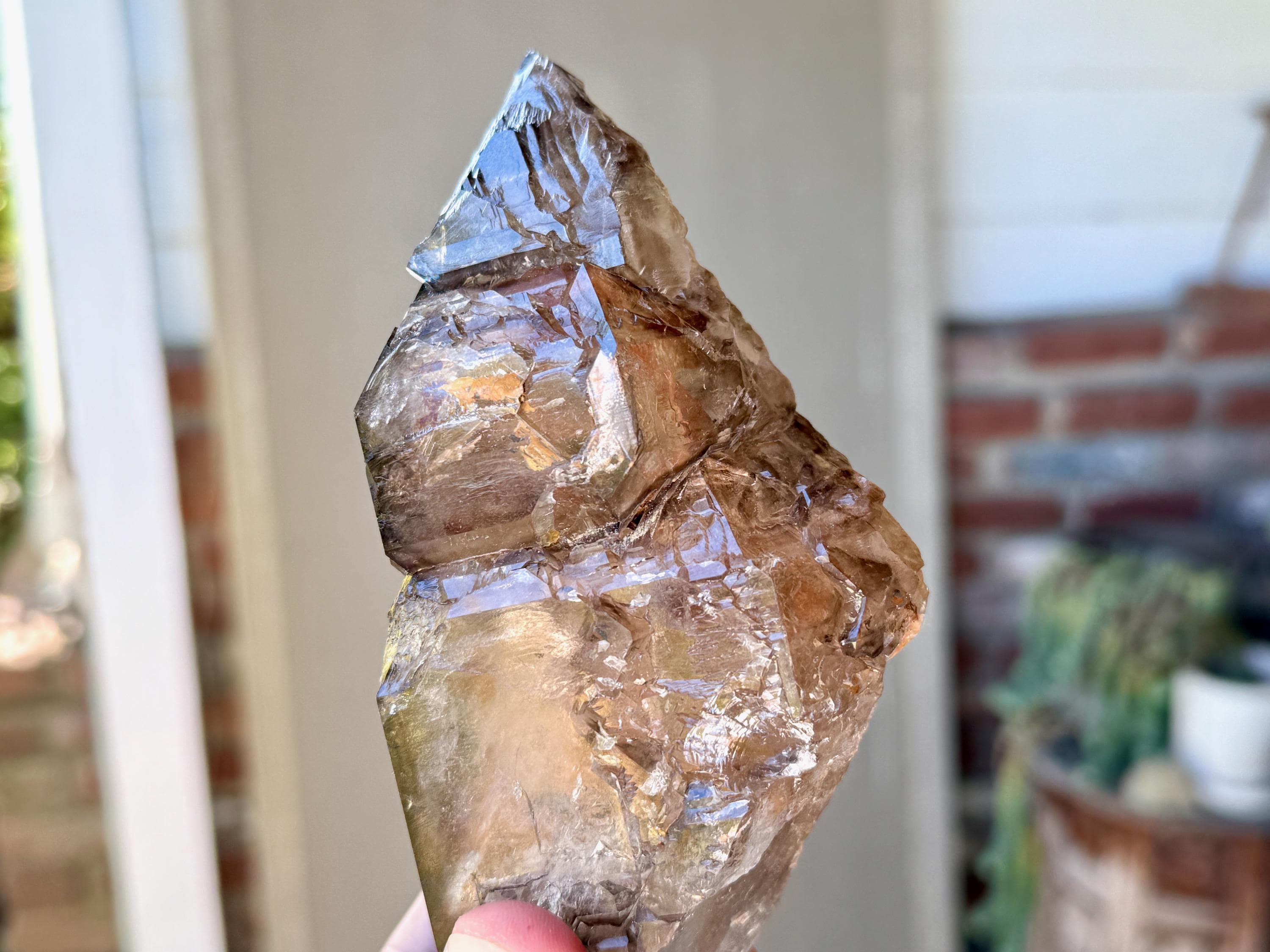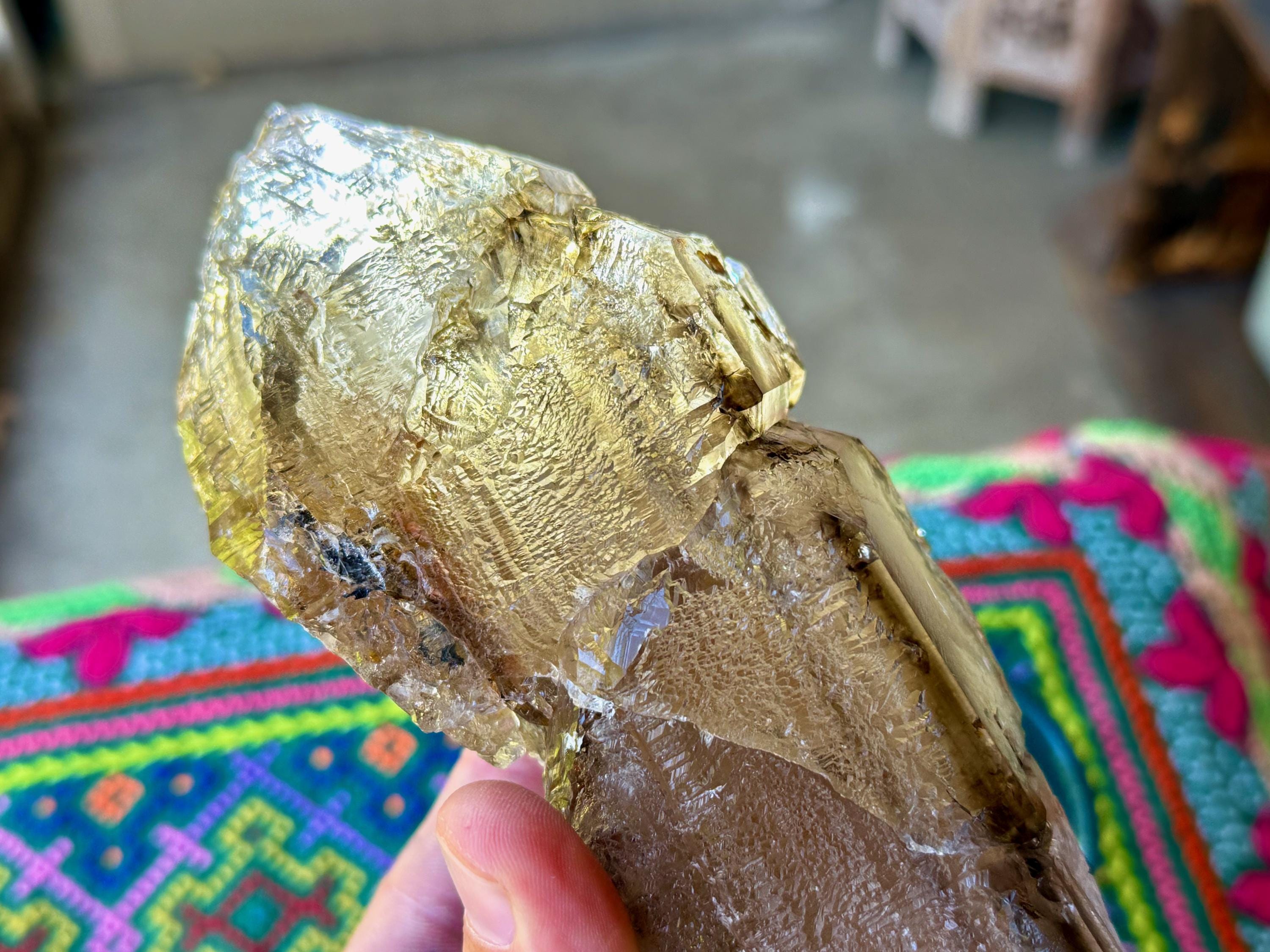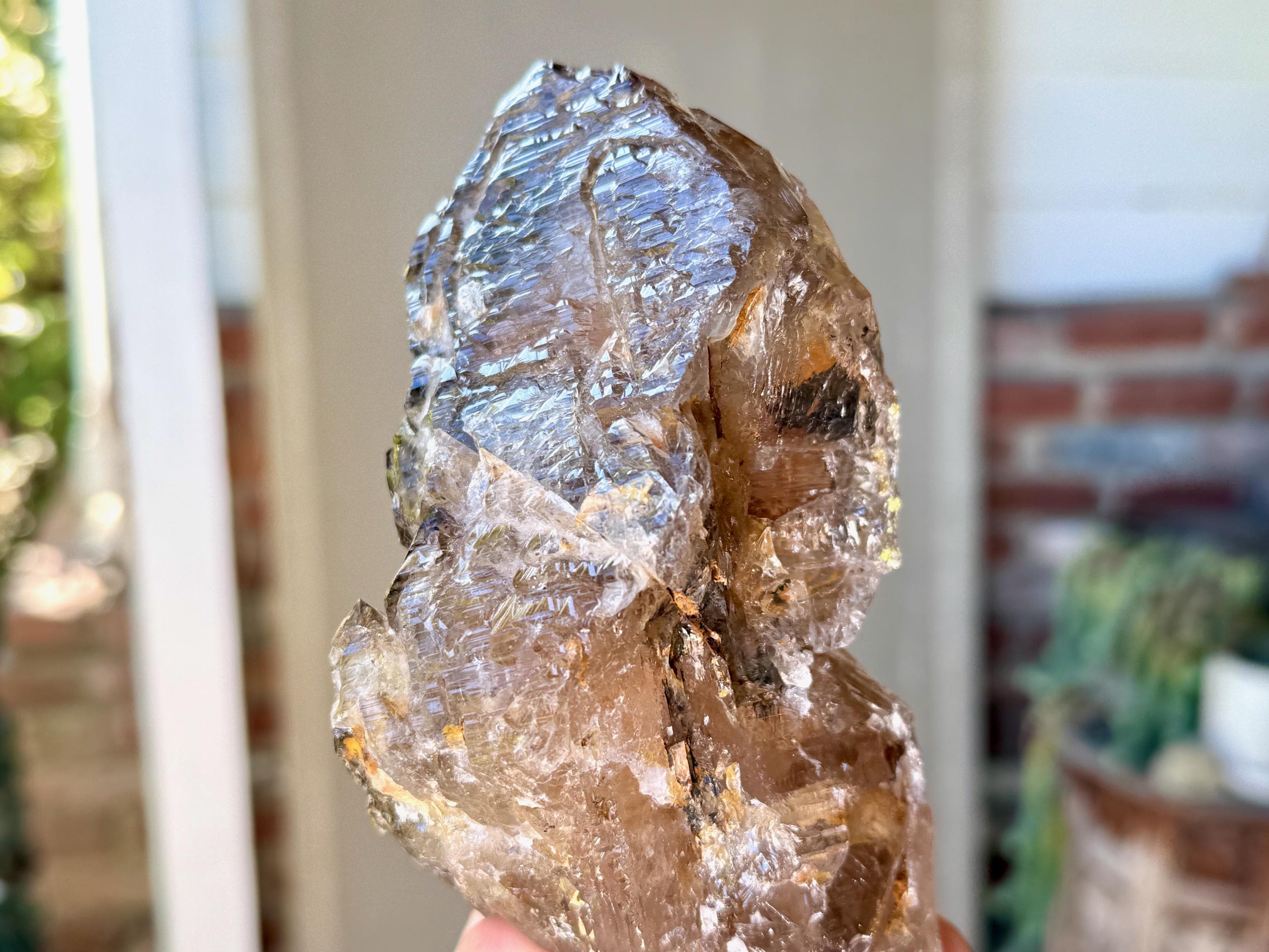 Gorgeous marbling of smoky and golden hues on this lustrous BG3 Citrine in an Elestial formation. The color is rich and robust, with a luster and clarity that allows us to peer inside and view an array of crystalline structures and cloudy inclusions. When backlit, as in Photos 5-7, this crystal lights up brilliantly.
