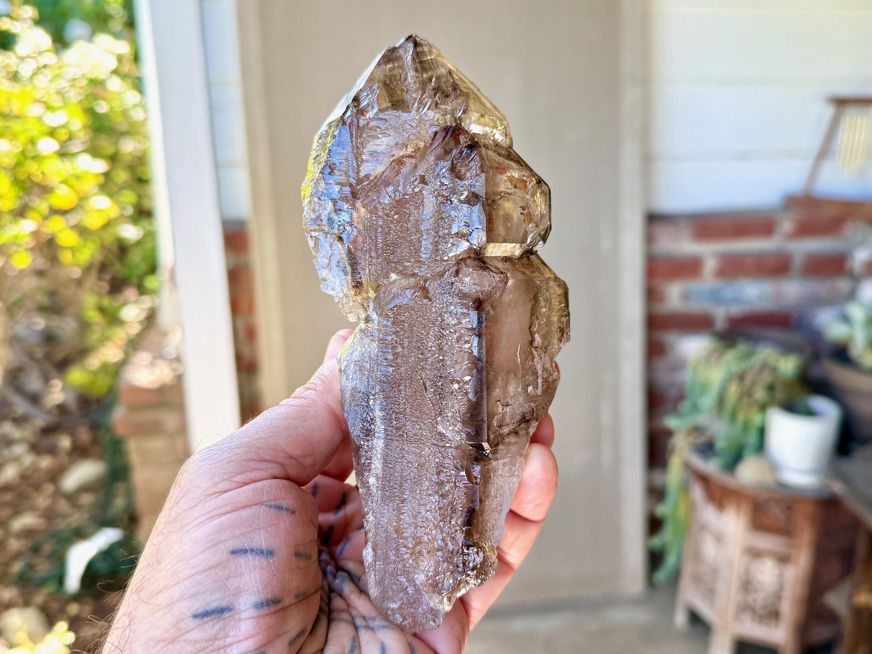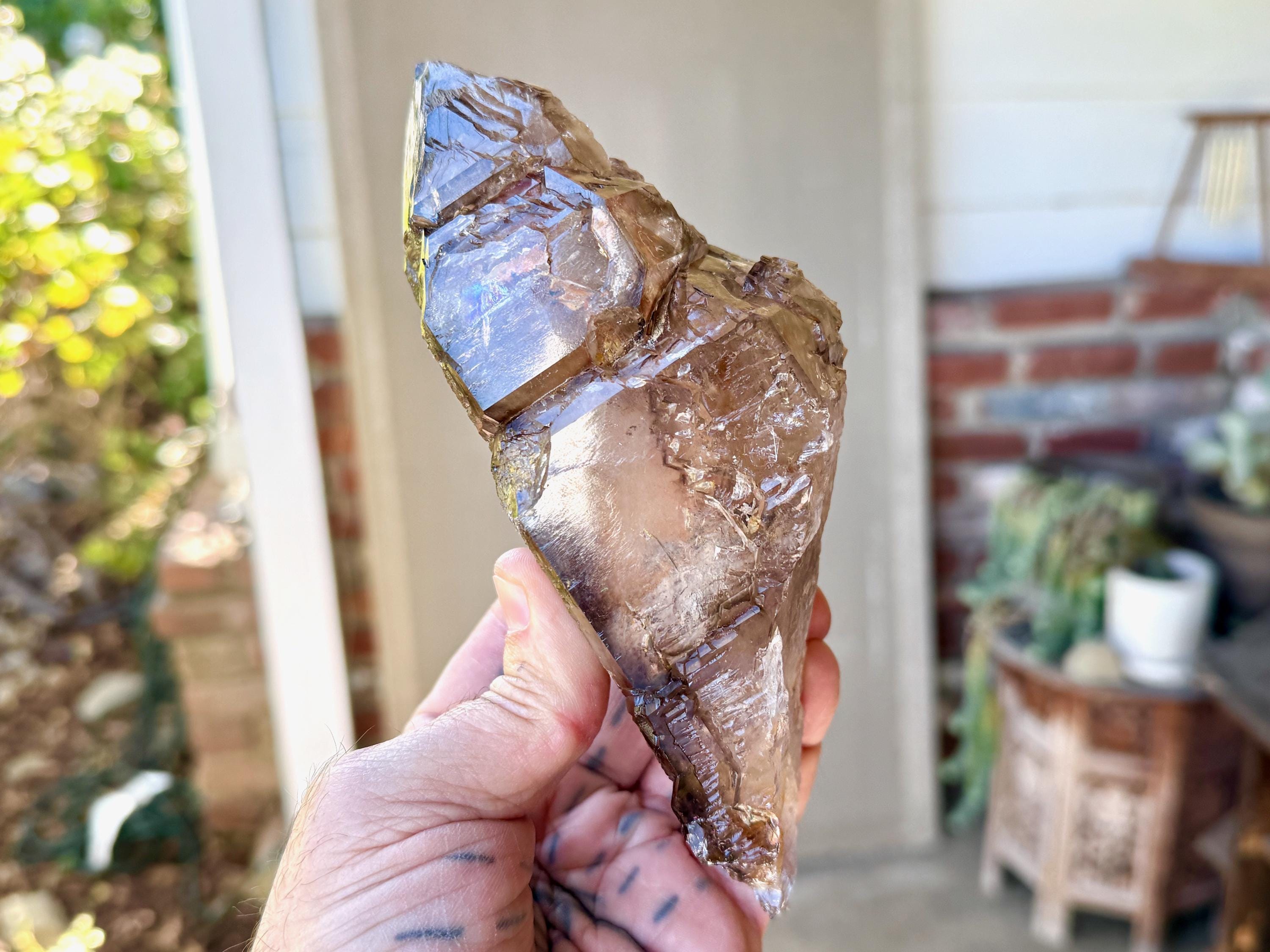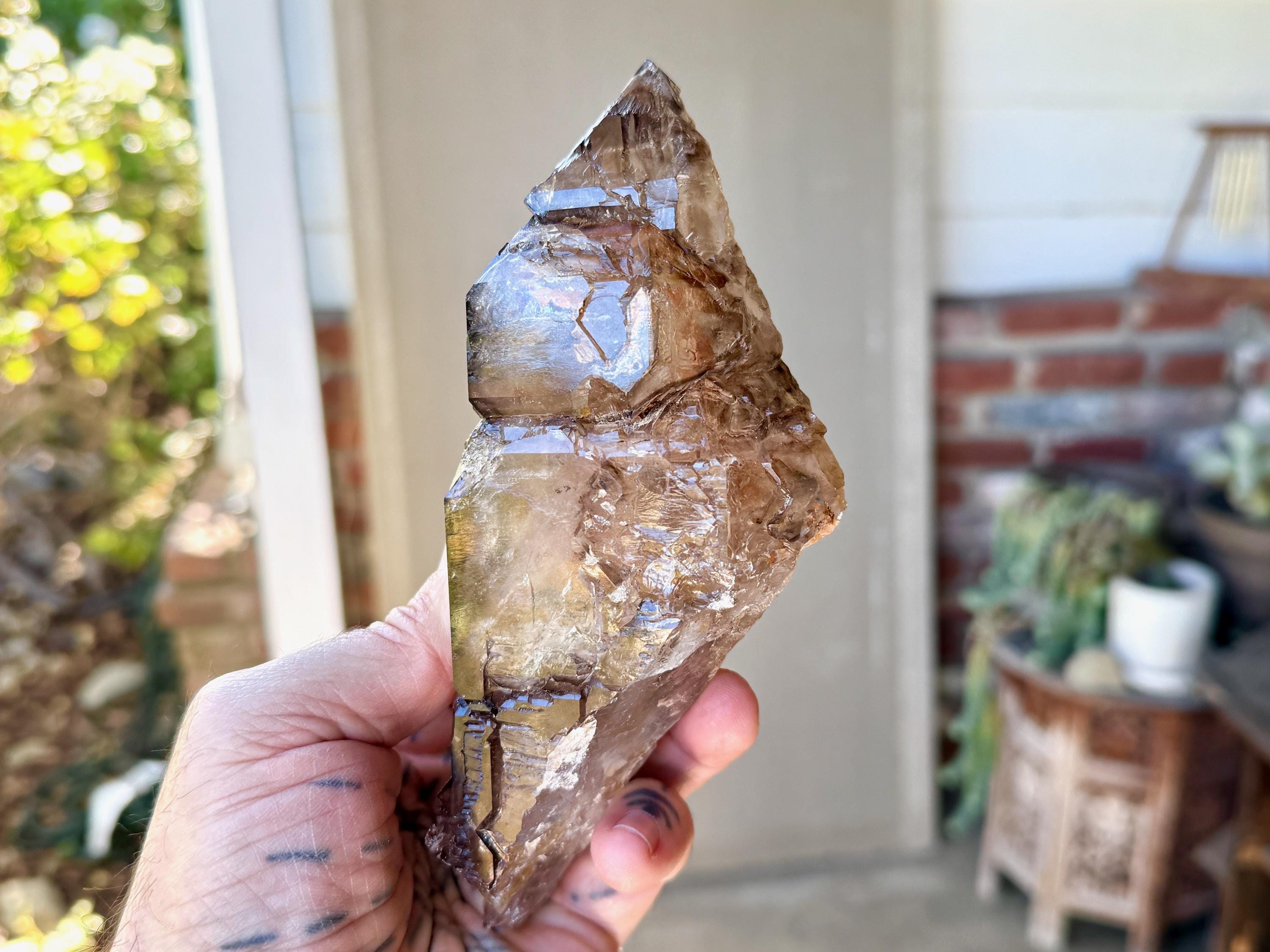 Gorgeous marbling of smoky and golden hues on this lustrous BG3 Citrine in an Elestial formation. The color is rich and robust, with a luster and clarity that allows us to peer inside and view an array of crystalline structures and cloudy inclusions. When backlit, as in Photos 5-7, this crystal lights up brilliantly.