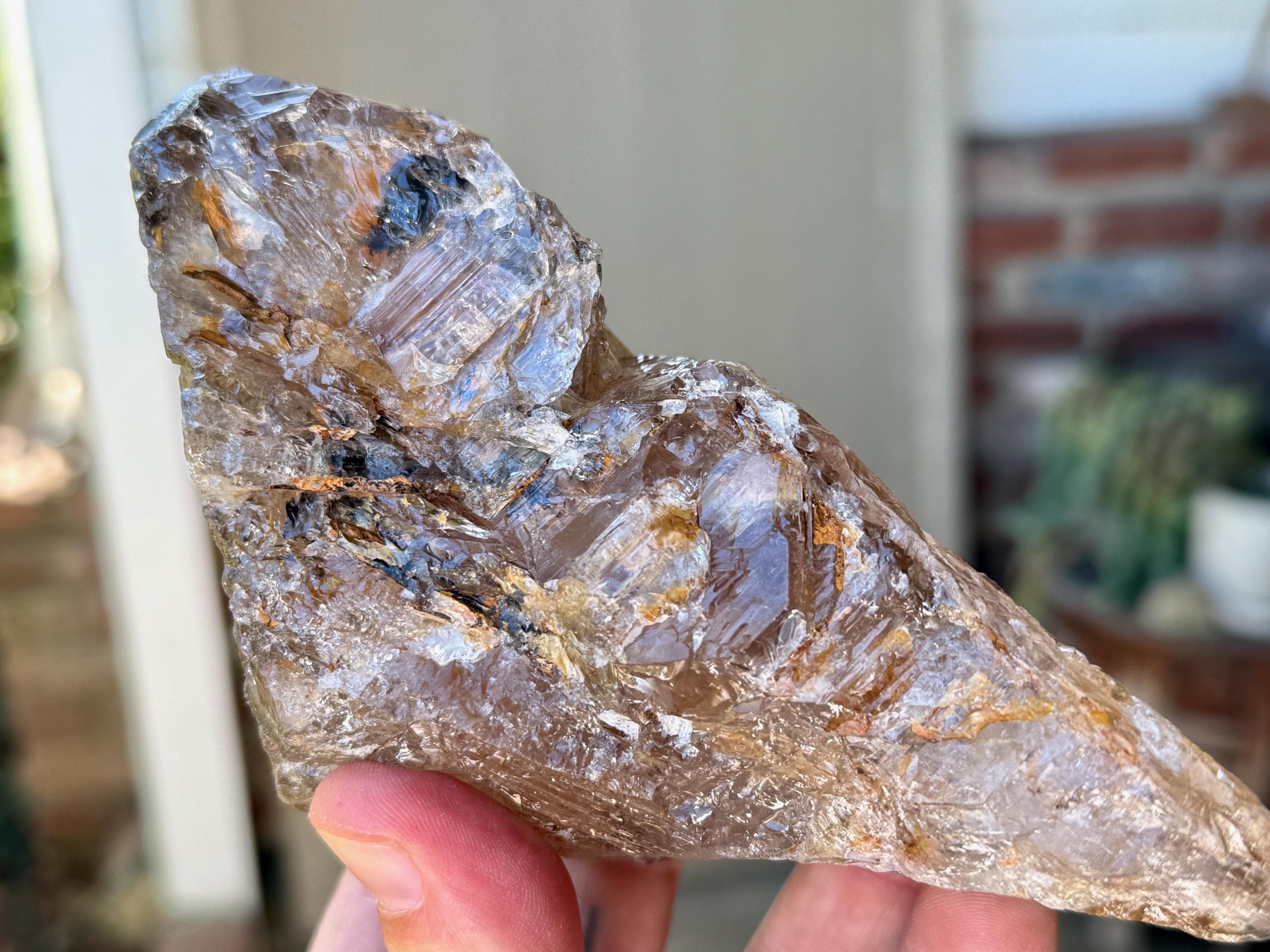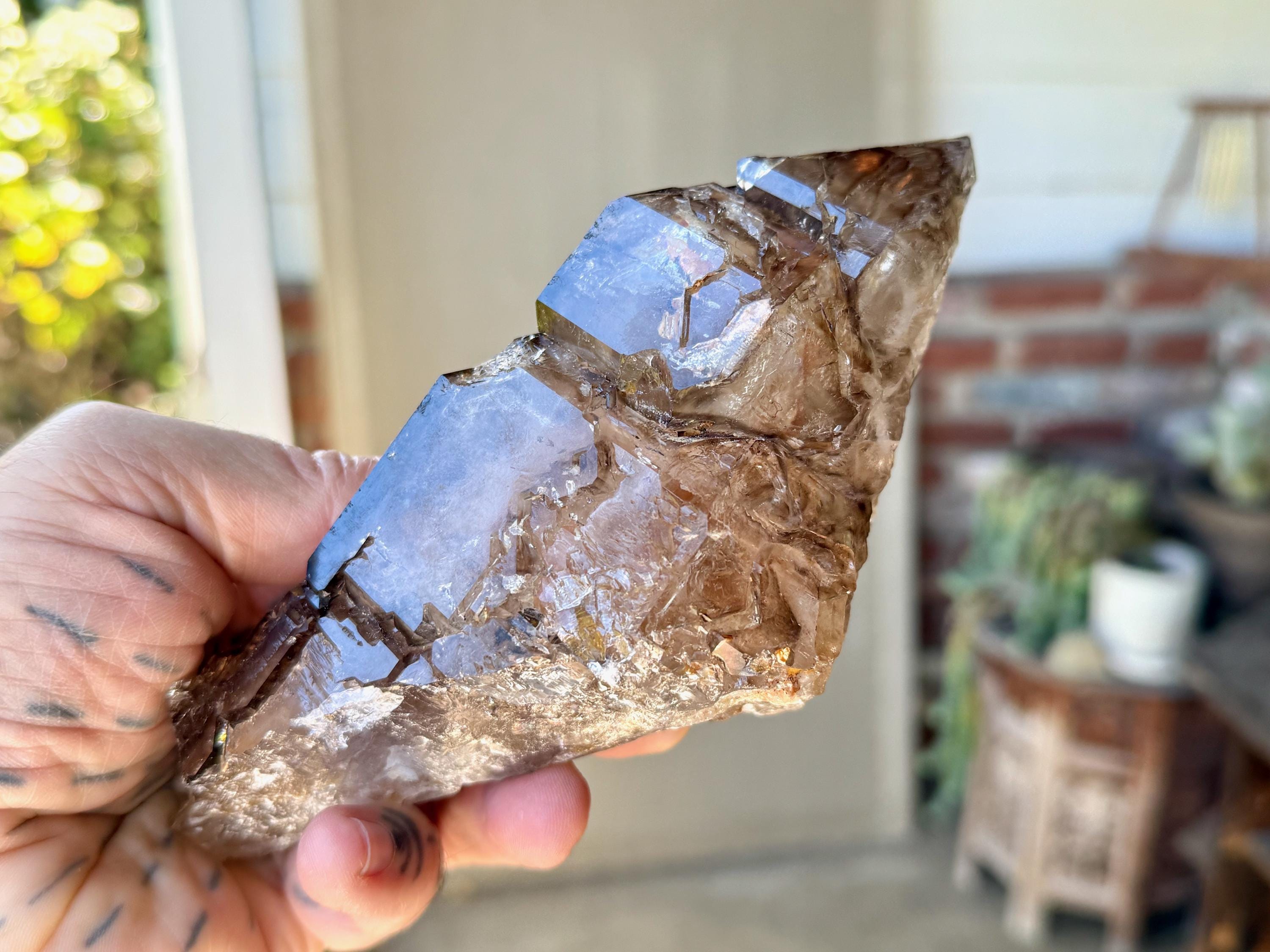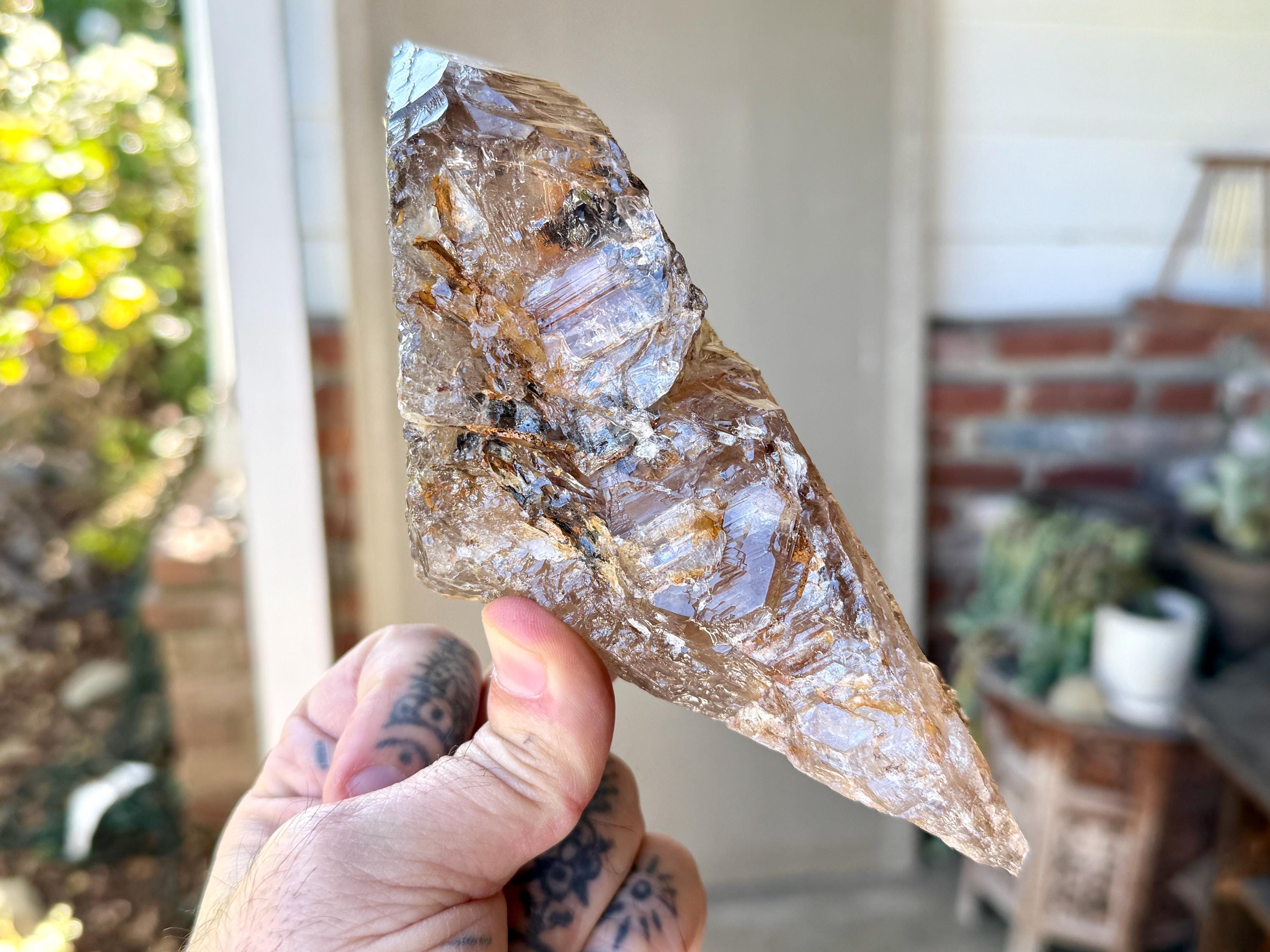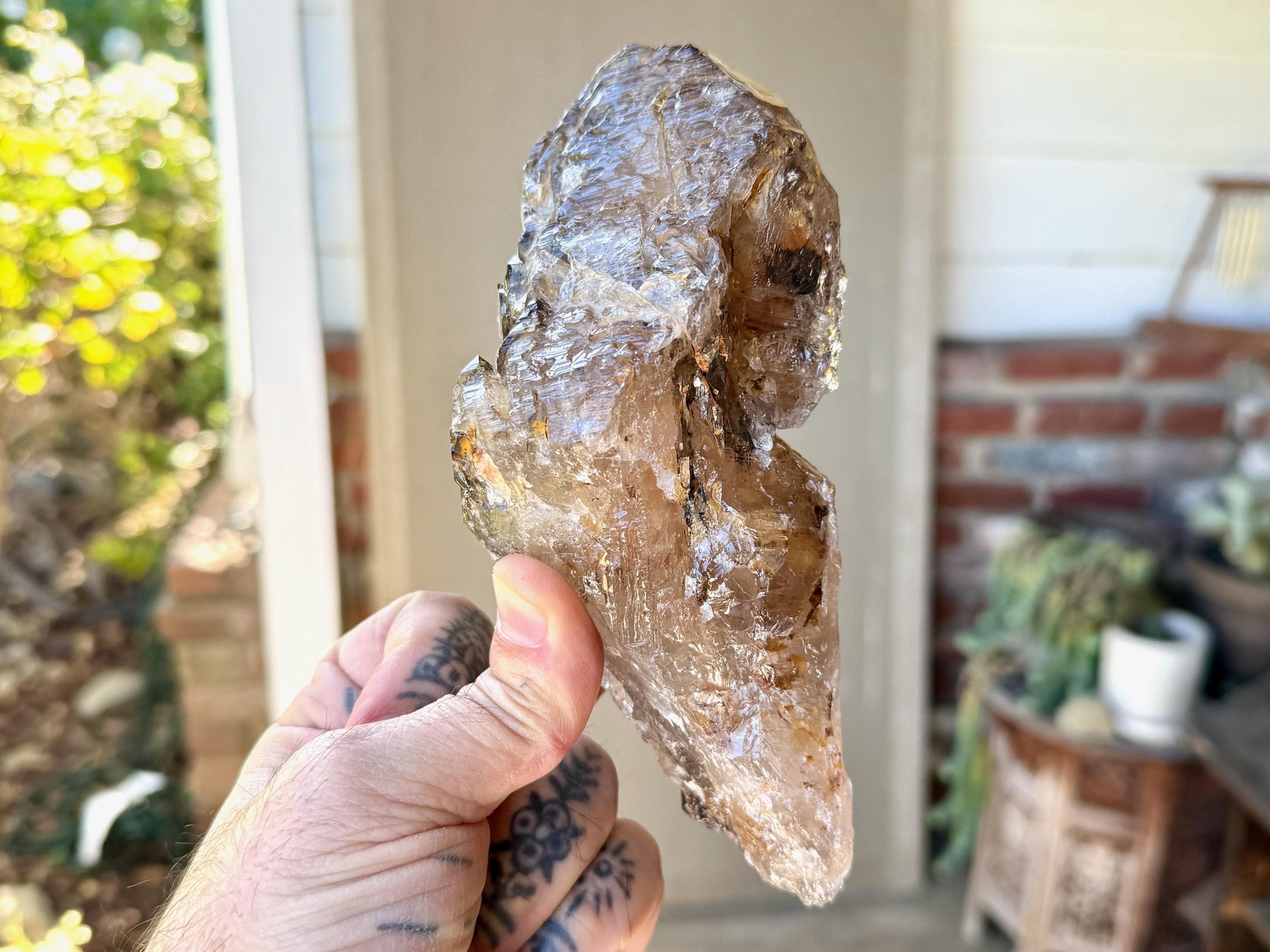 Gorgeous marbling of smoky and golden hues on this lustrous BG3 Citrine in an Elestial formation. The color is rich and robust, with a luster and clarity that allows us to peer inside and view an array of crystalline structures and cloudy inclusions. When backlit, as in Photos 5-7, this crystal lights up brilliantly.