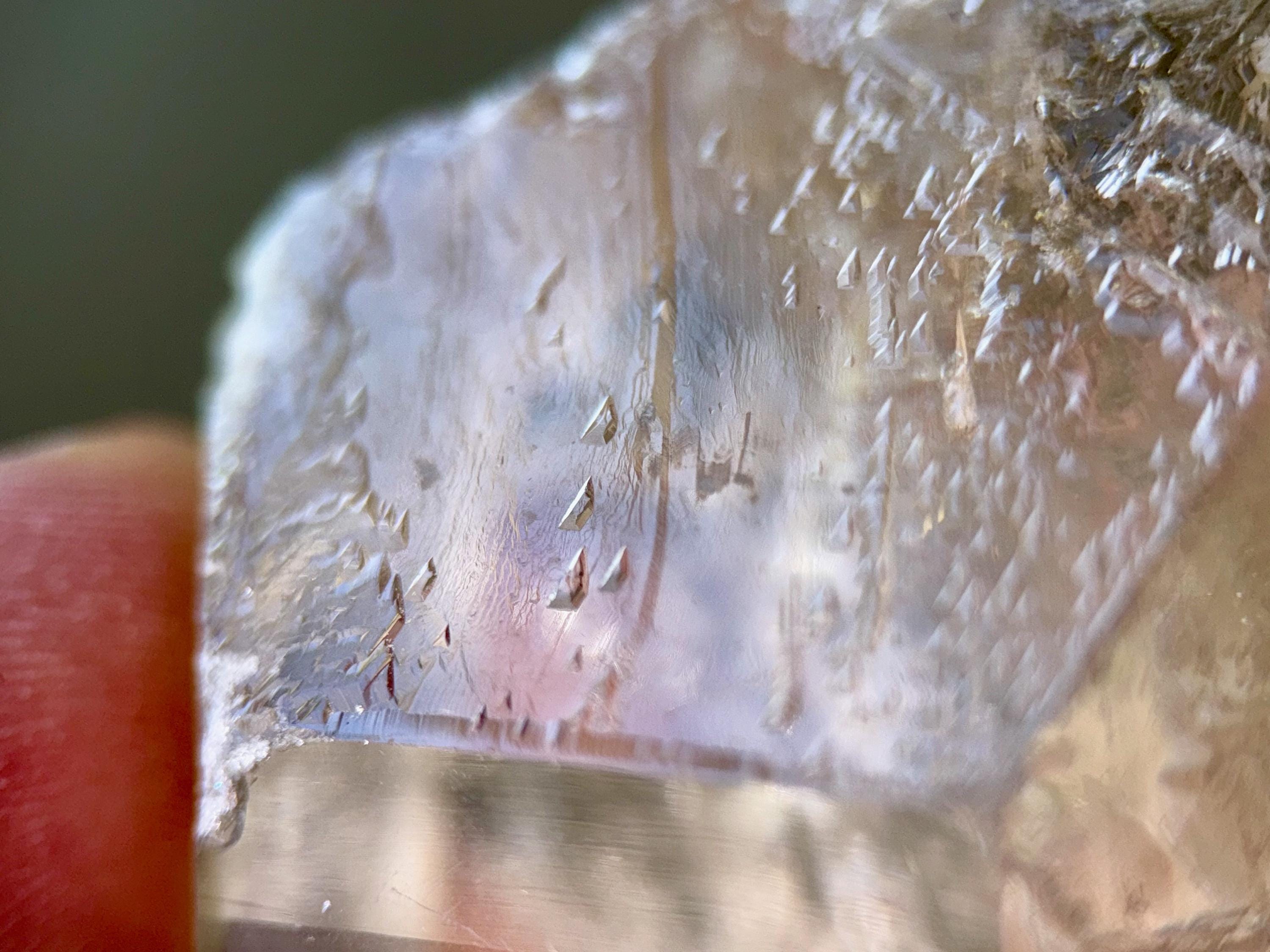 This crystal possesses a broad main facet that depicts a multitude of etched impressions, including a multitude of tiny "raised" Record Keepers. These are very tiny and best appreciated with a jeweler's loupe or magnifying glass. We've included several photos taken with a macro lens to show them off in detail (Photos 3-5).