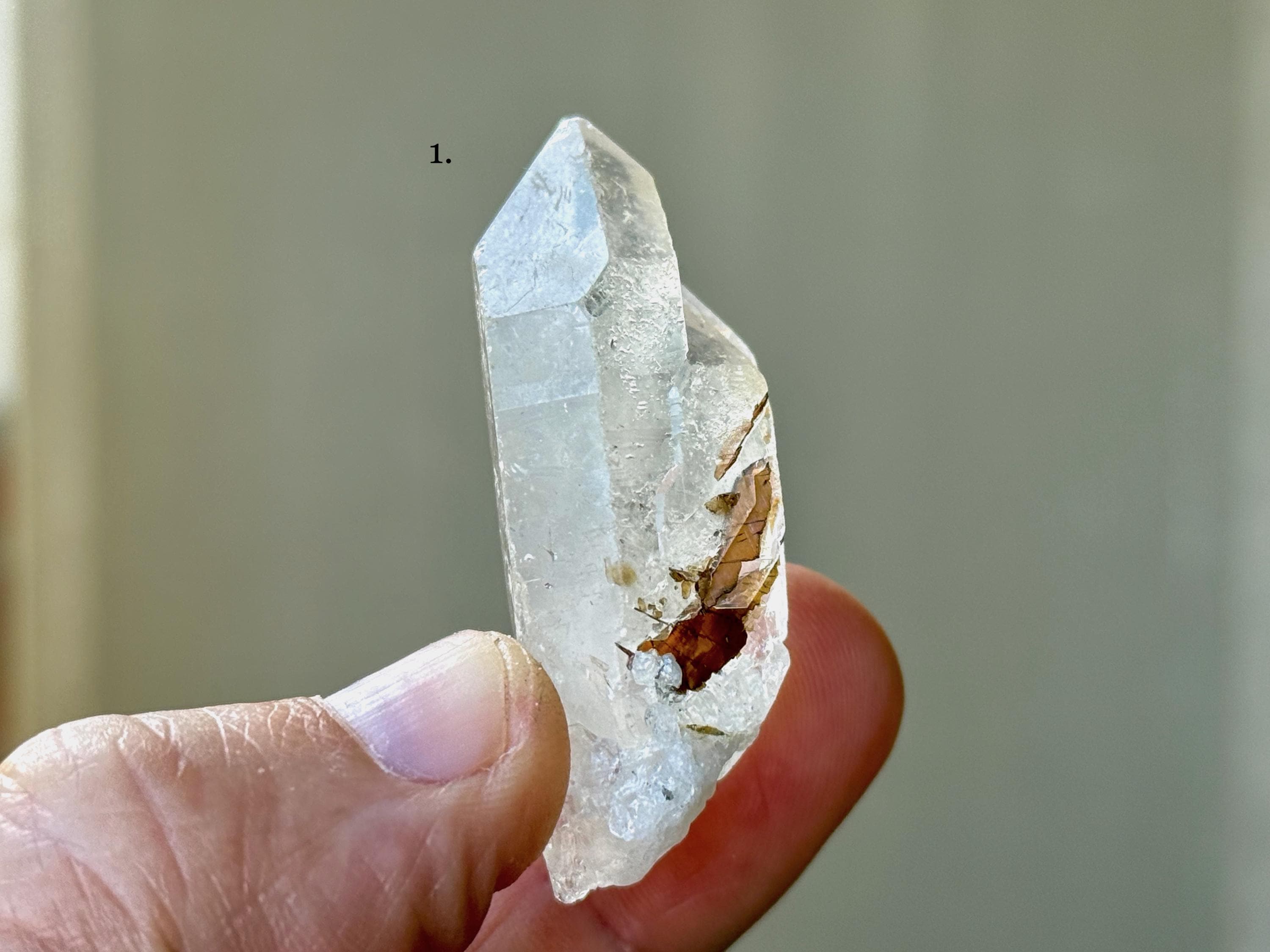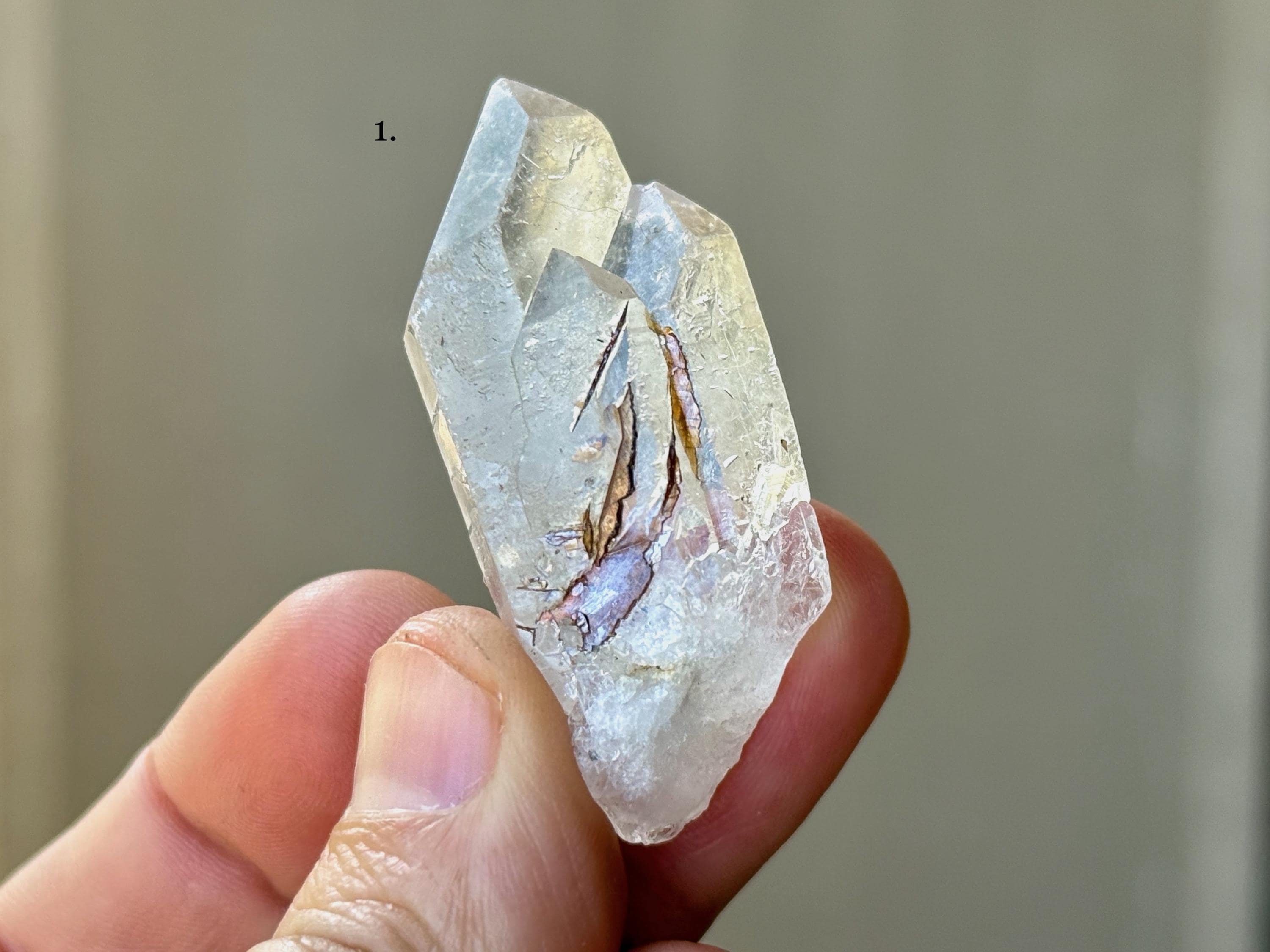 Excellent clarity and beautiful inclusions of metallic-copper Brookite embedded in each of these Quartz crystals!