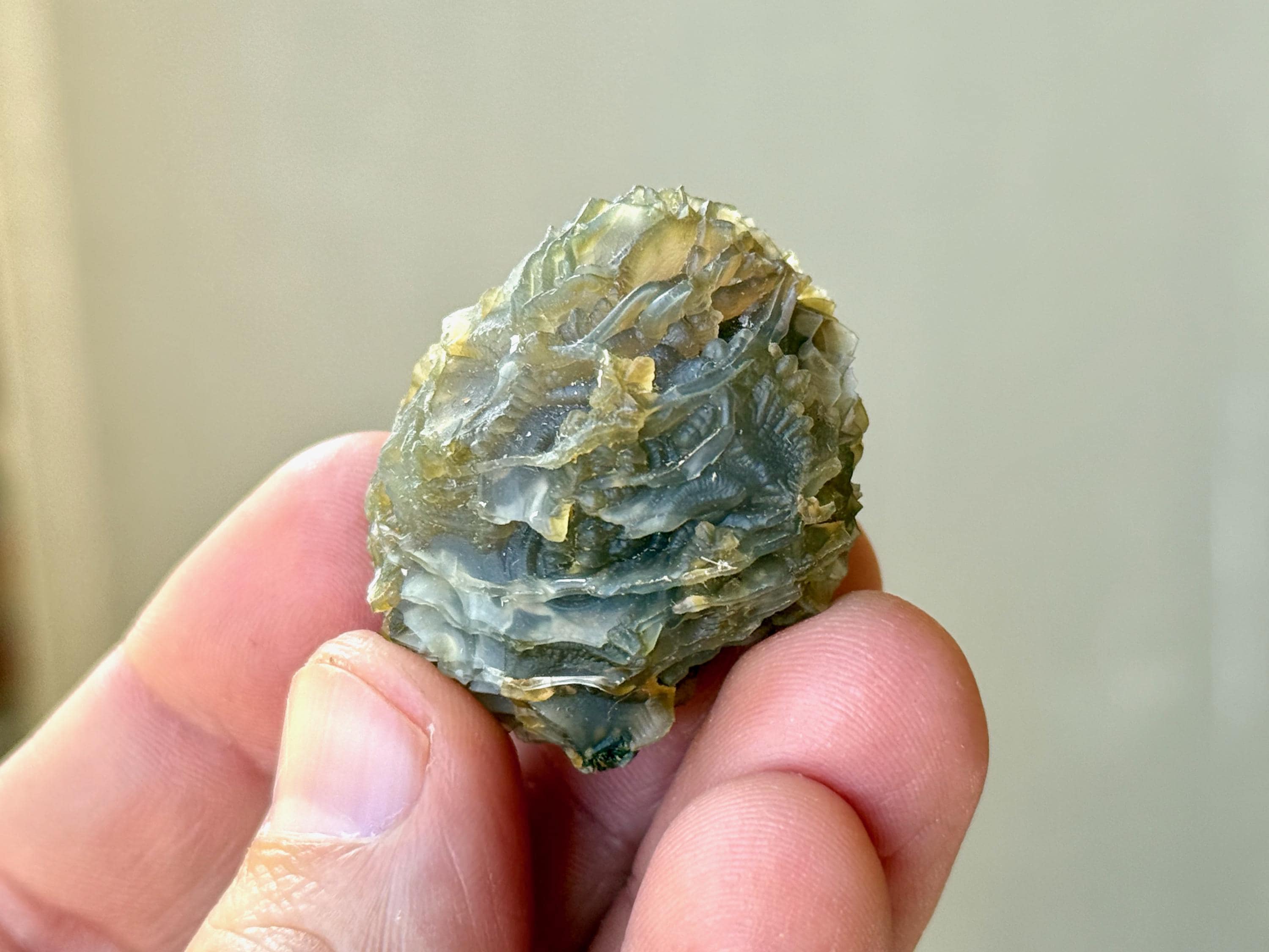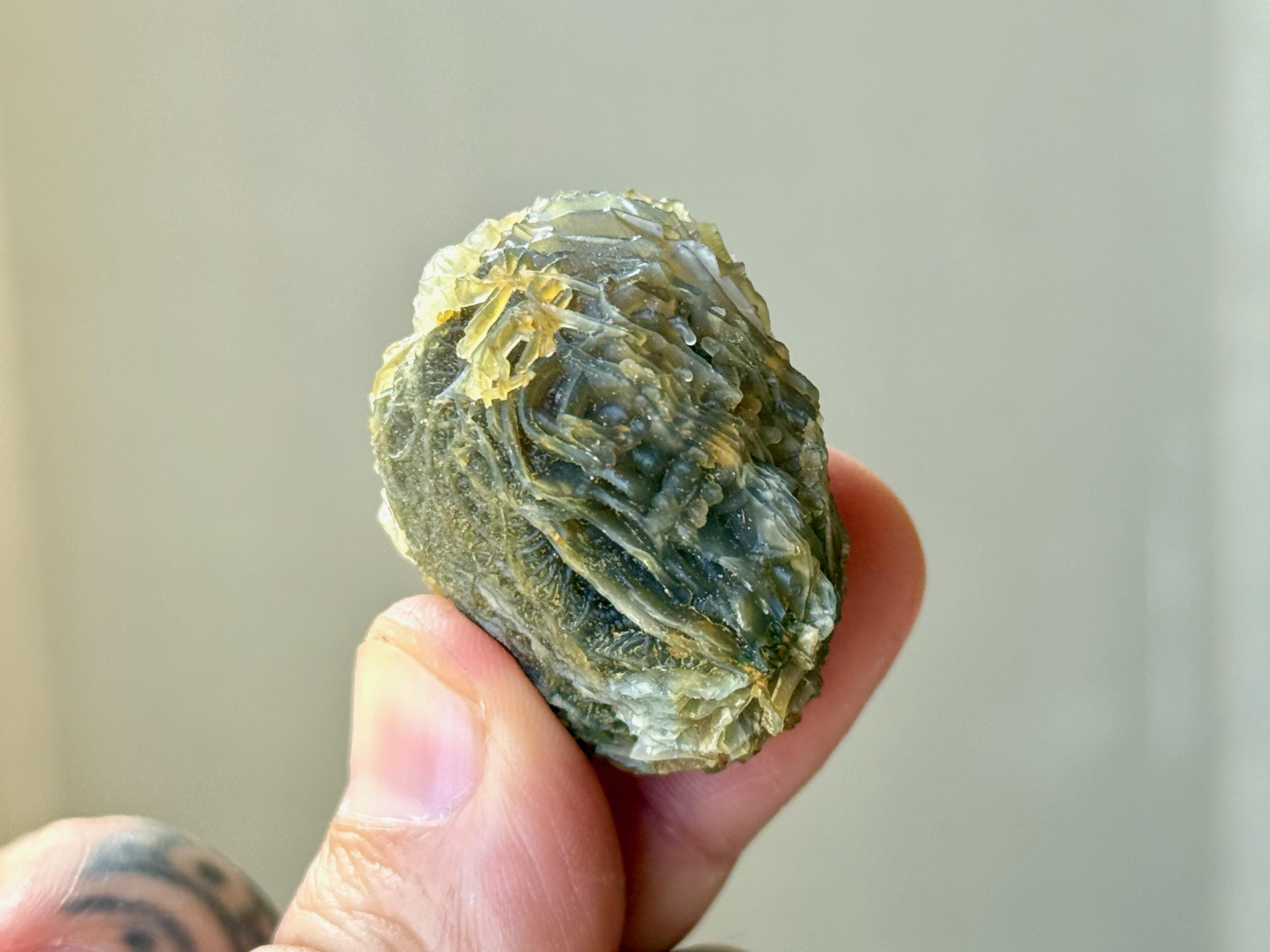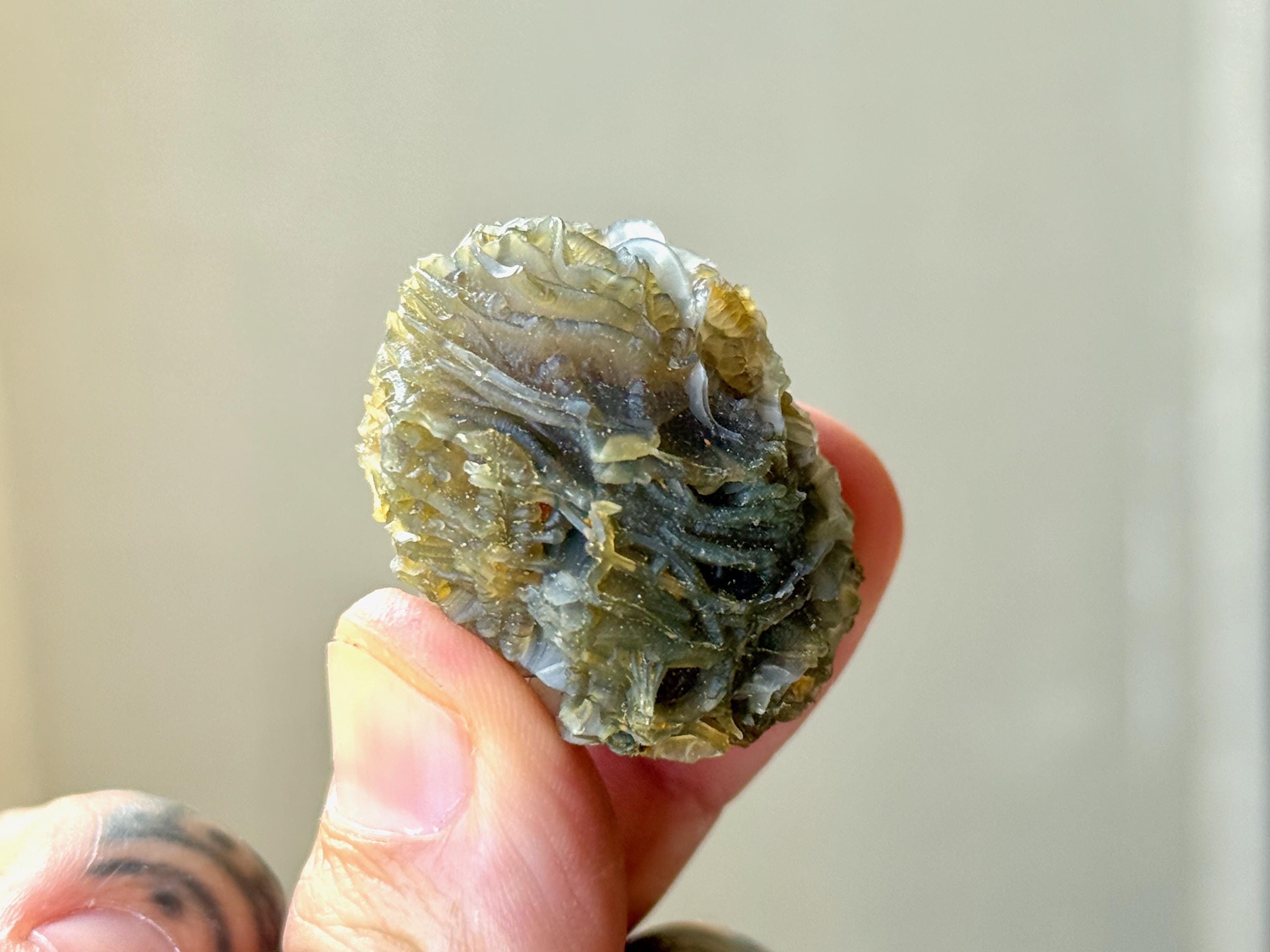 A unique waxy complexion to this Black Mountain Gobi Agate, with layers upon layers to its formation. In natural light, this stone has a very dark greenish-gray complexion with a slight golden tinge. When backlit, this stone lights up brilliantly! (Photos 3-5). A very unique and beautiful stone from this special collection.