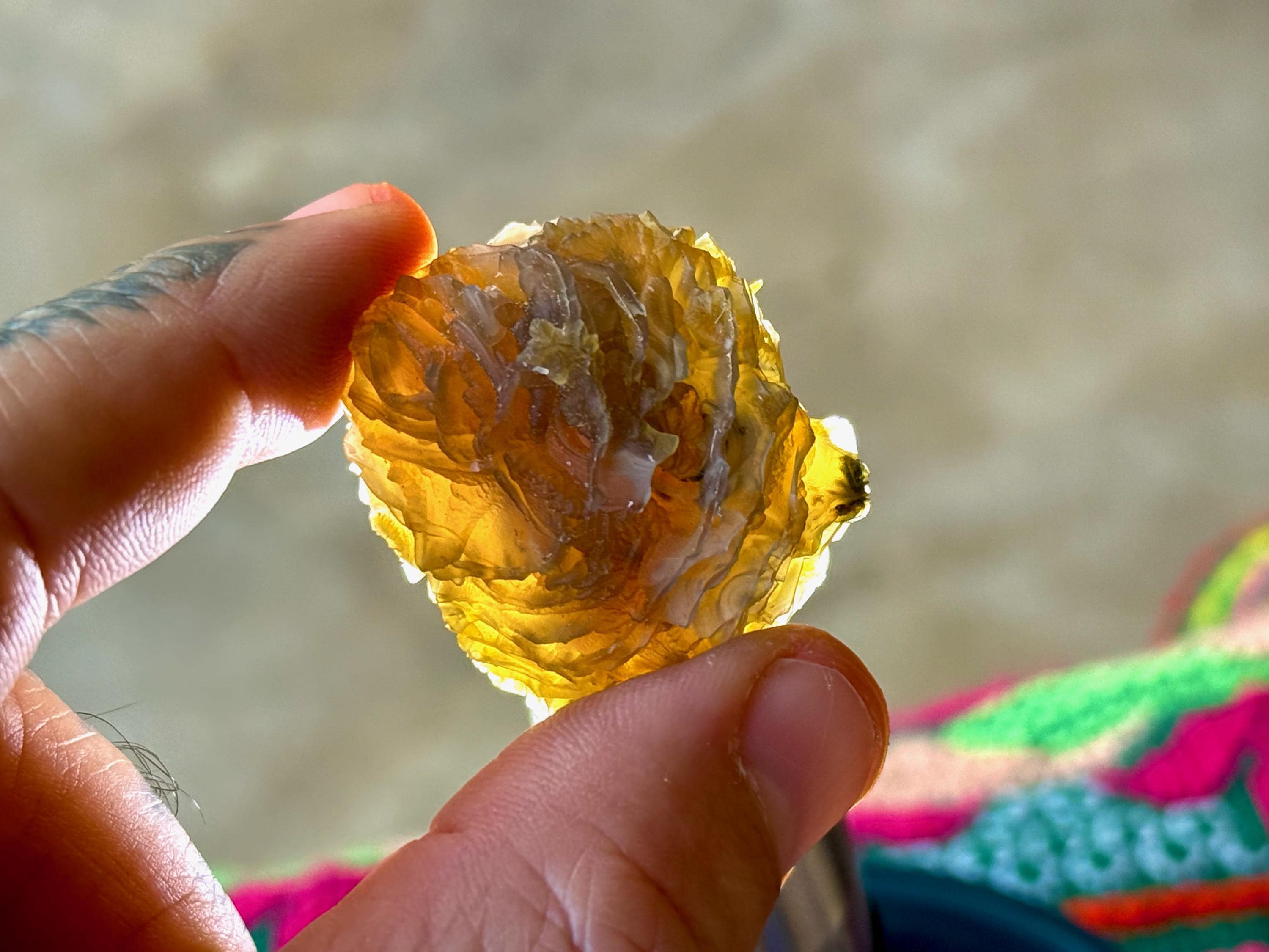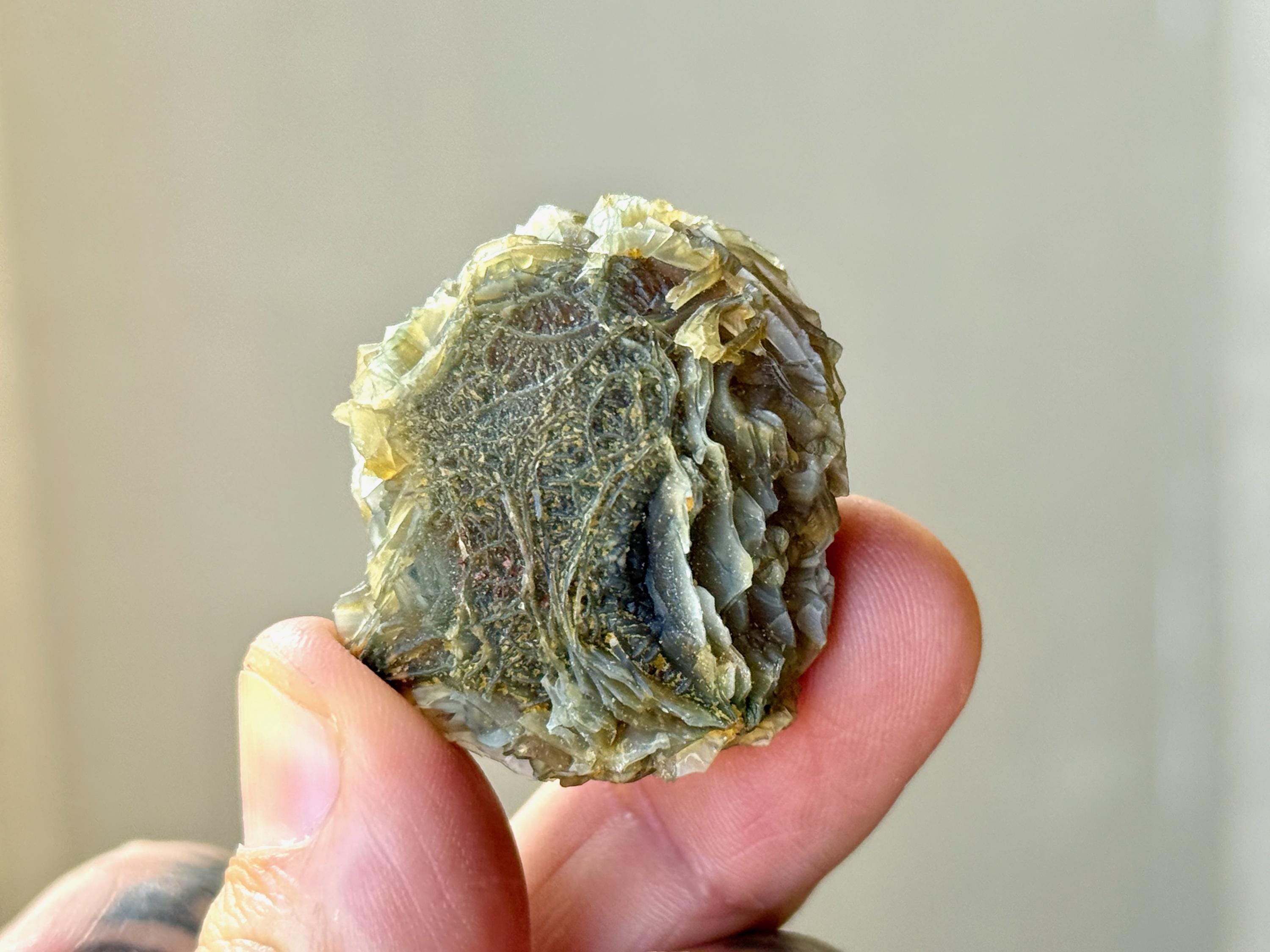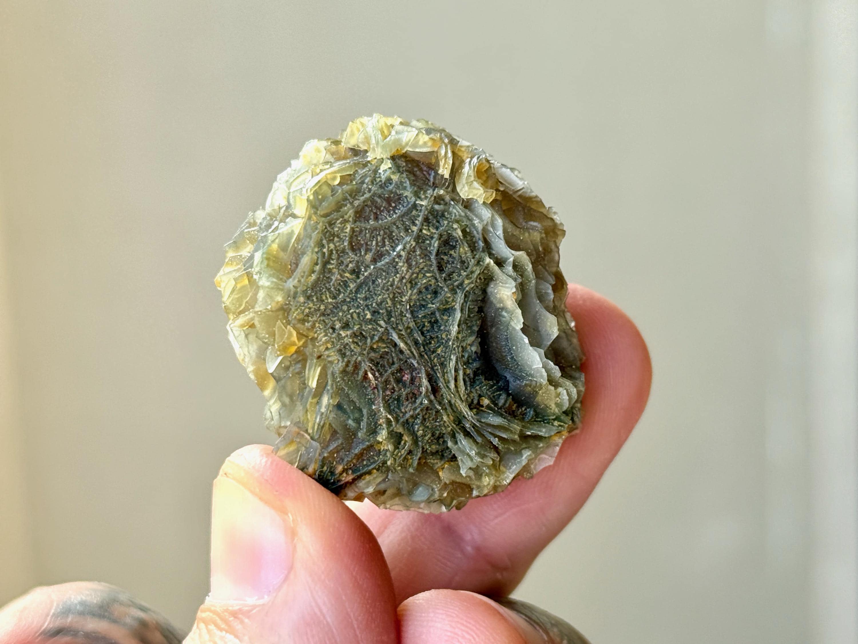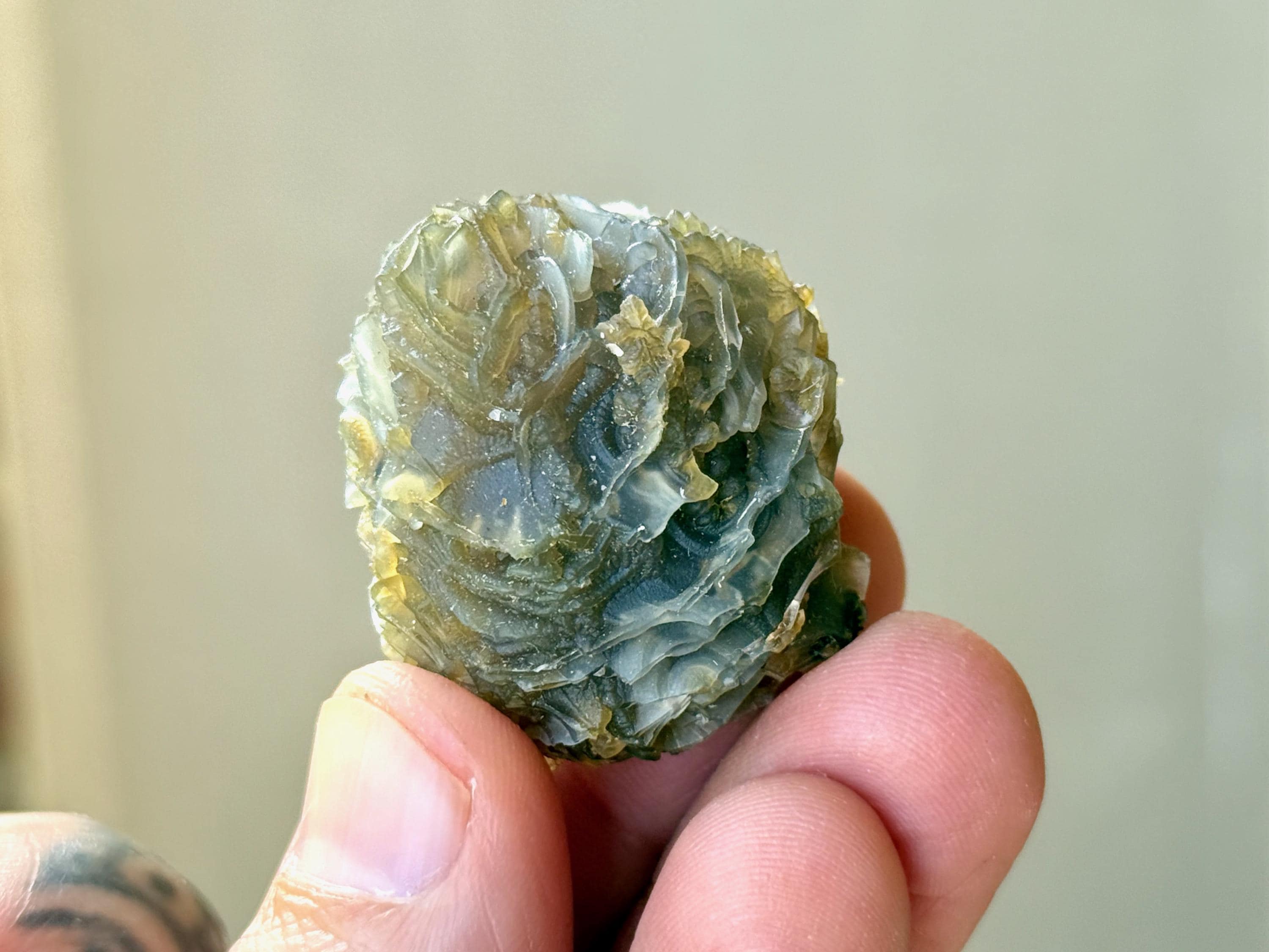 A unique waxy complexion to this Black Mountain Gobi Agate, with layers upon layers to its formation. In natural light, this stone has a very dark greenish-gray complexion with a slight golden tinge. When backlit, this stone lights up brilliantly! (Photos 3-5). A very unique and beautiful stone from this special collection.