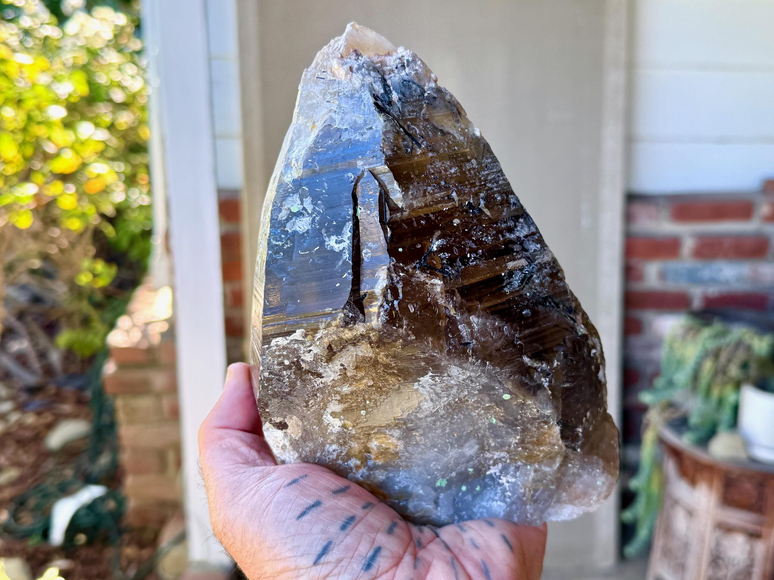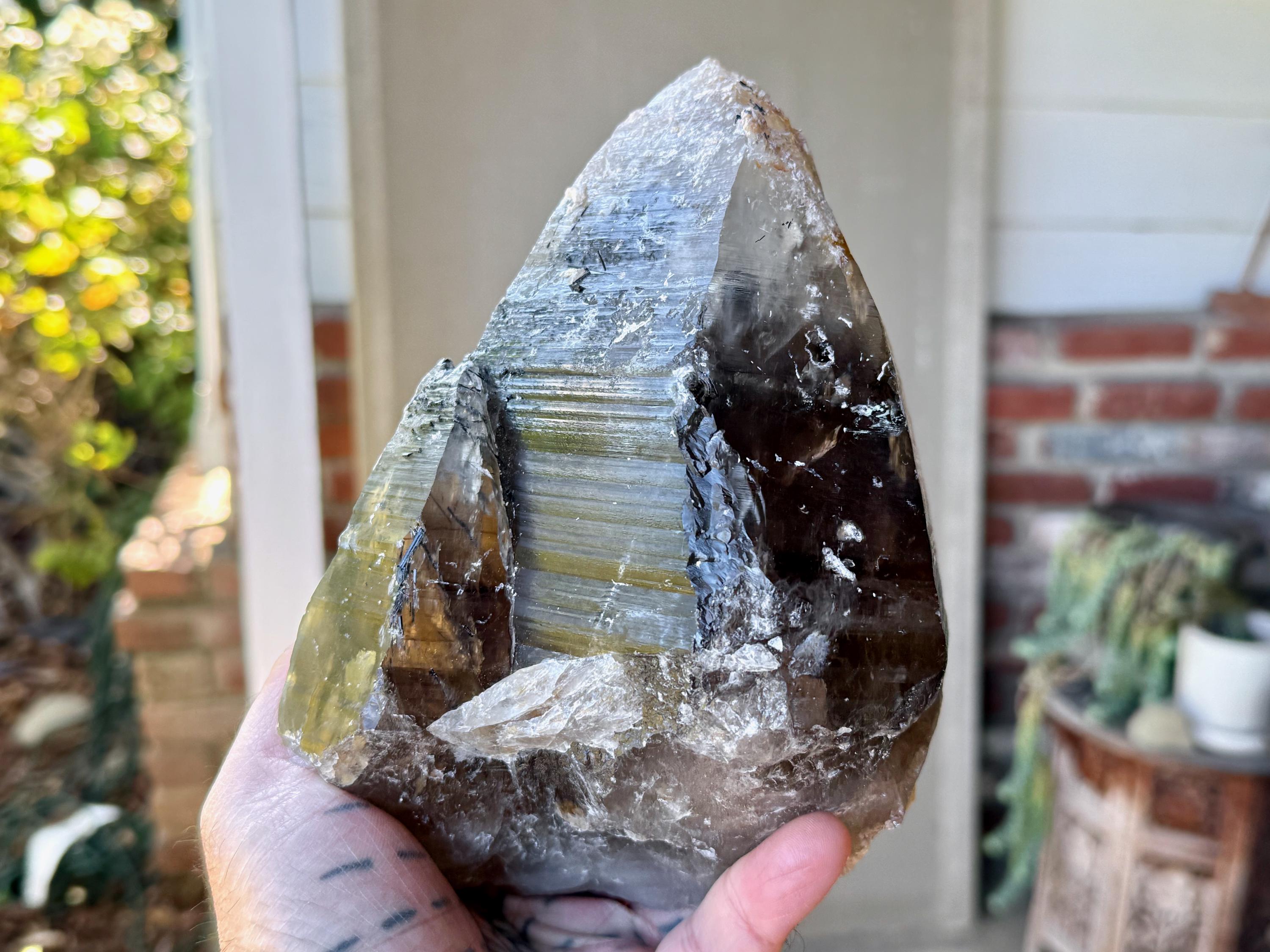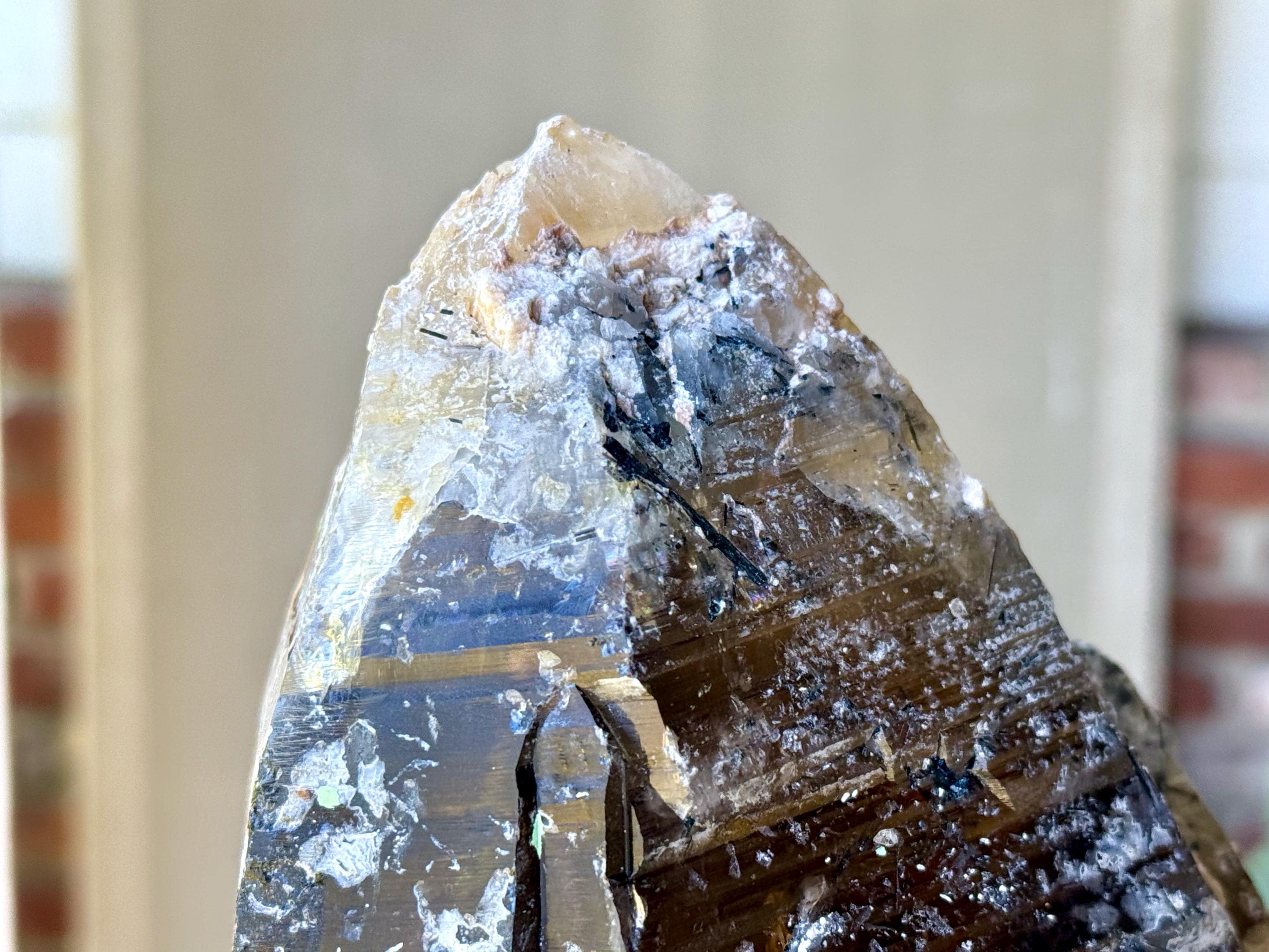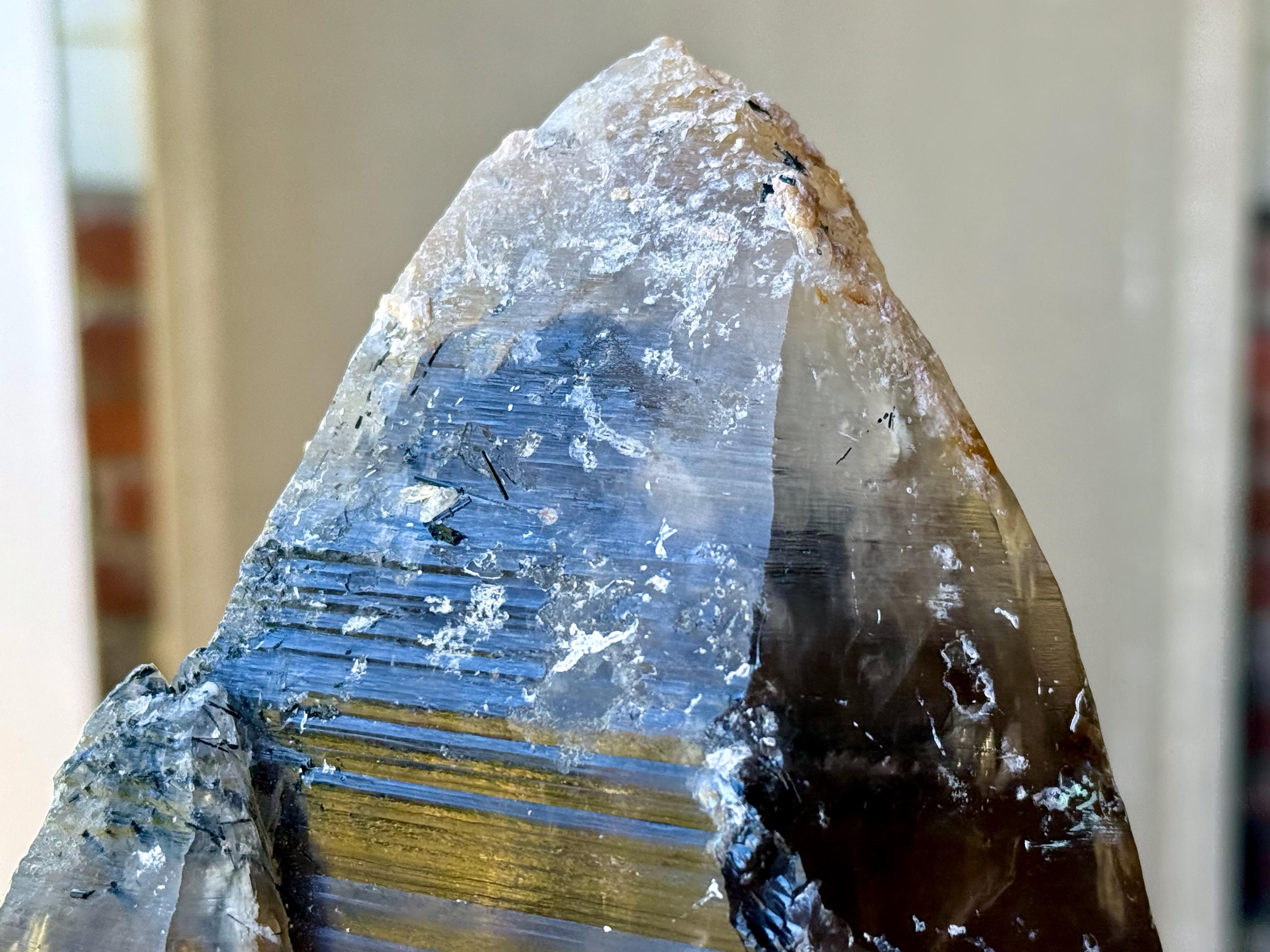 This crystal is highly lustrous and possesses a rich smoky hue. However, when the sun catches it just right or especially when backlit, we can see the golden yellow hues of Citrine come through (Photos 1, 3-4). We also can see an ample inclusion of Black Tourmaline "needles" embedded throughout this piece, particularly concentrated in the top (Photo 6).