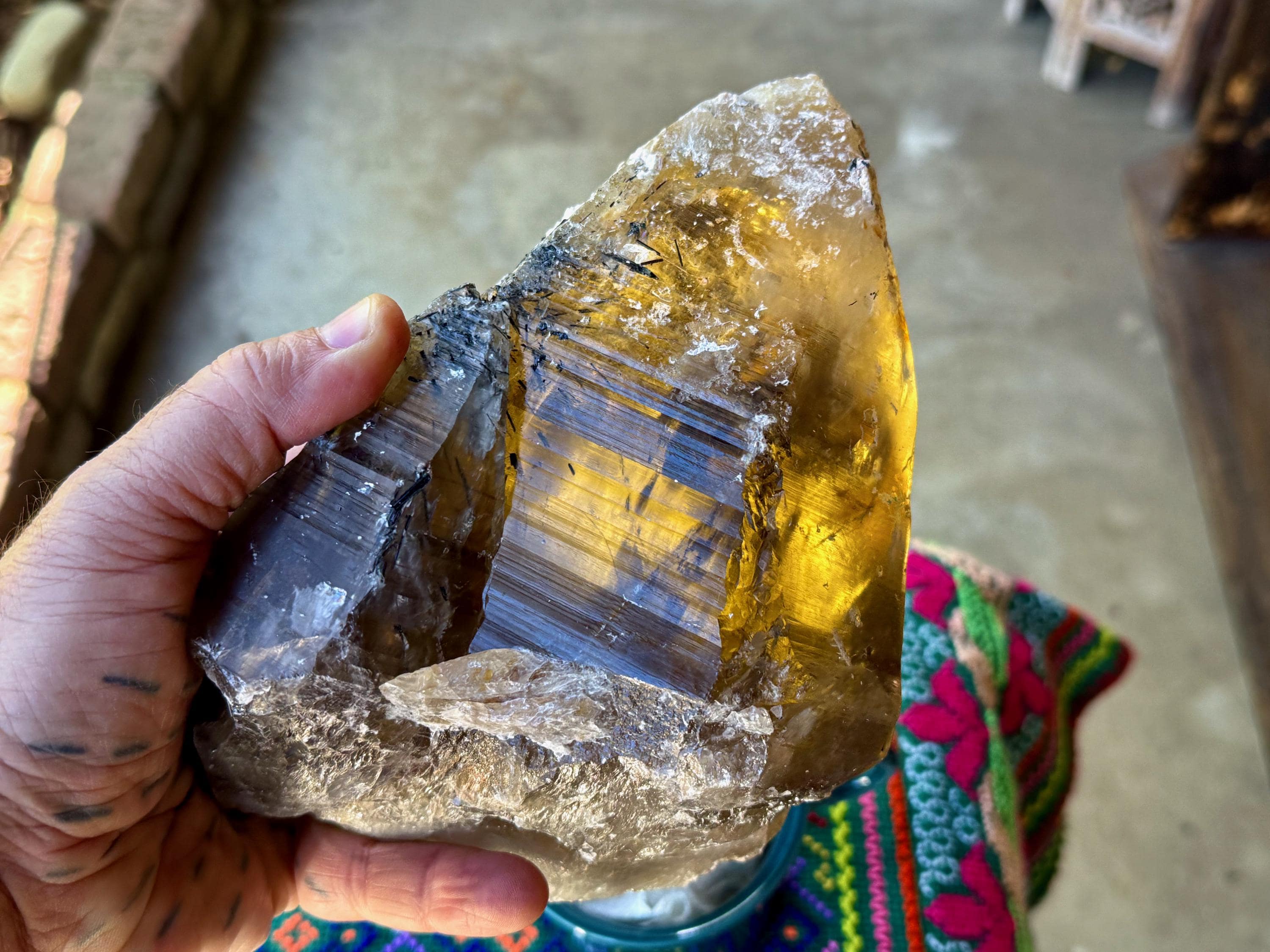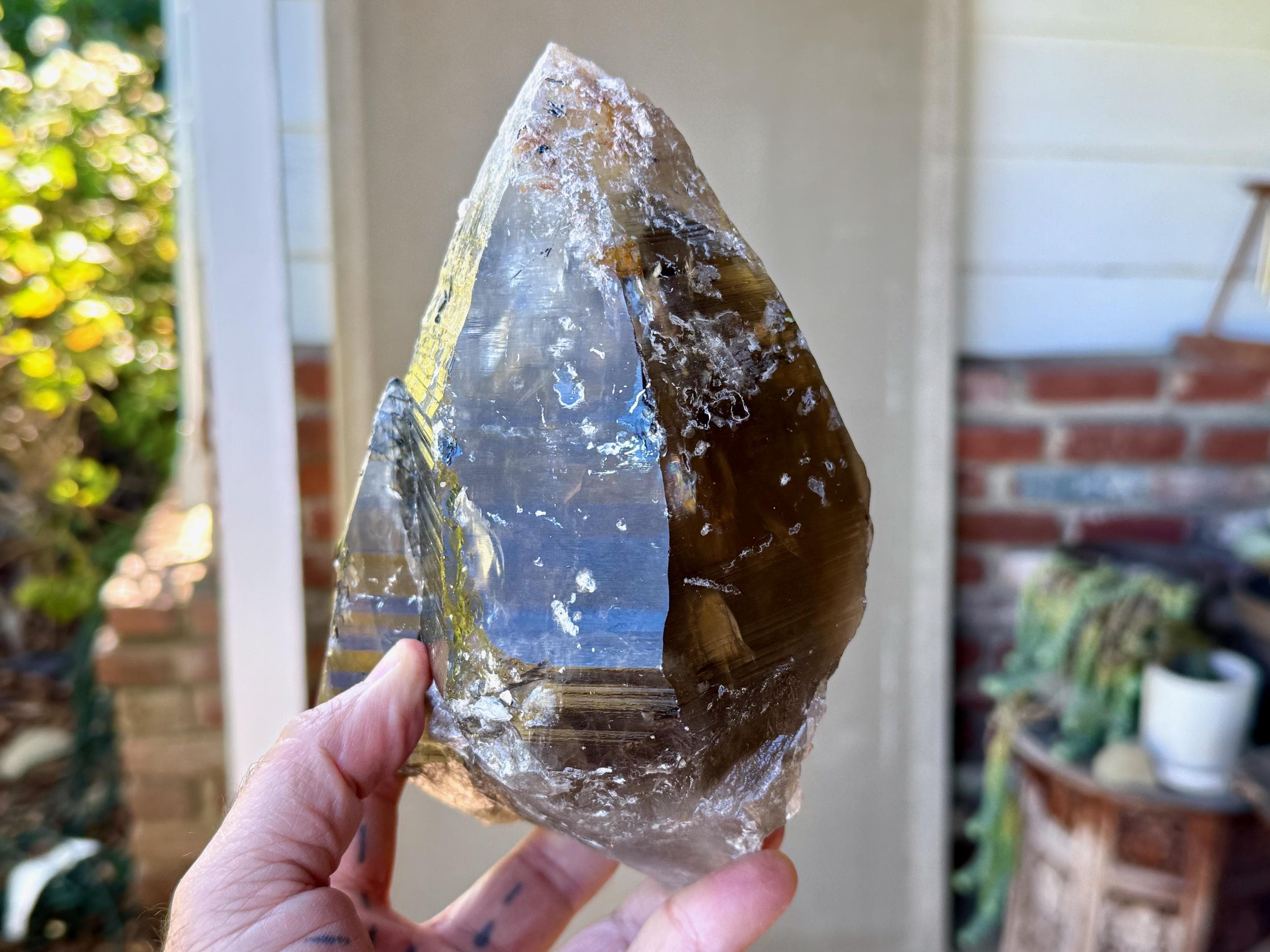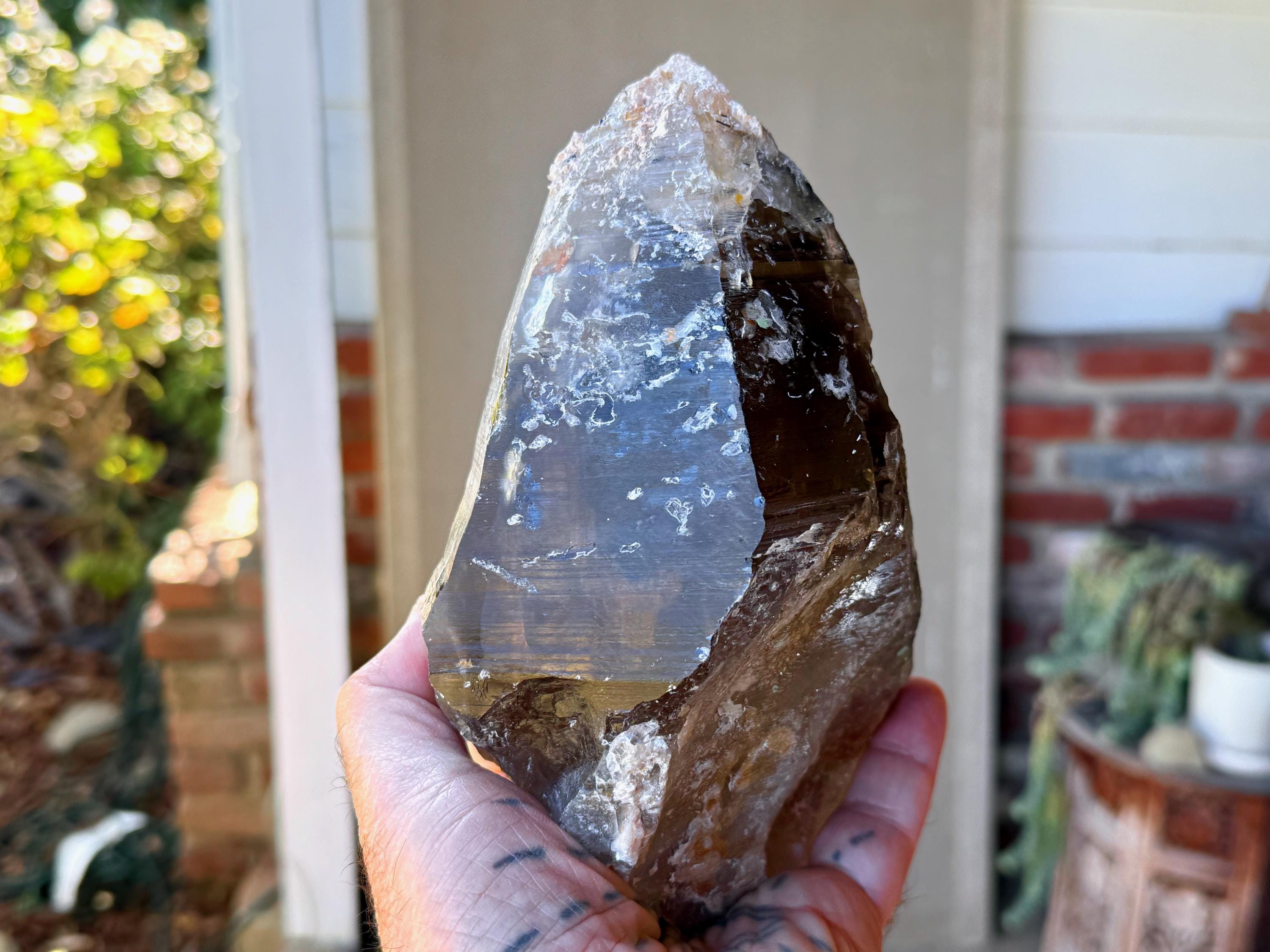 This crystal is highly lustrous and possesses a rich smoky hue. However, when the sun catches it just right or especially when backlit, we can see the golden yellow hues of Citrine come through (Photos 1, 3-4). We also can see an ample inclusion of Black Tourmaline "needles" embedded throughout this piece, particularly concentrated in the top (Photo 6).