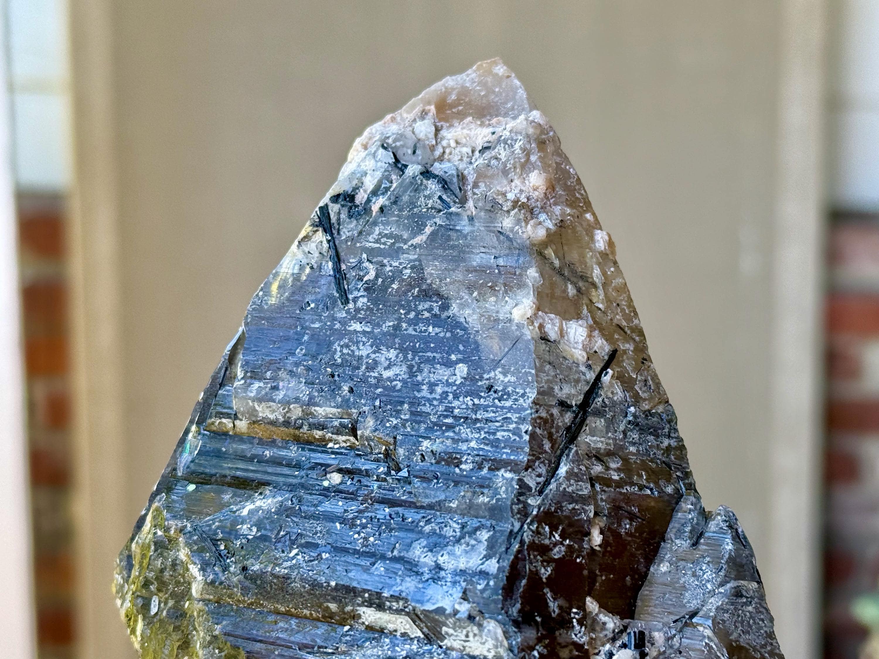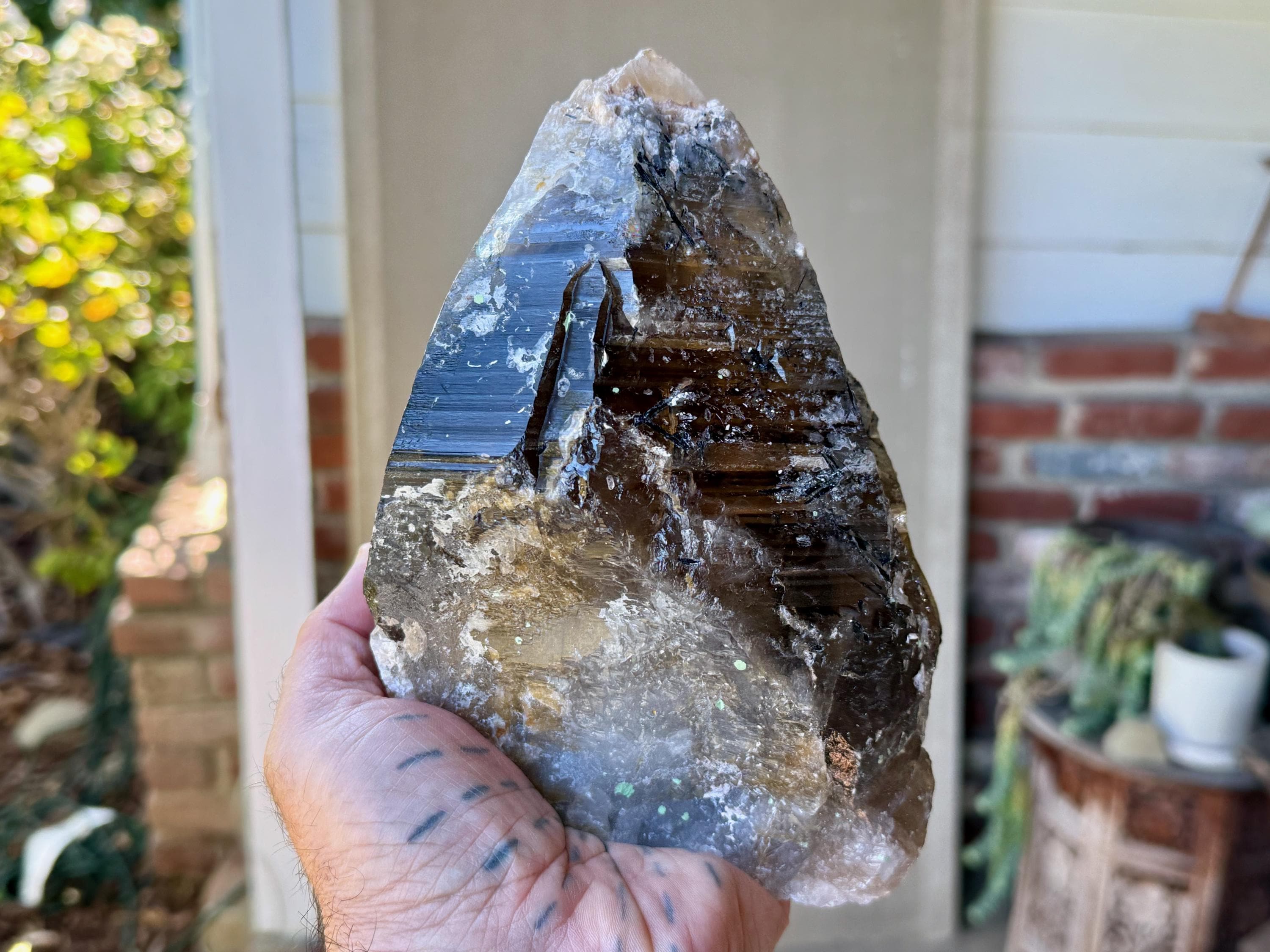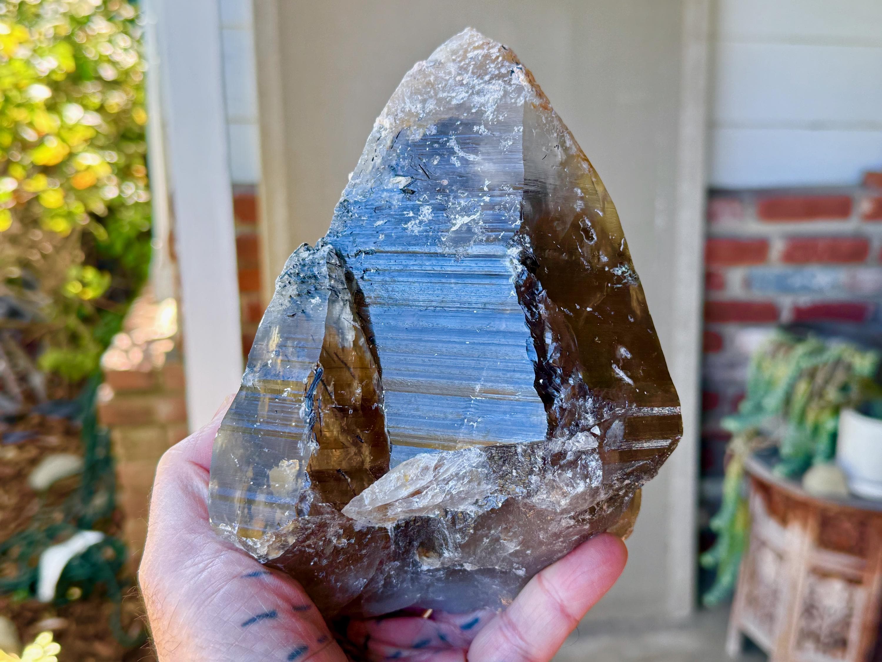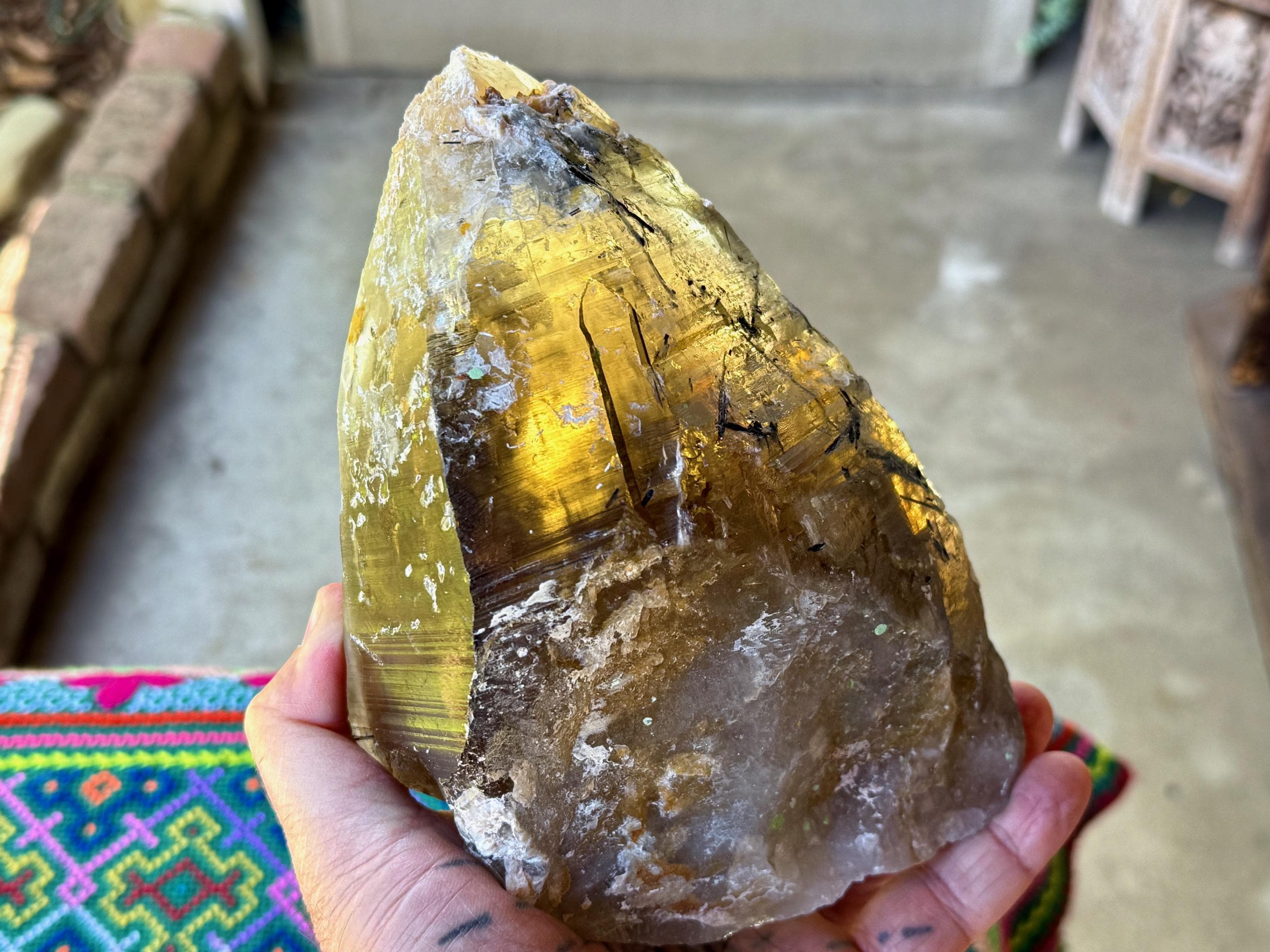 This crystal is highly lustrous and possesses a rich smoky hue. However, when the sun catches it just right or especially when backlit, we can see the golden yellow hues of Citrine come through (Photos 1, 3-4). We also can see an ample inclusion of Black Tourmaline "needles" embedded throughout this piece, particularly concentrated in the top (Photo 6).