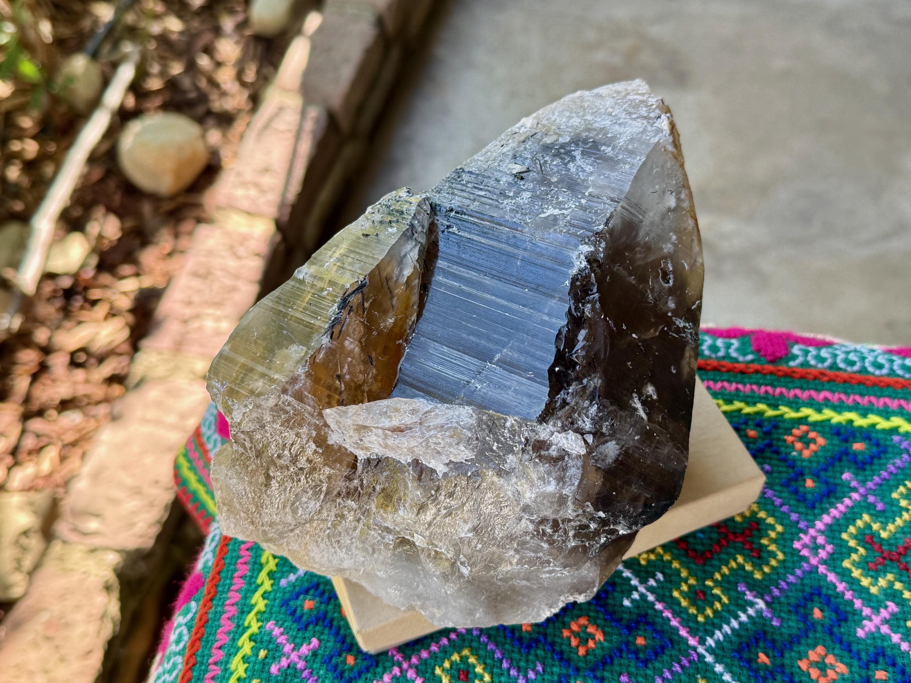 An absolute powerhouse! This is a giant Smoky Citrine Quartz crystal weighing close to 5.5 Pounds (2.4 Kilo) in a magnificent, tapered, Tessin Habit formation, with deeply defined Lemurian striations on its sides.