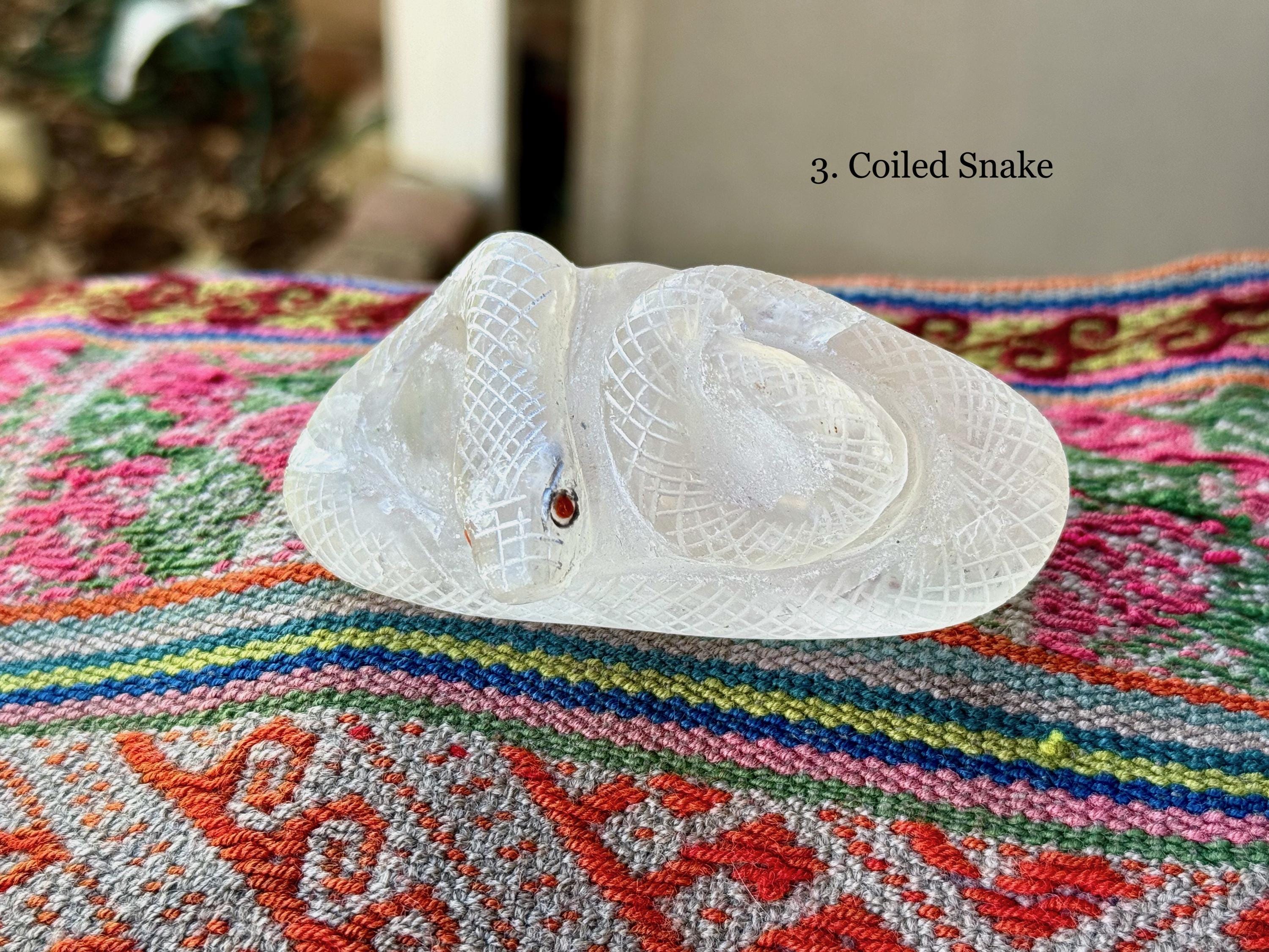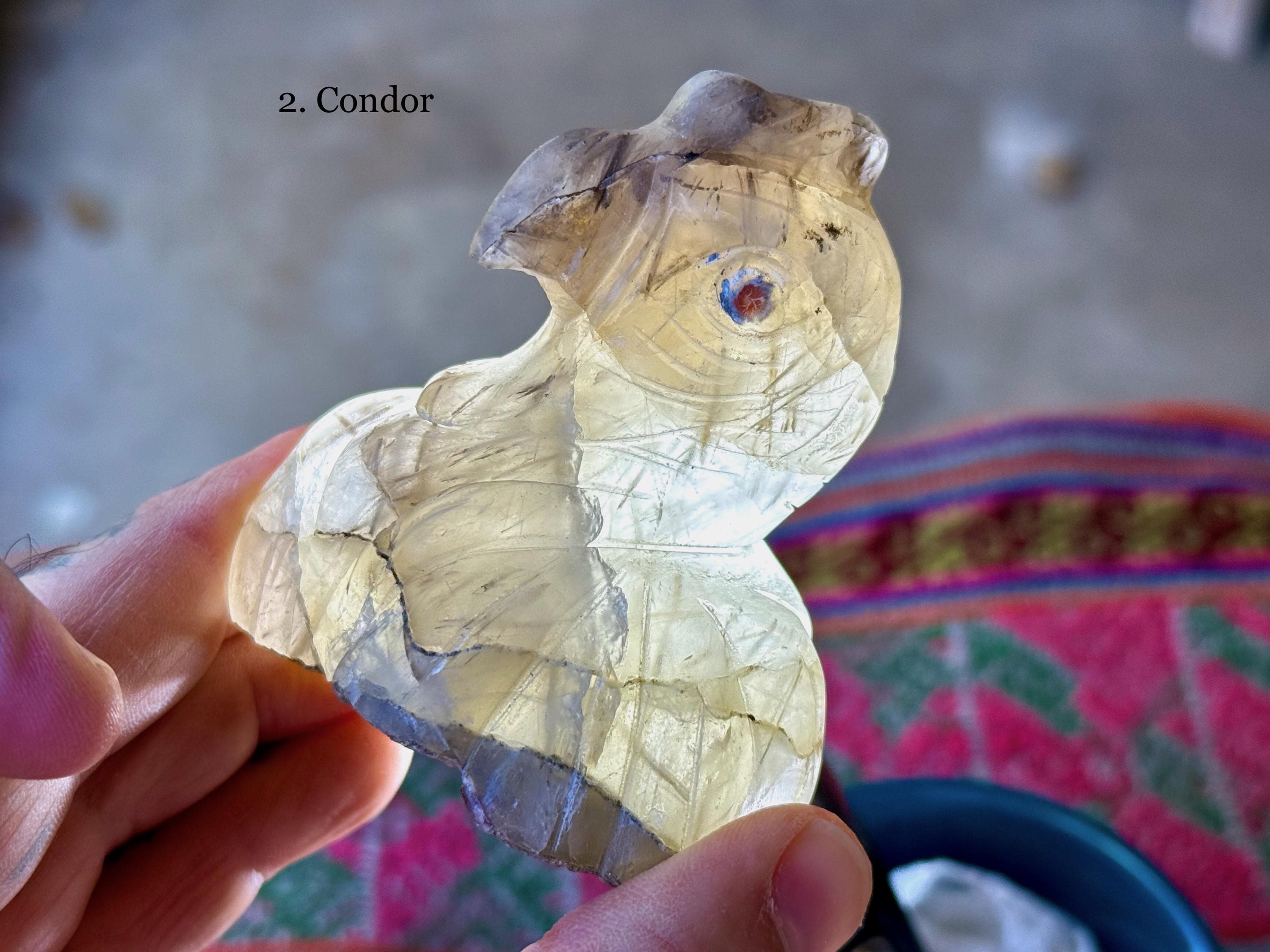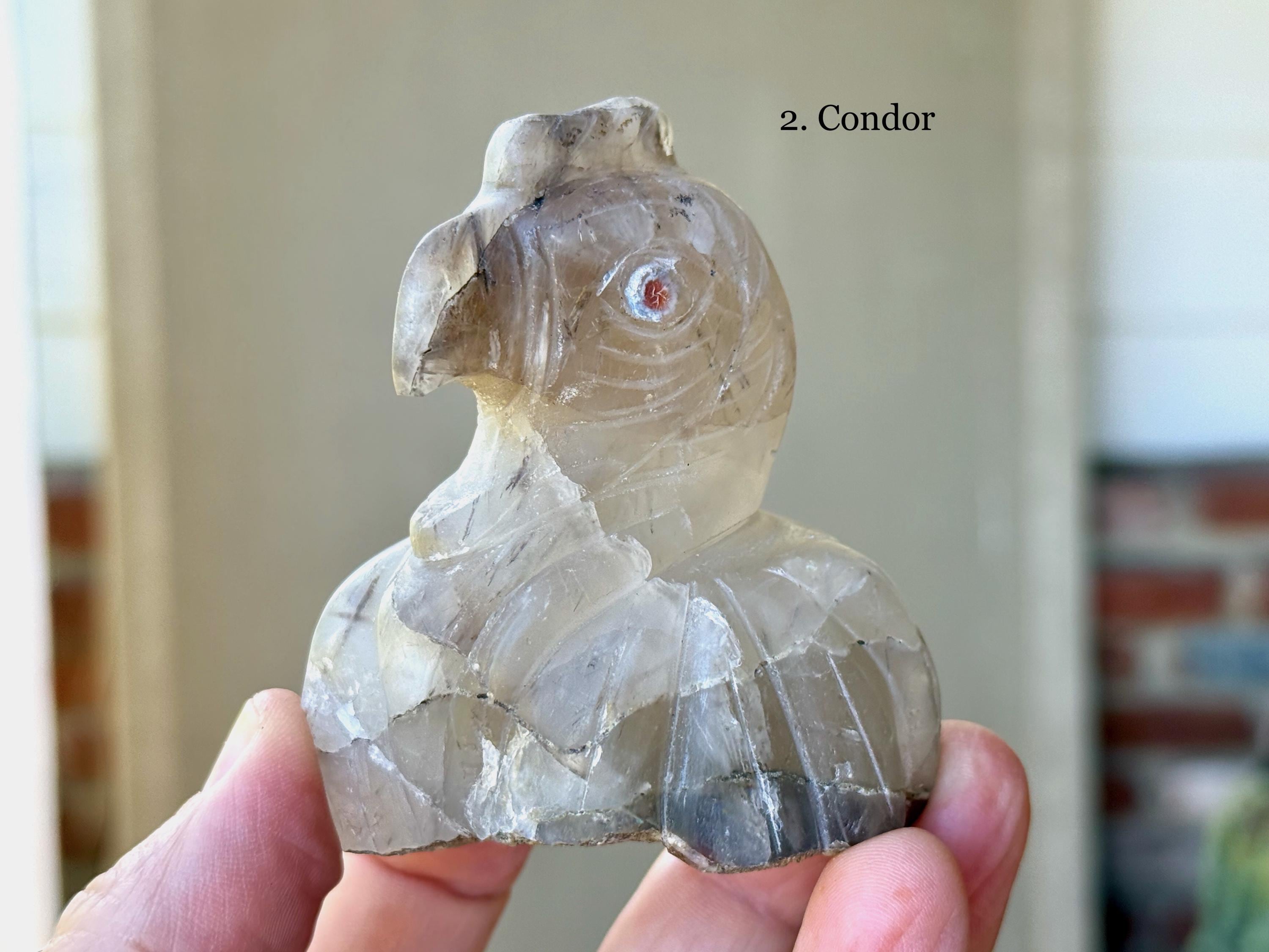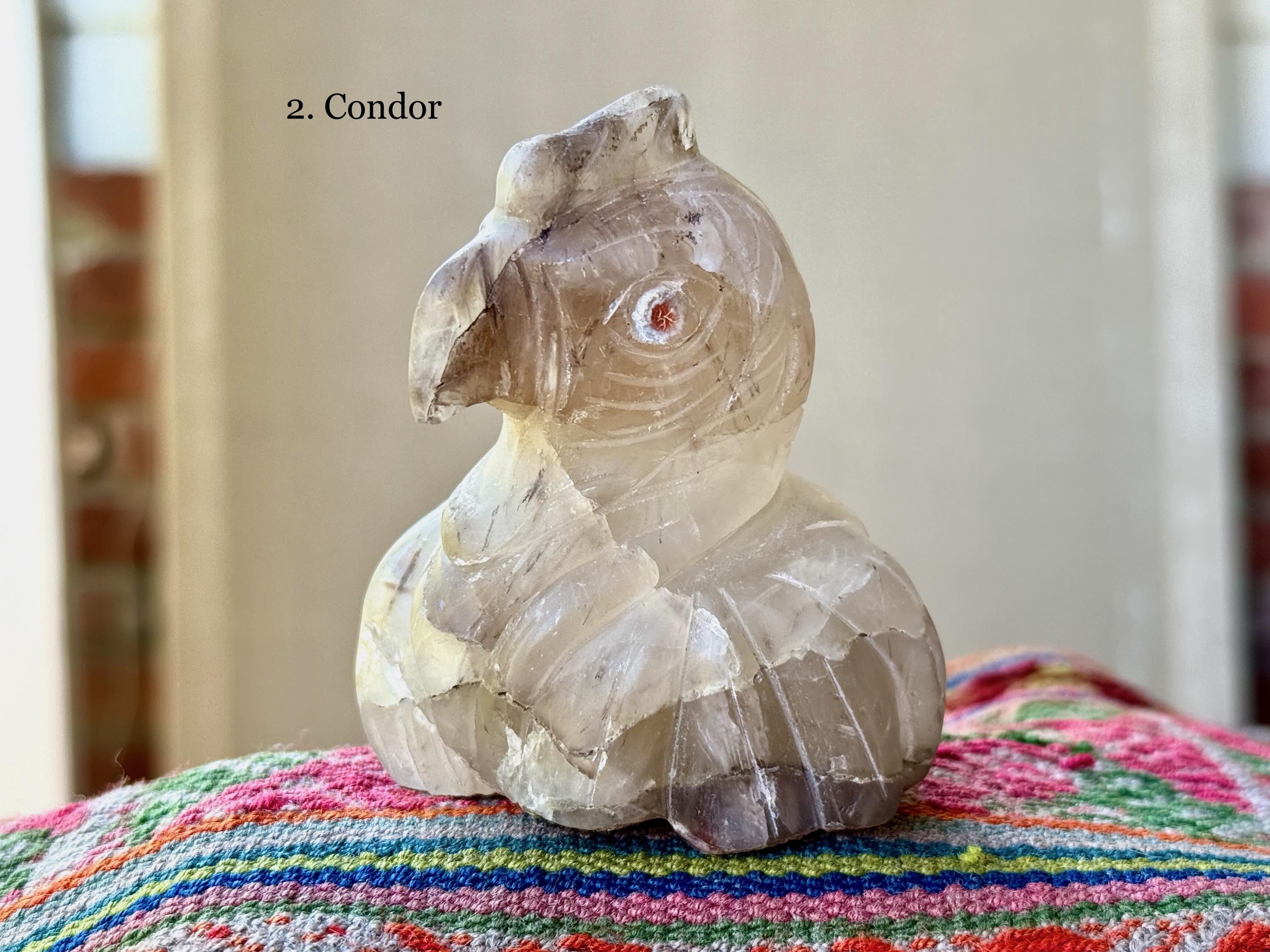 These Quartz Crystal Animal Totems in Jaguar, Condor, Snake and Eagle, were hand carved from native Peruvian Quartz by artisan Julio Vera. Each selection is labeled, simply select your preference from the dropdown menu.
