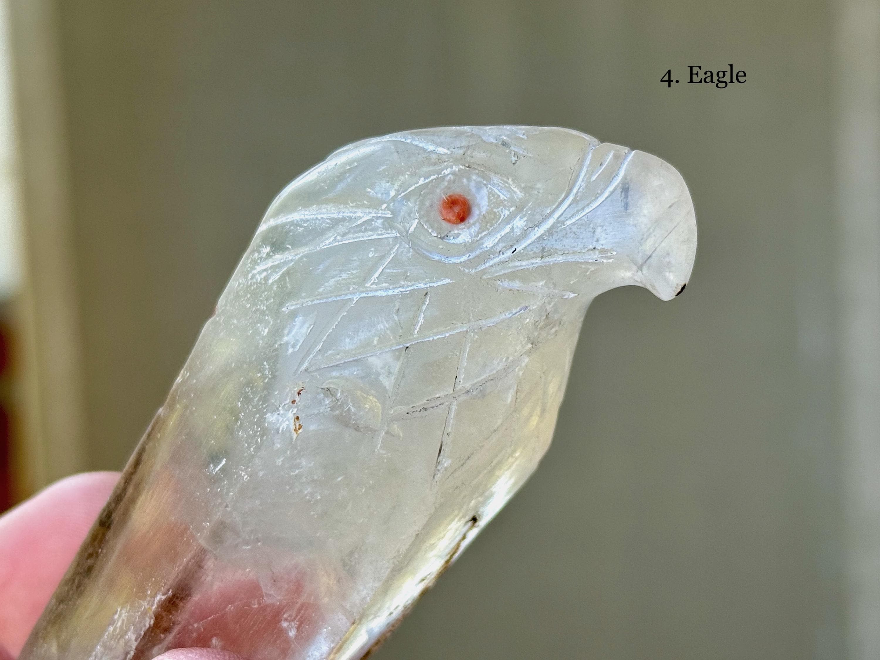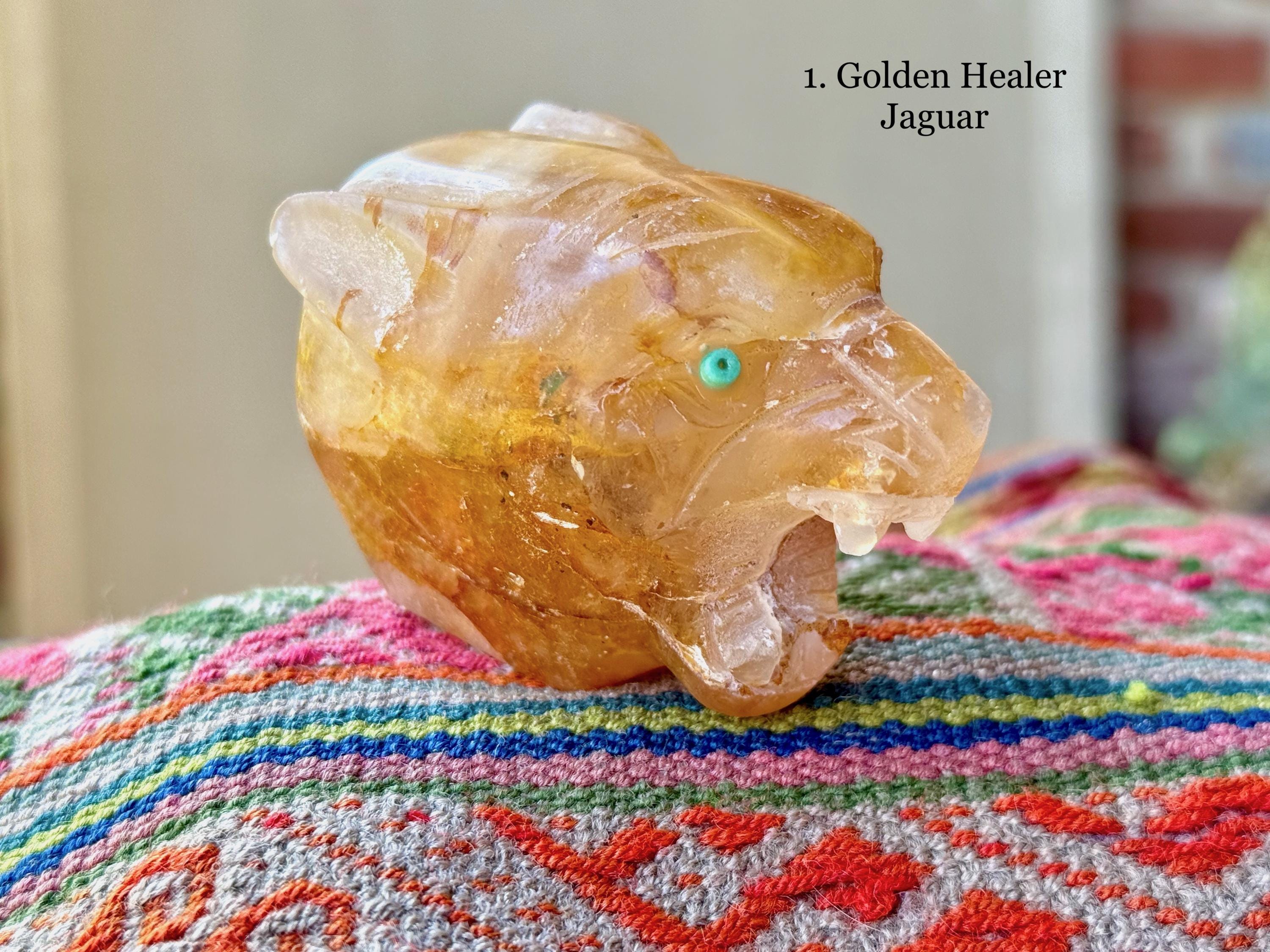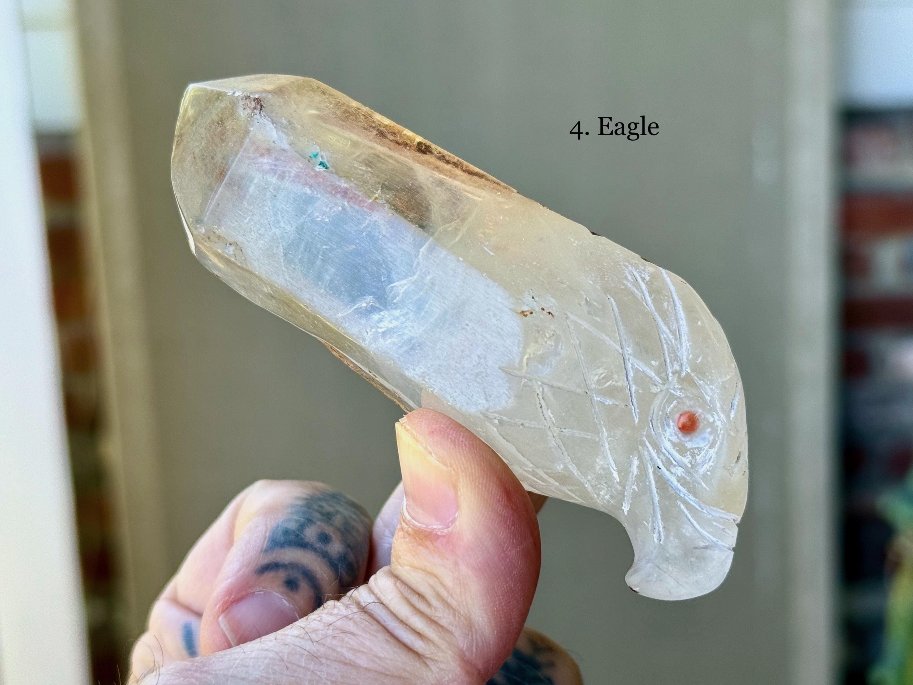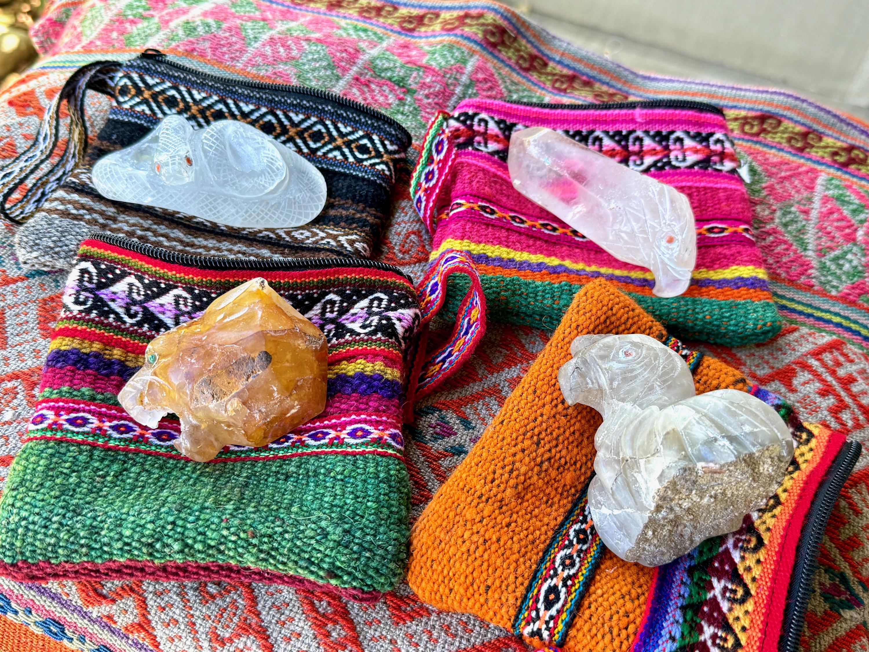 These Quartz Crystal Animal Totems in Jaguar, Condor, Snake and Eagle, were hand carved from native Peruvian Quartz by artisan Julio Vera. Each selection is labeled, simply select your preference from the dropdown menu.
