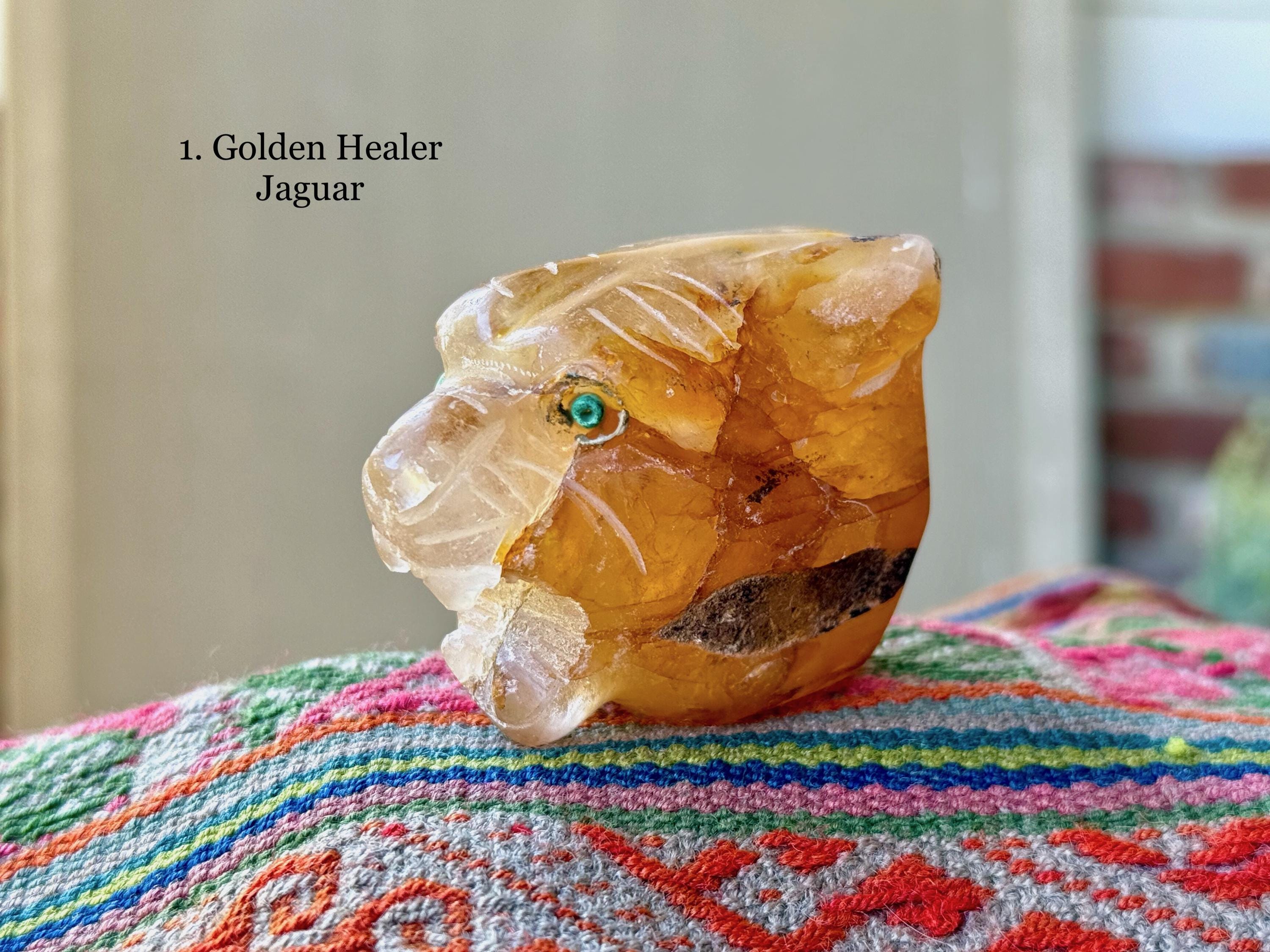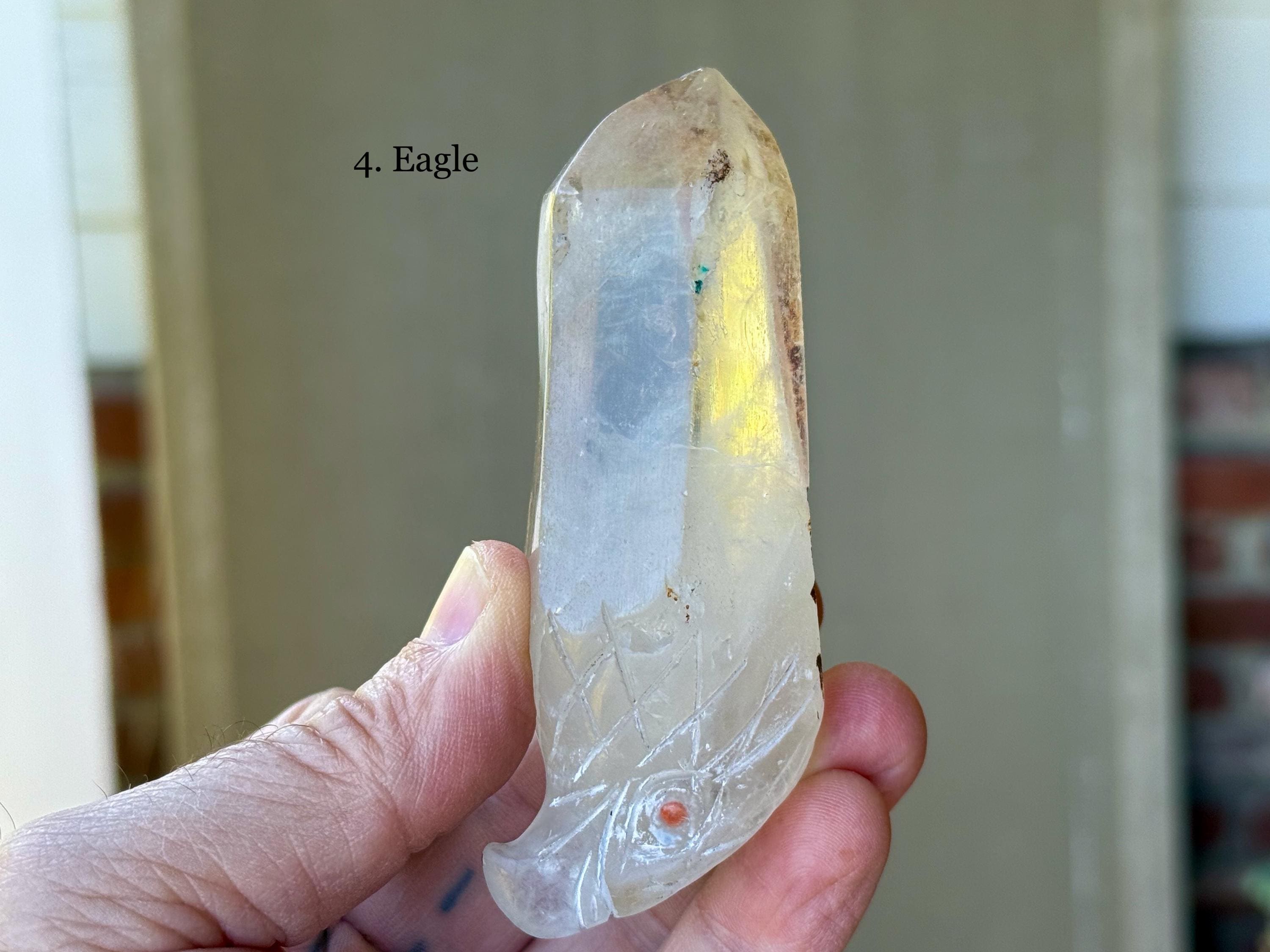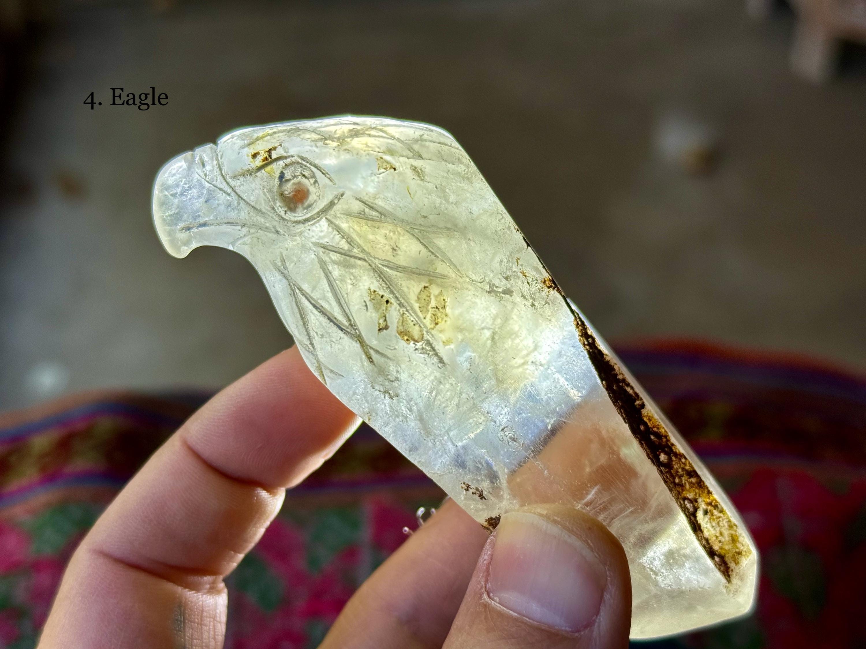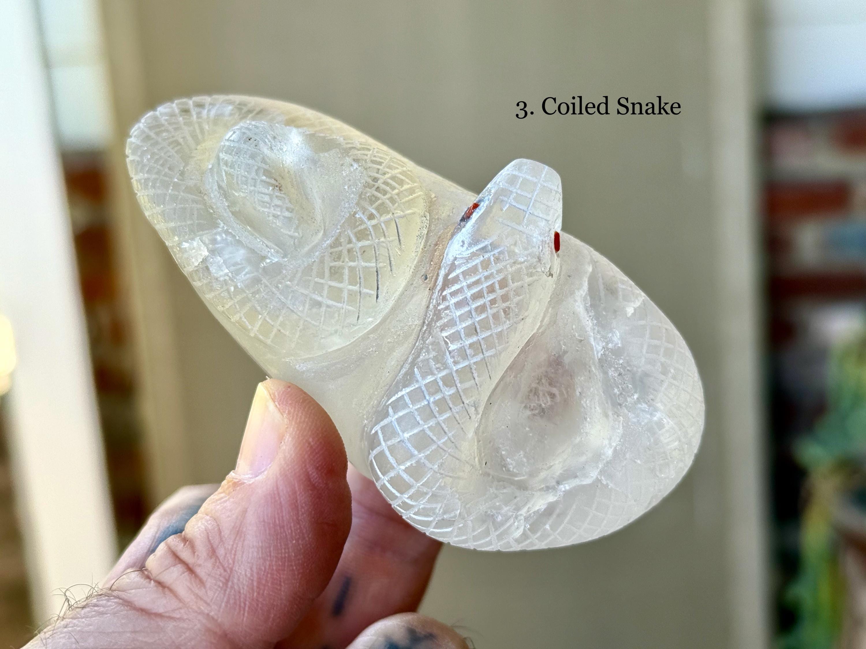 These Quartz Crystal Animal Totems in Jaguar, Condor, Snake and Eagle, were hand carved from native Peruvian Quartz by artisan Julio Vera. Each selection is labeled, simply select your preference from the dropdown menu.