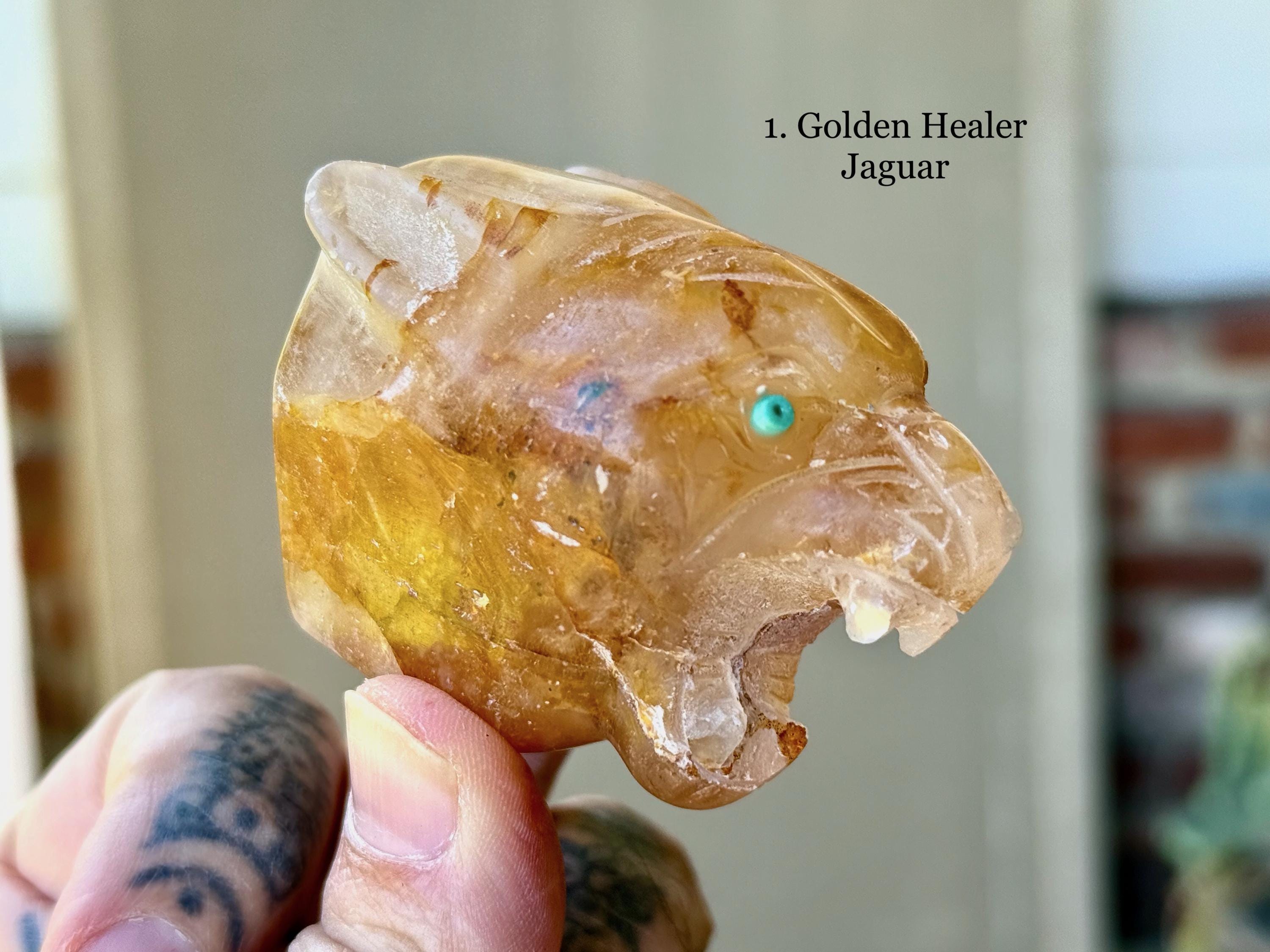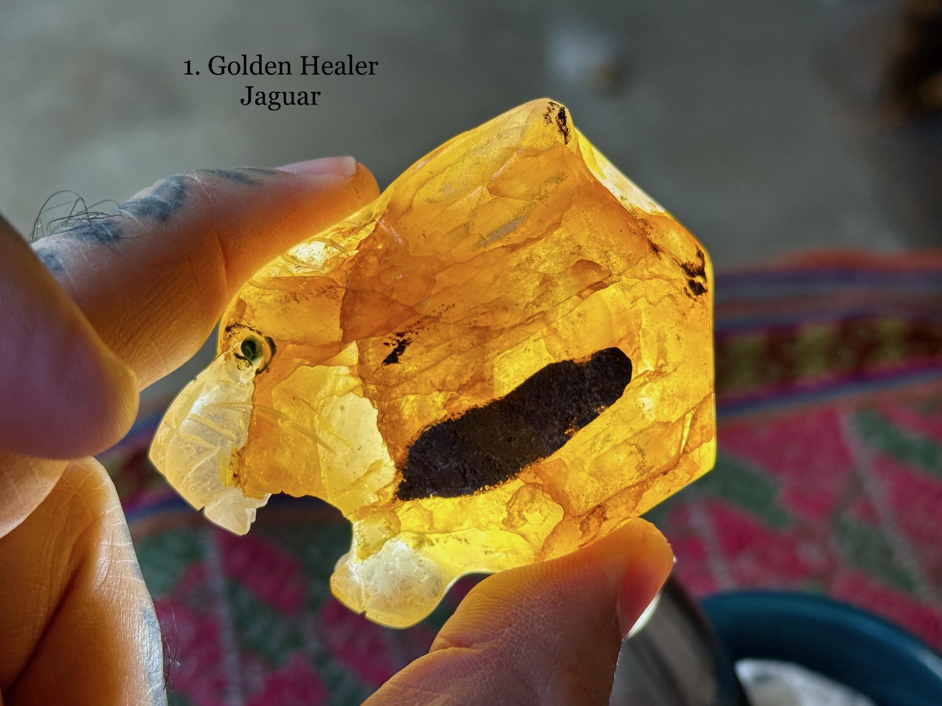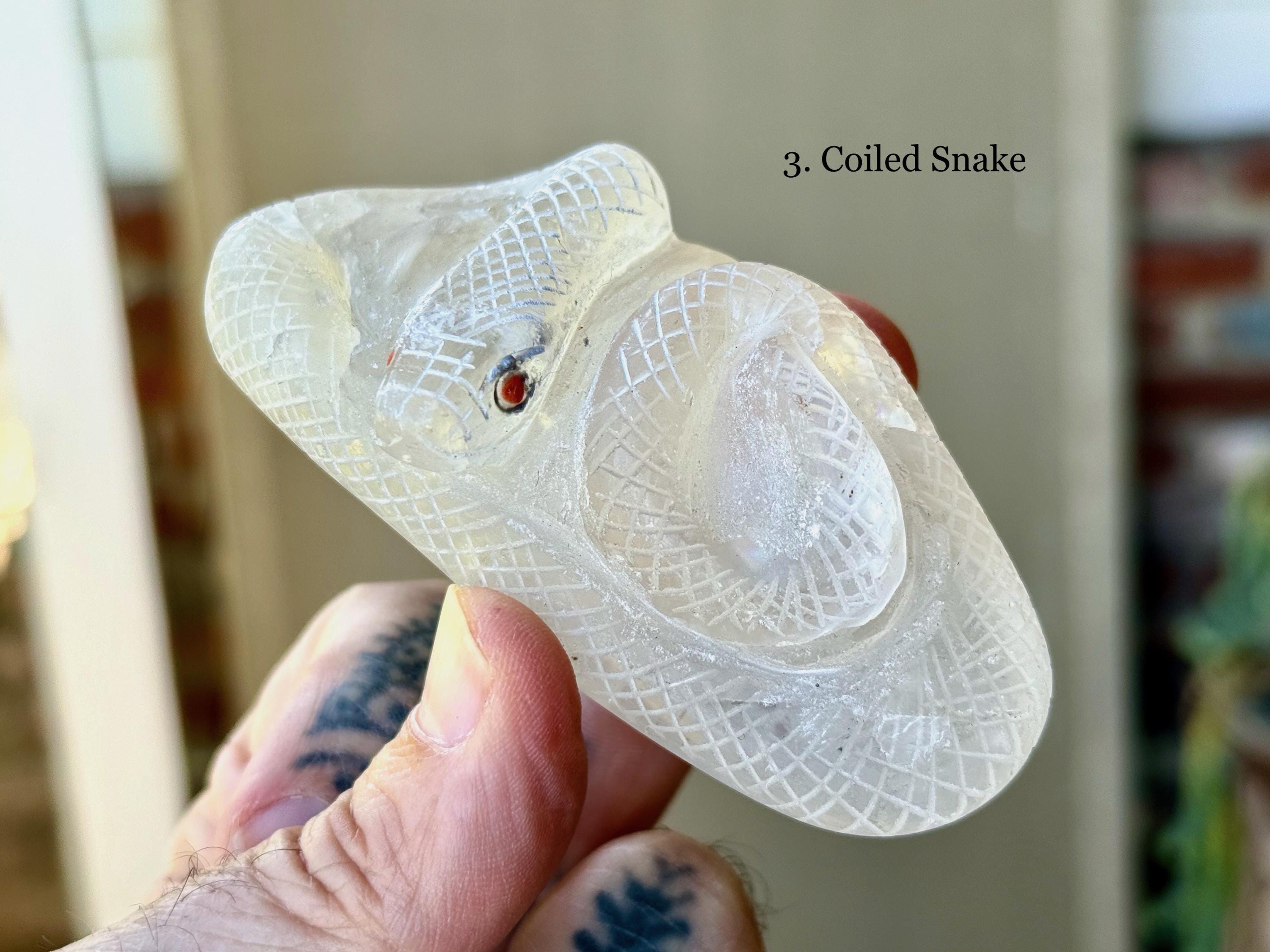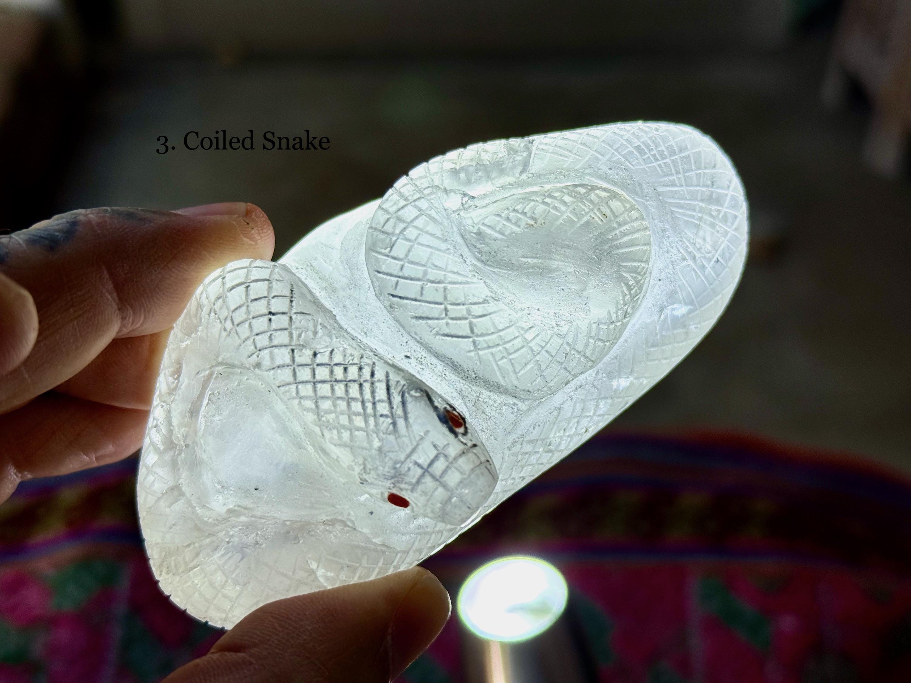 These Quartz Crystal Animal Totems in Jaguar, Condor, Snake and Eagle, were hand carved from native Peruvian Quartz by artisan Julio Vera. Each selection is labeled, simply select your preference from the dropdown menu.