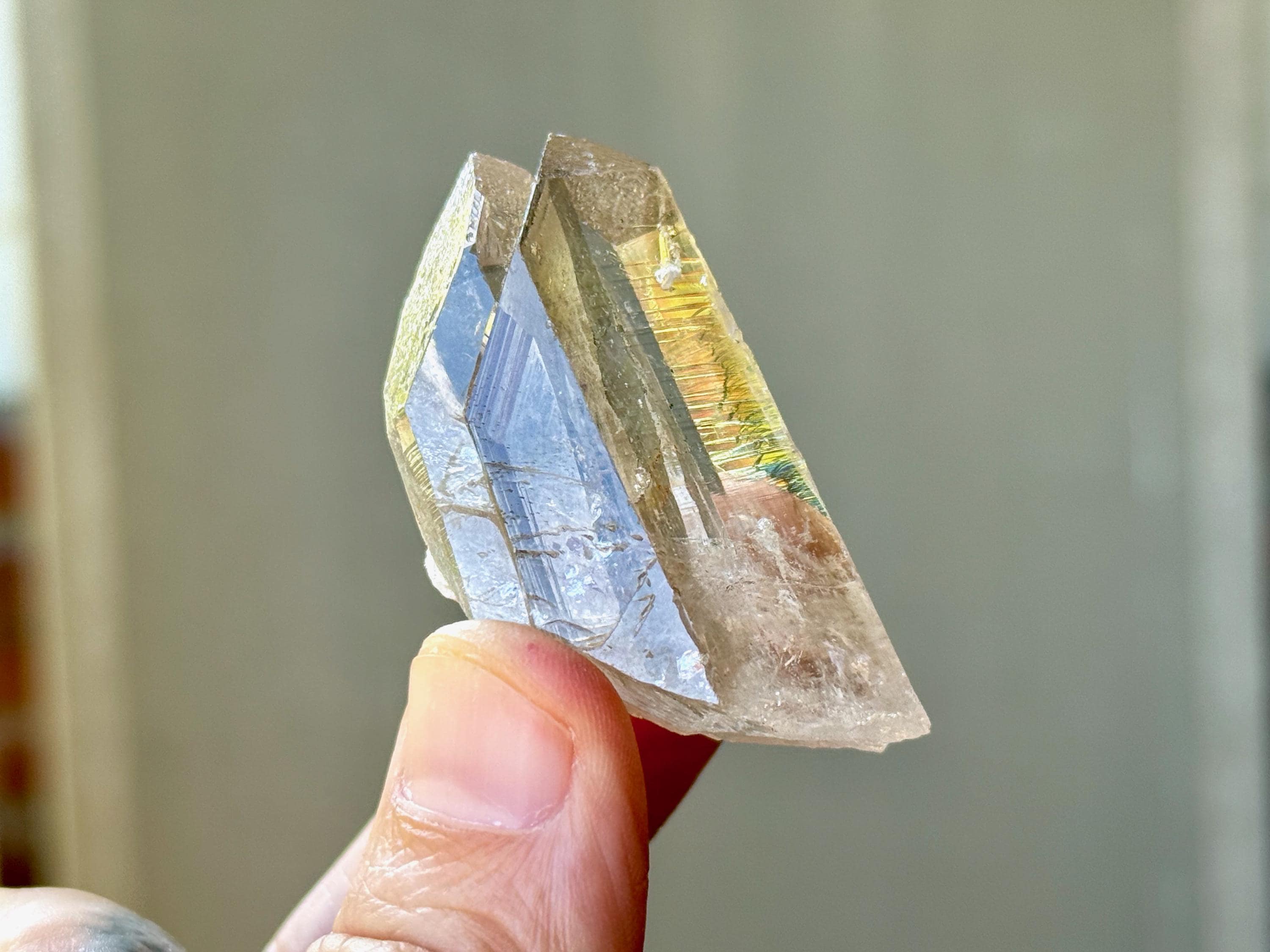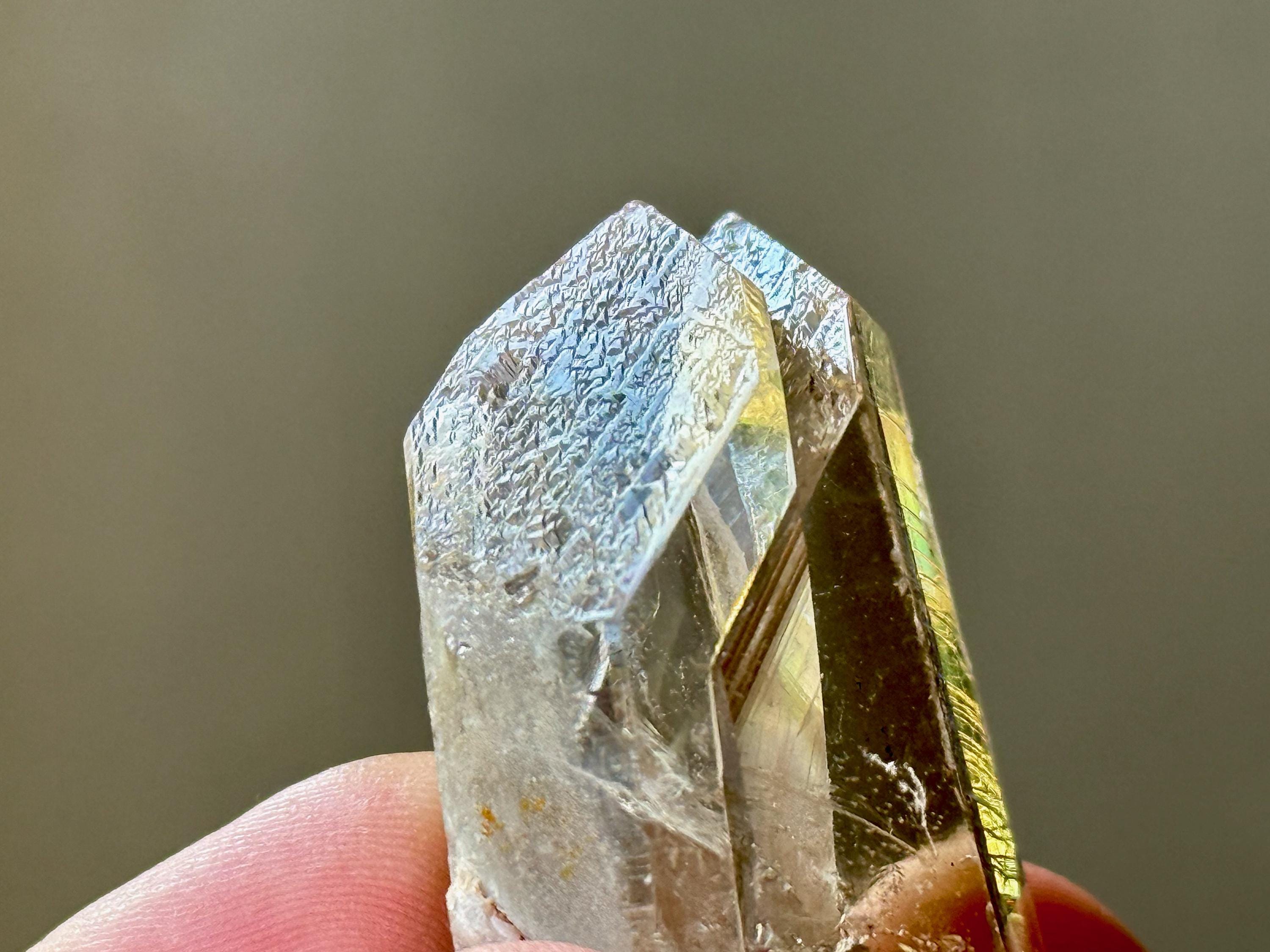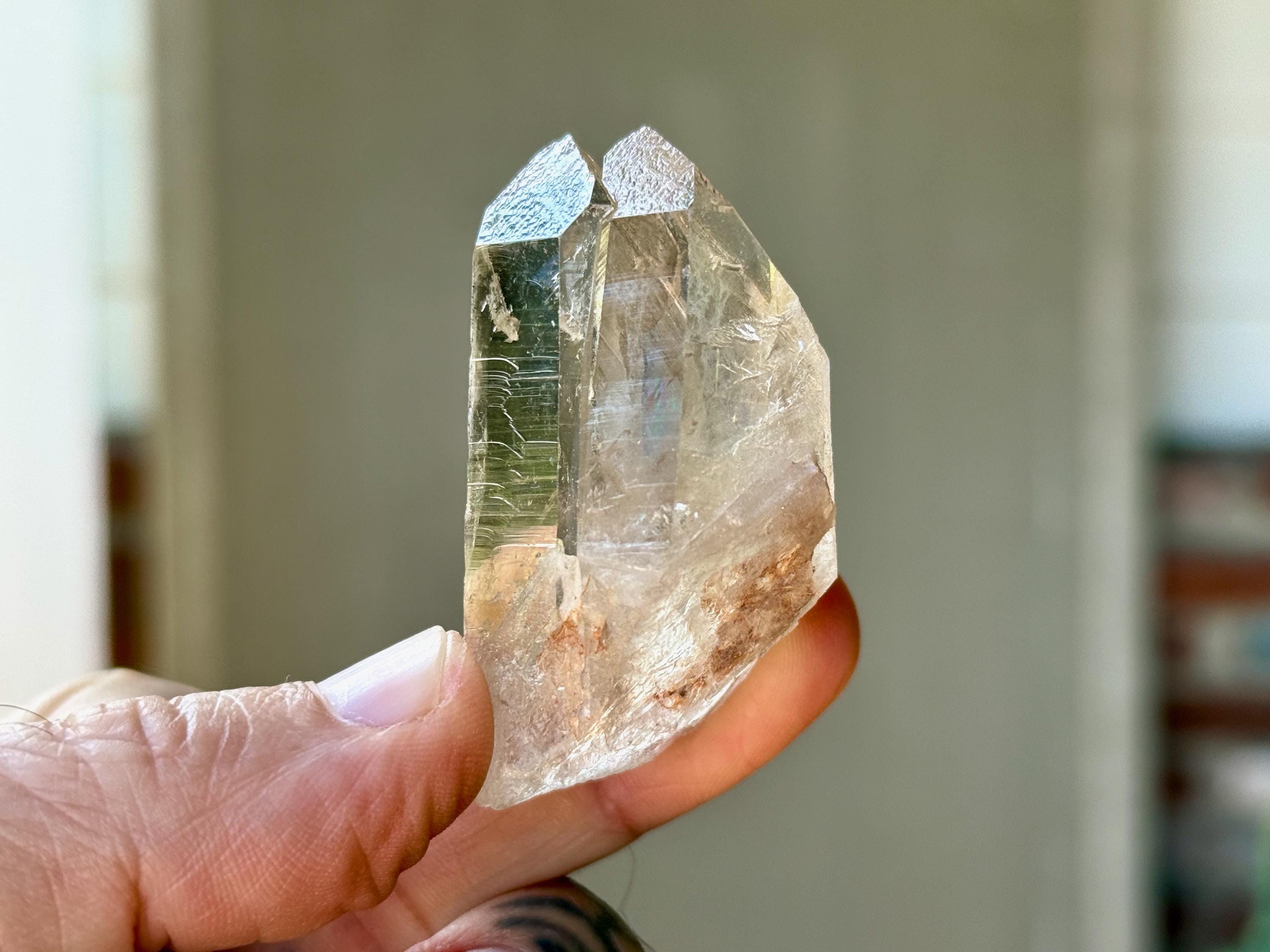 This piece features one of the most unique formations we've seen from this collection, a Tantric Twin where one crystal is partially embedded within the other. It's so beautiful and symbolic, and there are also some flashy contact rainbows in the areas where the crystals join together.