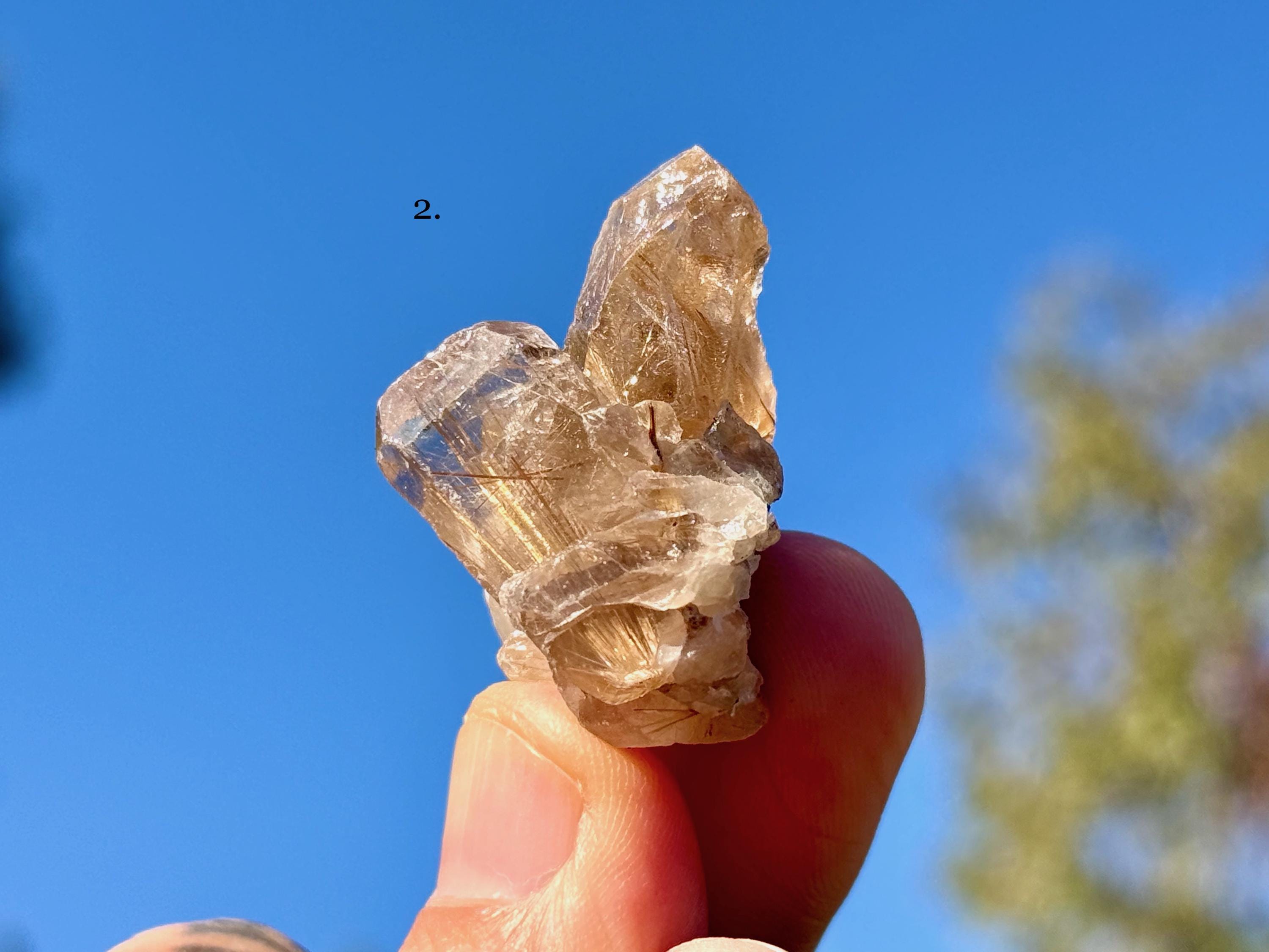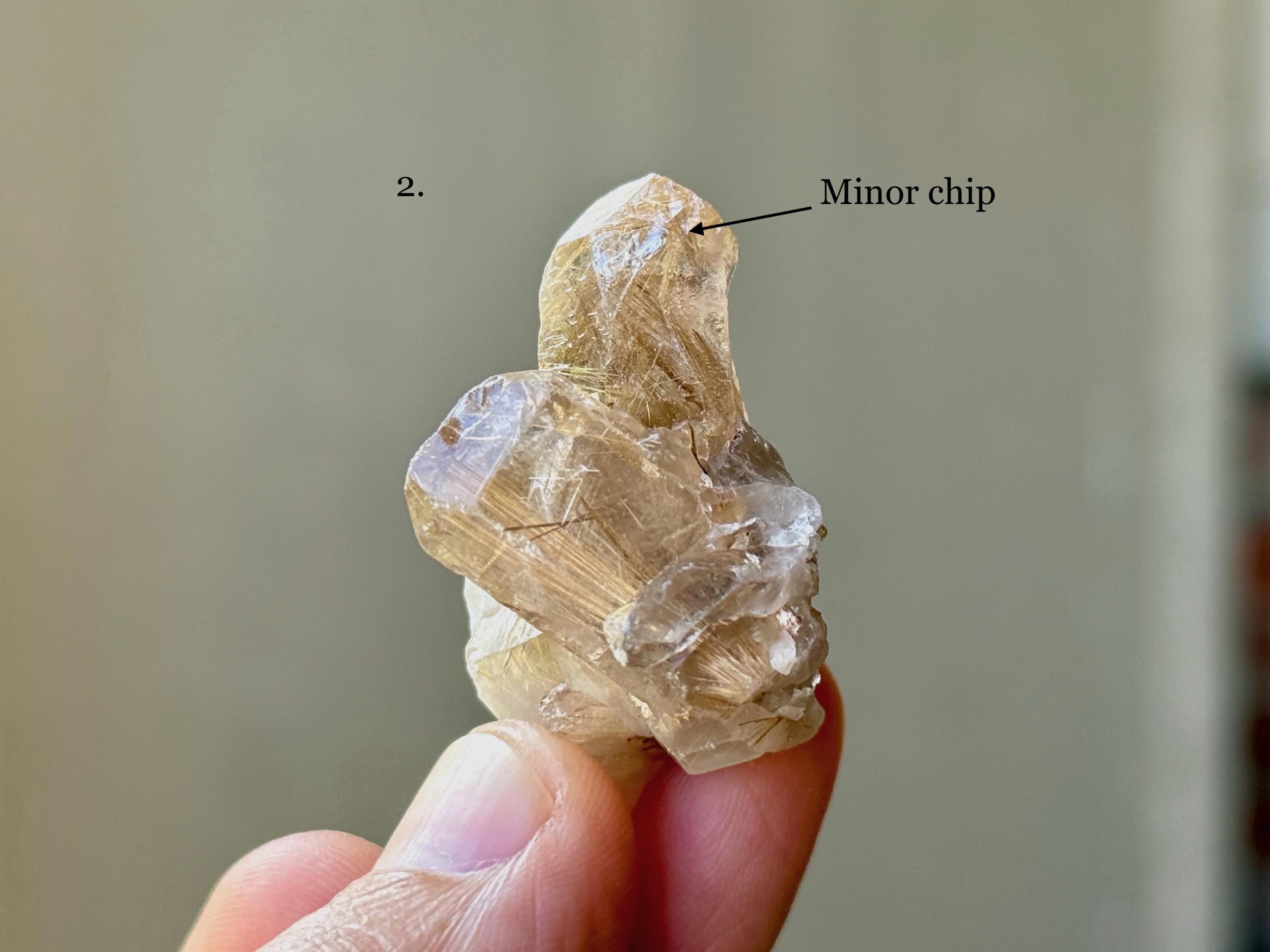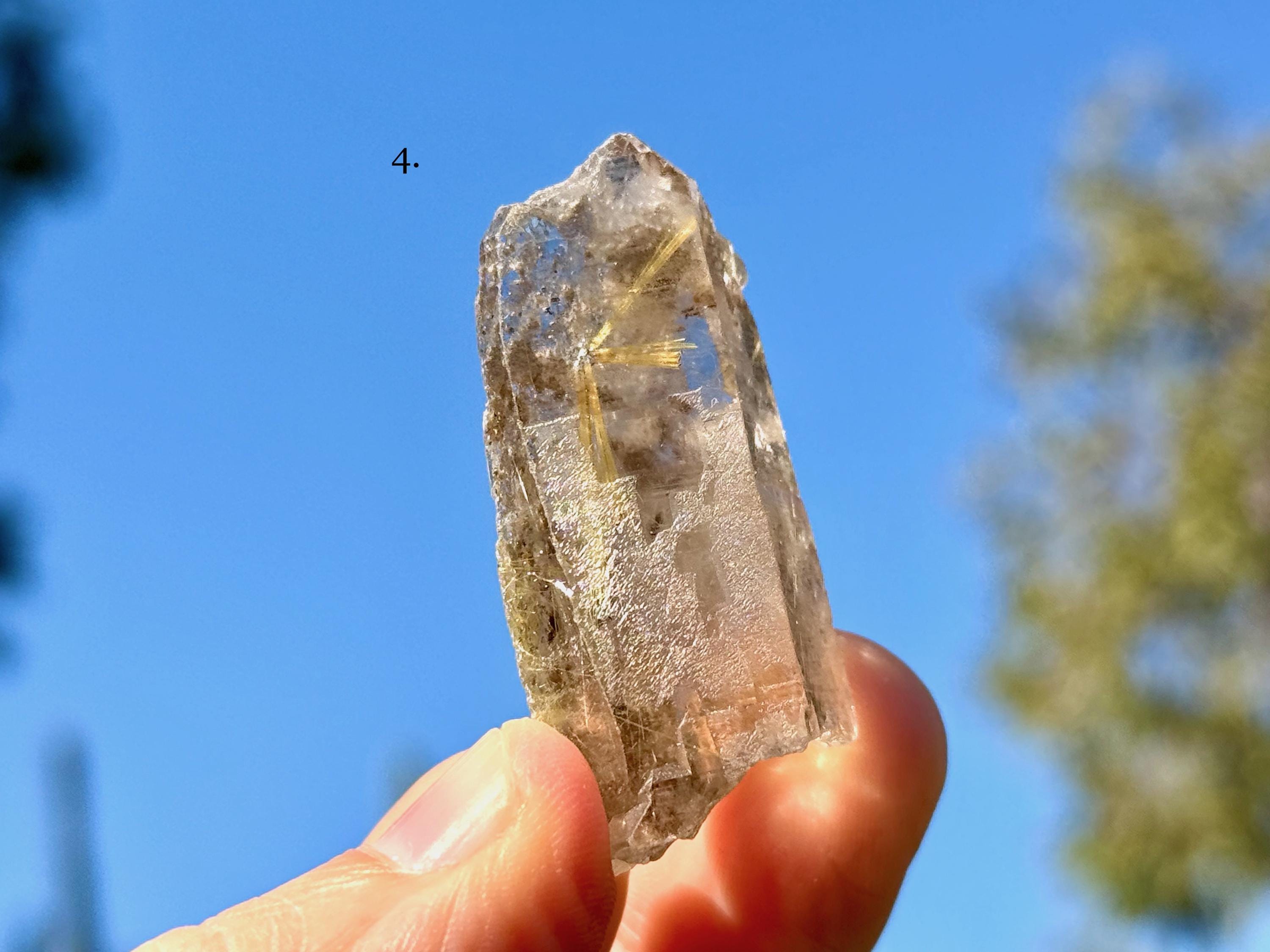 Brilliant luster to each of these Golden Rutile Quartz crystals. Some of these have very fine and sparse Golden Rutile "threads," while others have thicker and more ample rutile inclusions. We've included photos of each in both natural light and direct sunlight. Most of these have healed contact areas on the backsides.