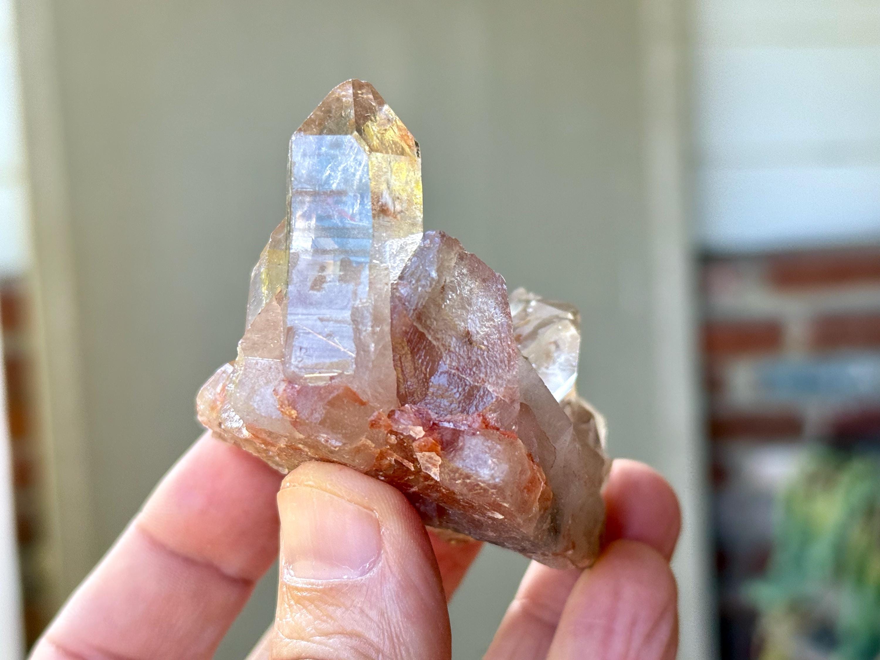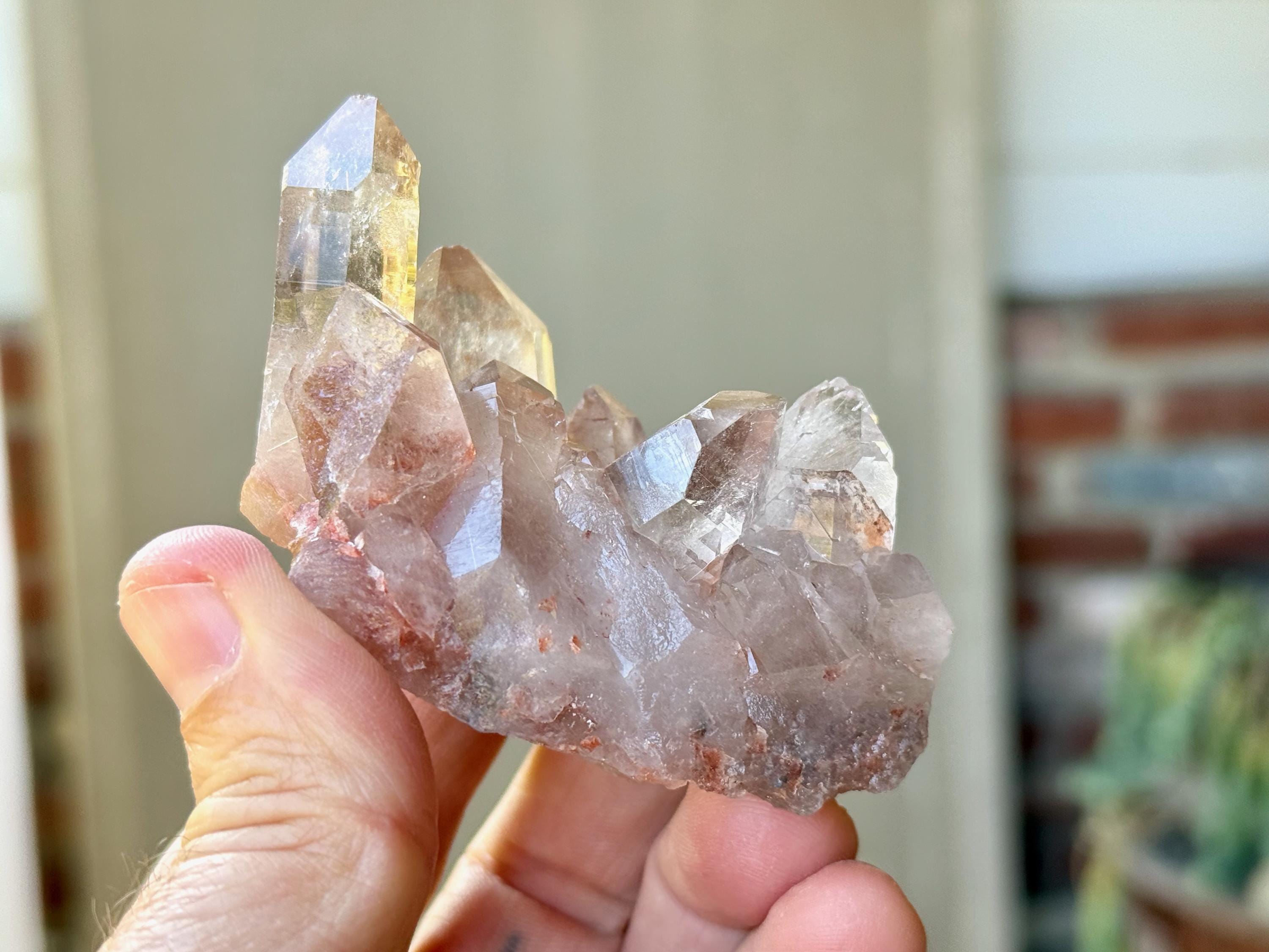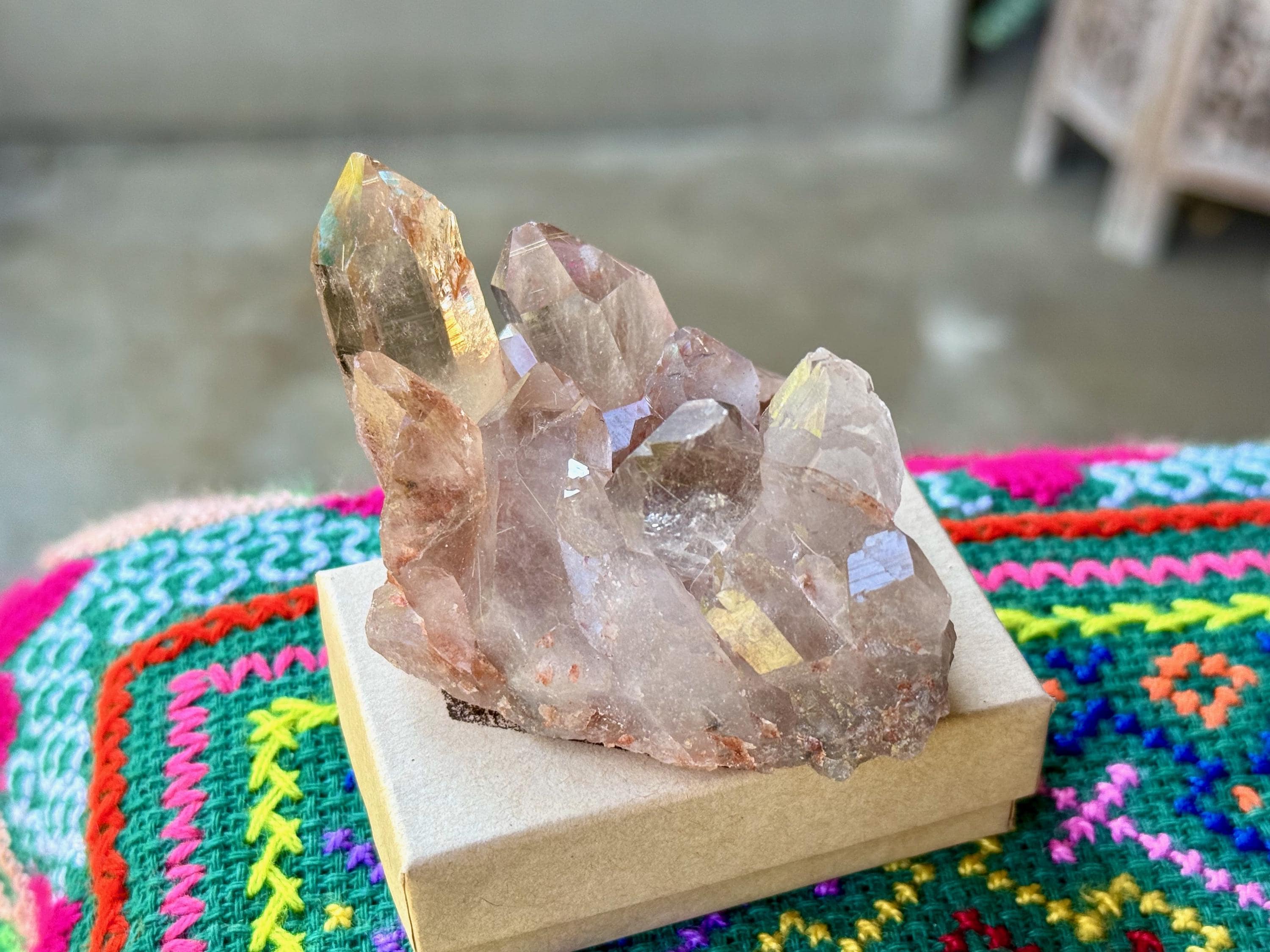Exquisite quality to this highly lustrous Smoky Quartz Cluster with mild inclusions of fibrous Golden Rutile throughout. This crystal has a beautiful pinkish-red hue from Hematite inclusion. The contrast between the metallic golden rutile and pink hues is really striking.