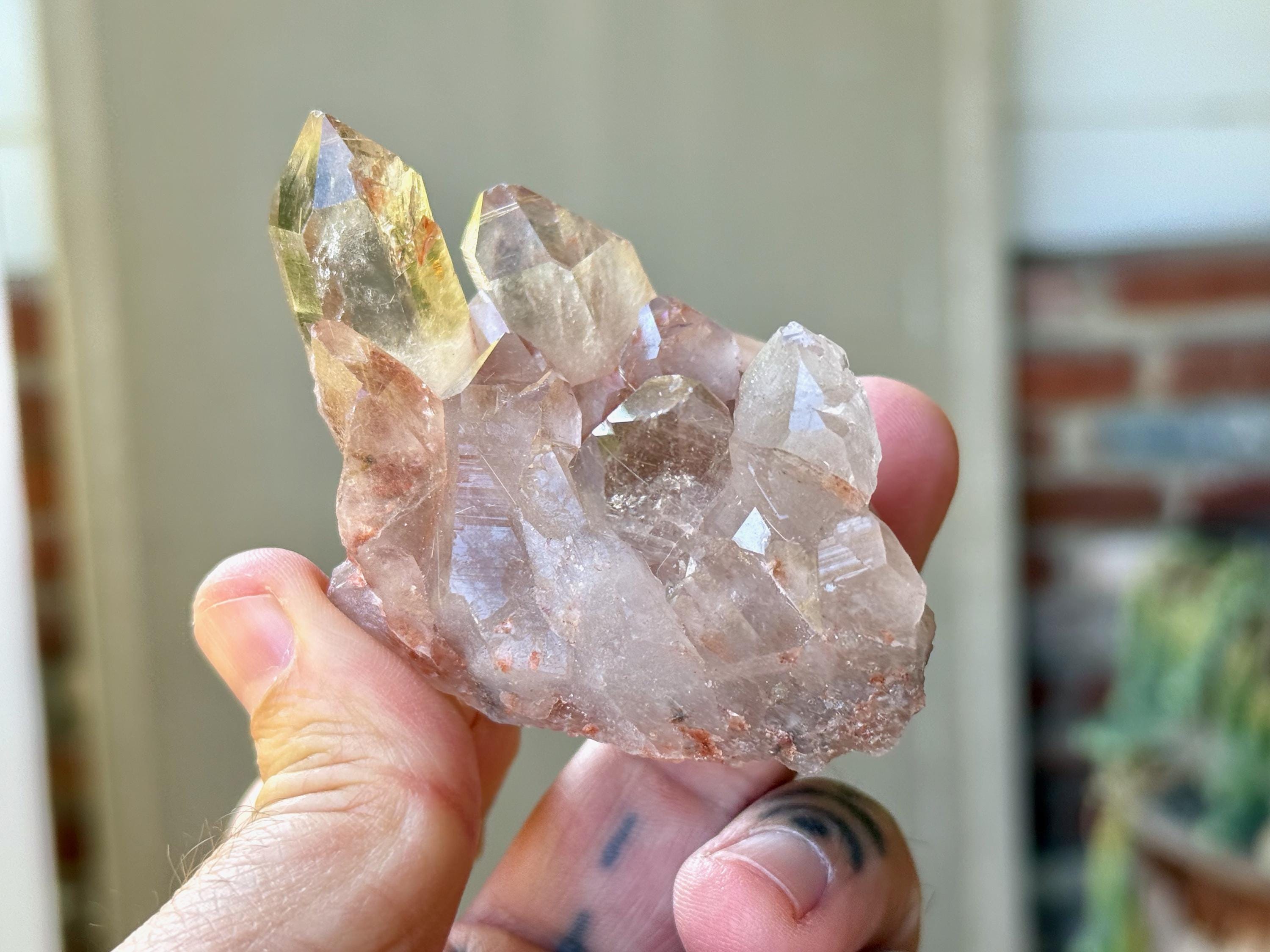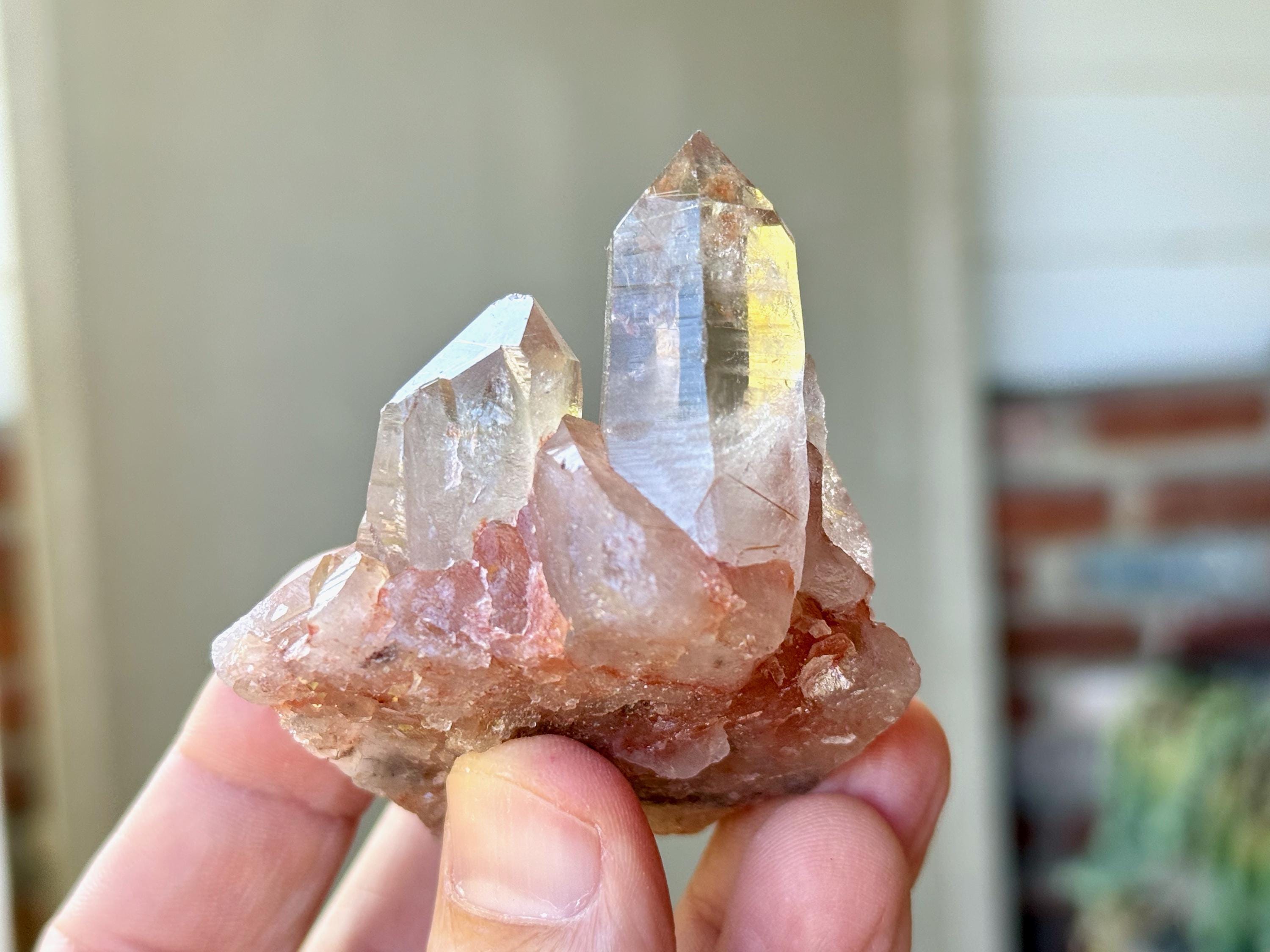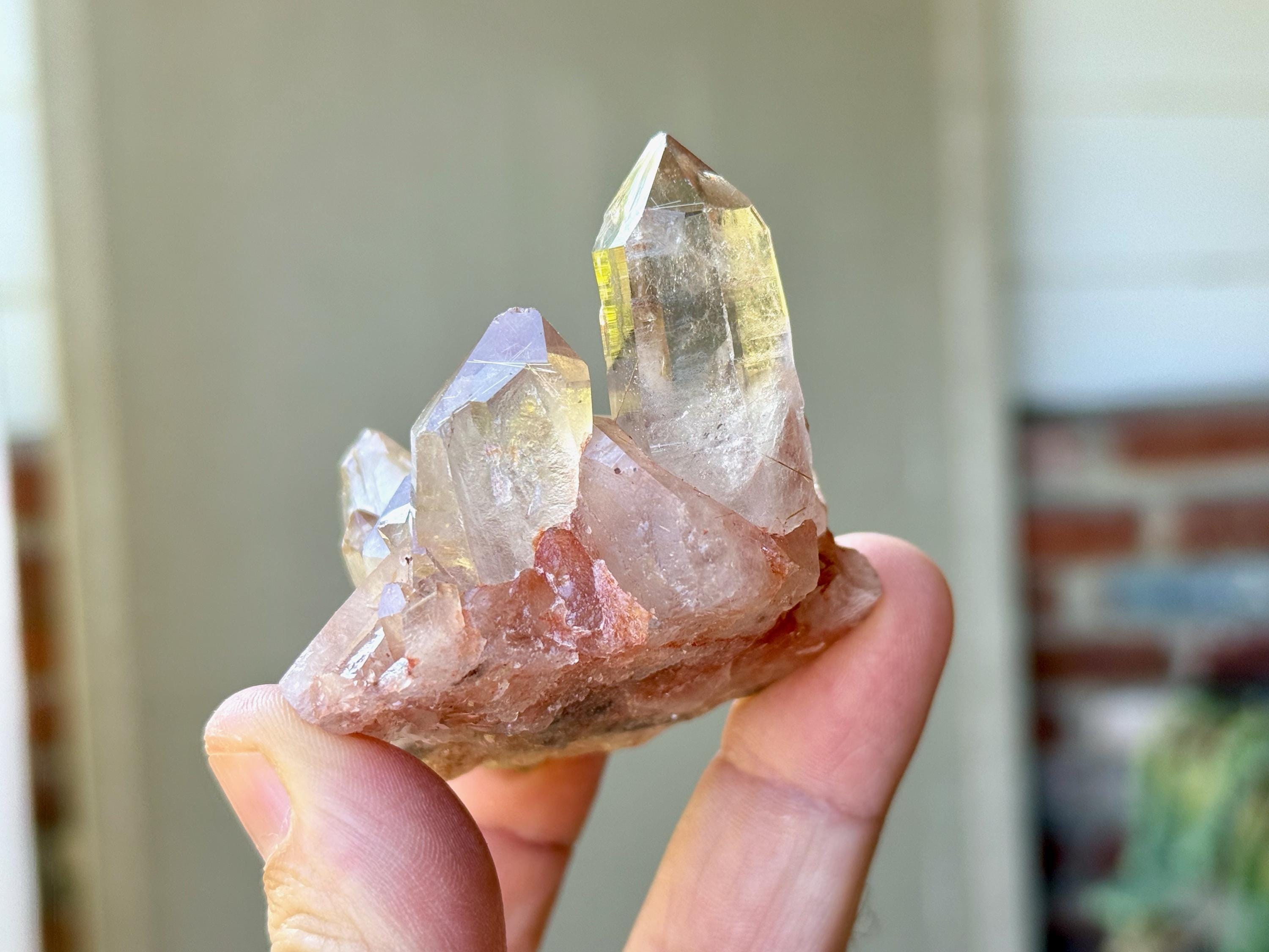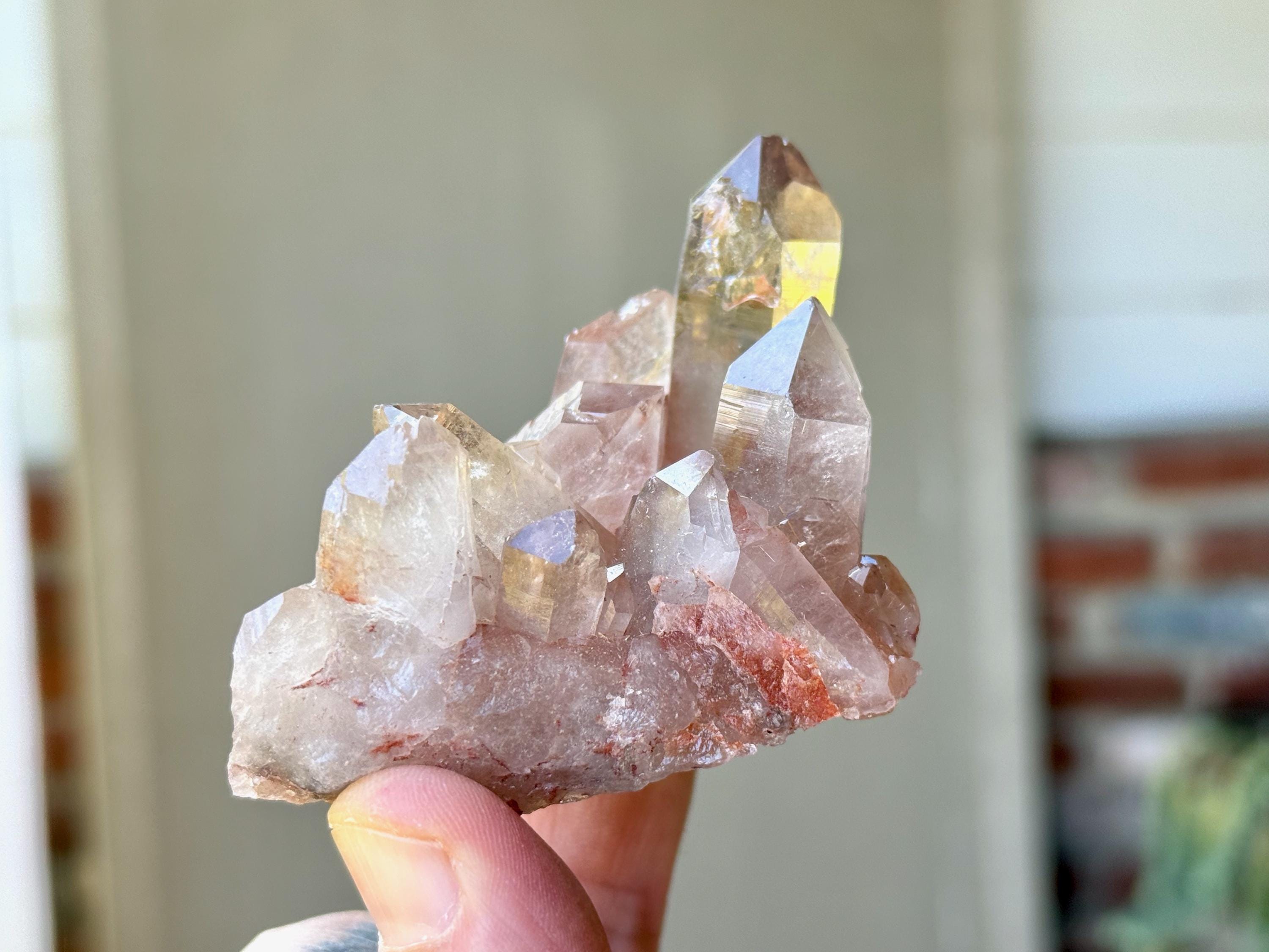 Exquisite quality to this highly lustrous Smoky Quartz Cluster with mild inclusions of fibrous Golden Rutile throughout. This crystal has a beautiful pinkish-red hue from Hematite inclusion. The contrast between the metallic golden rutile and pink hues is really striking.
